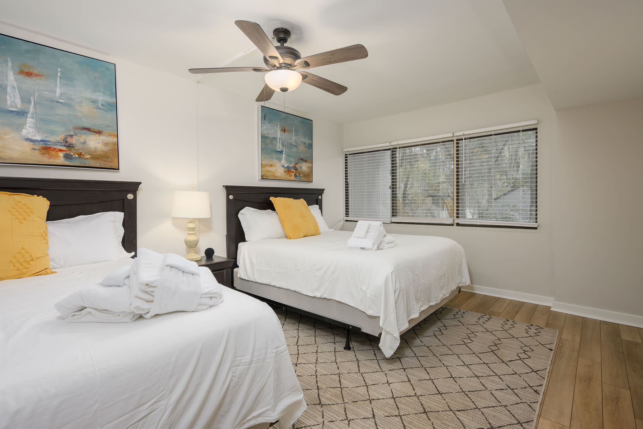 • Bedroom 2 (1st Floor): Two queen beds, Smart TV