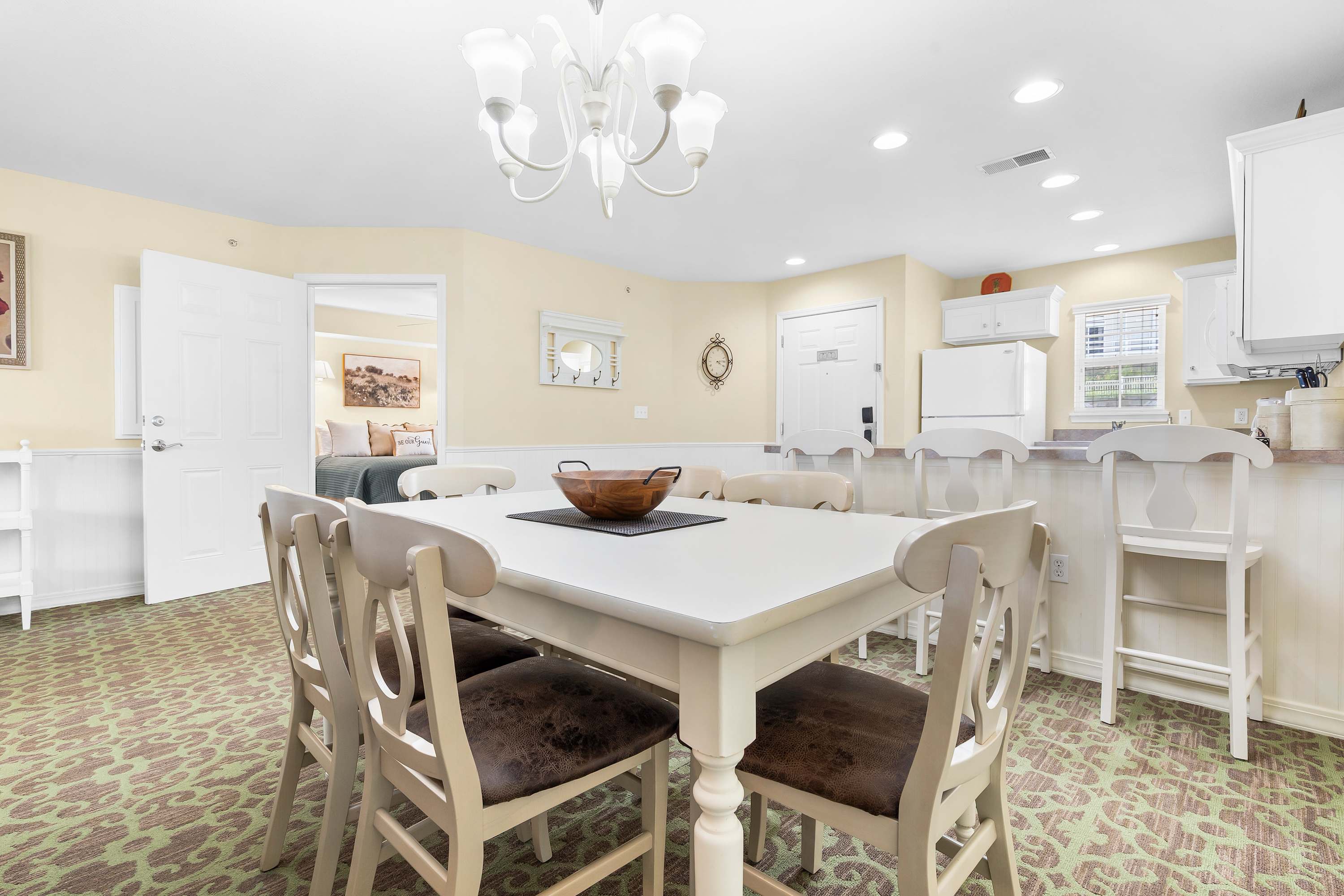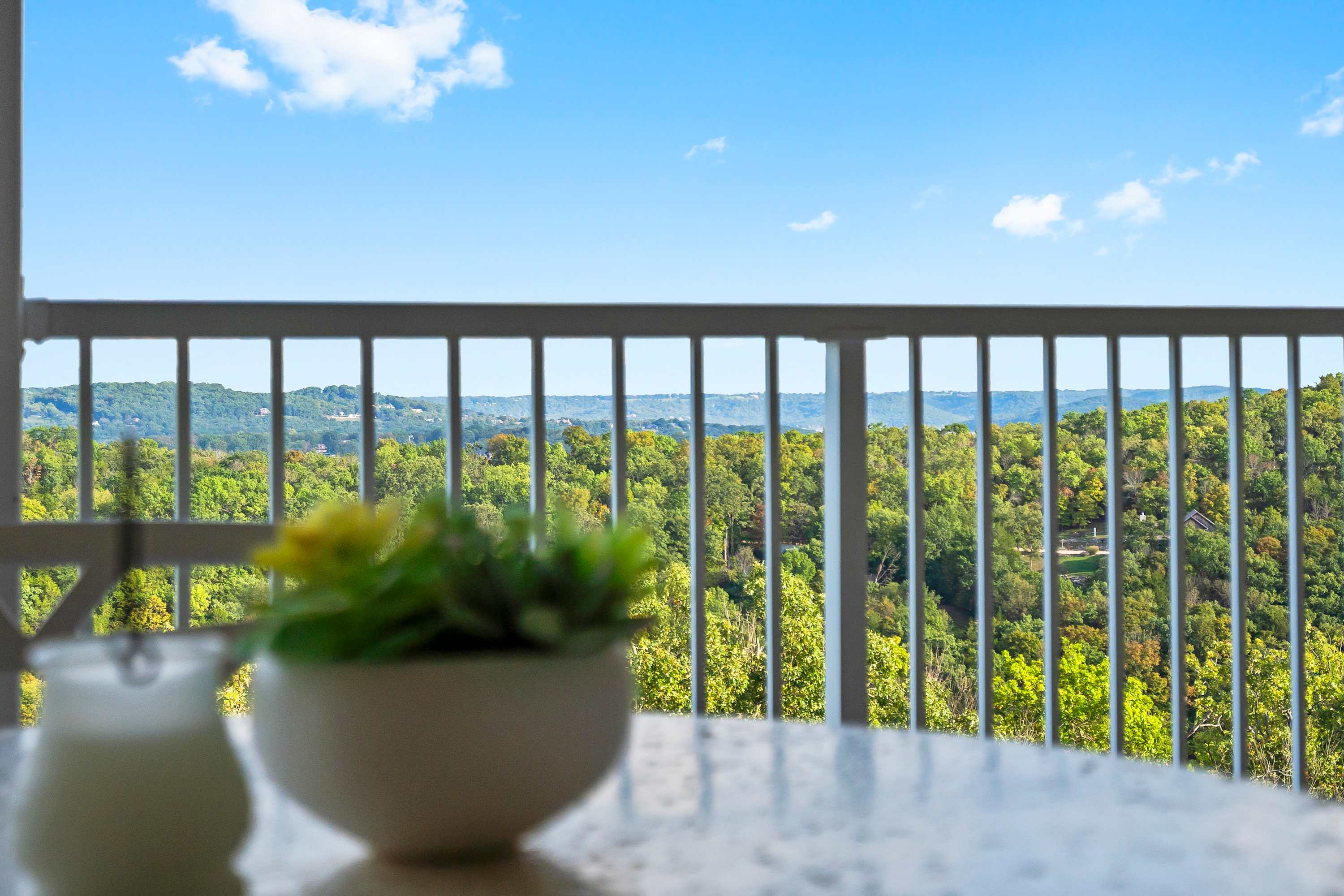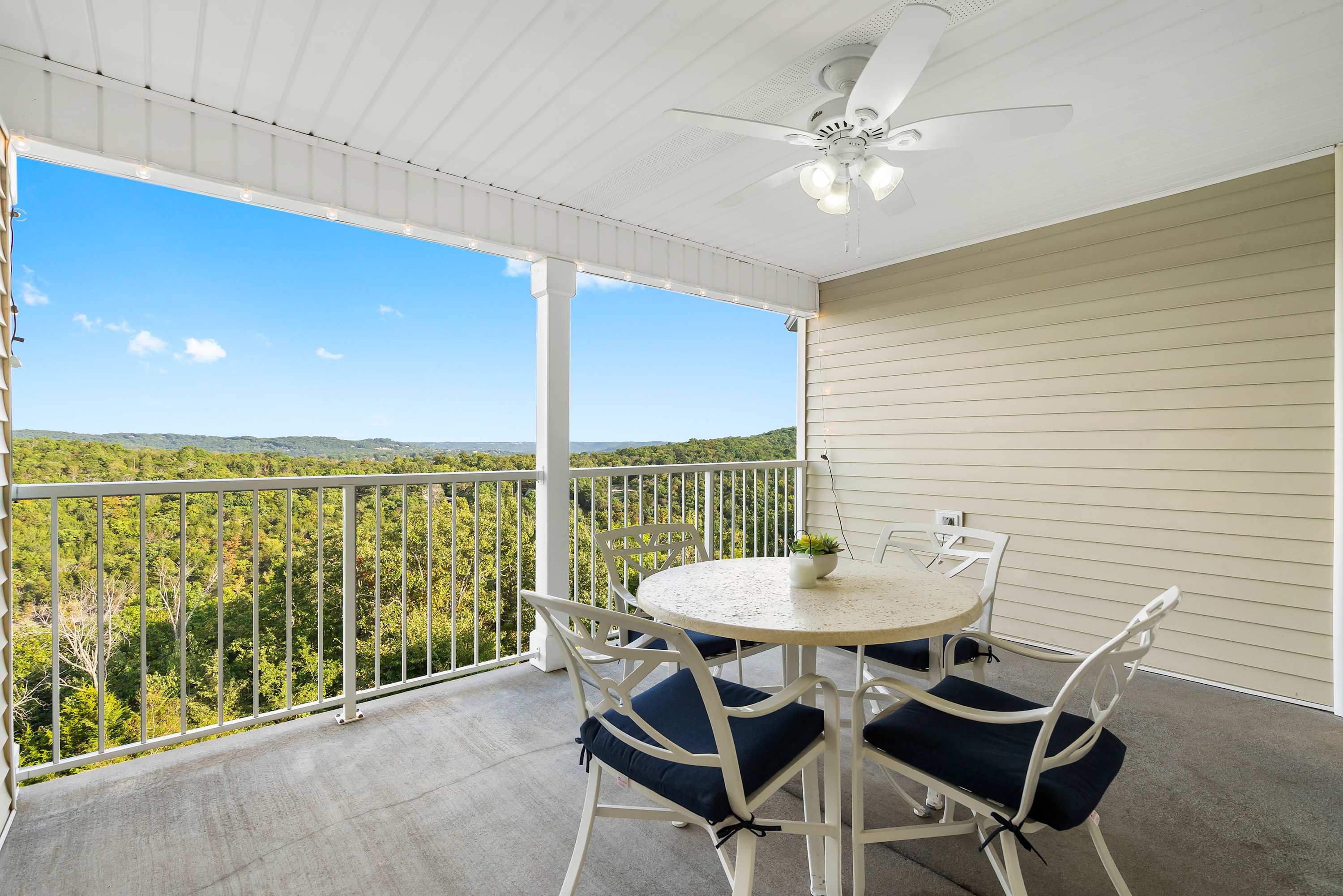 Step inside to find an open living, kitchen, and dining space designed for togetherness and comfort. In the living room, unwind on the plush couch or love seat while enjoying a movie night on the smart TV. Just beyond, a dining table for six offers space for shared meals and laughter, while the adjoining kitchen—complete with white cabinetry, appliances, and counter seating for three—makes cooking a pleasure. Slide open the doors to your covered balcony, where a dining table for four awaits. Here, you can sip your morning coffee or share dinner as you take in incredible mountain views above the treetops, a peaceful reminder that you’ve truly escaped to the Ozarks.