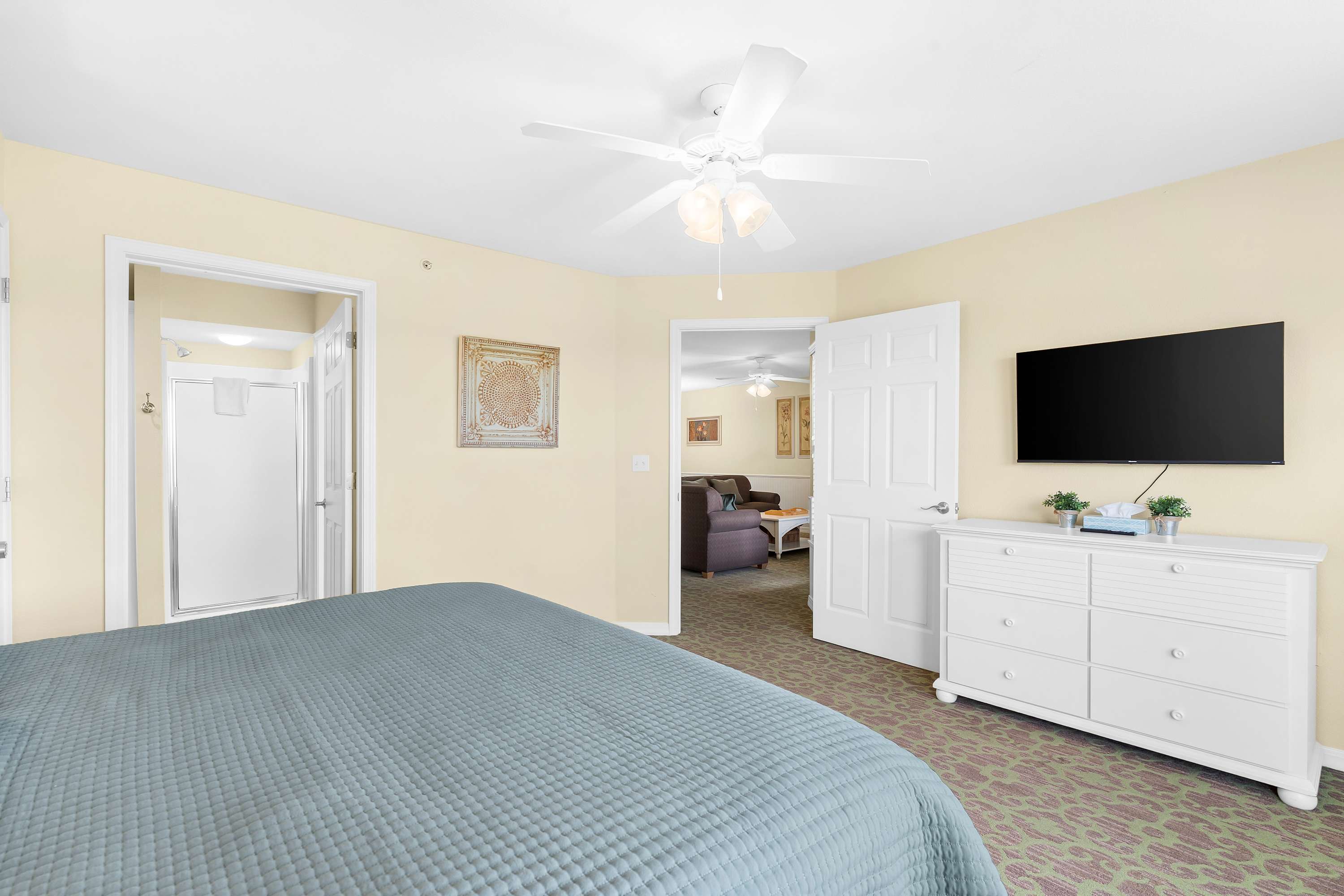 Bedroom #1 includes a king size bed, a smart TV, a kitchenette, and an ensuite bathroom with a single vanity and a shower/tub combo.