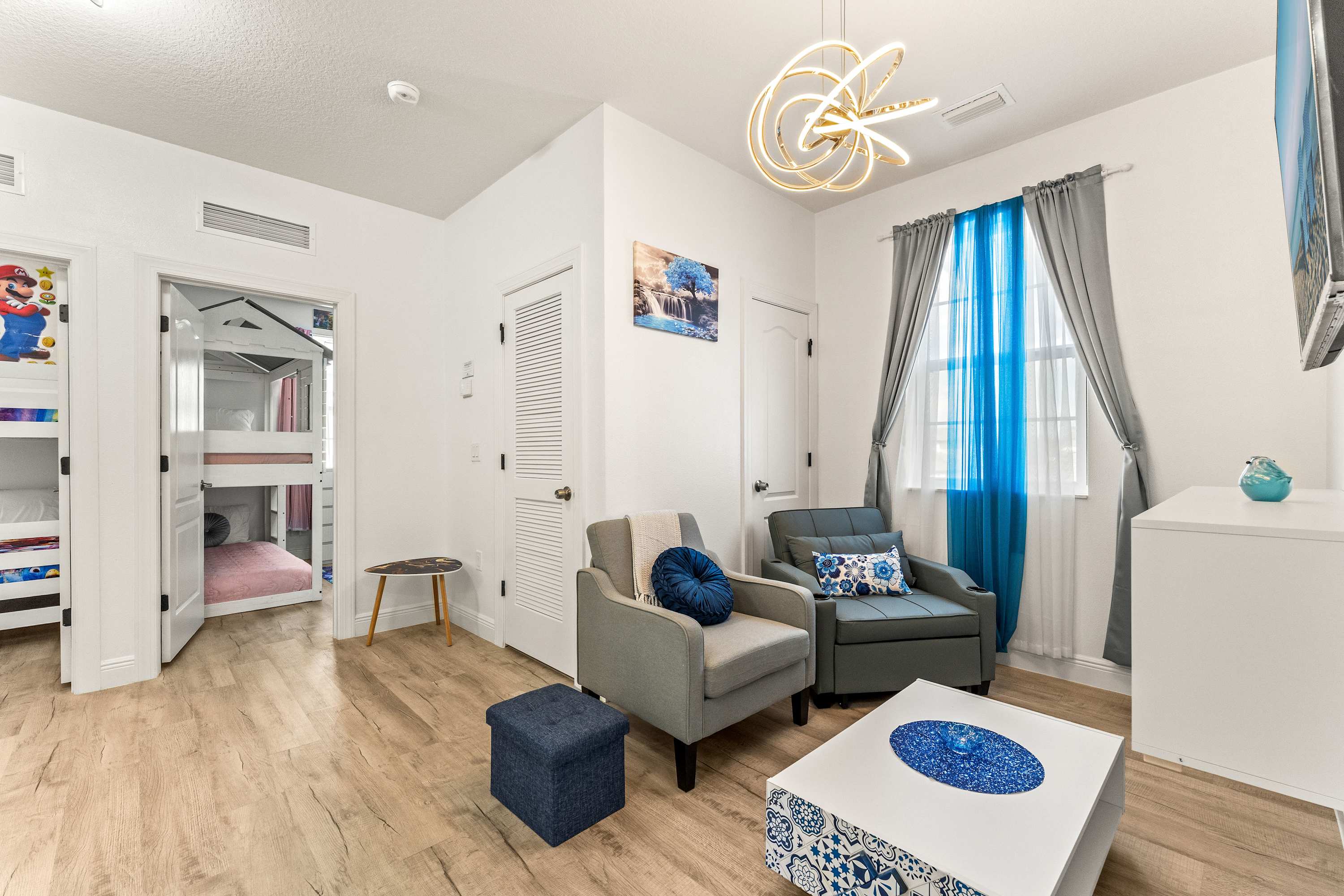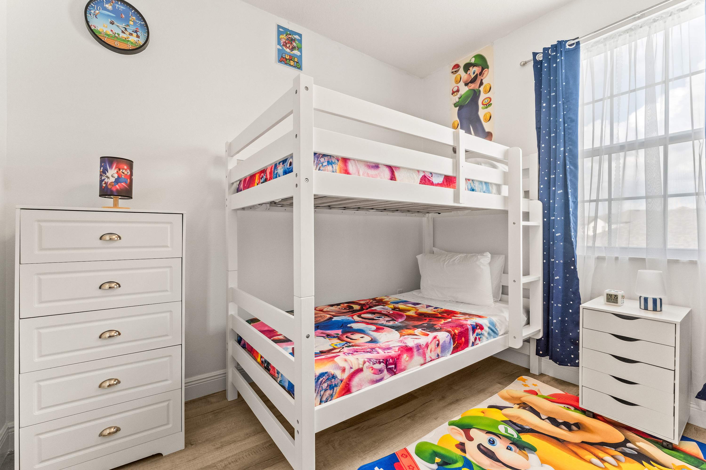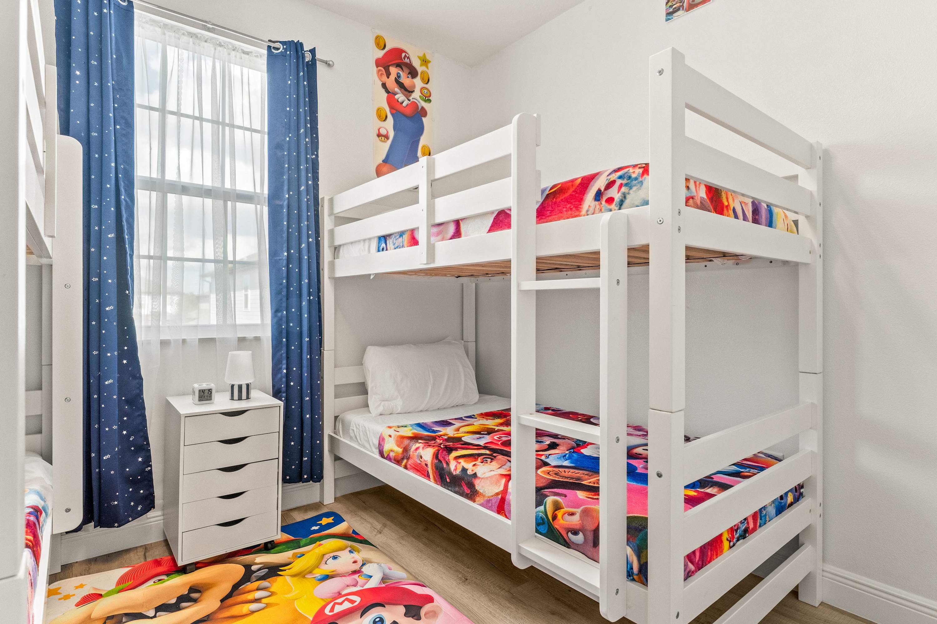 Bedroom #5 is Super Mario themed and includes 2 sets of twin-over-twin bunk beds and a smart TV.