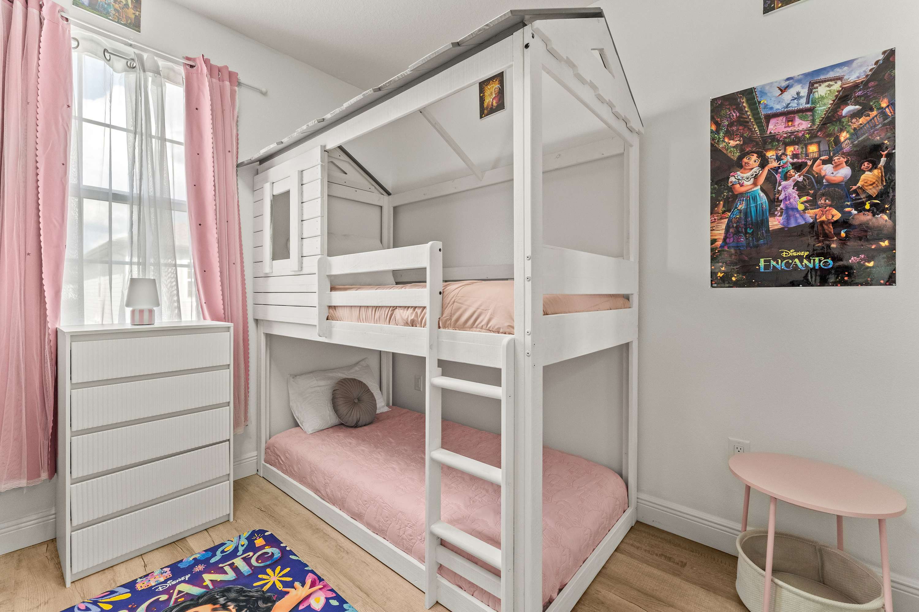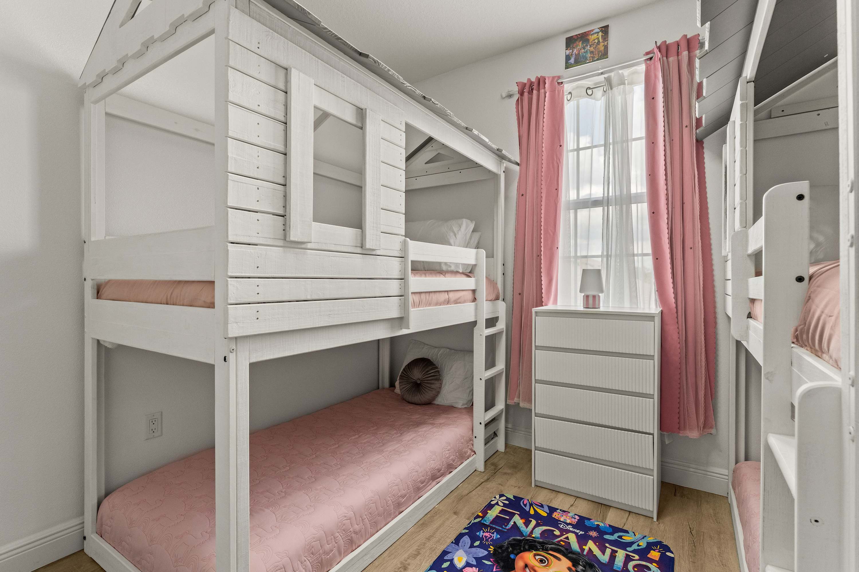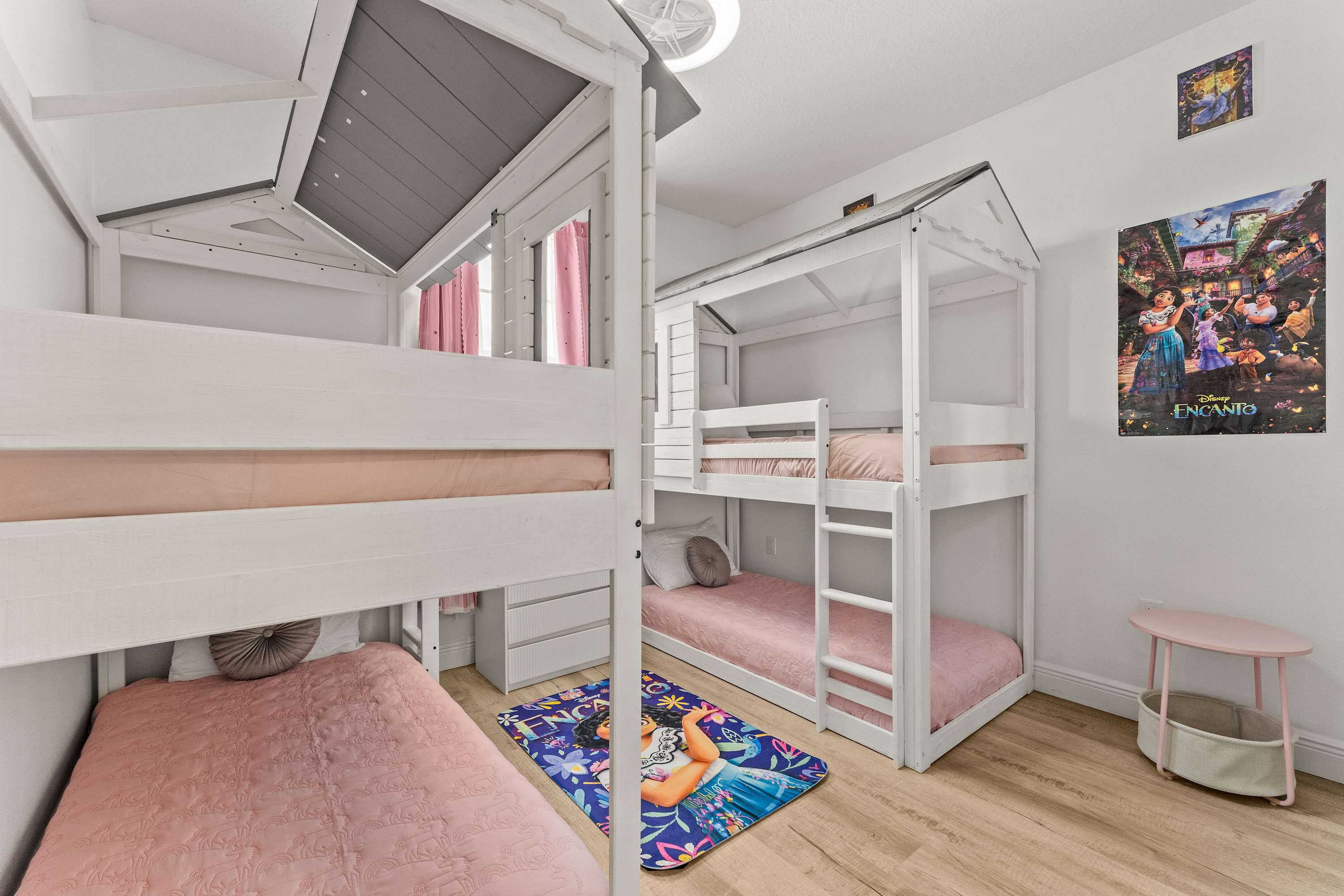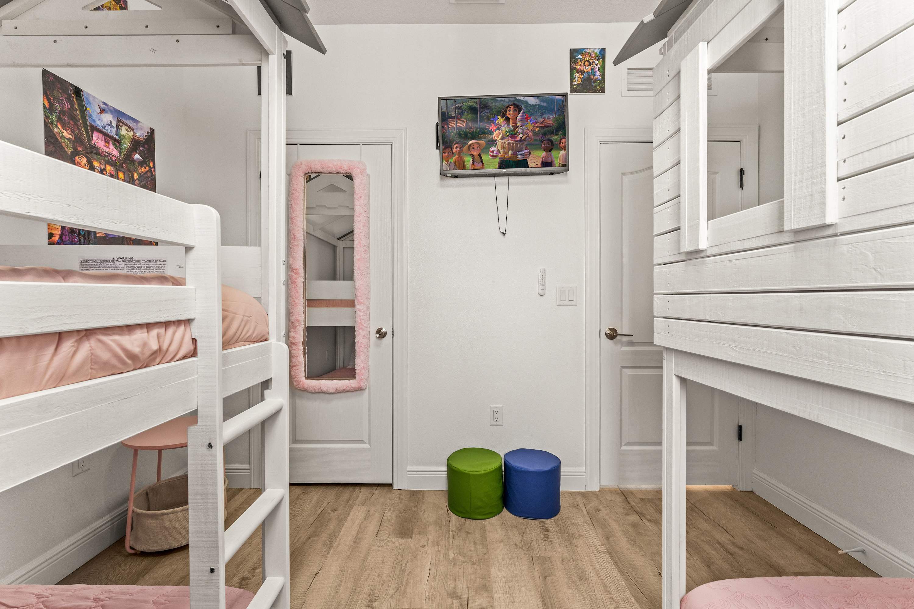 Bedroom #4 is Encanto themed and includes 2 sets of twin-over-twin bunk beds and a smart TV.