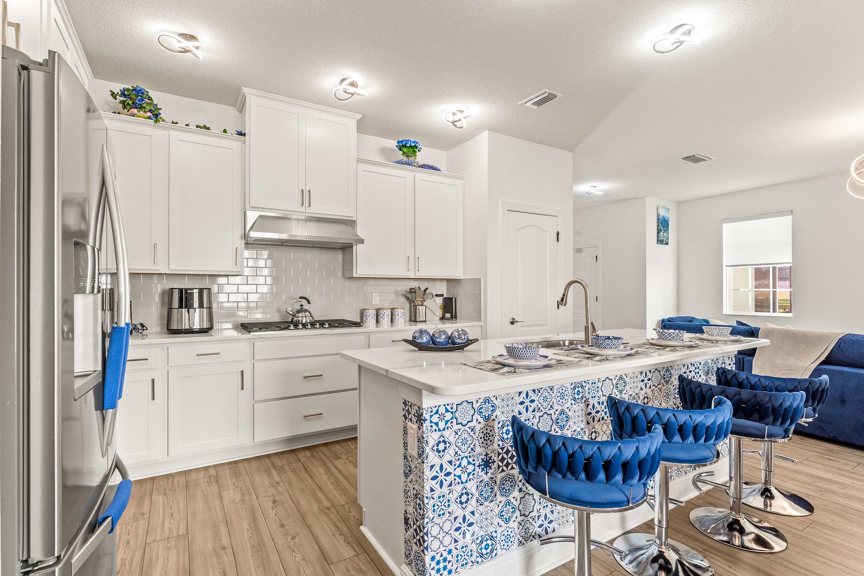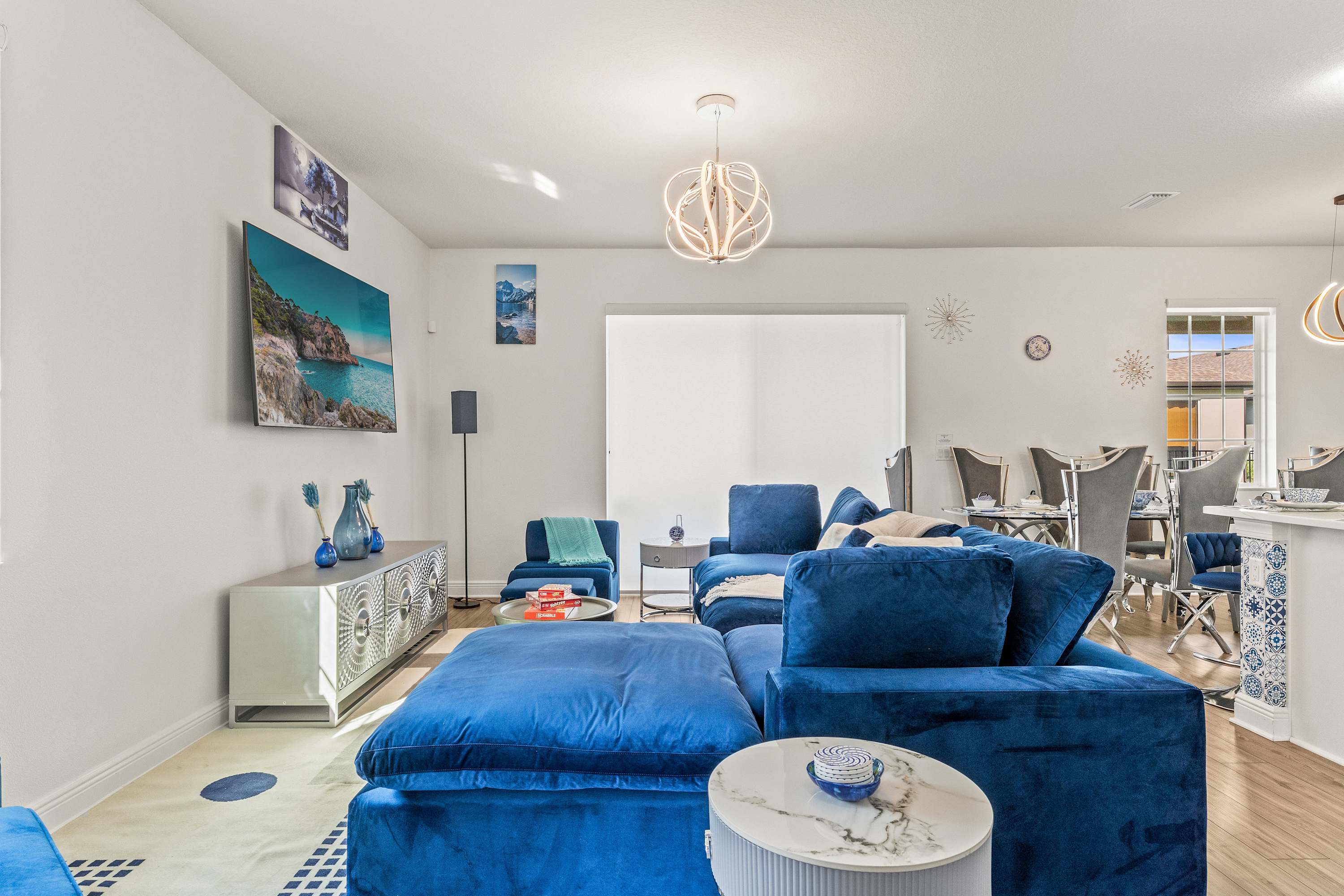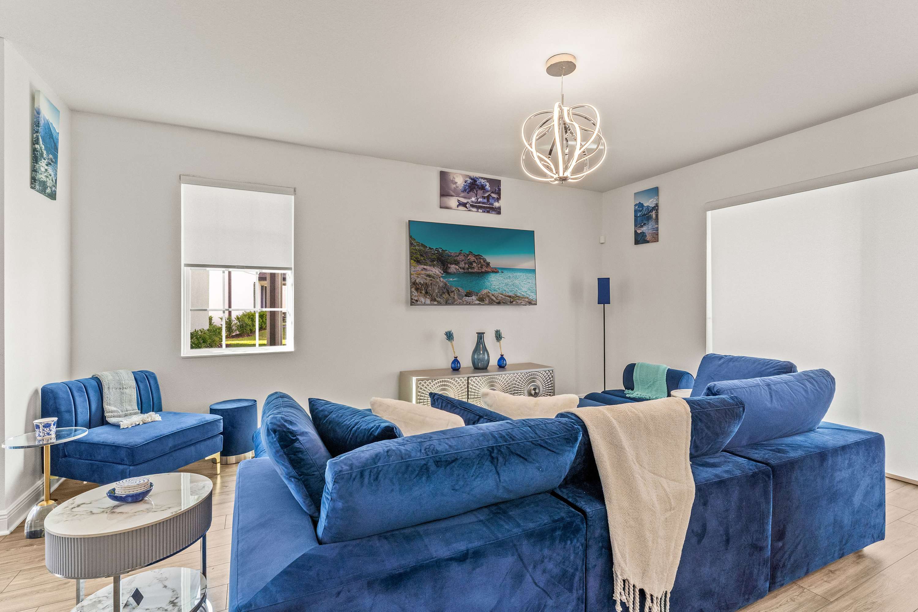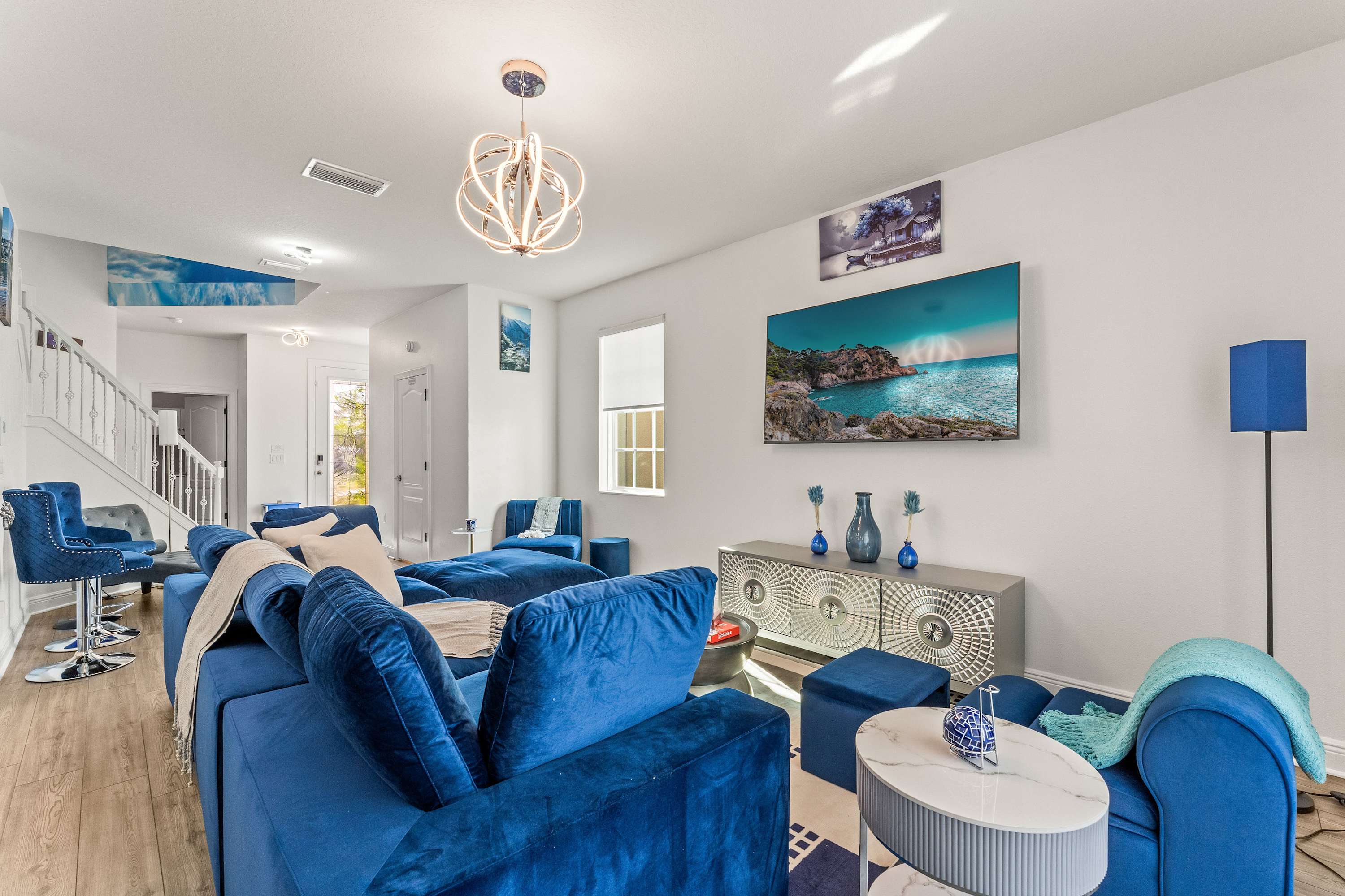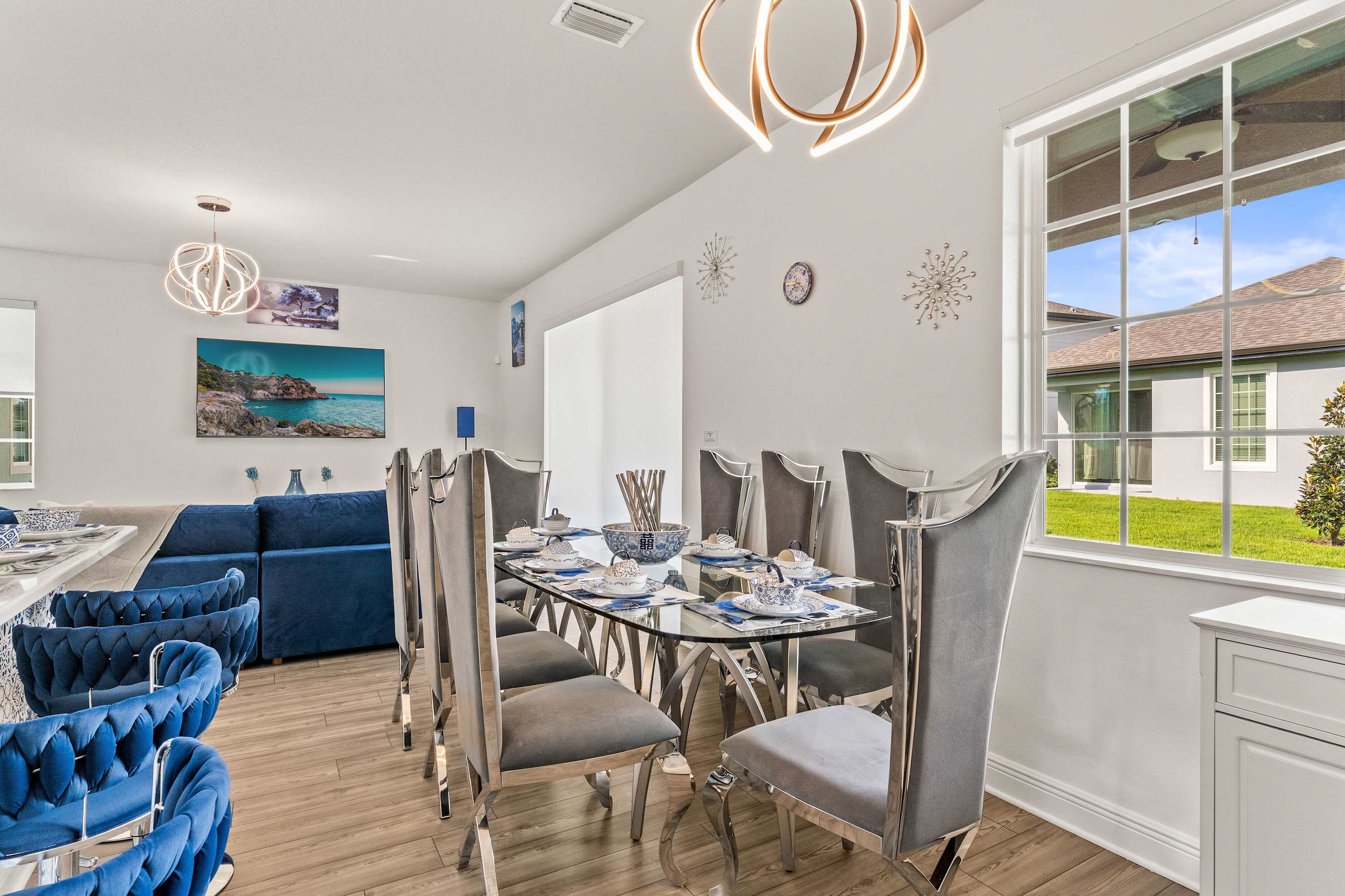 Step inside this newly furnished retreat, where thoughtful design and cool sapphire tones set a calming coastal mood. The living room invites you to sink into a deep-blue velour sofa with chaise, surrounded by two accent chairs and a cozy sitting bench. Soft touches of blue carry throughout the space—echoing water, sky, and polish pottery motifs. Sliding glass doors lead to the back patio, where a shaded overhang, twin ceiling fans, and a grassy yard create the perfect place to unwind after a day in the parks.