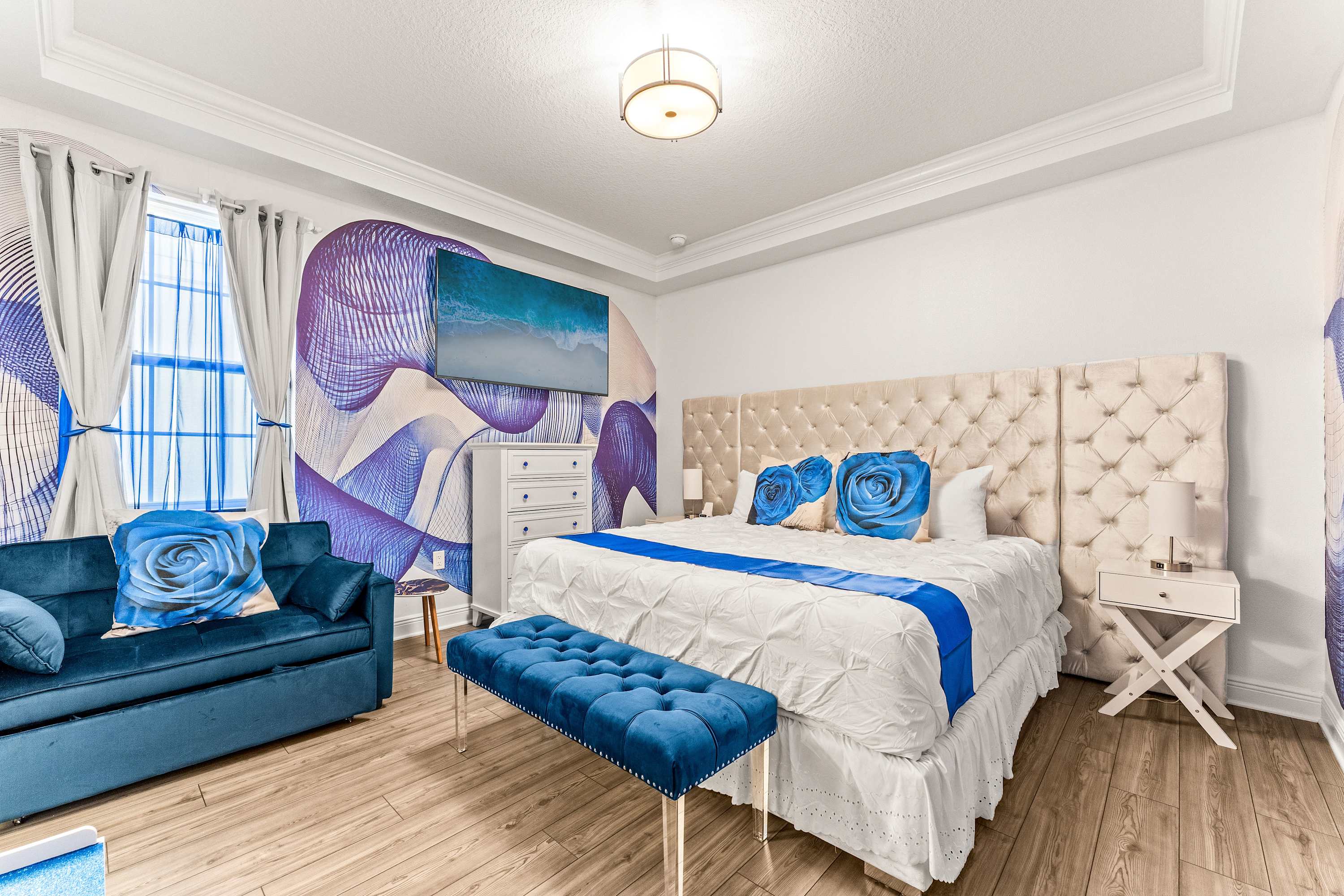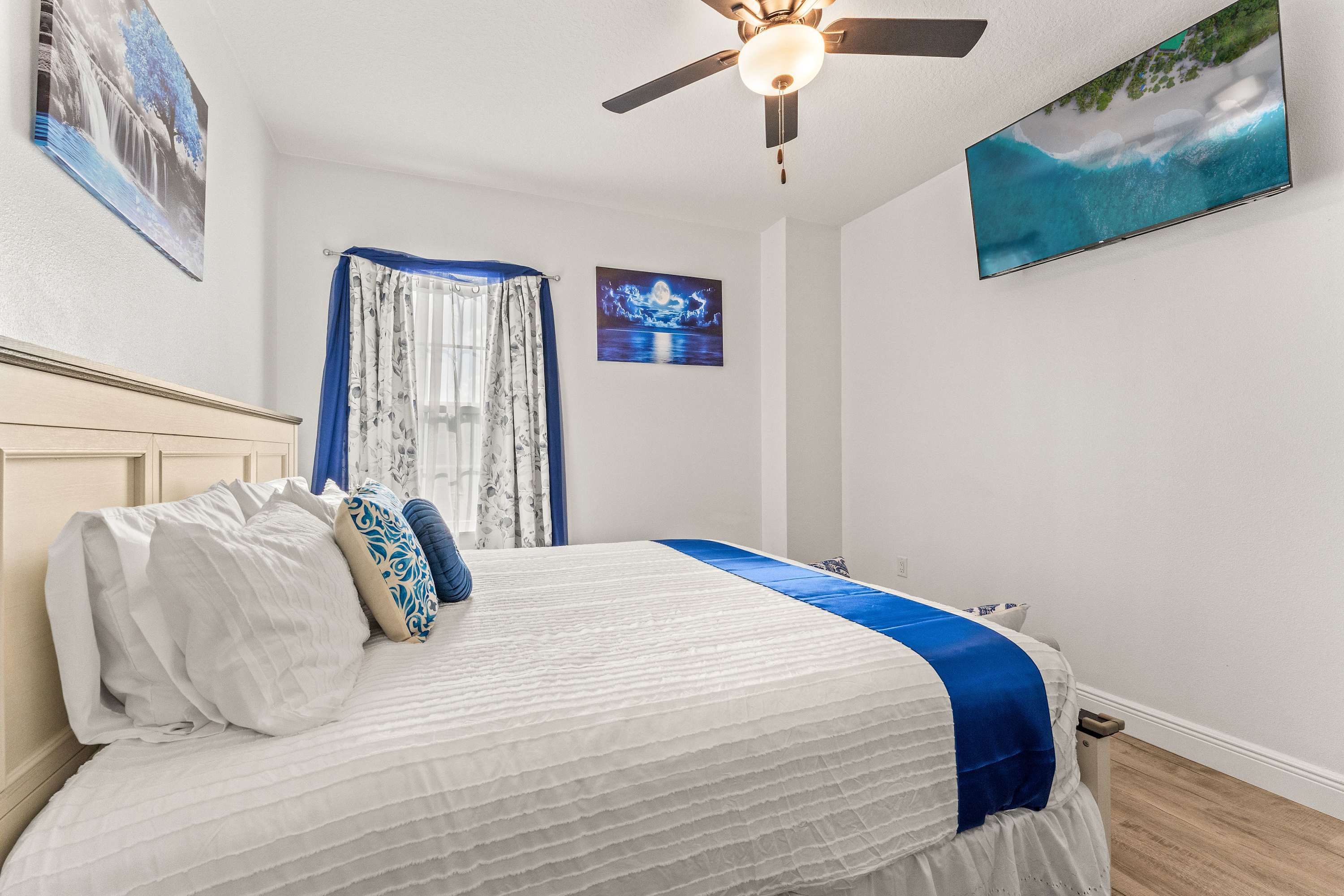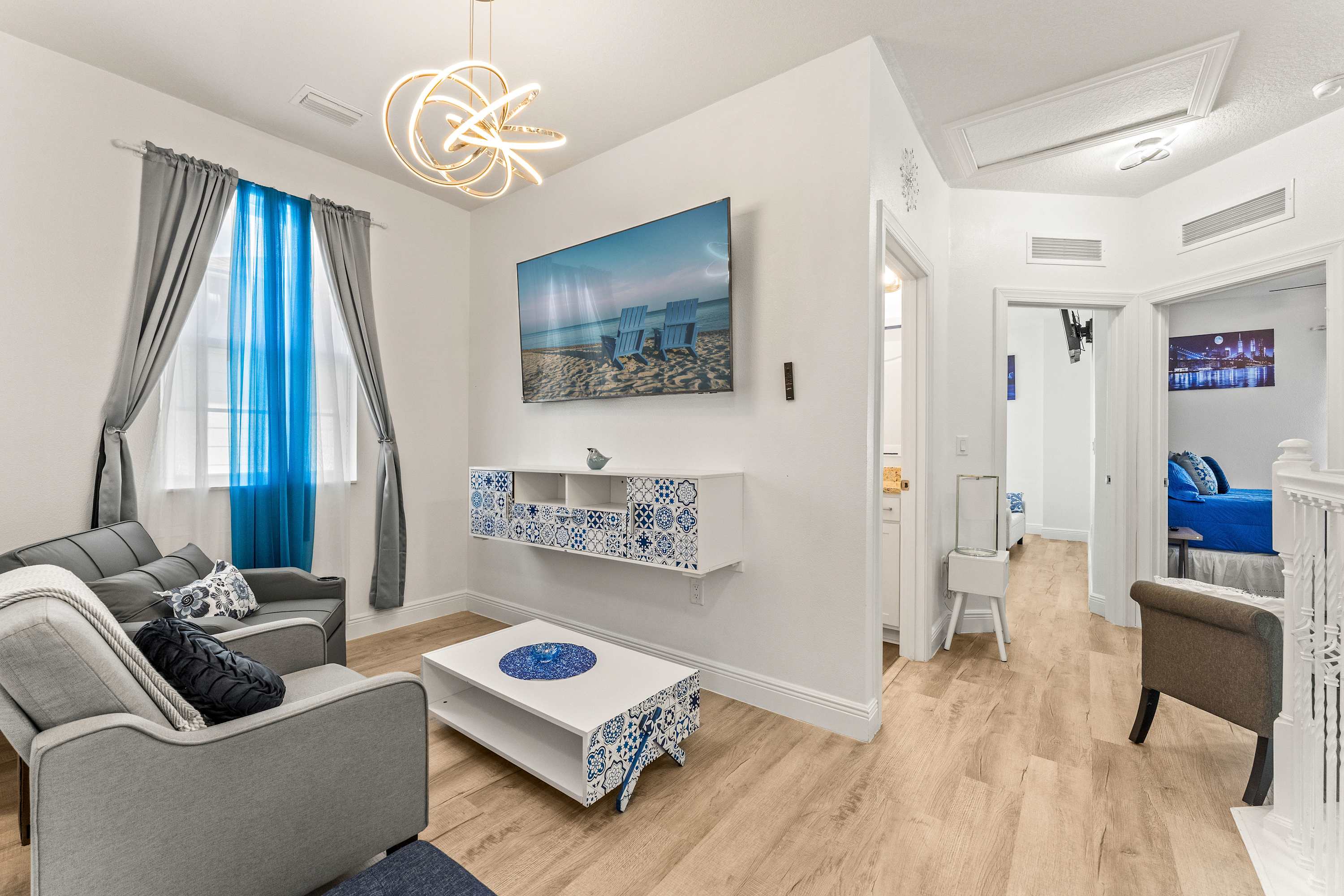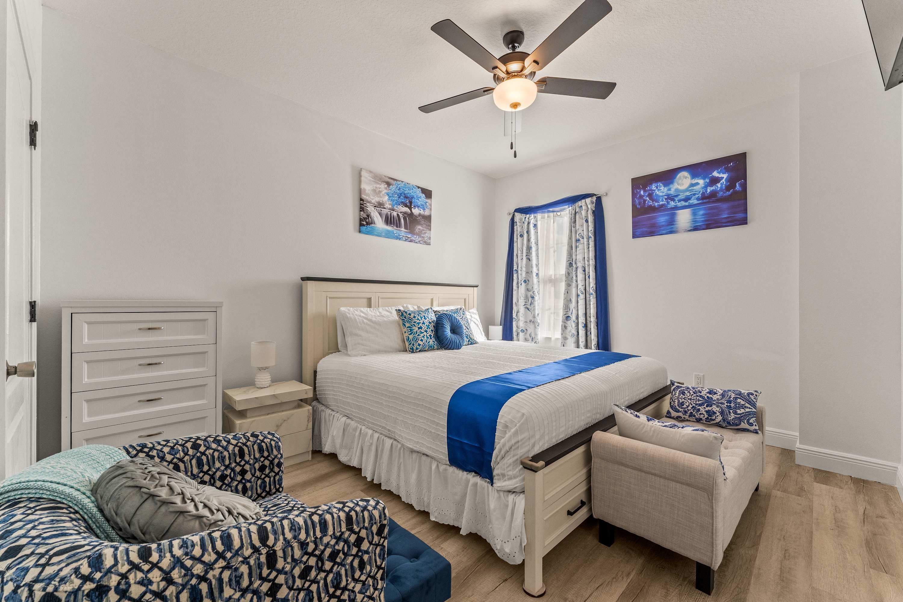 Step inside this newly furnished retreat, where thoughtful design and cool sapphire tones set a calming coastal mood. The living room invites you to sink into a deep-blue velour sofa with chaise, surrounded by two accent chairs and a cozy sitting bench. Soft touches of blue carry throughout the space—echoing water, sky, and polish pottery motifs. Sliding glass doors lead to the back patio, where a shaded overhang, twin ceiling fans, and a grassy yard create the perfect place to unwind after a day in the parks.
