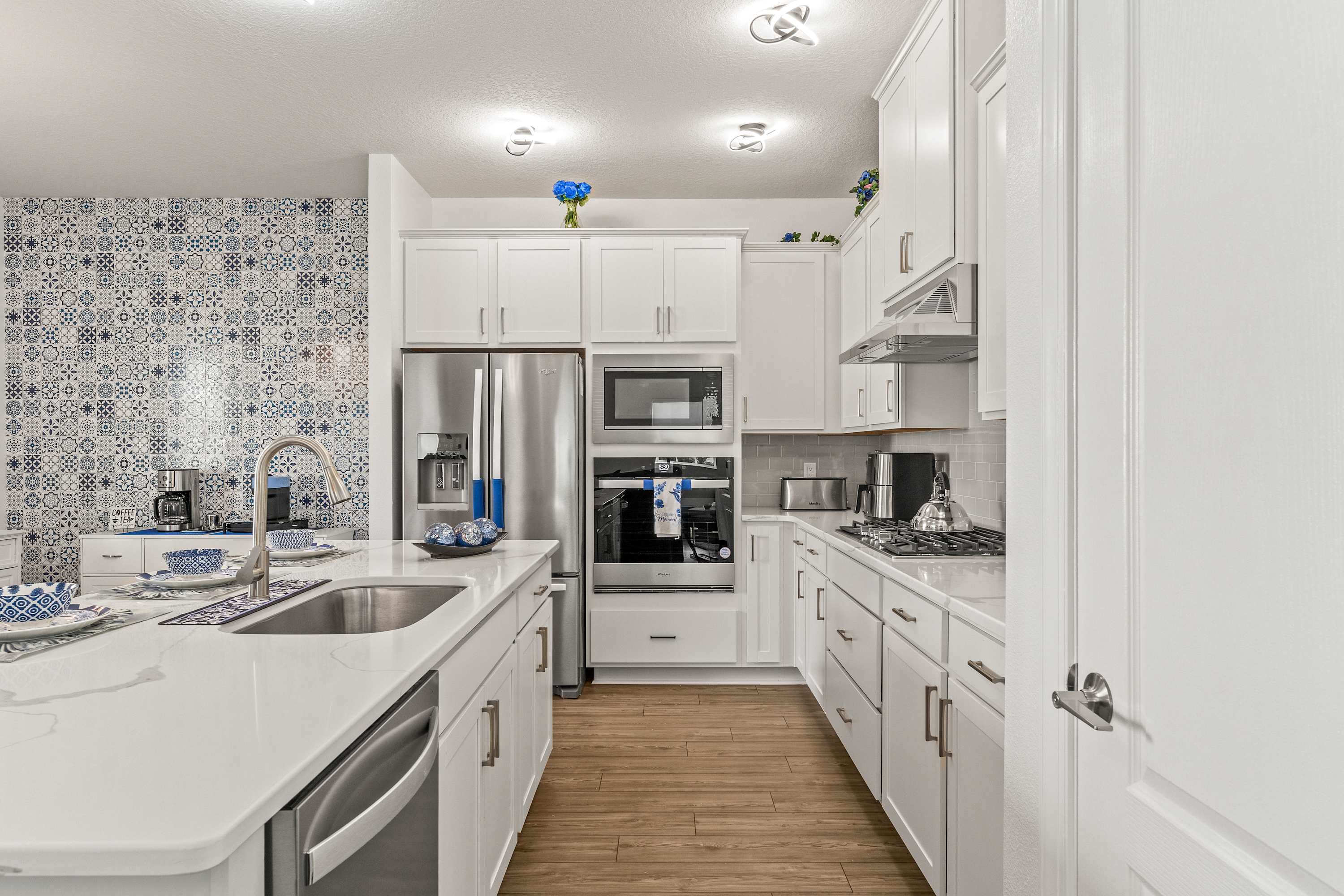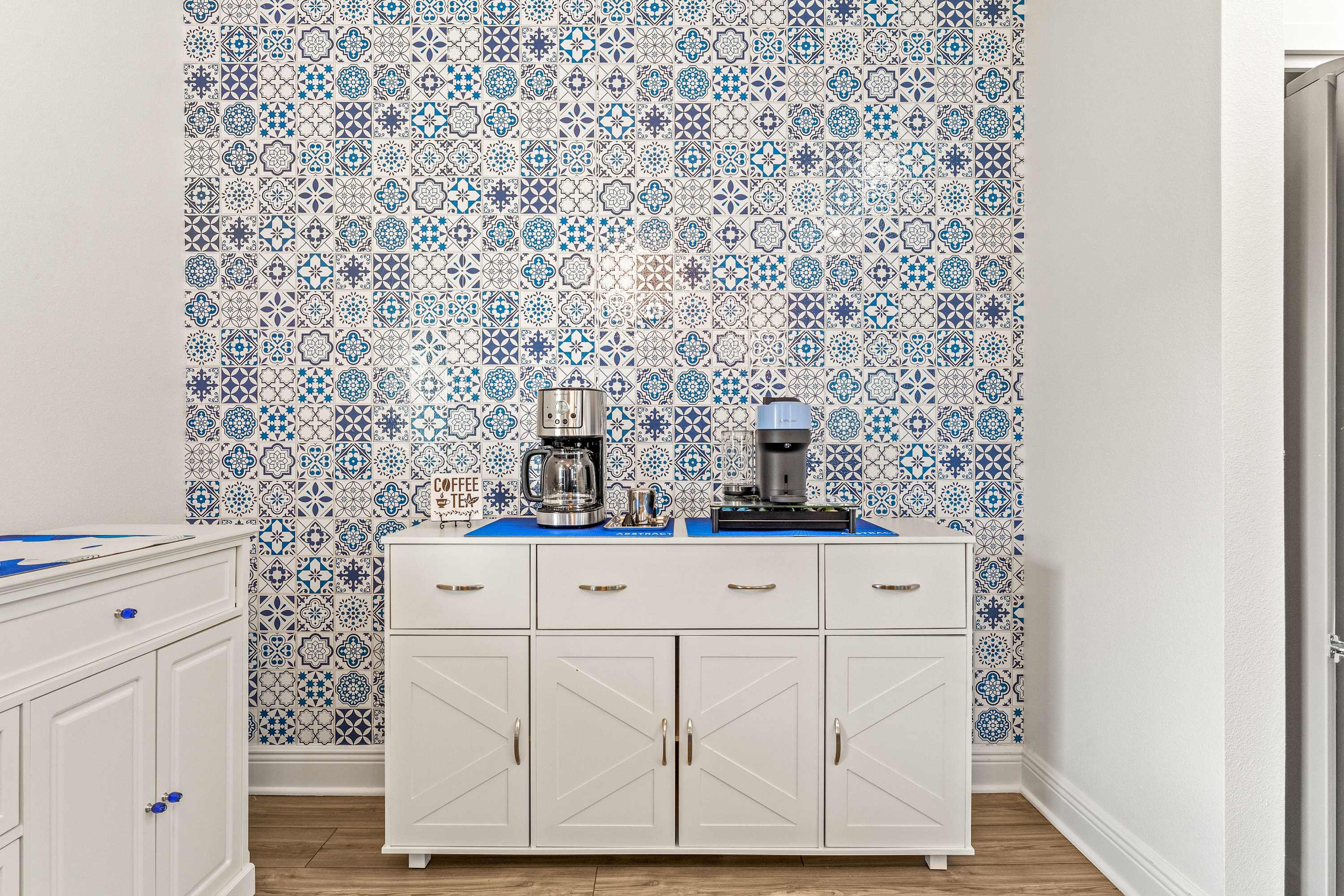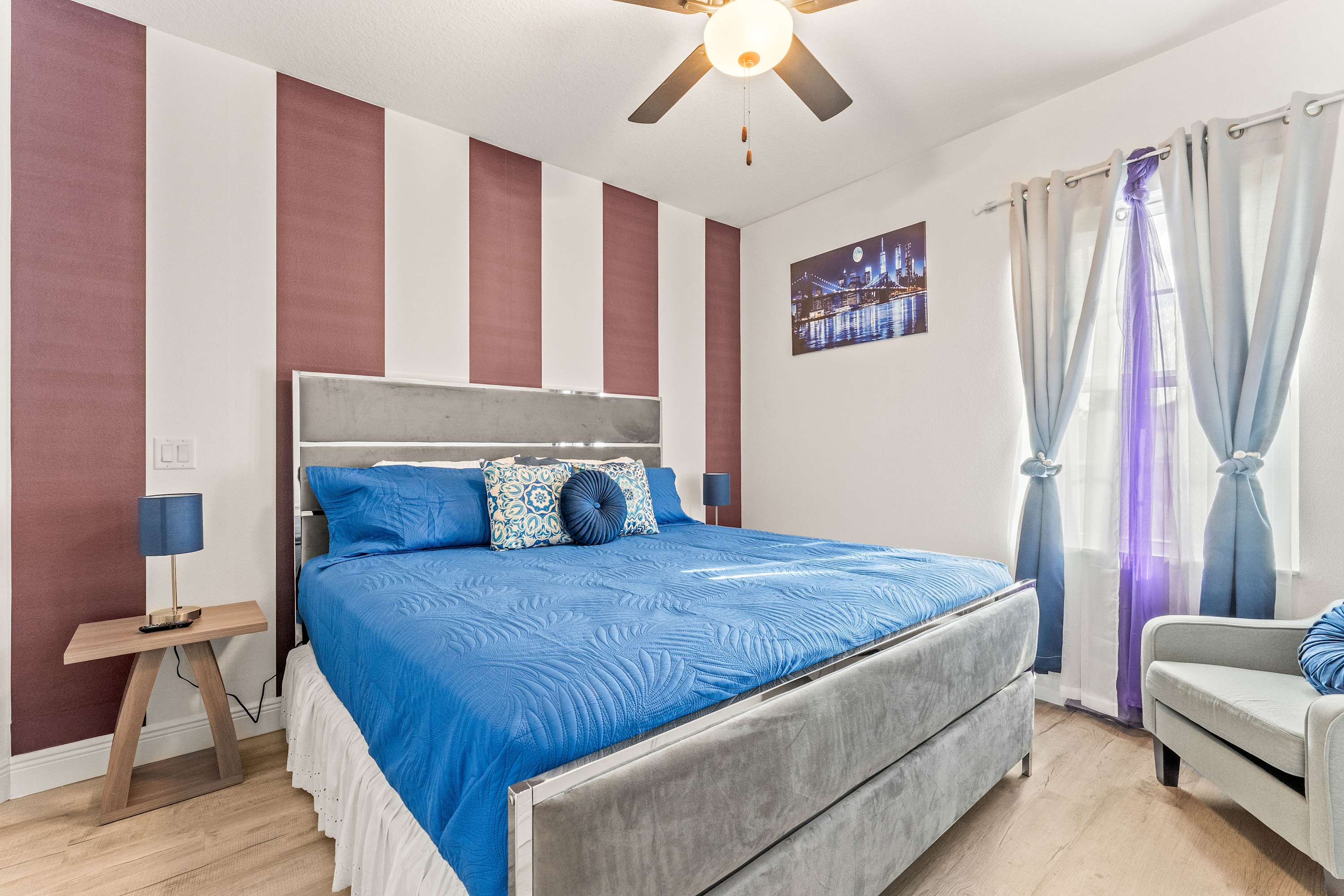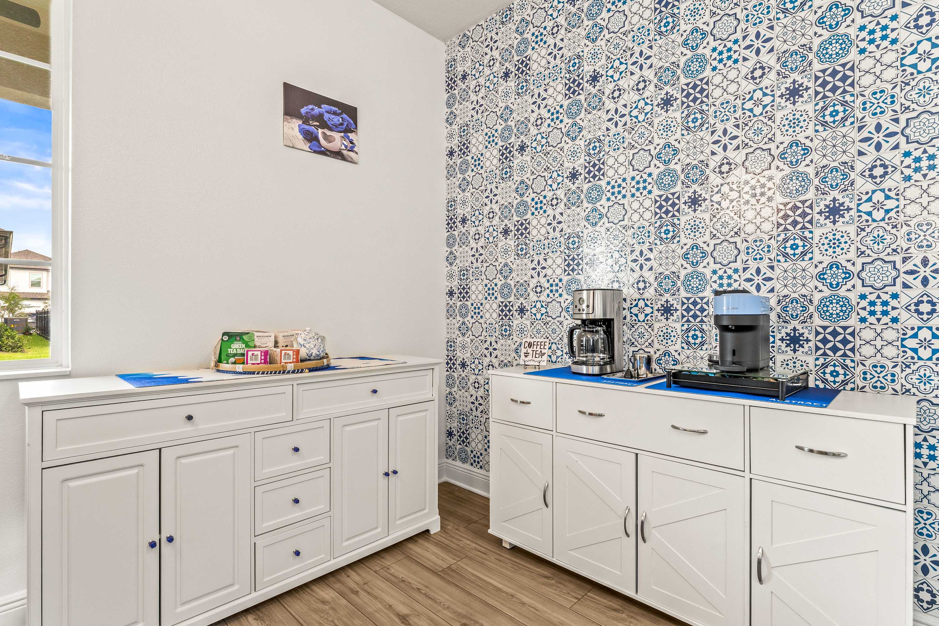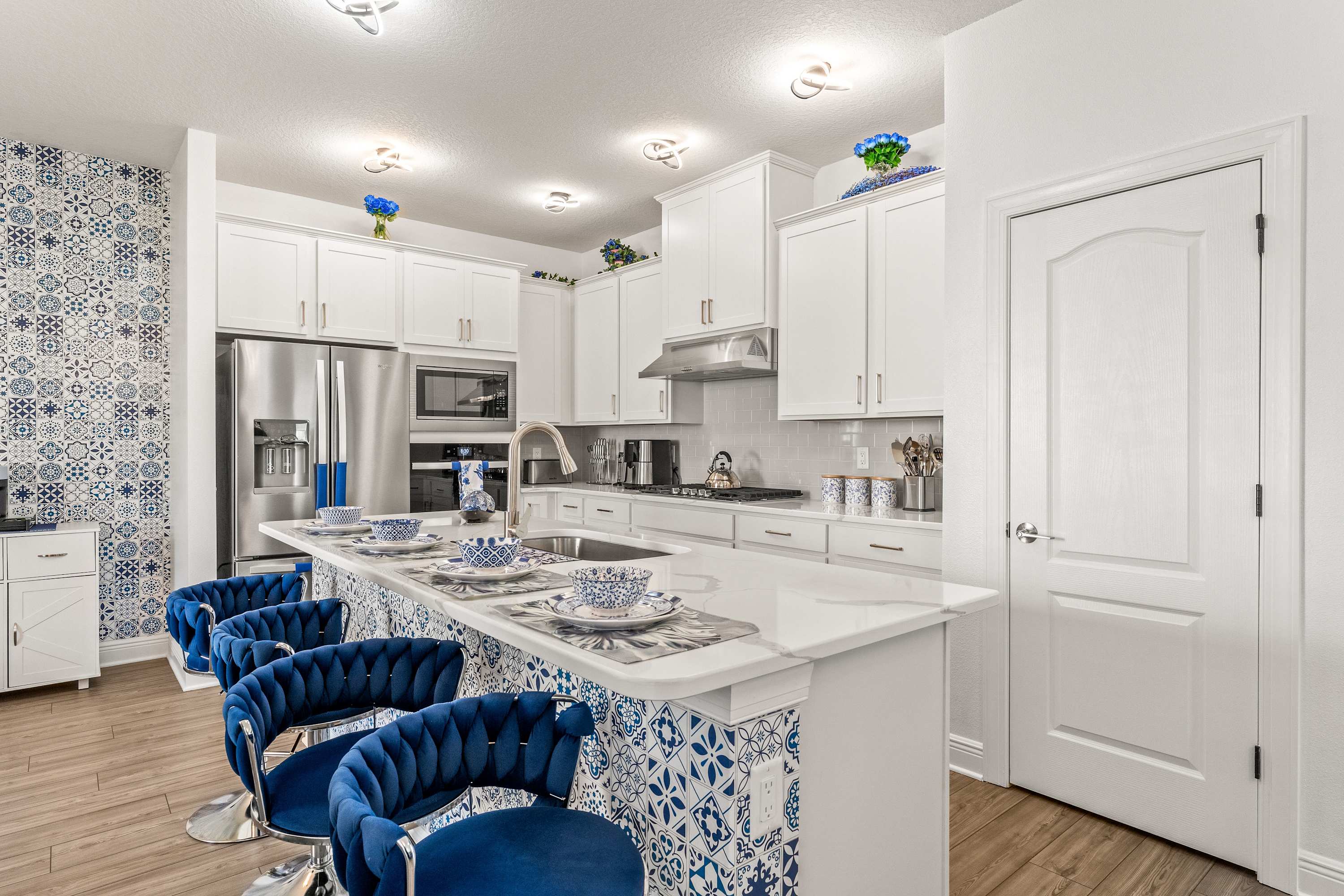 Step inside this newly furnished retreat, where thoughtful design and cool sapphire tones set a calming coastal mood. The living room invites you to sink into a deep-blue velour sofa with chaise, surrounded by two accent chairs and a cozy sitting bench. Soft touches of blue carry throughout the space—echoing water, sky, and polish pottery motifs. Sliding glass doors lead to the back patio, where a shaded overhang, twin ceiling fans, and a grassy yard create the perfect place to unwind after a day in the parks.