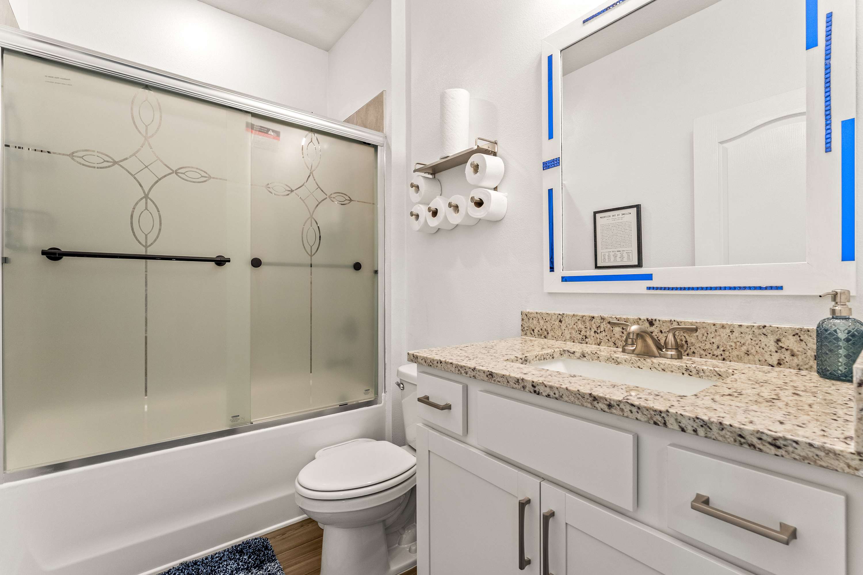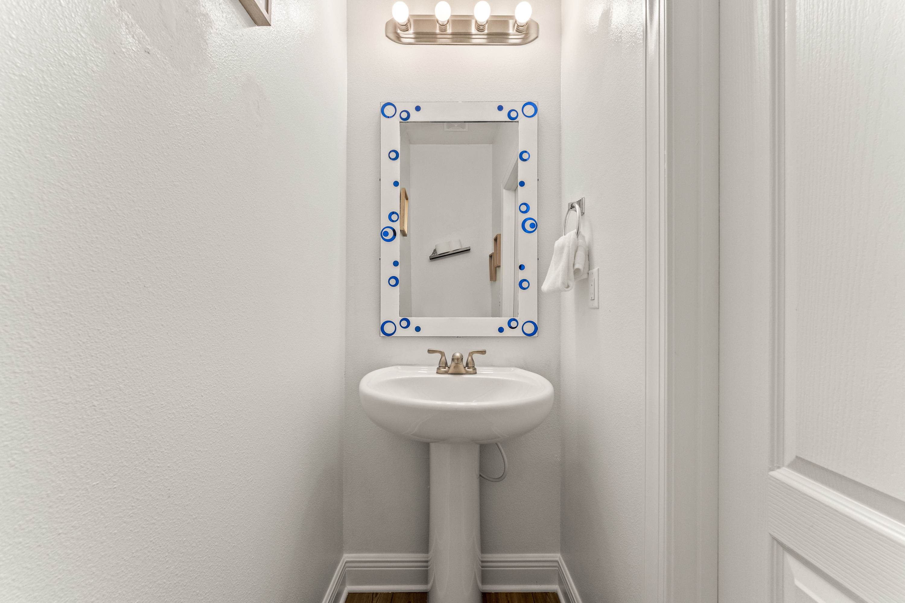 This home also includes a half bathroom with a pedestal sink and an additional full guest bathroom with a single vanity and a shower/tub combo.