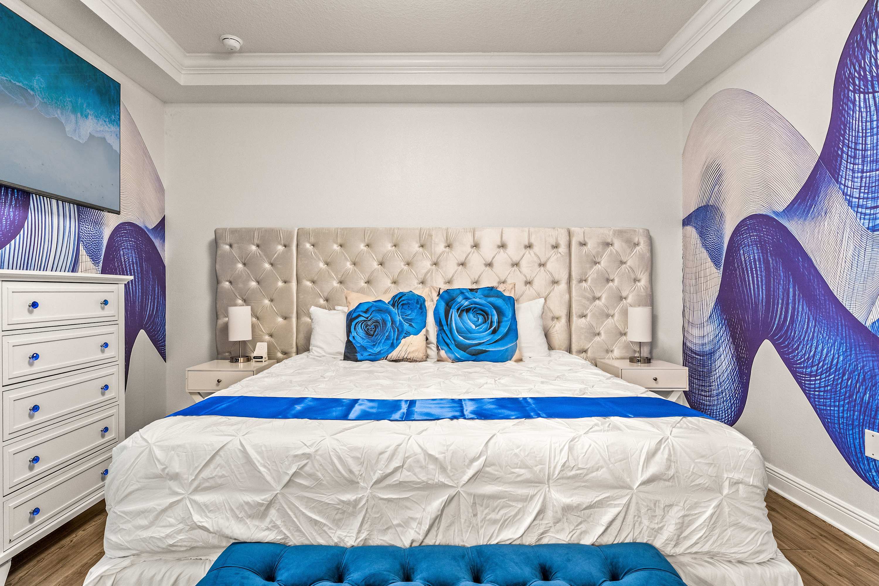 Bedroom #2 includes a king size bed, a chair, and a smart TV.