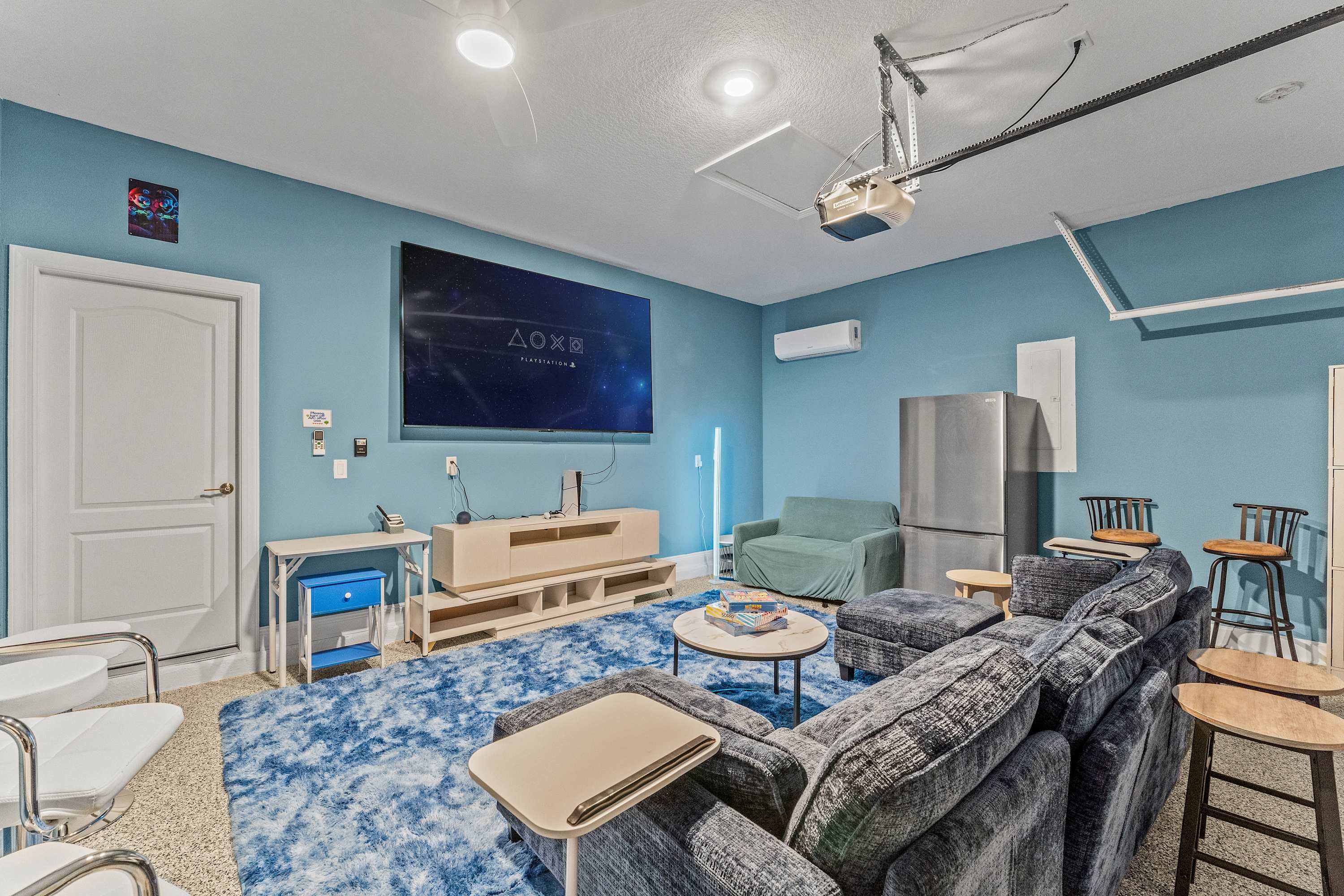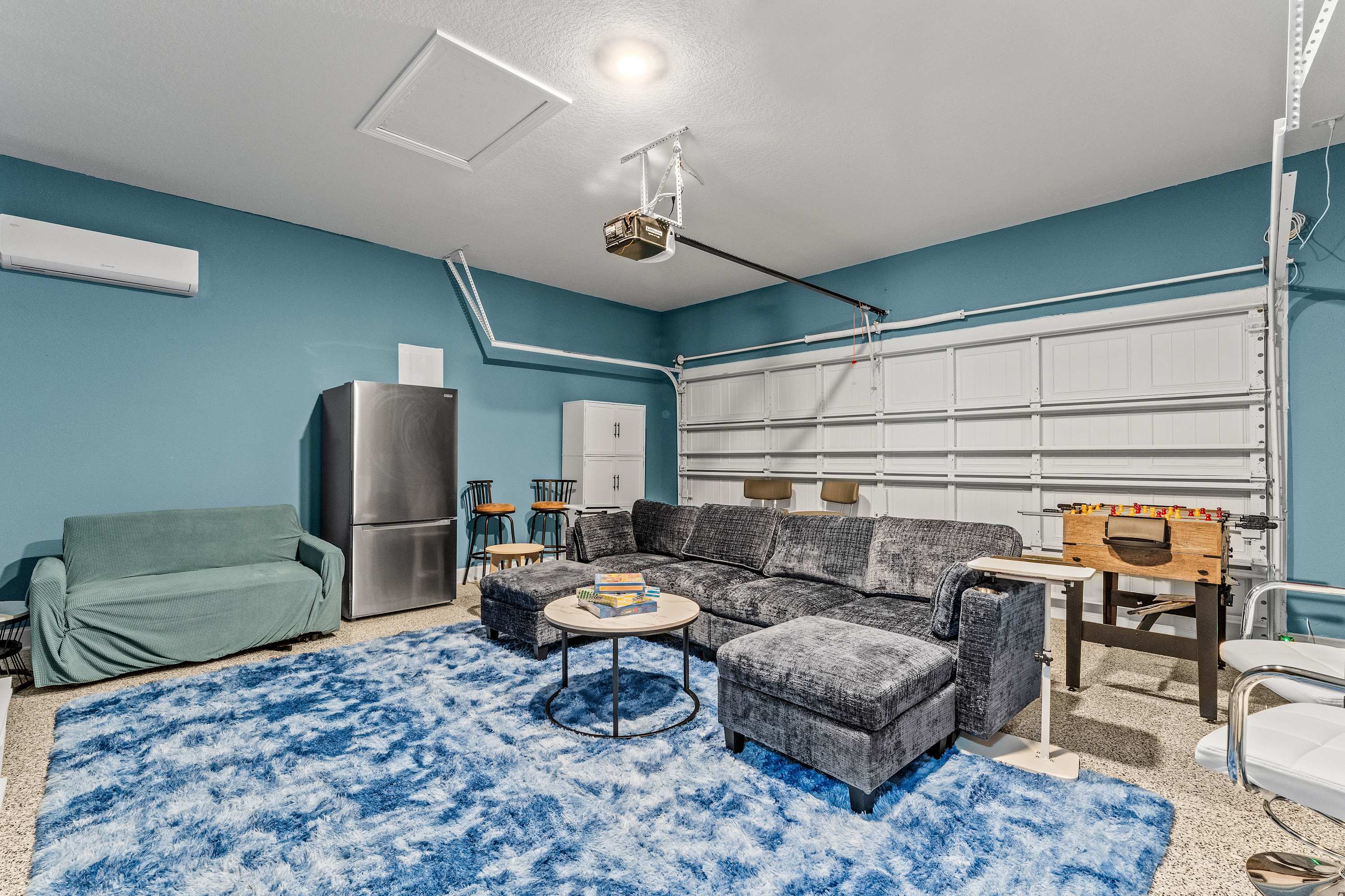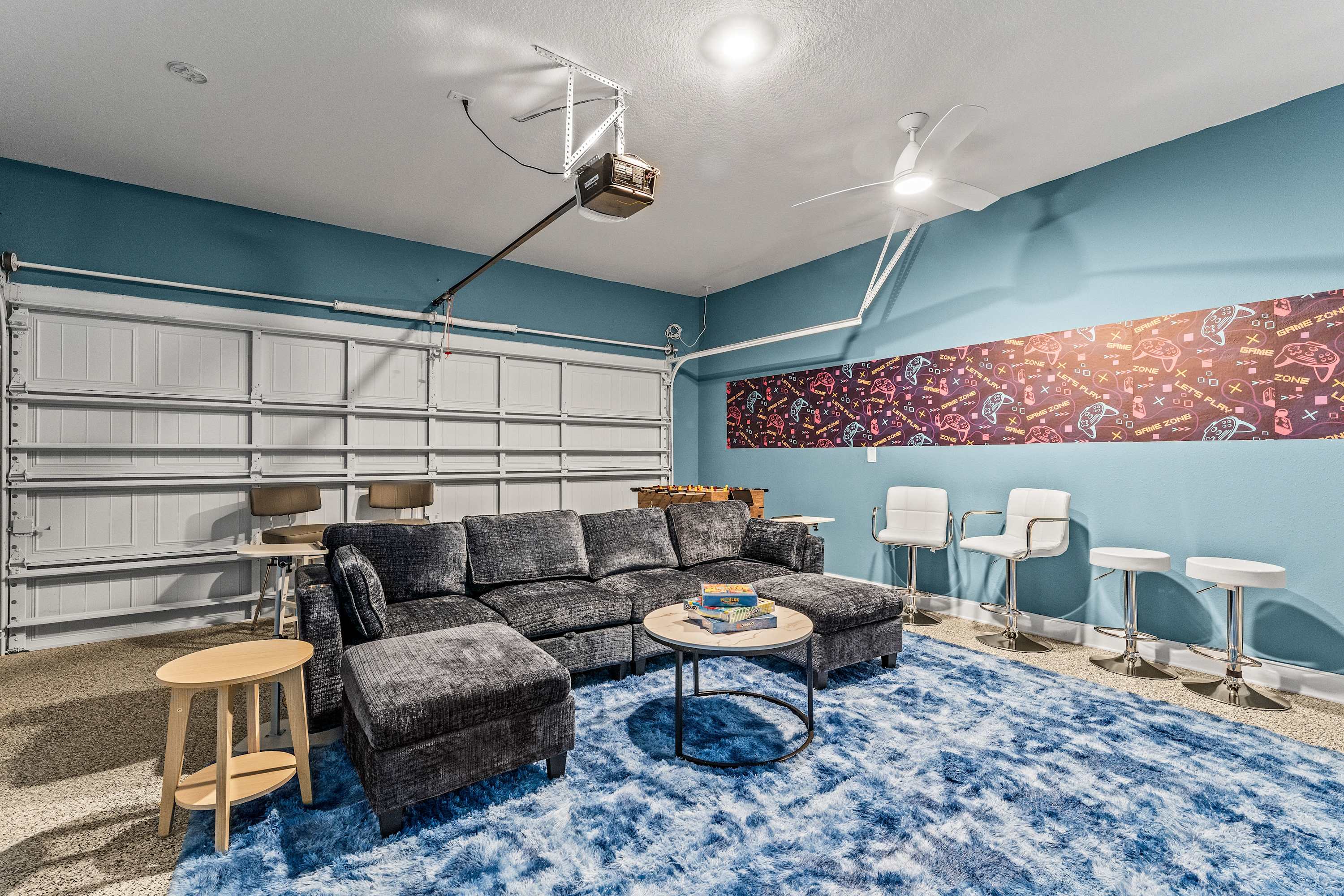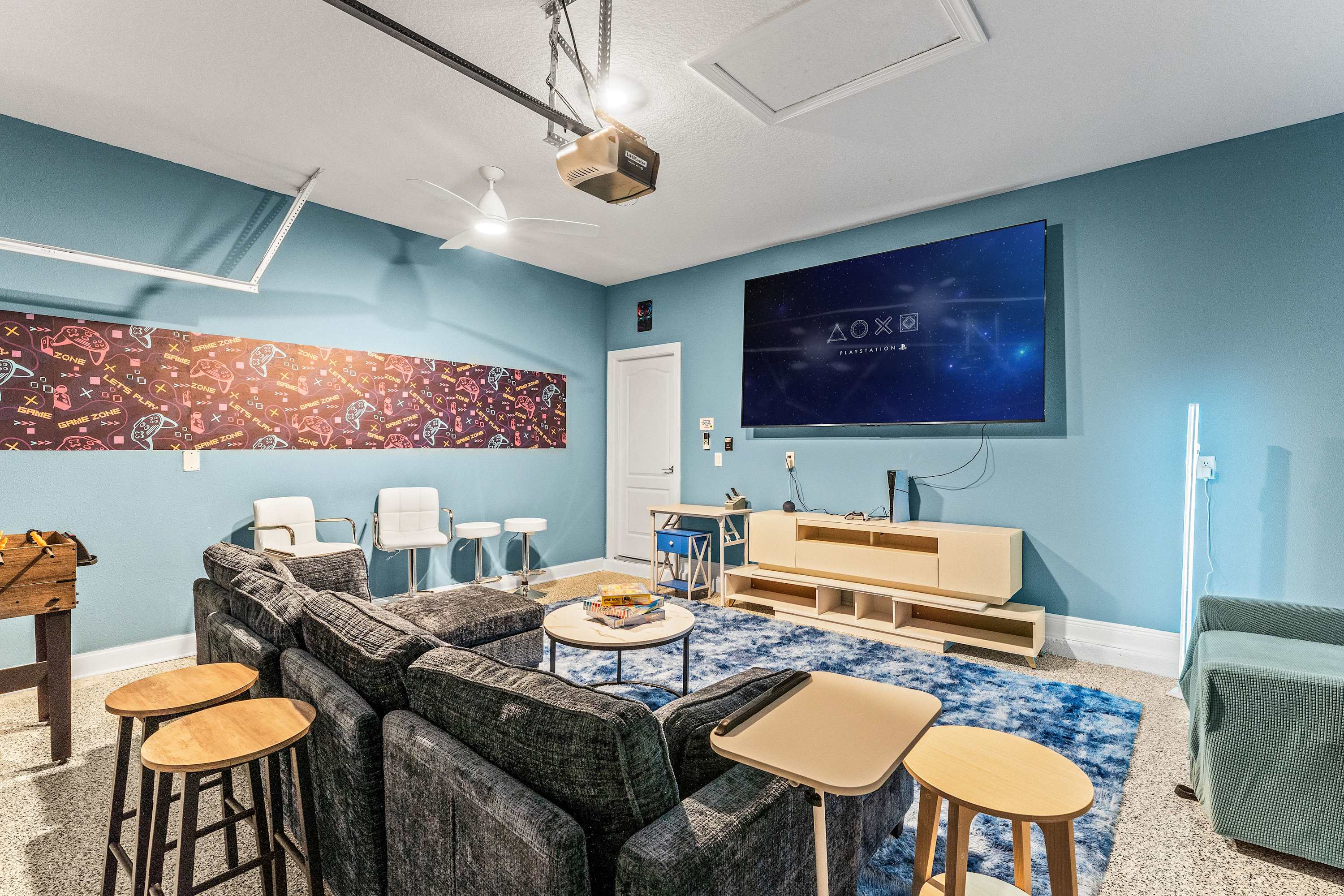 The kitchen gleams with quartz countertops, stainless steel appliances, and both drip and on-demand coffee options to suit every morning mood. Counter seating for four and a dining table for eight make gathering easy, whether for family meals or casual takeout nights. For entertainment, head to the garage game room, a true crowd-pleaser featuring a multi-game table (pool and air hockey), foosball, smart TV, sofa with ottomans, loveseat, and even a PS5 gaming console. Ten bar stools line the room for late-night hangouts, while a desk provides a convenient workspace if needed. Back upstairs, the loft offers a quieter escape with a smart TV and two comfortable chairs—a perfect spot to enjoy a favorite show or unwind before bed.