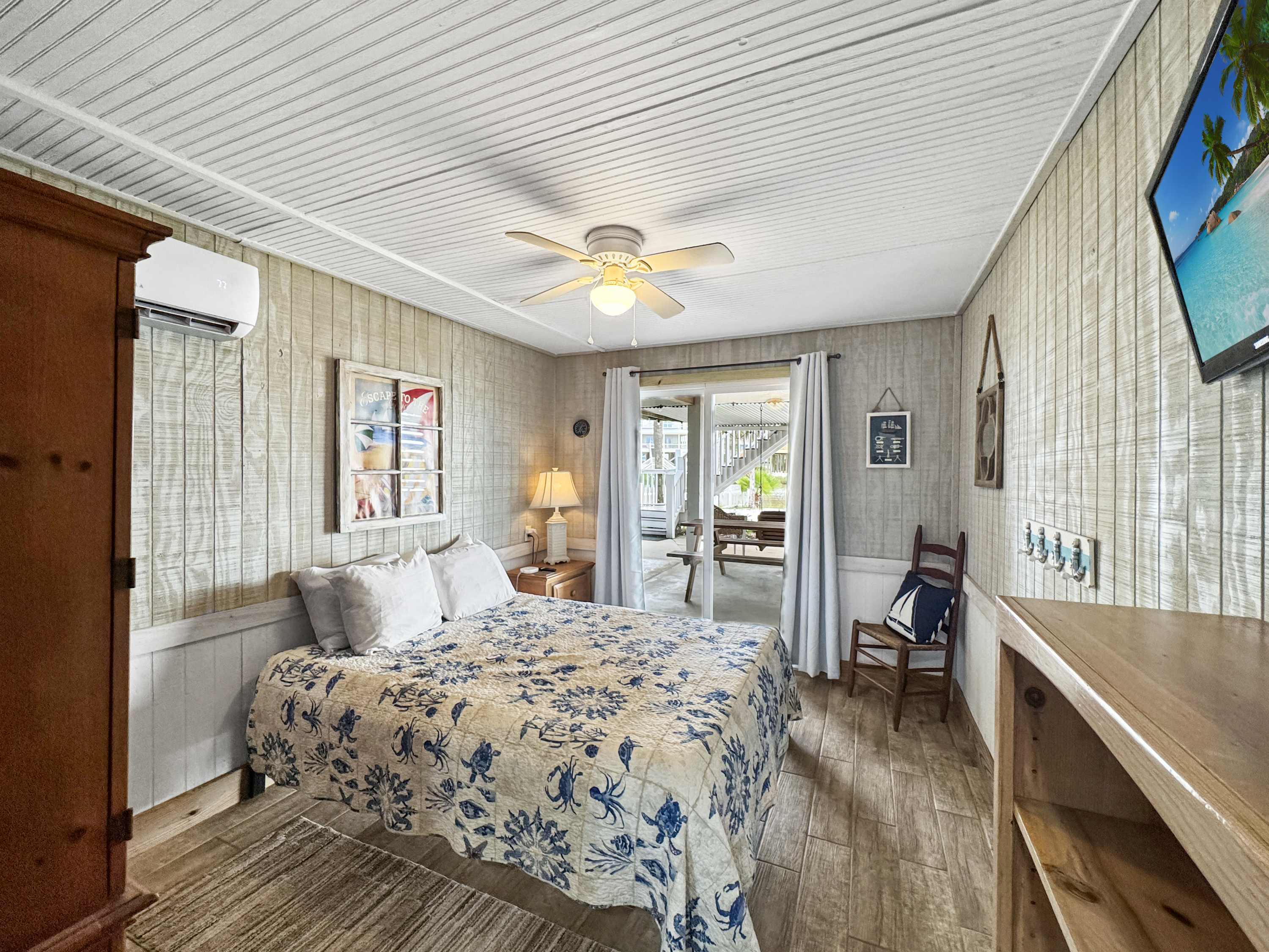 Bedroom #3 includes a queen size bed, a smart TV, a small kitchenette, a table for 2, access to outside, and an ensuite bathroom with a pedestal sink and a shower/tub combo.