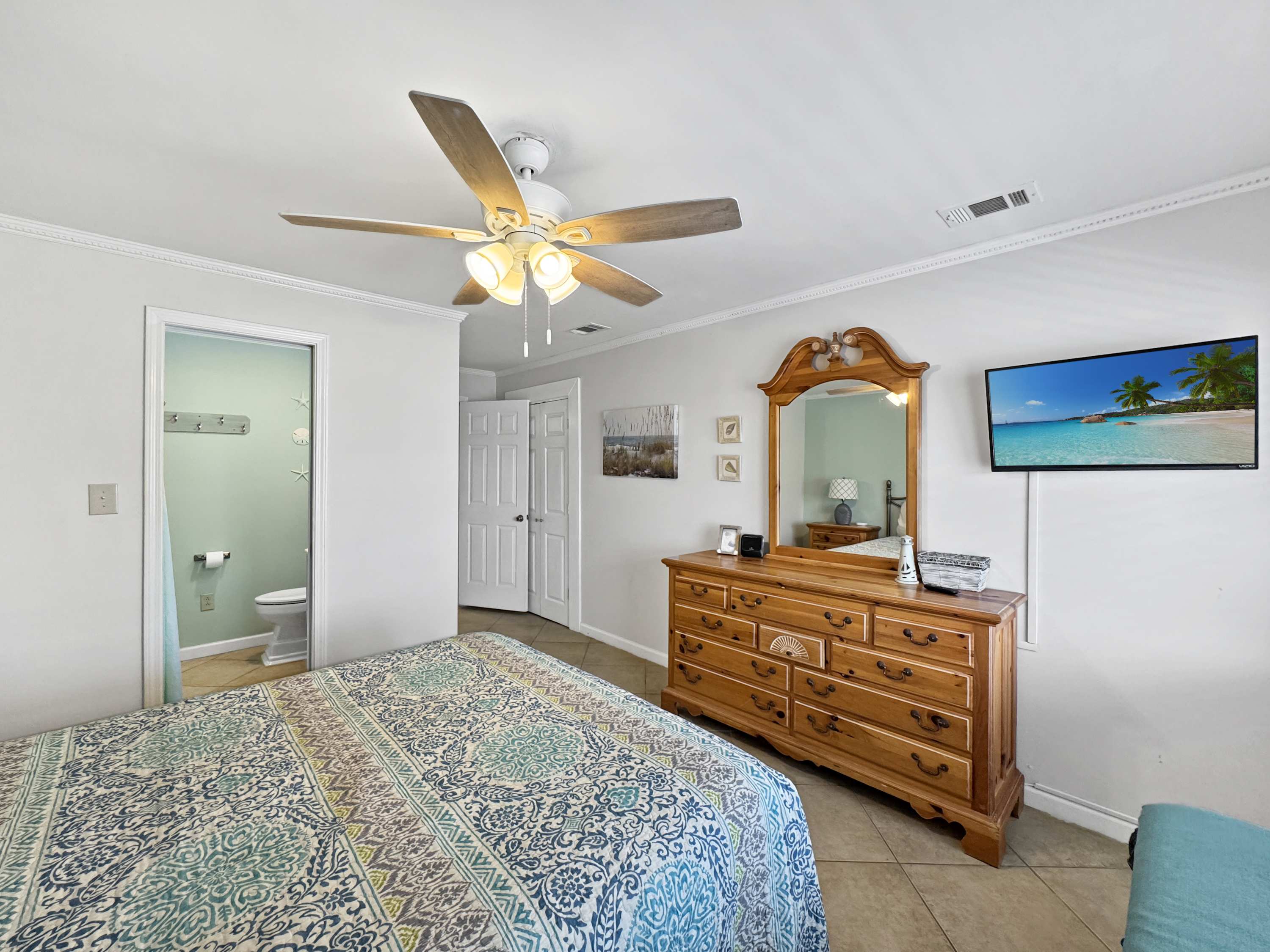 Bedroom #1 includes a queen size bed, a smart TV, and an ensuite bathroom with a single vanity and a walk-in shower.