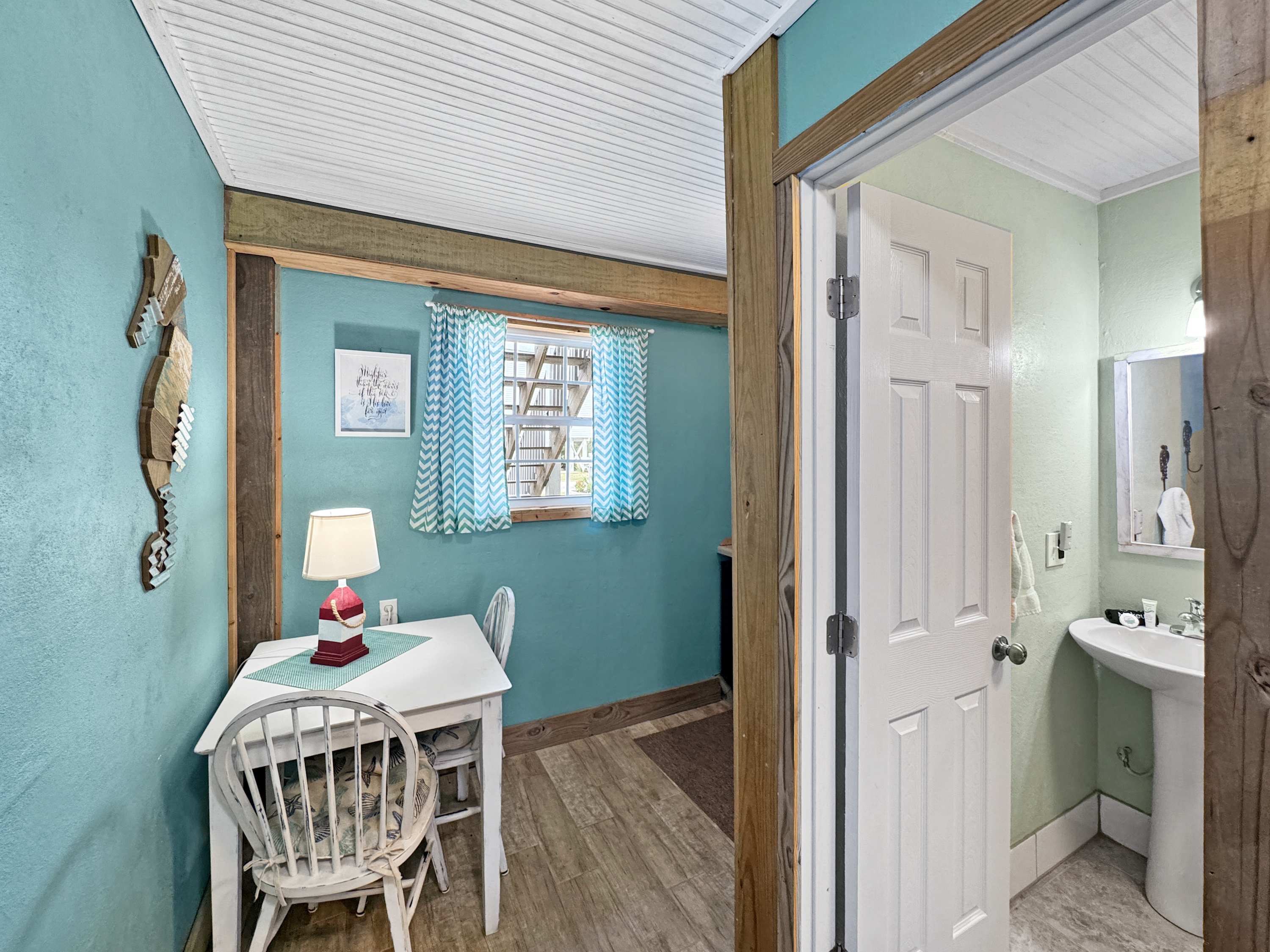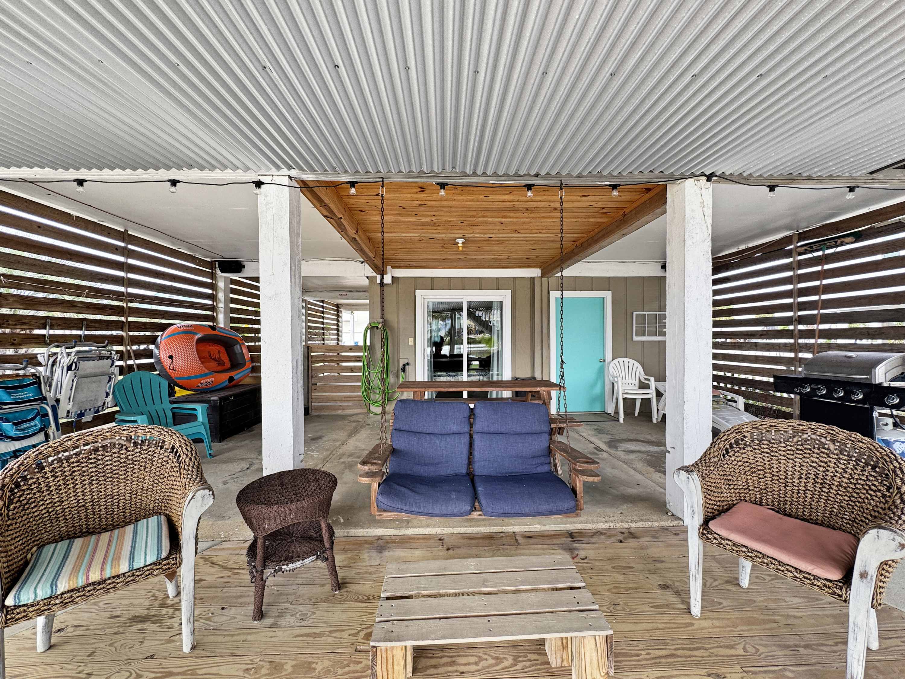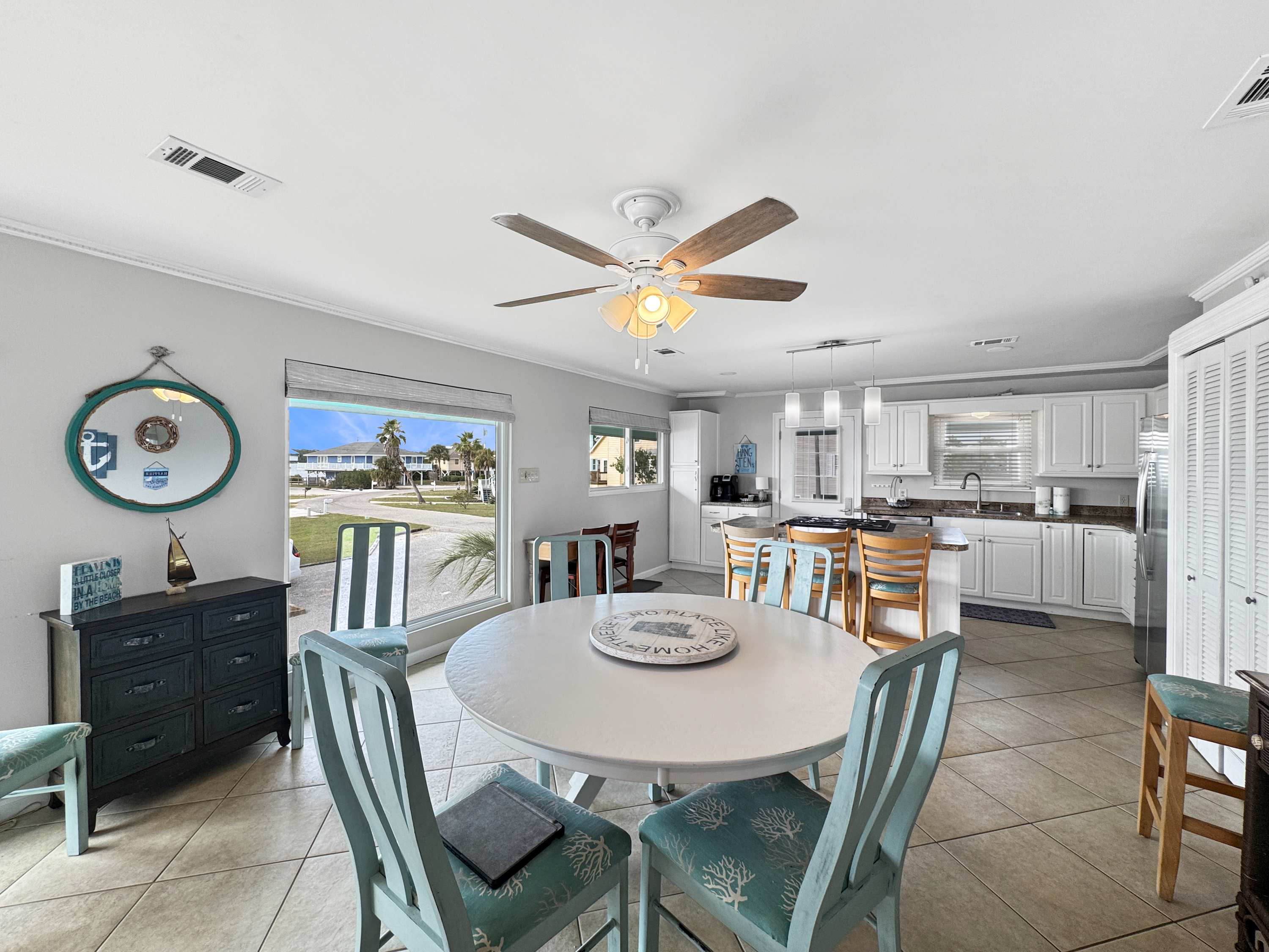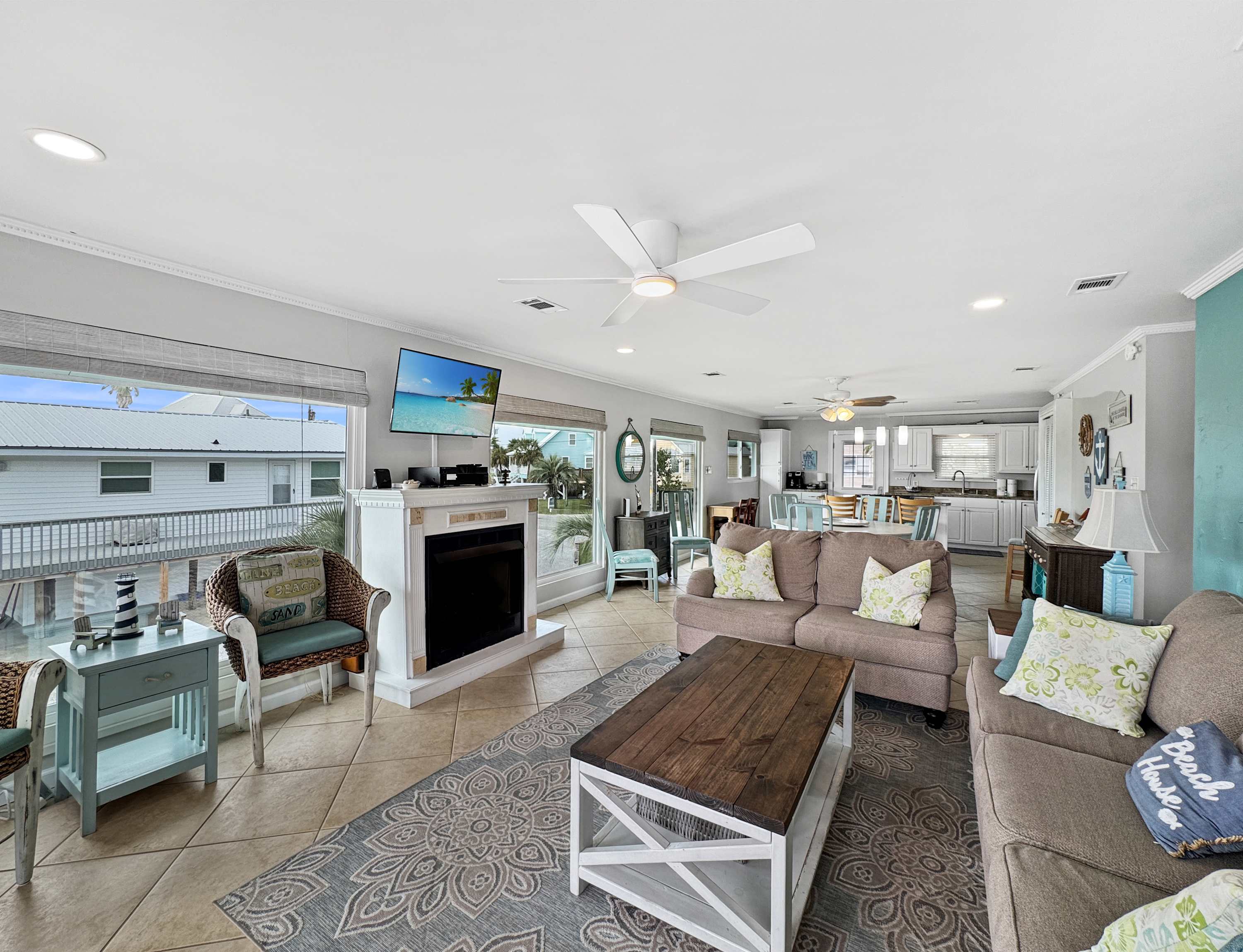 Inside, the open-concept living, kitchen, and dining area welcomes you with a breezy, relaxed feel. The living room features a cozy couch and love seat facing a smart TV, perfect for unwinding after a day in the sun. The adjoining kitchen boasts stainless steel appliances, crisp white cabinetry, a single-cup and drip coffee maker, and a counter area for three—ideal for casual breakfasts. A dining table for six invites everyone to gather for shared meals, while a full-light door opens to a balcony with a table for four and calming lagoon views. Step outside to the spacious waterfront deck with comfortable seating, or head down to the patio, where a private boat slip, grill, and hammocks await—creating the ultimate space for relaxing, cooking out, and soaking in the peaceful beauty of Gulf Shores.