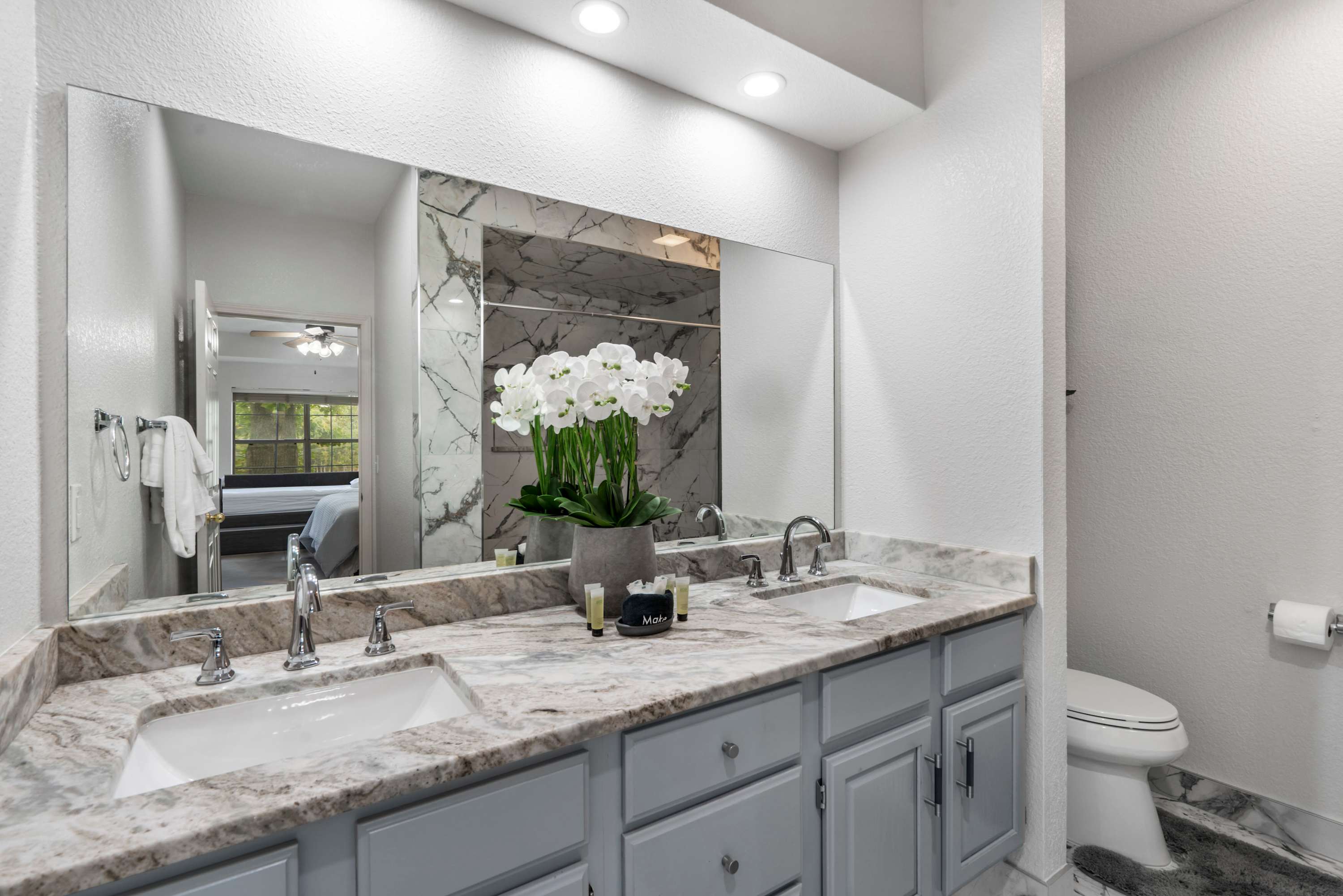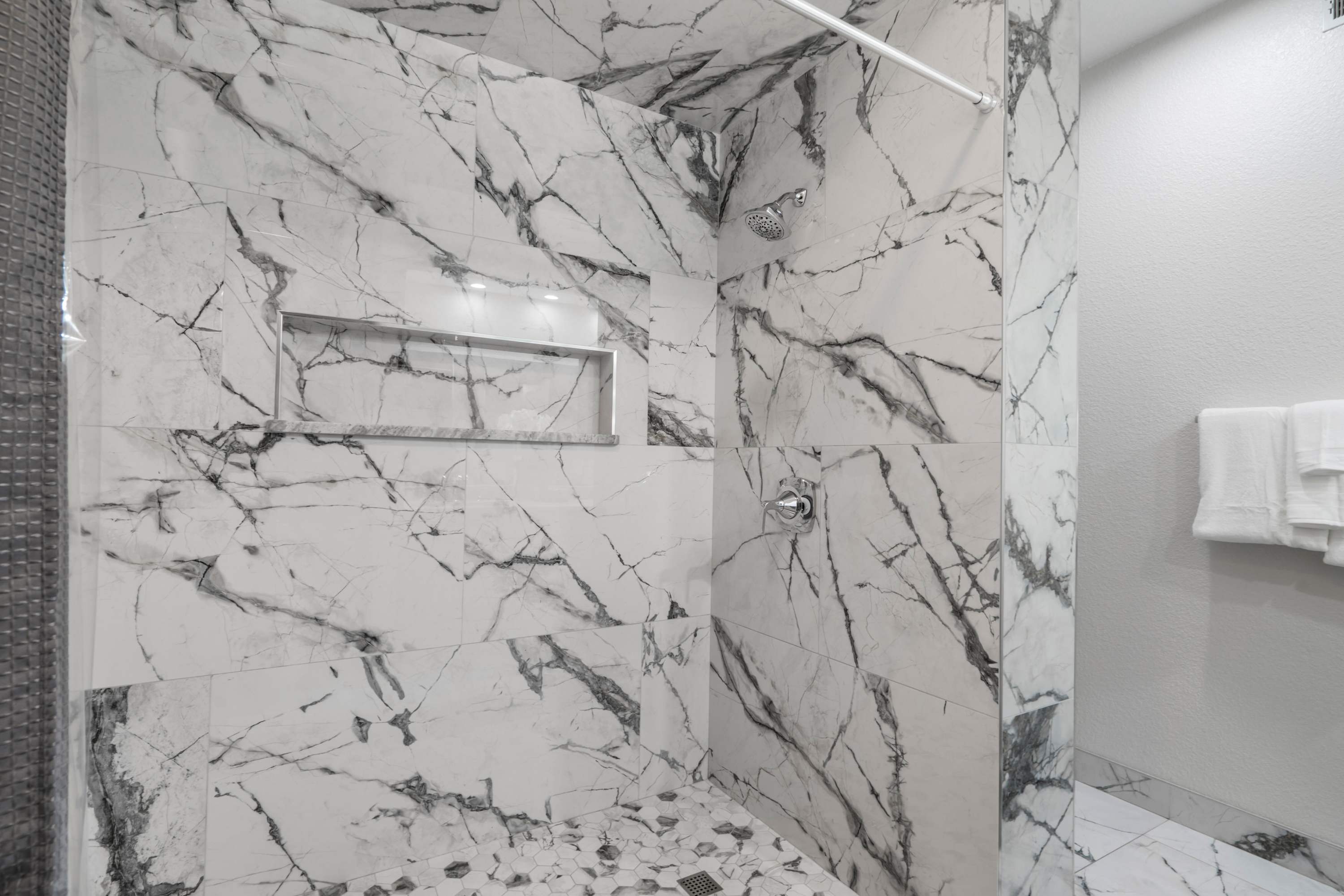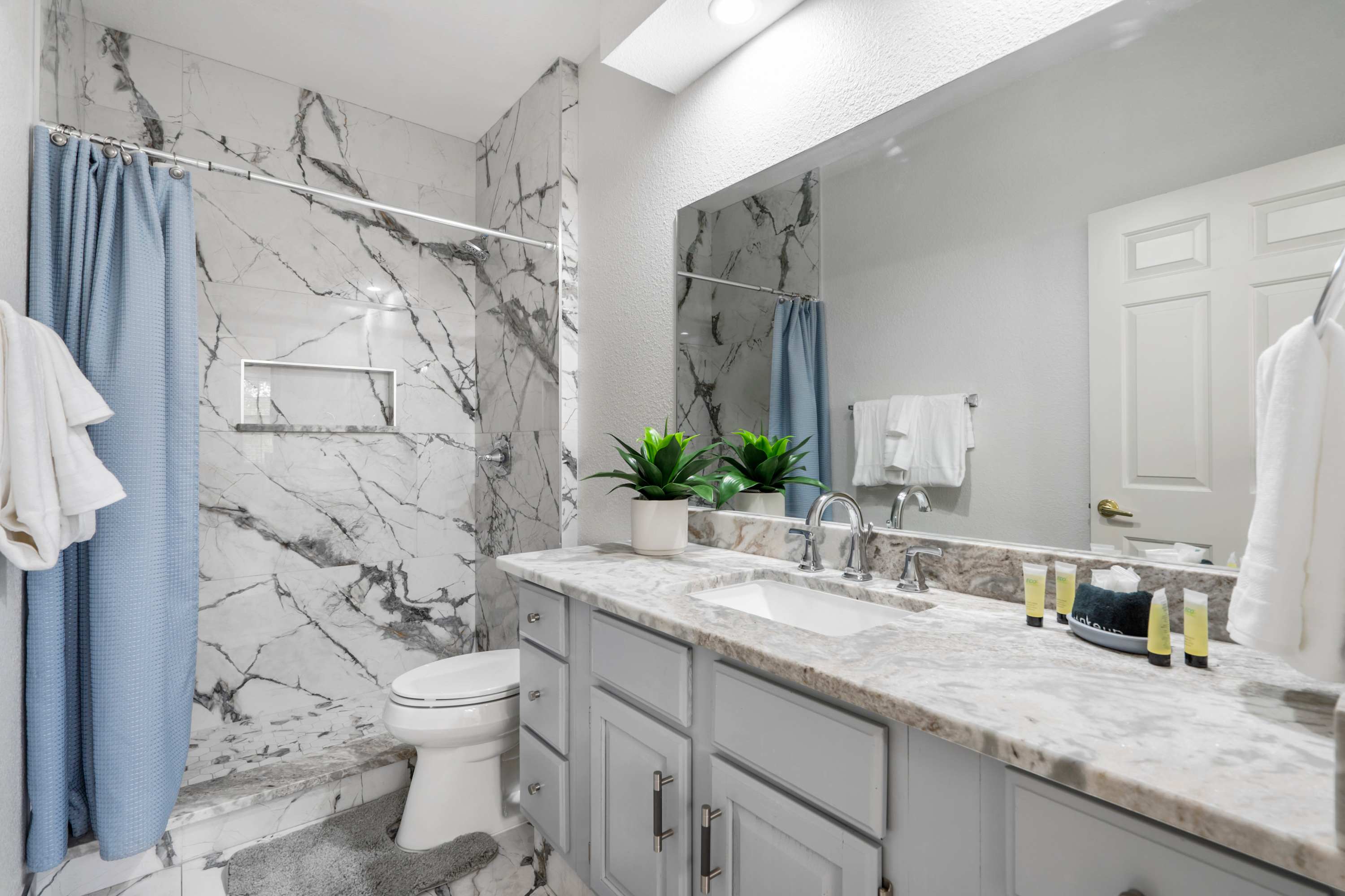 The home also includes an additional full guest bathroom with a single vanity and a walk-in shower.