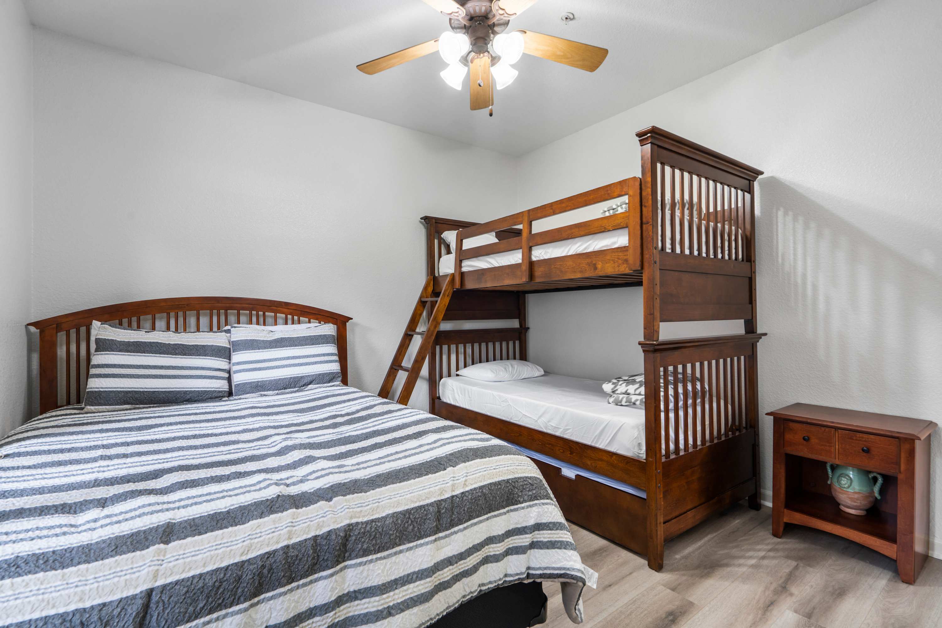 Bedroom #1 includes a queen-size bed, twin-over-twin bunk beds, and a twin-size trundle.