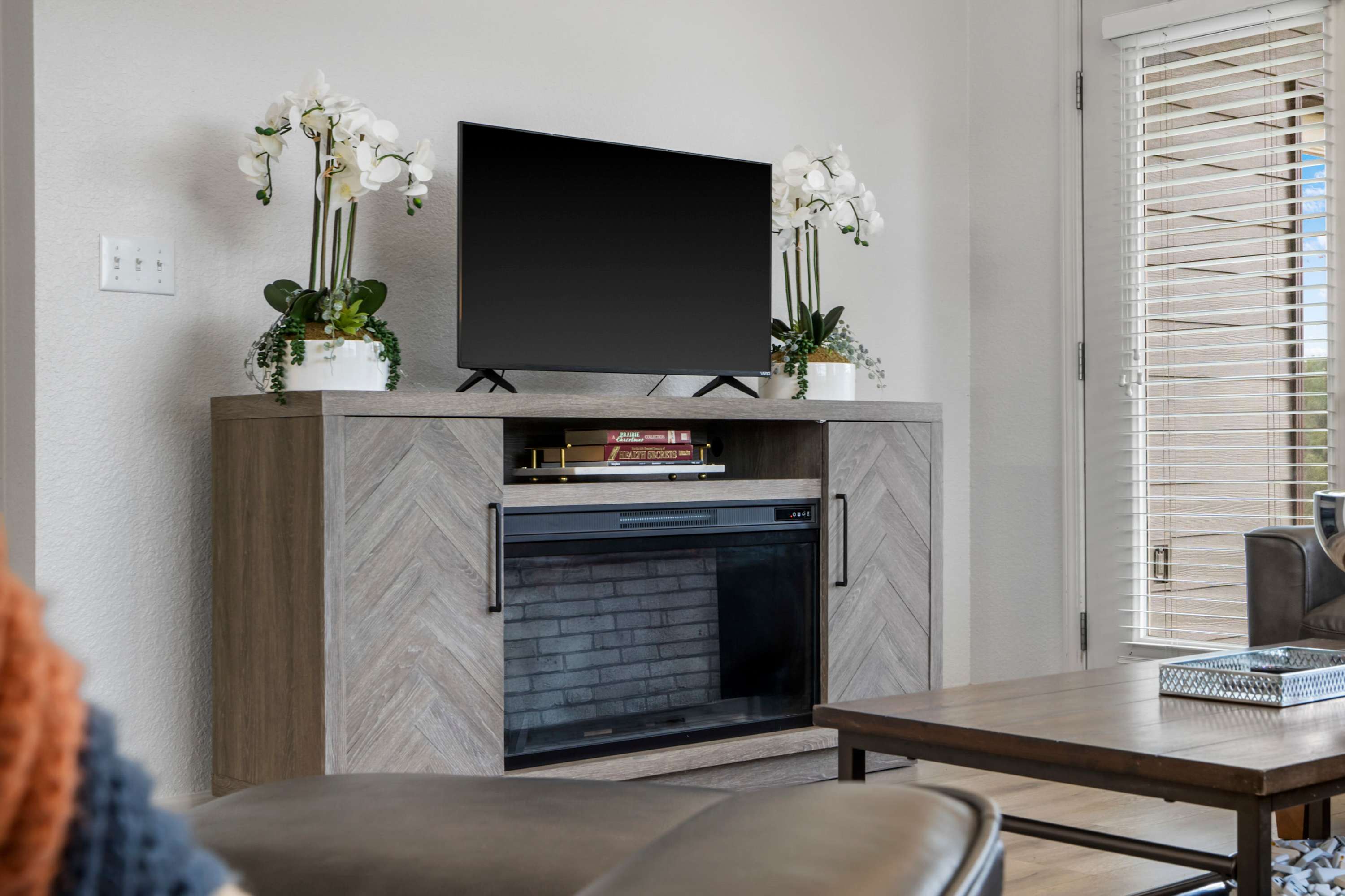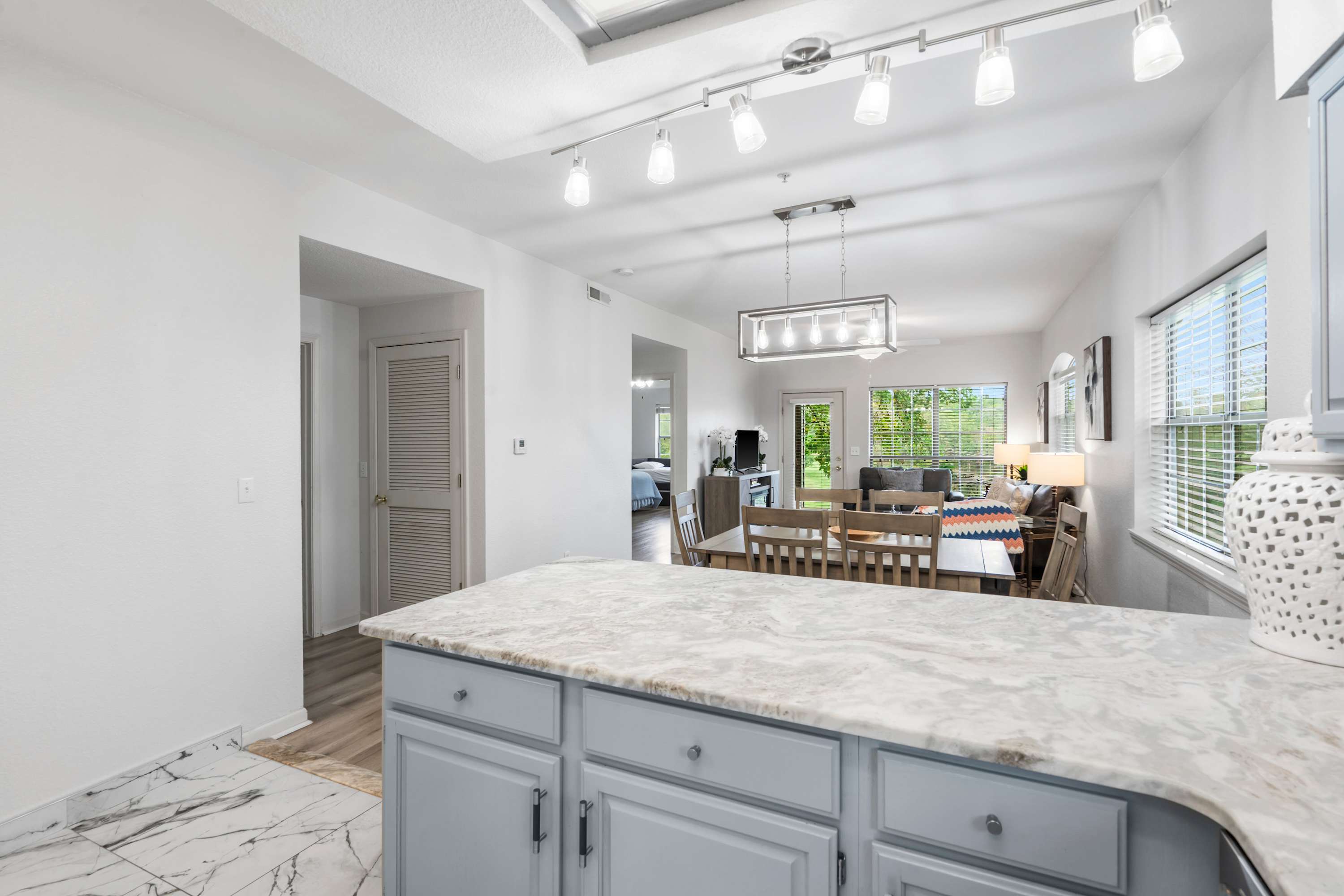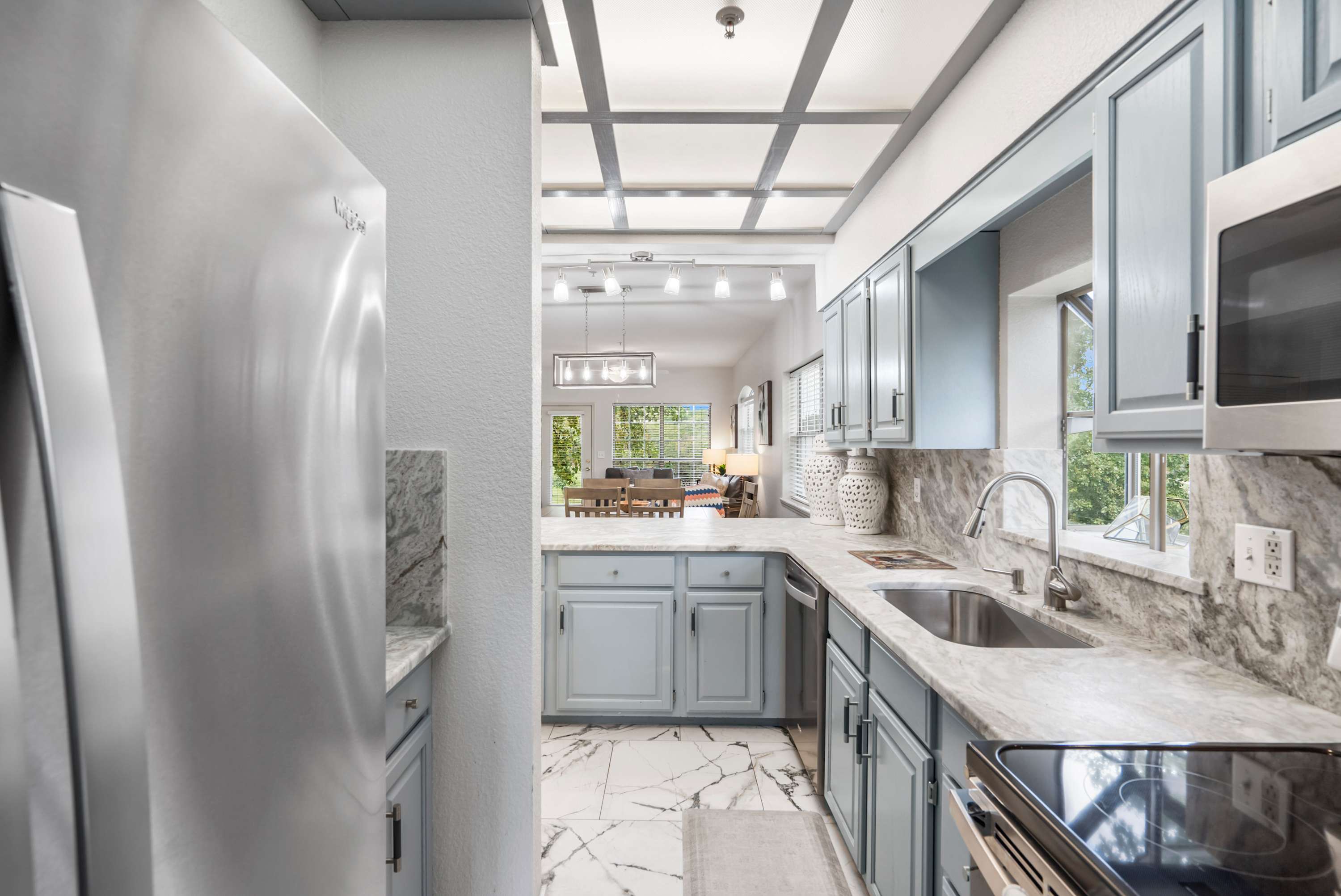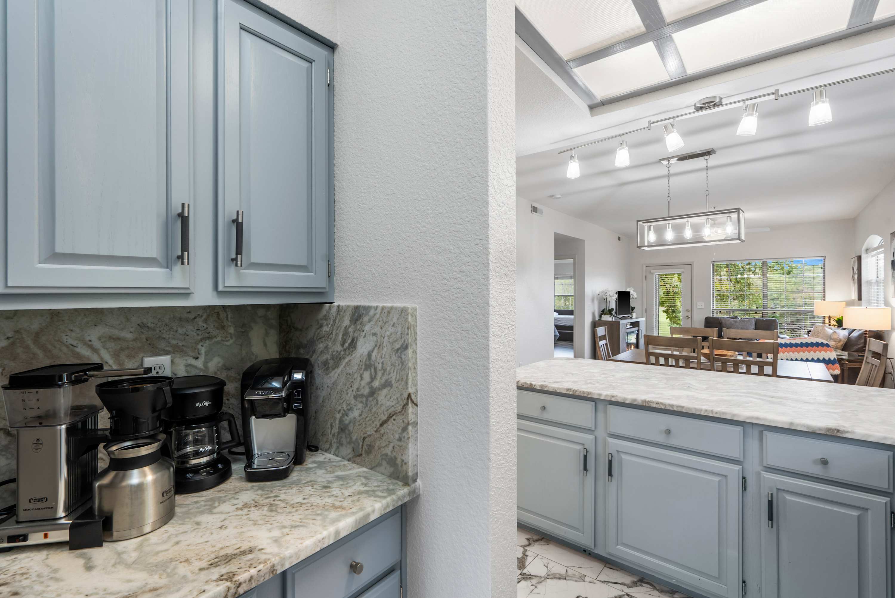 As you head inside, the open living area invites you to sink into the couch or love seat, or curl up in the chair with ottoman while catching your favorite shows on the smart TV. Just beyond, the kitchen gleams with stainless steel appliances, light cabinetry, and stone countertops, with counter seating for four and both a drip and Keurig coffee setup ready for your morning brew. Gather around the dining table for six for meals or game nights, then step outside to the patio where a table for four awaits alongside breathtaking views, perfect for savoring your coffee at sunrise or a quiet evening under the stars. Fairway Follies Luxury Retreat blends modern comforts with a serene setting, making it the ideal getaway for friends or family.