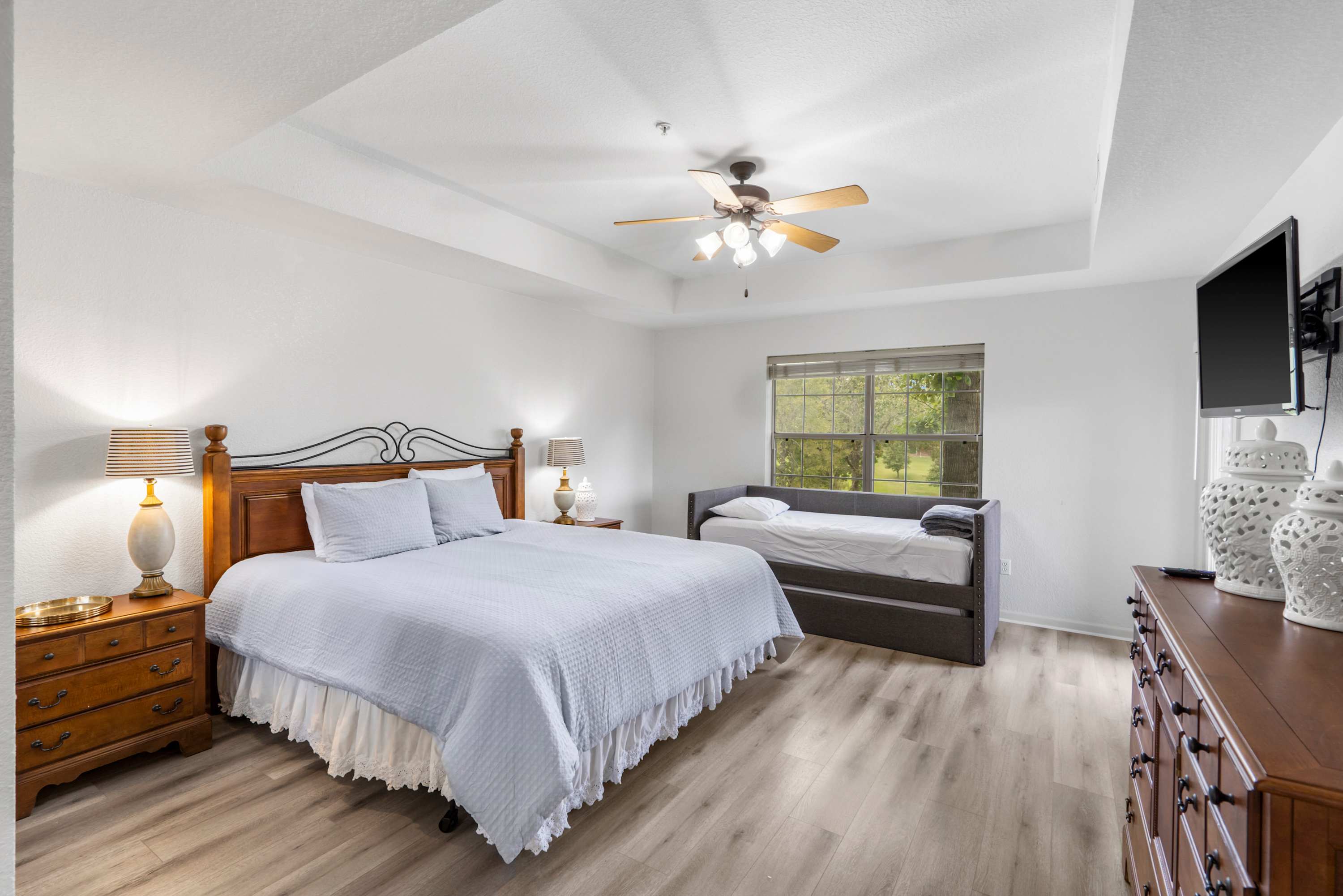 Bedroom #2 includes a king-size bed, a twin-size bed with a twin-size trundle bed, a smart TV, deck access, and an ensuite bathroom with a dual vanity and a walk-in shower.