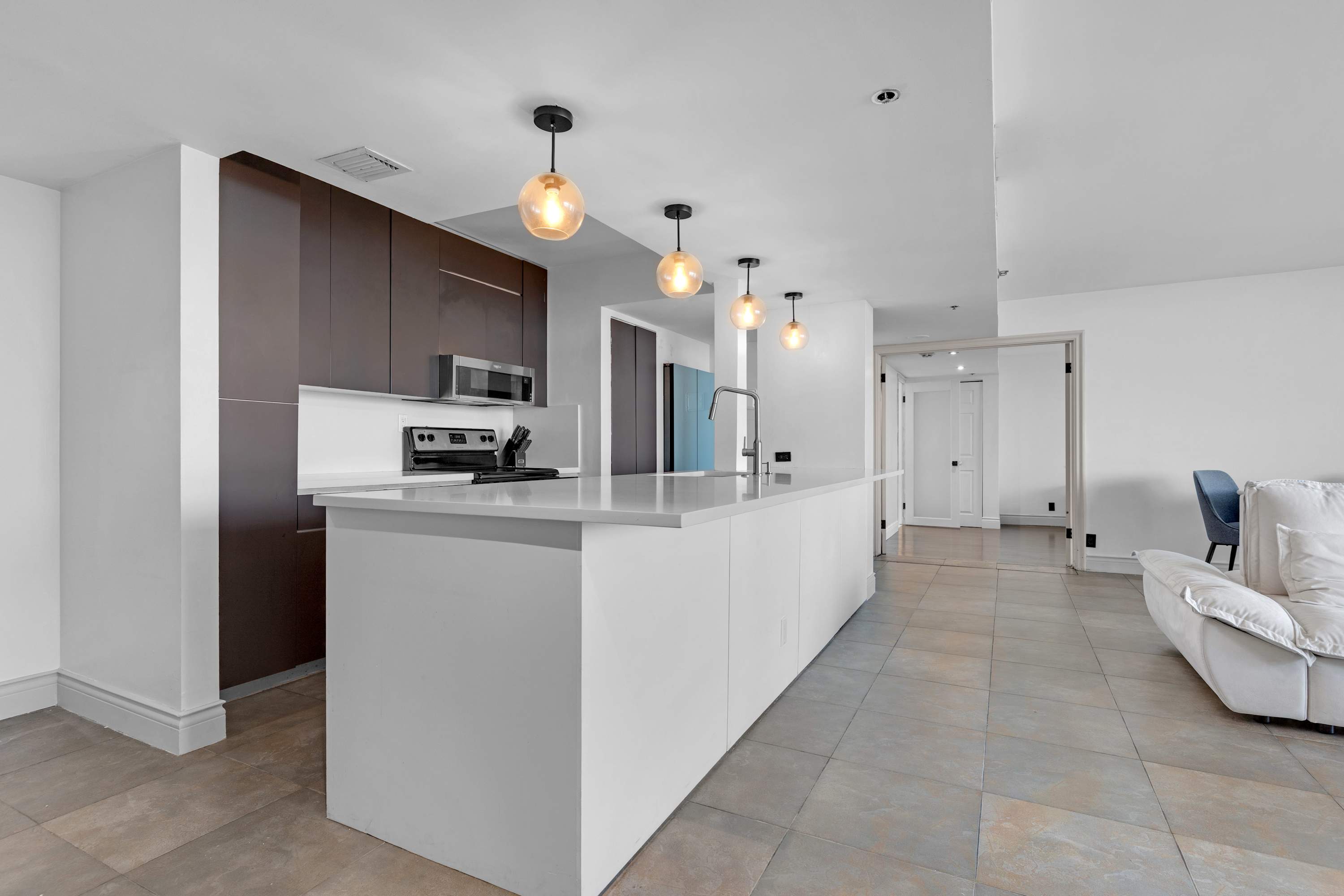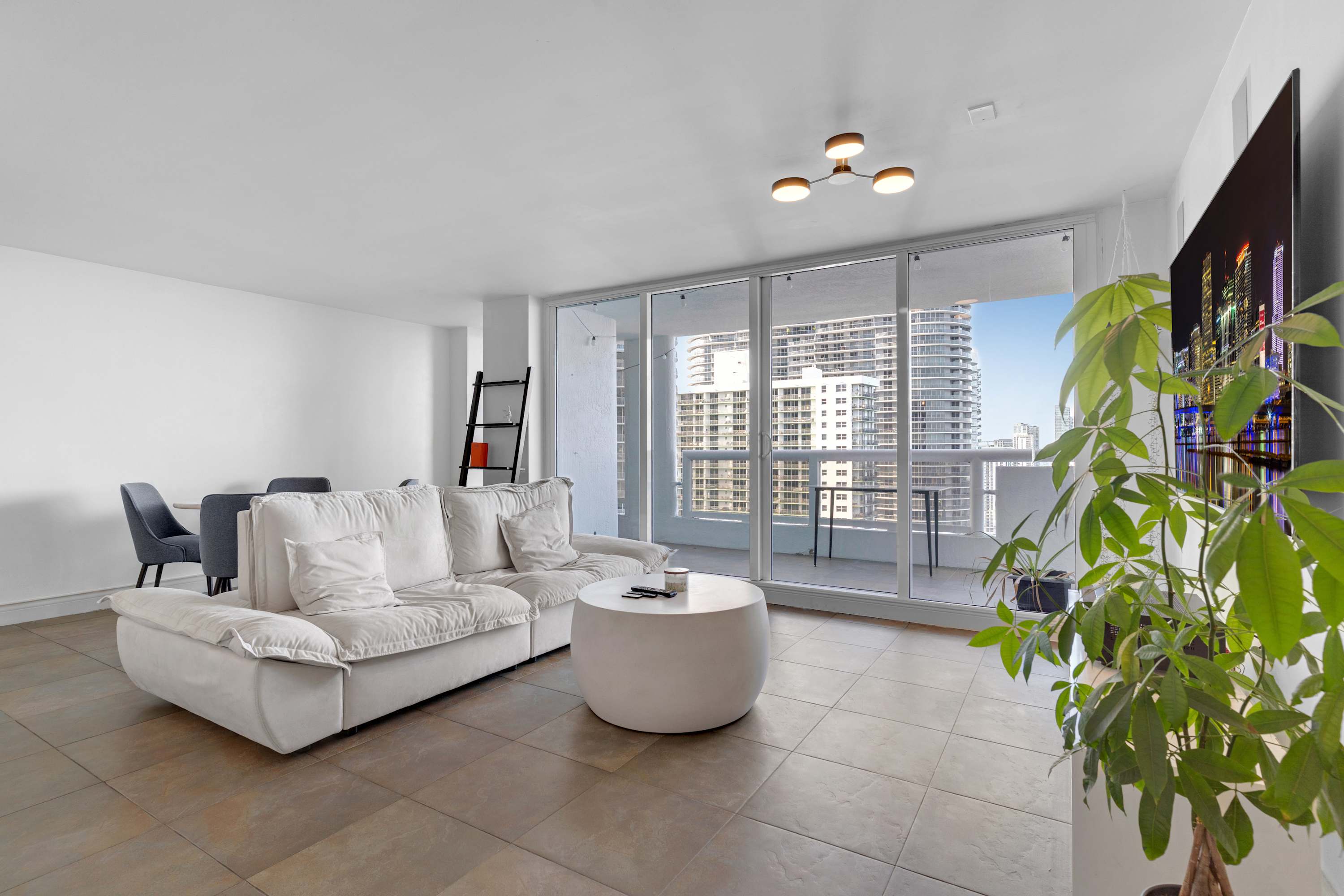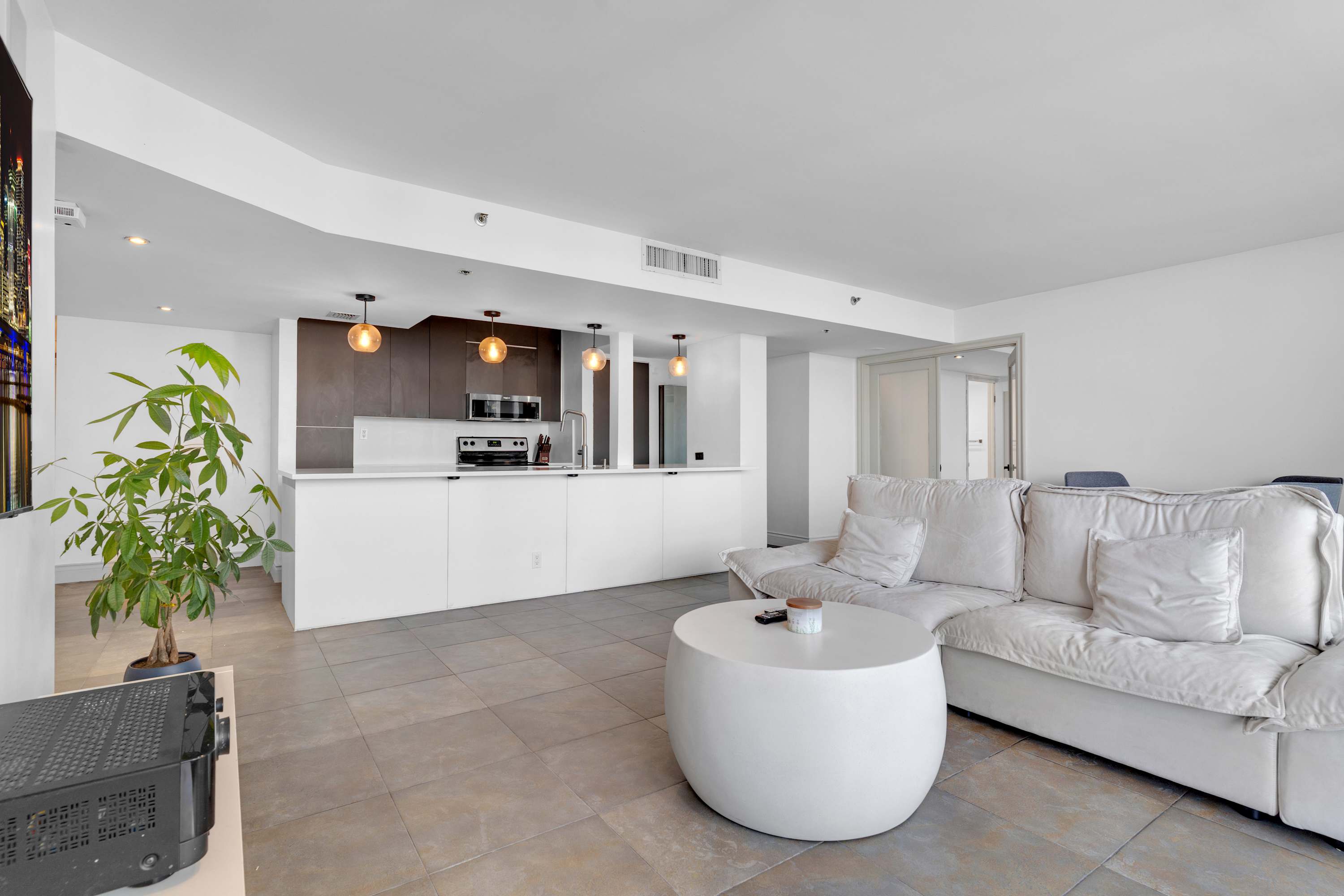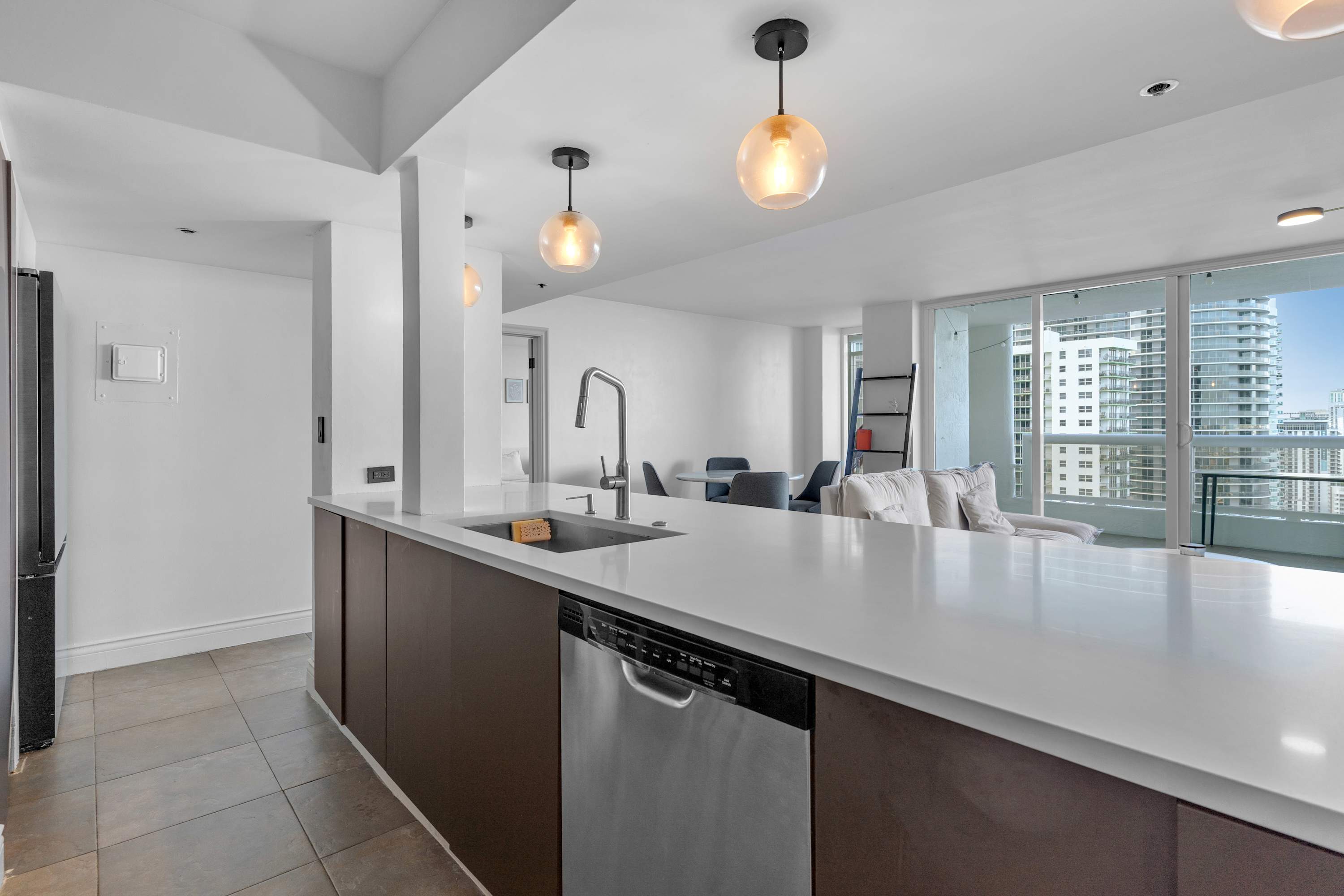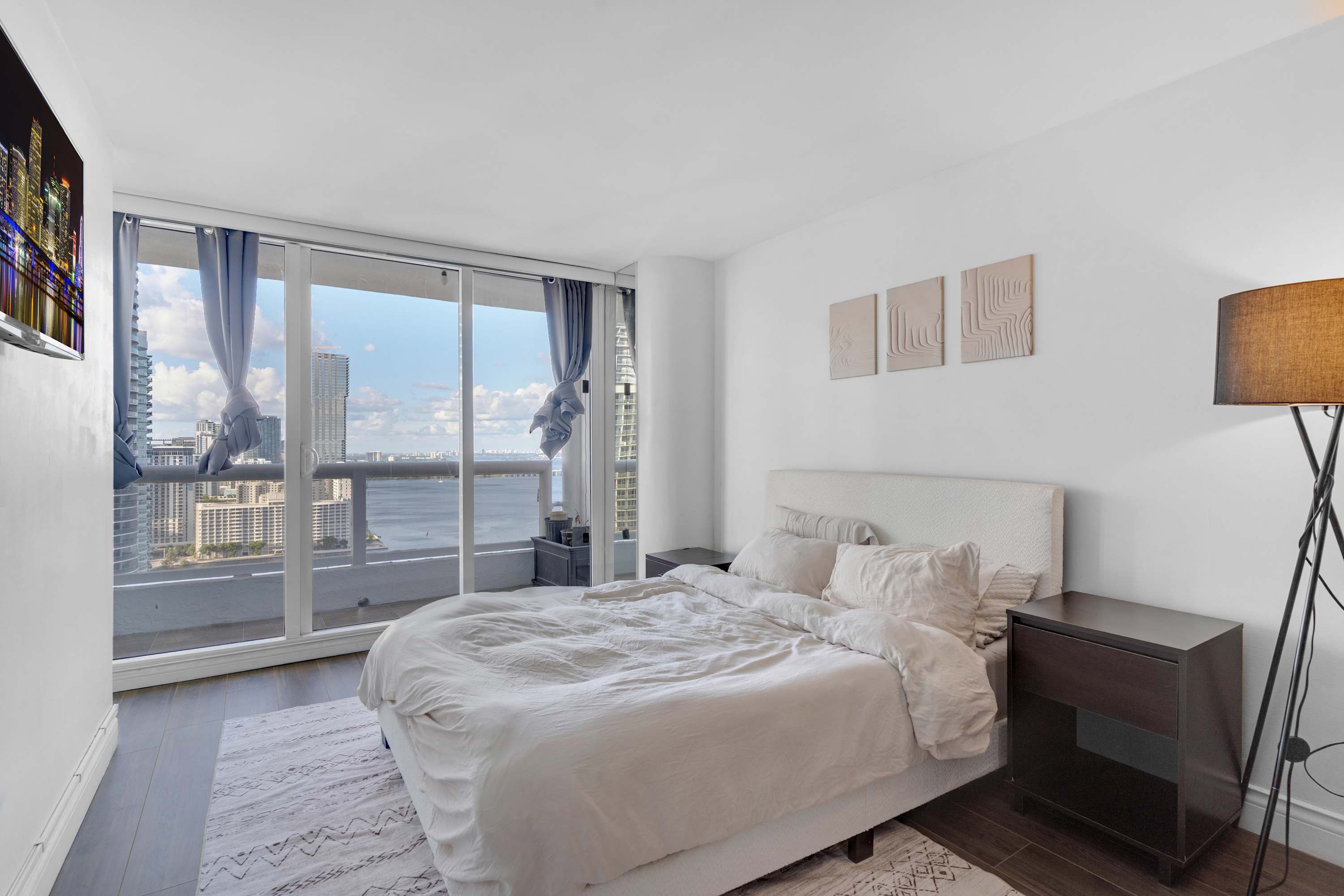 Step inside and feel the sense of space and light unfold. Sink into comfort in the open-concept living room with a large smart TV ready for movie nights or lazy afternoons after a day exploring the city. The kitchen boasts dark, elegant cabinetry that contrasts beautifully with gleaming stainless steel appliances, offering everything you need to prepare a home-cooked meal or morning coffee. Gather around the dining table for four to share food and conversation as the glow of the Miami skyline begins to shimmer through the windows. Then, step out onto your private balcony—your personal sanctuary high above the water. Sip a cocktail or simply breathe in the warm coastal breeze while soaking in the panoramic views of the bay stretching out before you.