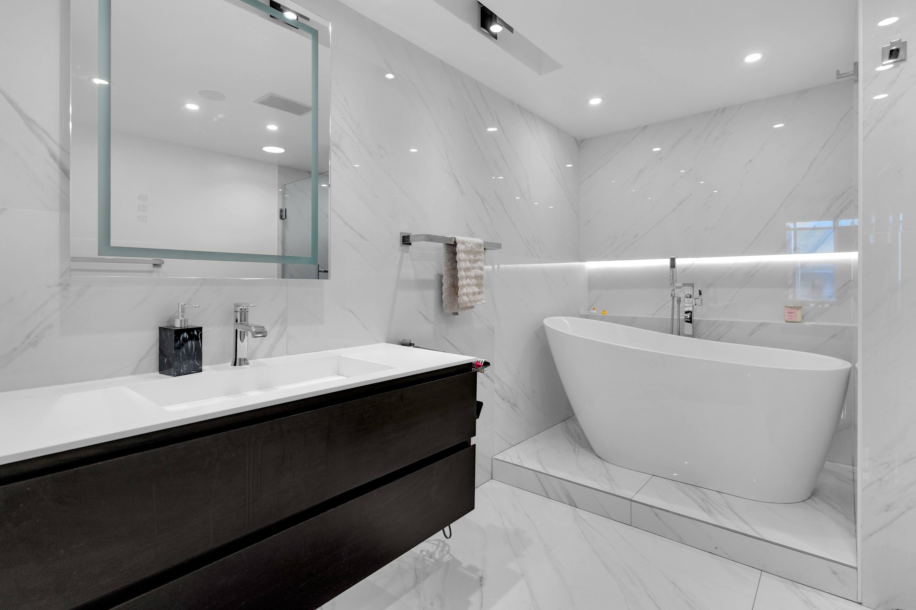 Bedroom #2 includes a king size bed, a smart TV, balcony access, and an ensuite bathroom with a dual vanity, a soaking tub, and a walk-in shower.