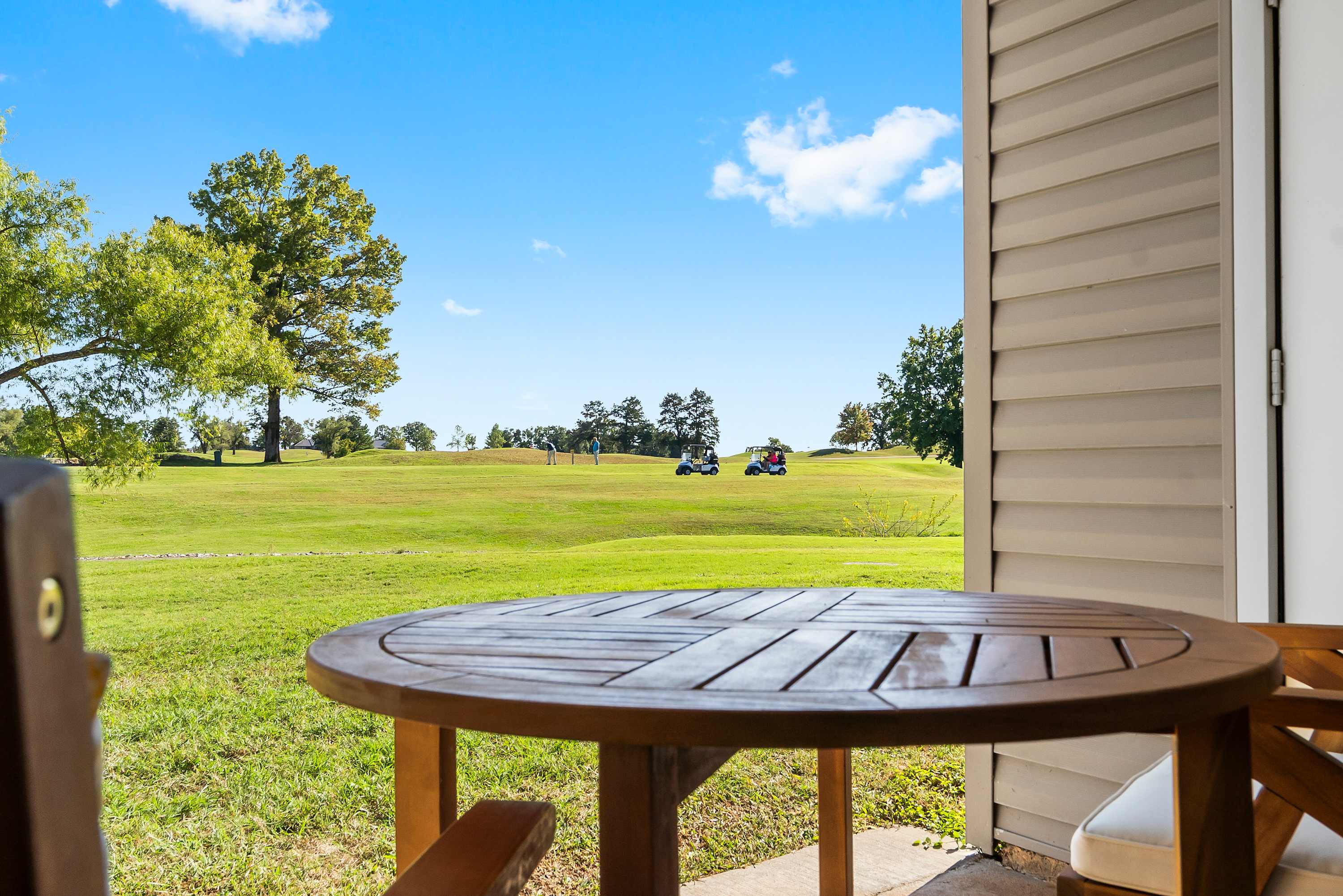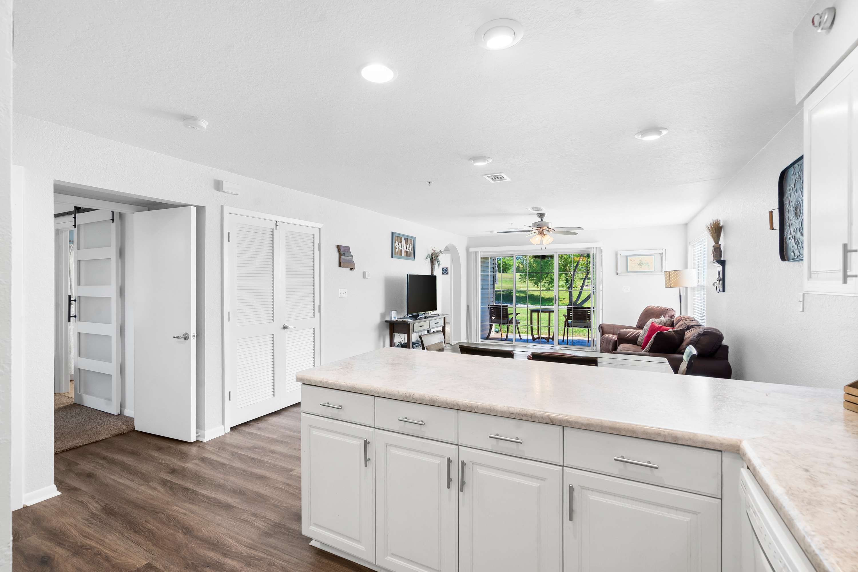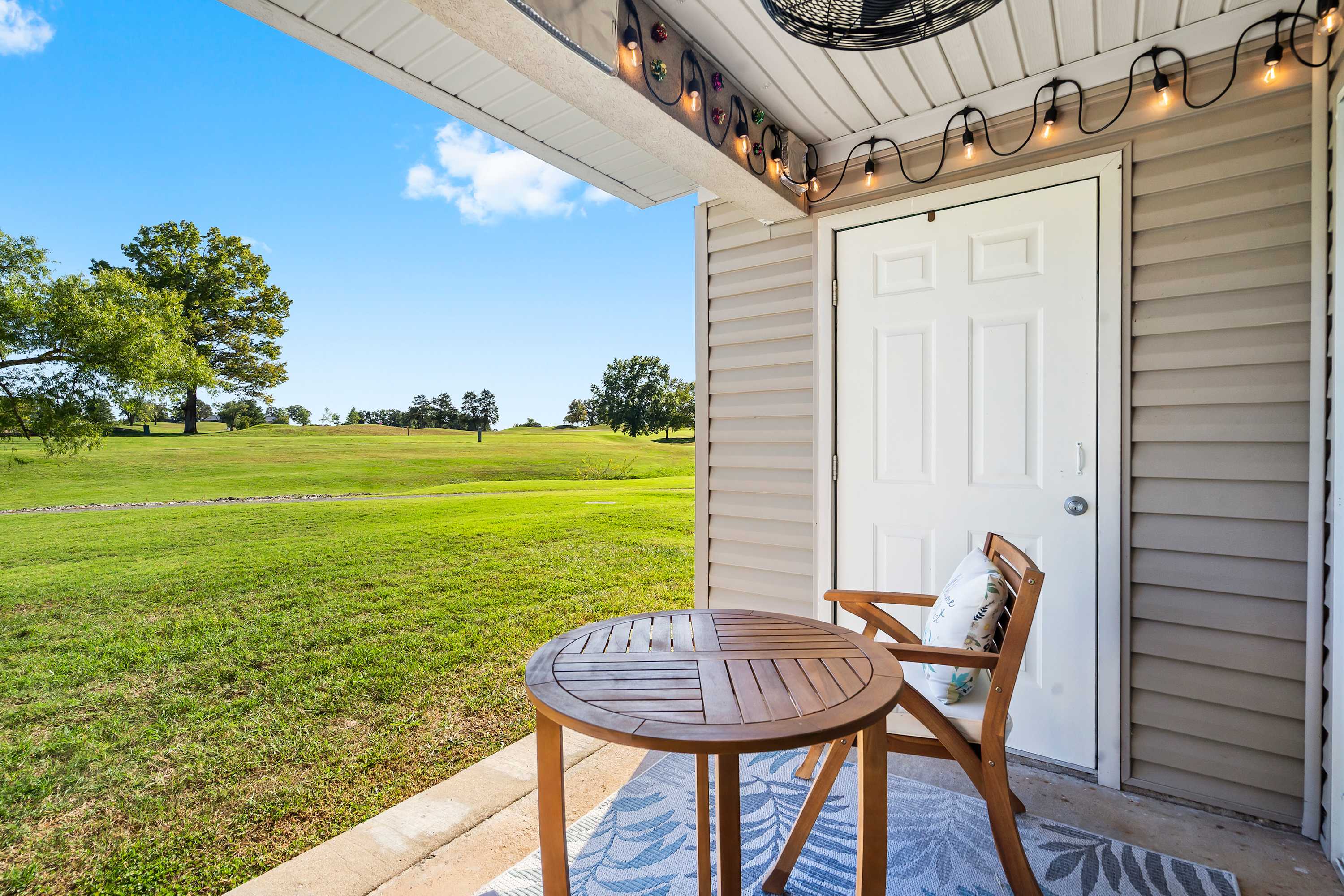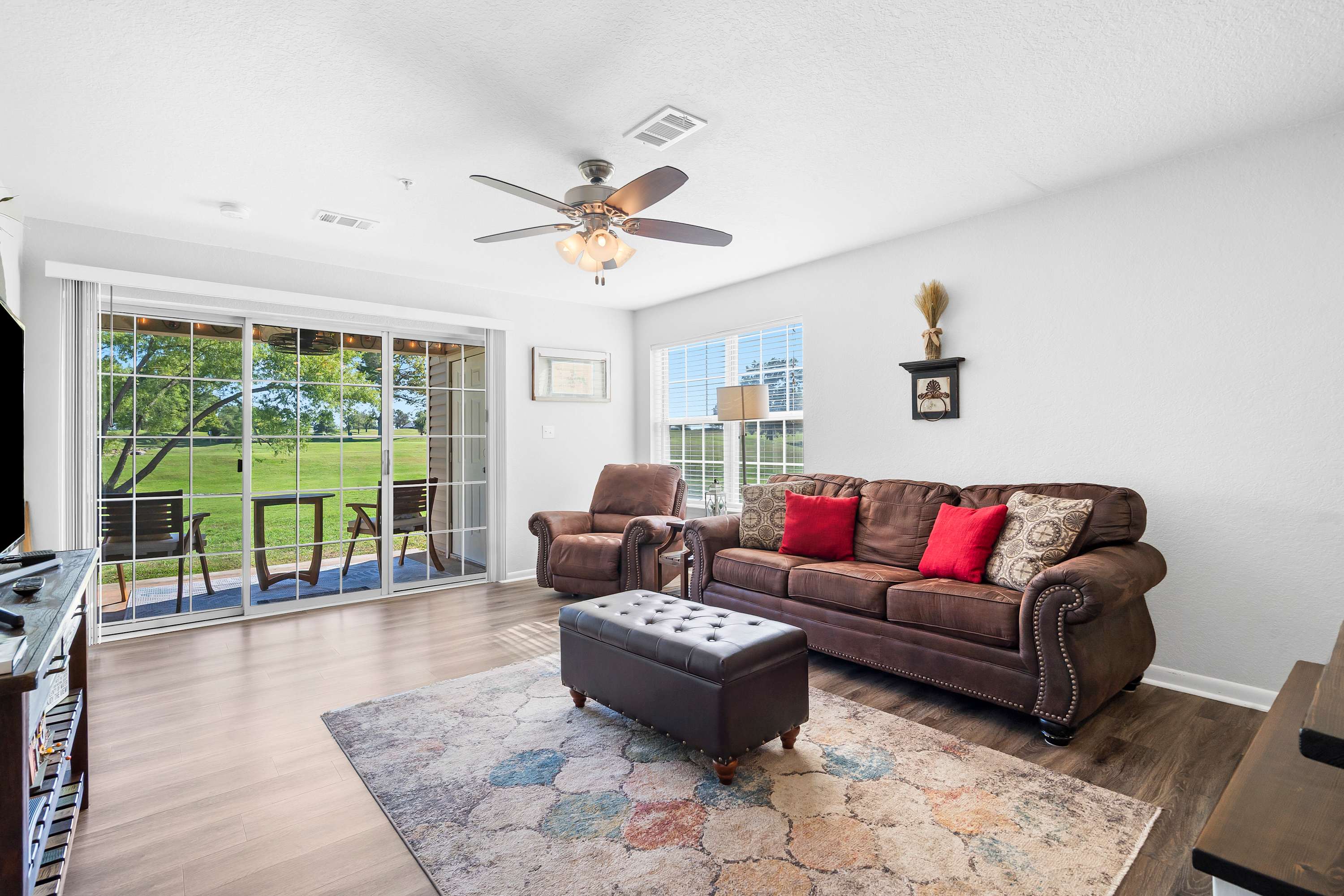 Step inside and let the warmth of the living room draw you in. A plush couch and cozy armchair invite you to settle in and watch your favorite shows on the cable TV after a day exploring the Ozarks. The open layout flows into a dining area with a table for six—perfect for family meals, game nights, or morning coffee chats. In the kitchen, you’ll find everything you need to create delicious home-cooked meals, with plenty of counter space for prep and both a drip and Keurig coffee maker to start your mornings right. When it’s time to unwind, step out onto the private patio where a table for two offers the ideal spot to sip a drink and take in the peaceful golf course views.