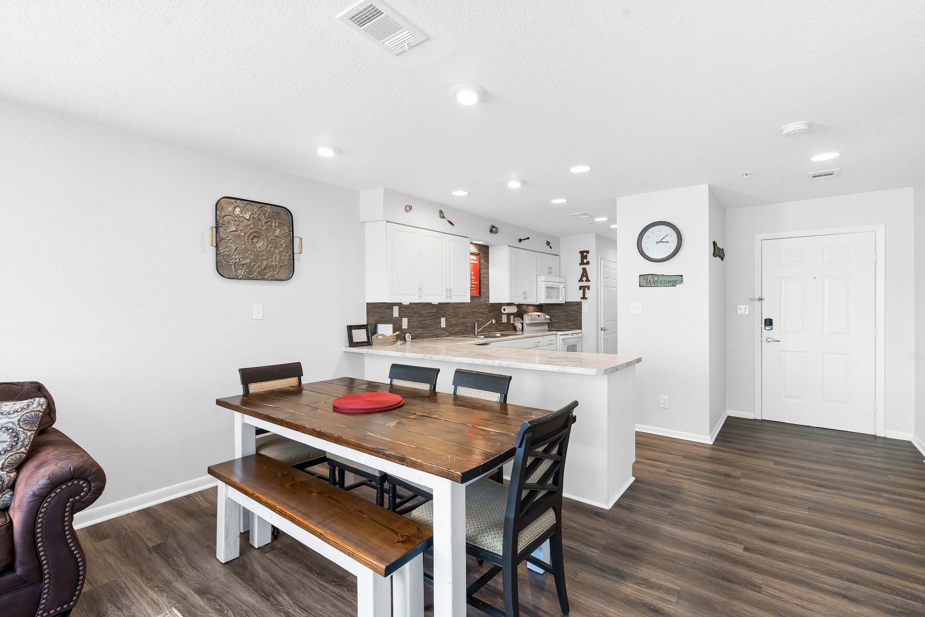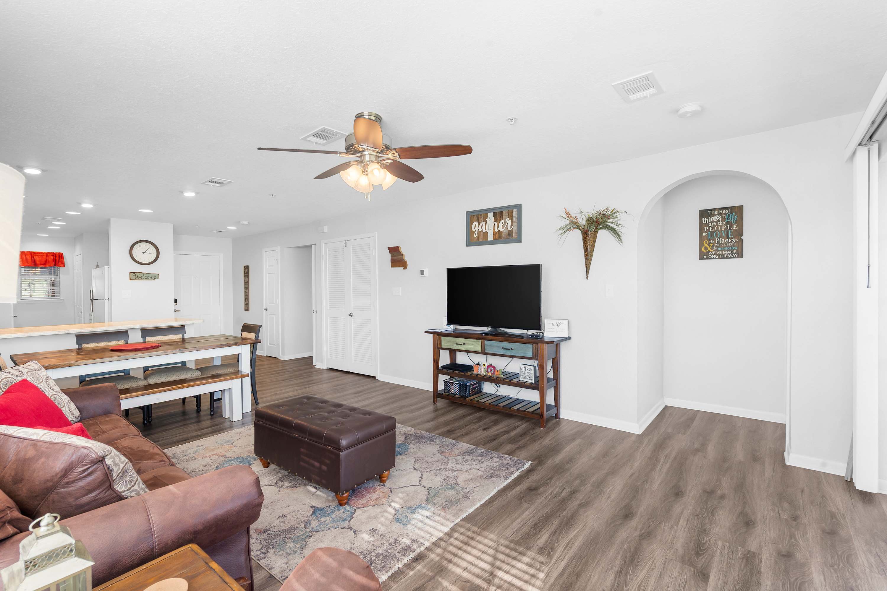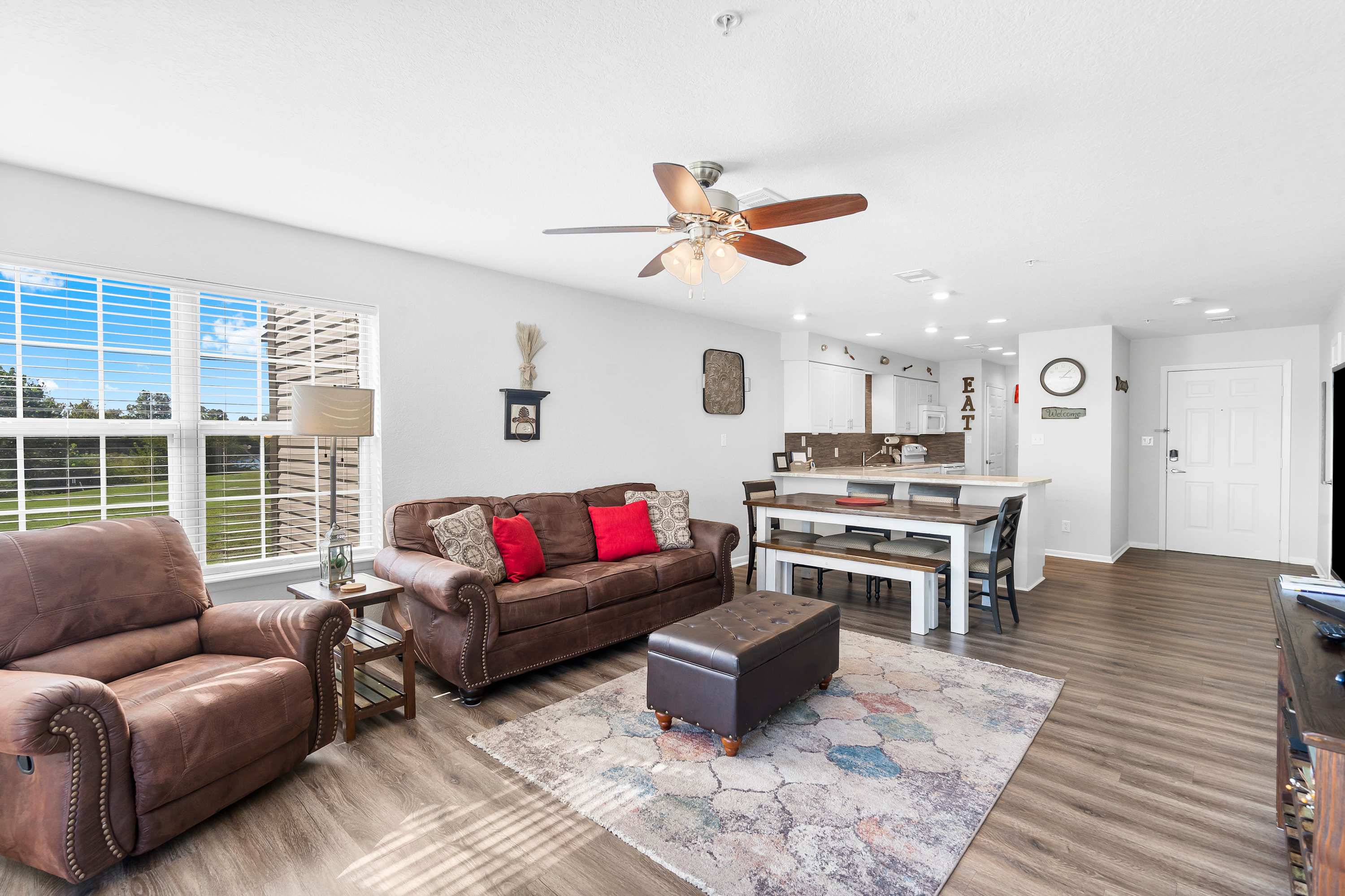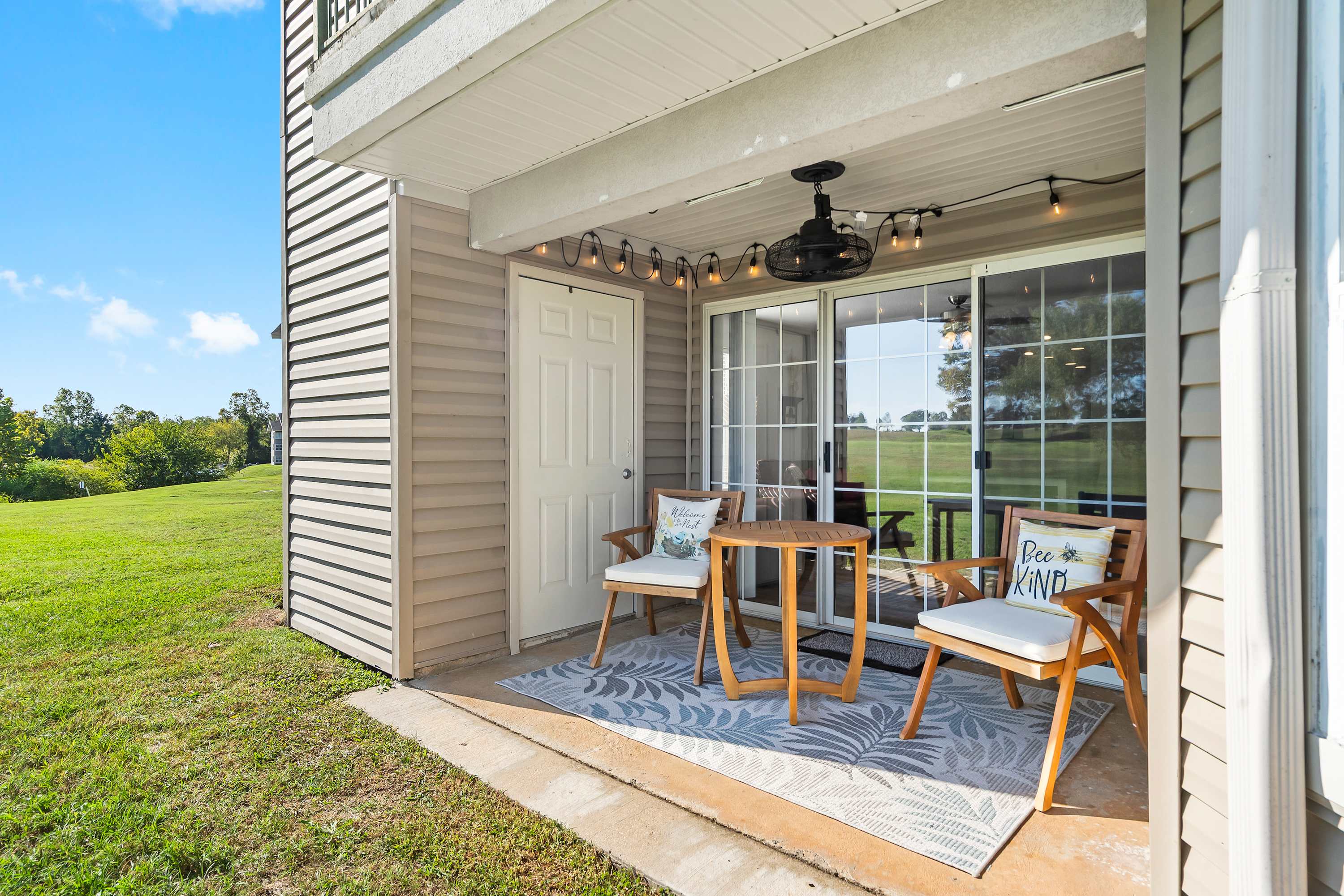 Step inside and let the warmth of the living room draw you in. A plush couch and cozy armchair invite you to settle in and watch your favorite shows on the cable TV after a day exploring the Ozarks. The open layout flows into a dining area with a table for six—perfect for family meals, game nights, or morning coffee chats. In the kitchen, you’ll find everything you need to create delicious home-cooked meals, with plenty of counter space for prep and both a drip and Keurig coffee maker to start your mornings right. When it’s time to unwind, step out onto the private patio where a table for two offers the ideal spot to sip a drink and take in the peaceful golf course views.