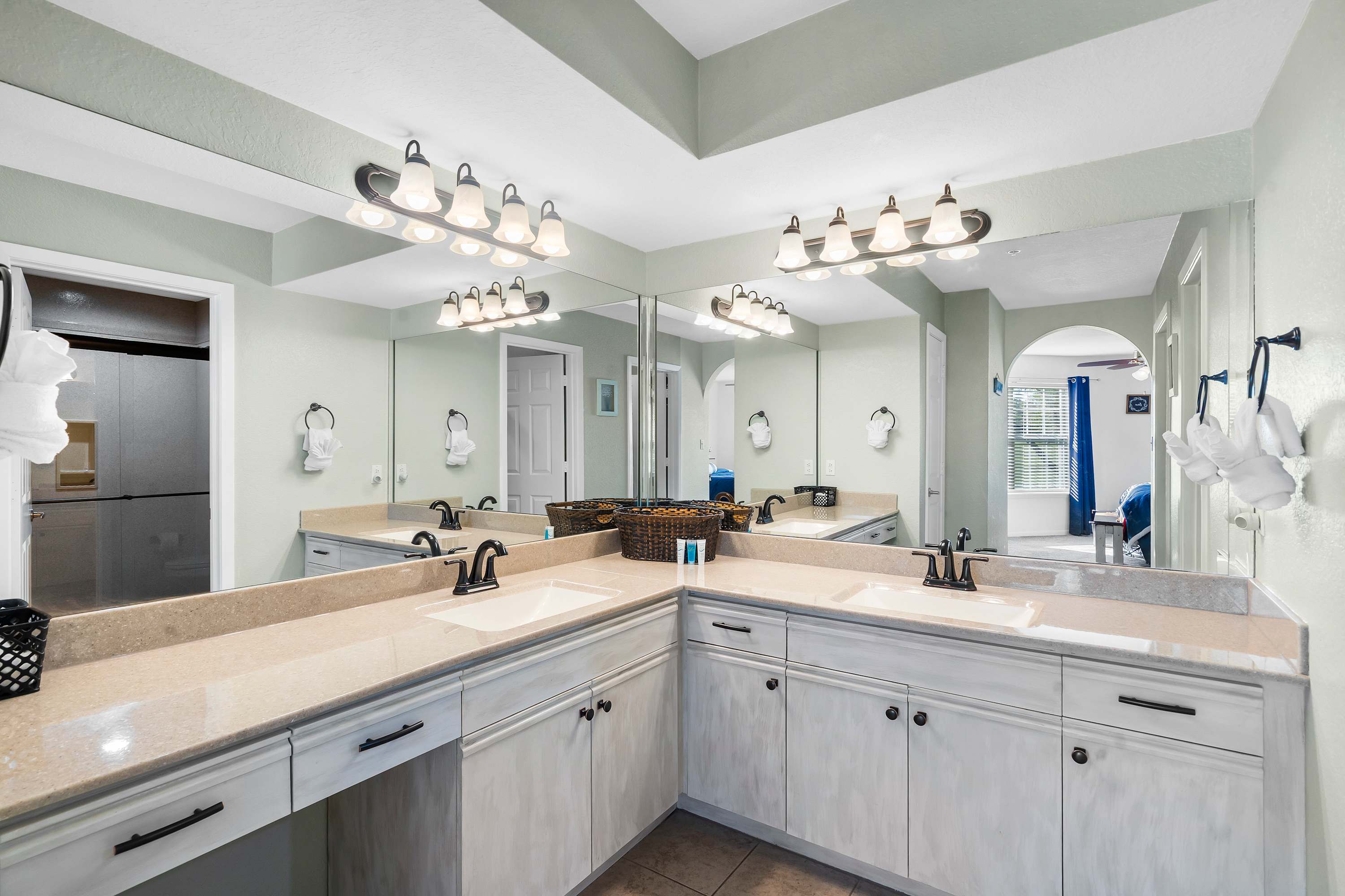 Bedroom #2 includes a king-size bed, a cable TV, and an ensuite bathroom with a dual vanity and a walk-in shower.