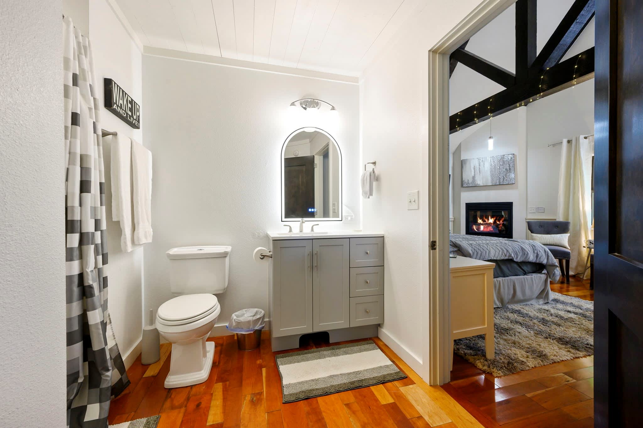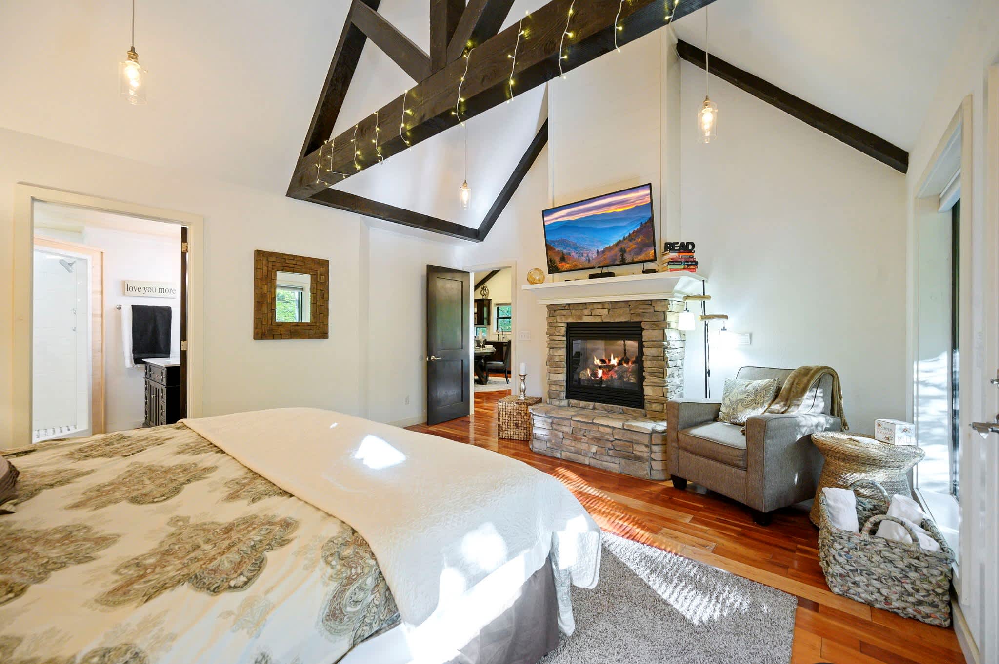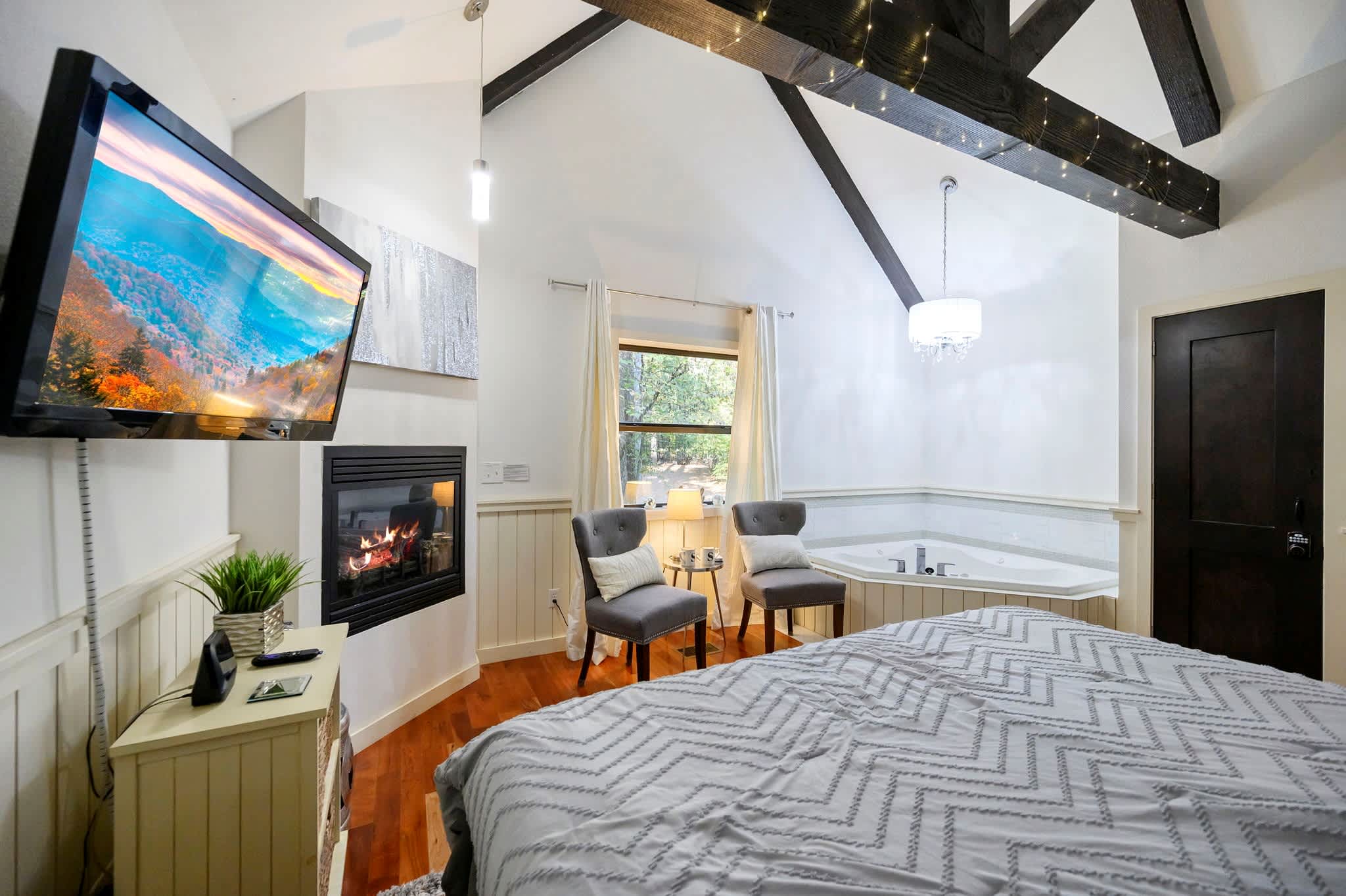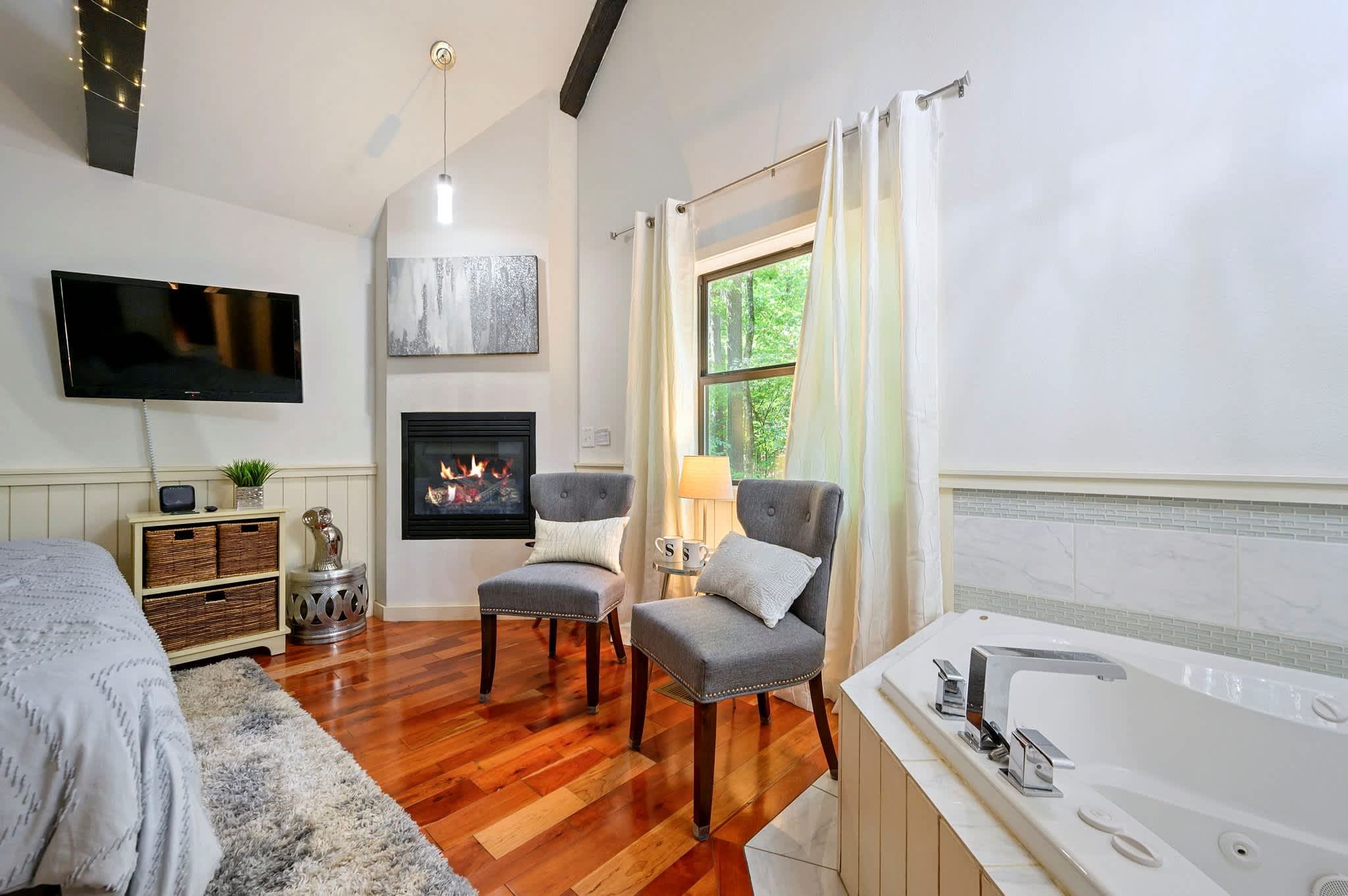 Bedroom #1 includes a king size bed, a smart TV, a gas fireplace, a sitting area by the window, a soaking tub in the corner, and a Jack-and-Jill bathroom with single dual vanity and a walk-in shower.