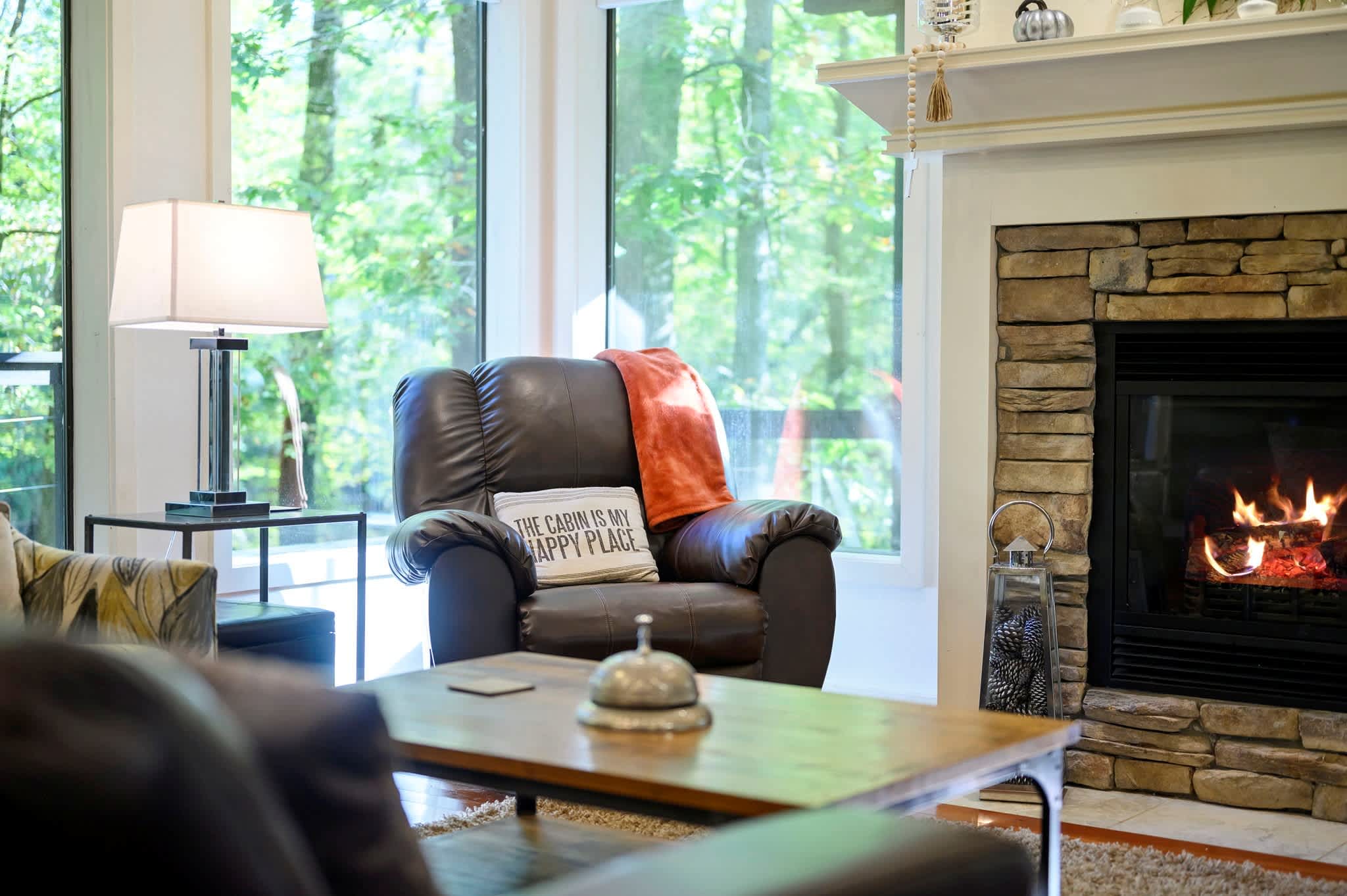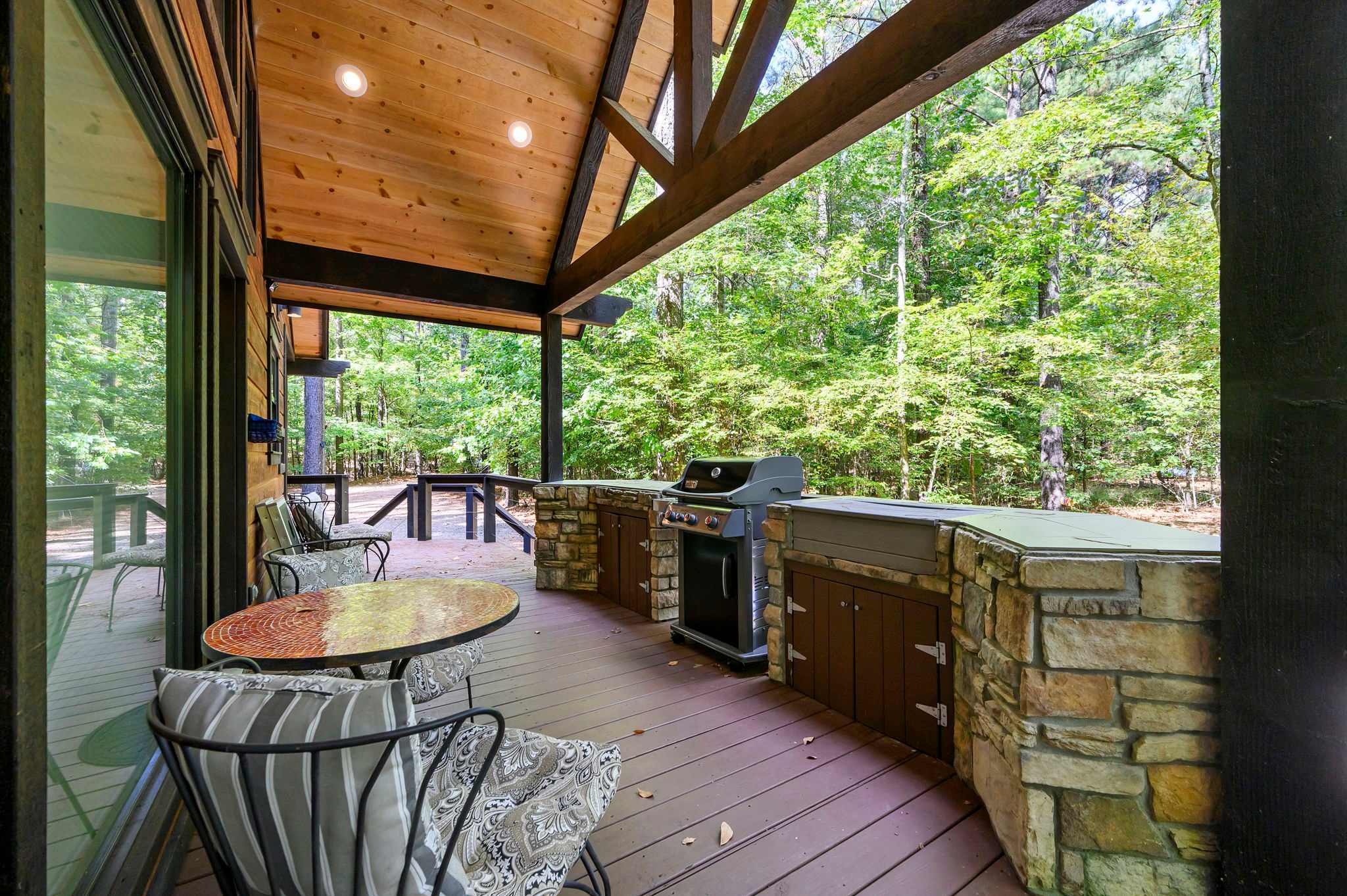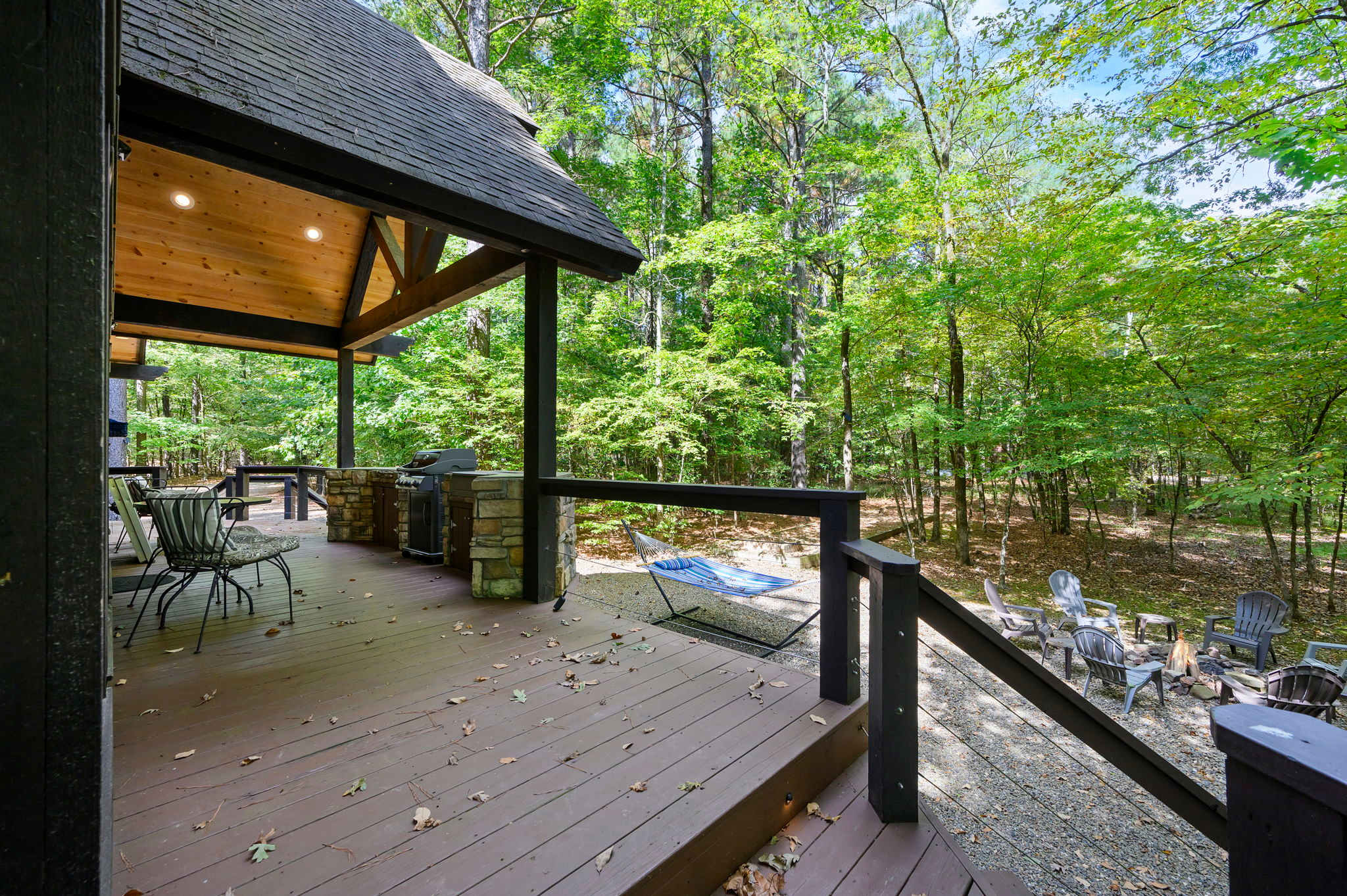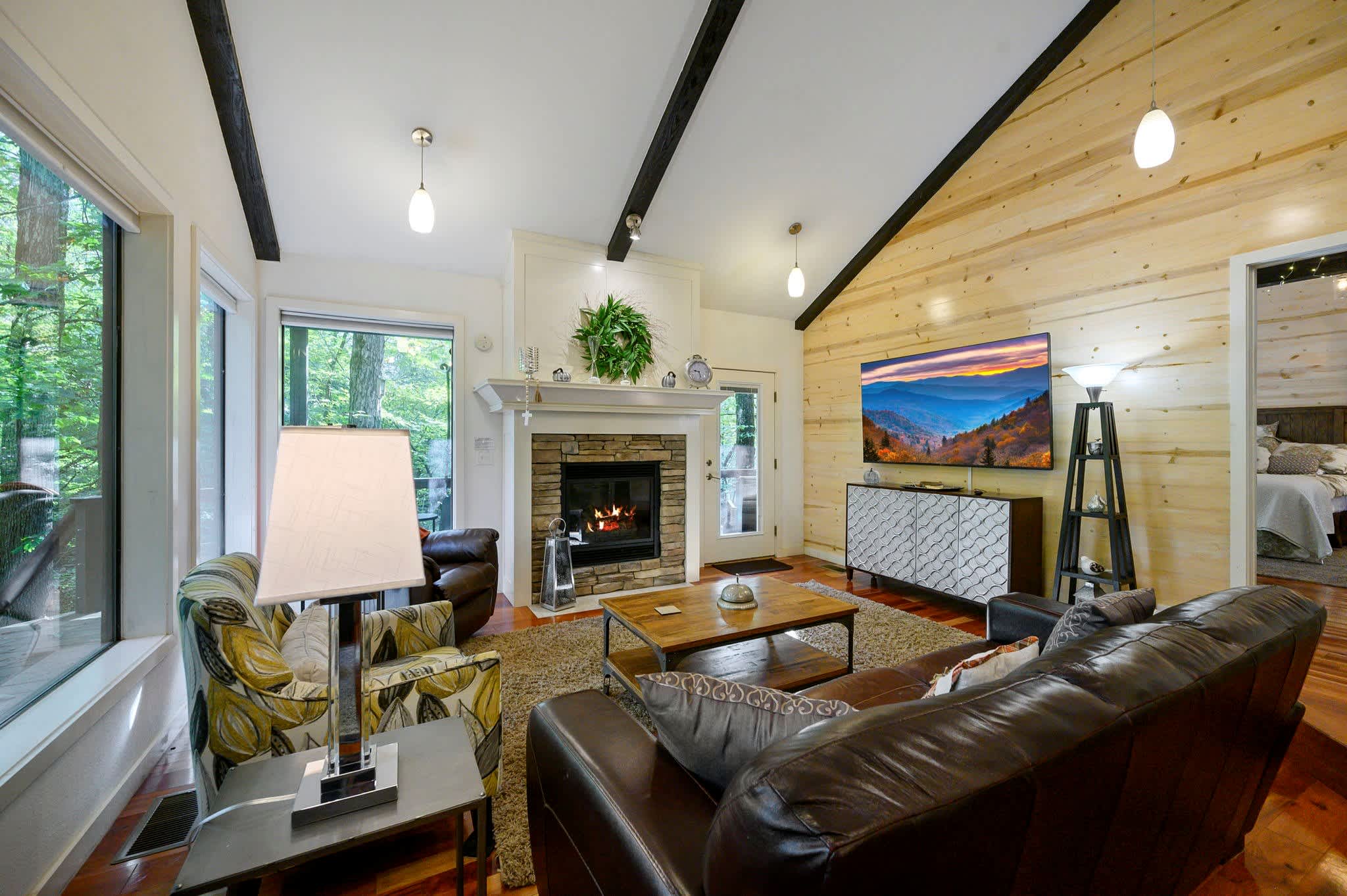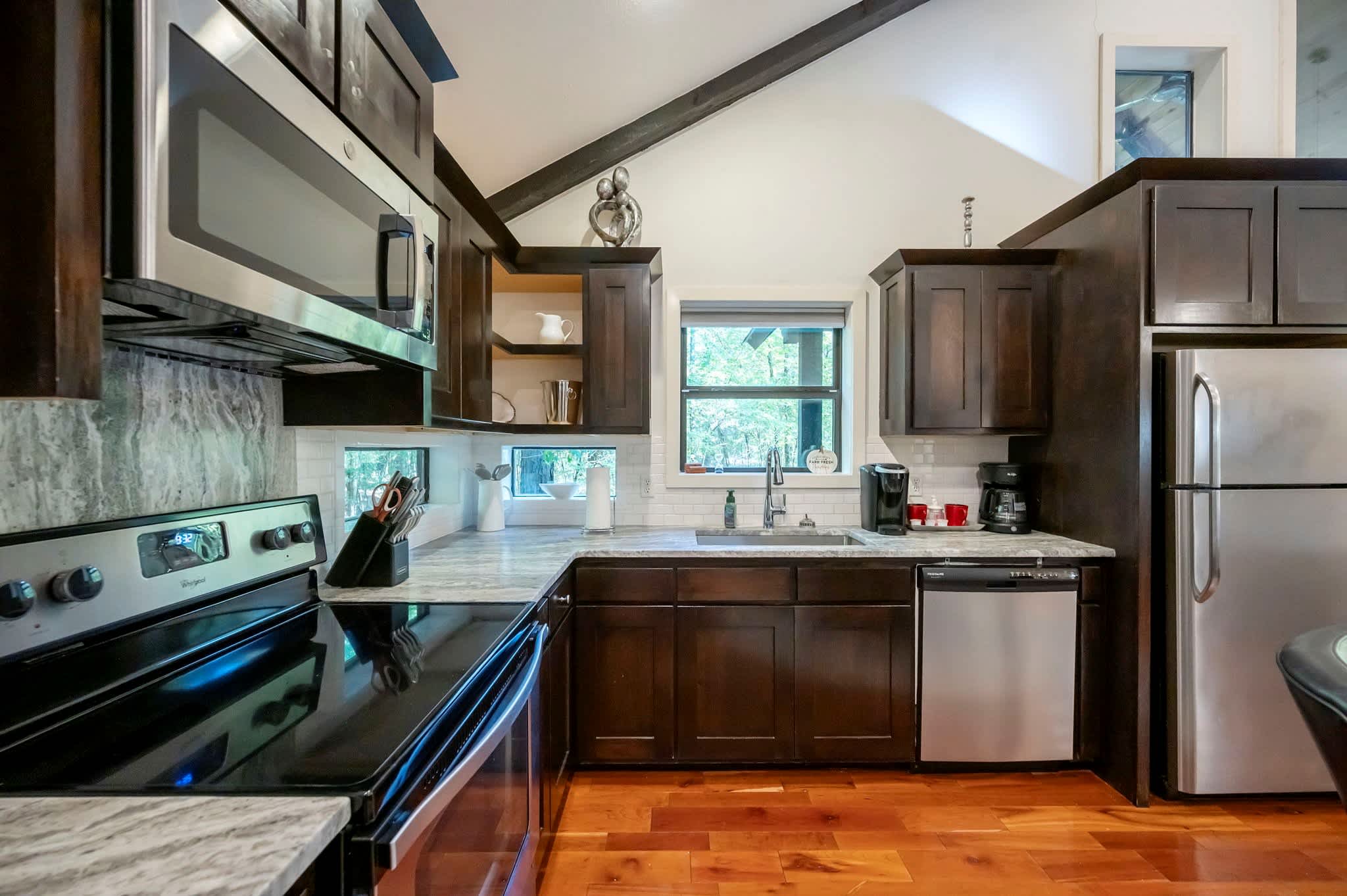 Step inside to open-concept modern mountain living, where large windows frame the surrounding forest and fill the room with soft natural light. The living room invites cozy evenings with a gas fireplace, smart TV, couch, and two armchairs ideal for fireside chats or movie nights. The kitchen blends traditional charm with sophistication, featuring dark cabinetry, stone countertops, stainless steel appliances, and both Keurig and drip coffee options. Share meals at the intimate dining table for four before heading out to unwind on the covered front deck or relax in the soothing hot tub on the back deck. With comfortable outdoor seating, a gas grill, and a crackling firepit by the creek, every moment here feels peaceful and perfectly in tune with nature—your ideal Broken Bow escape.