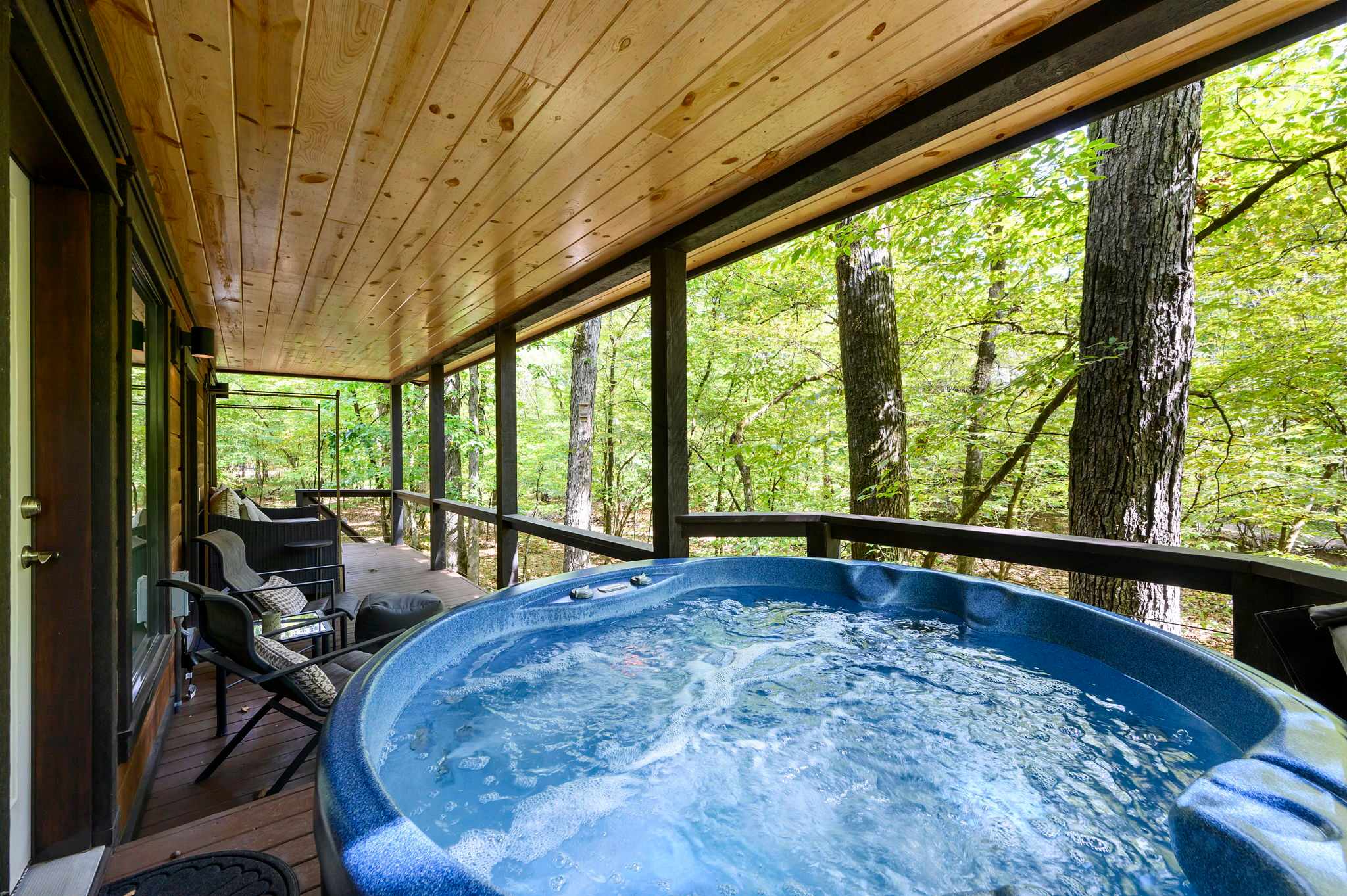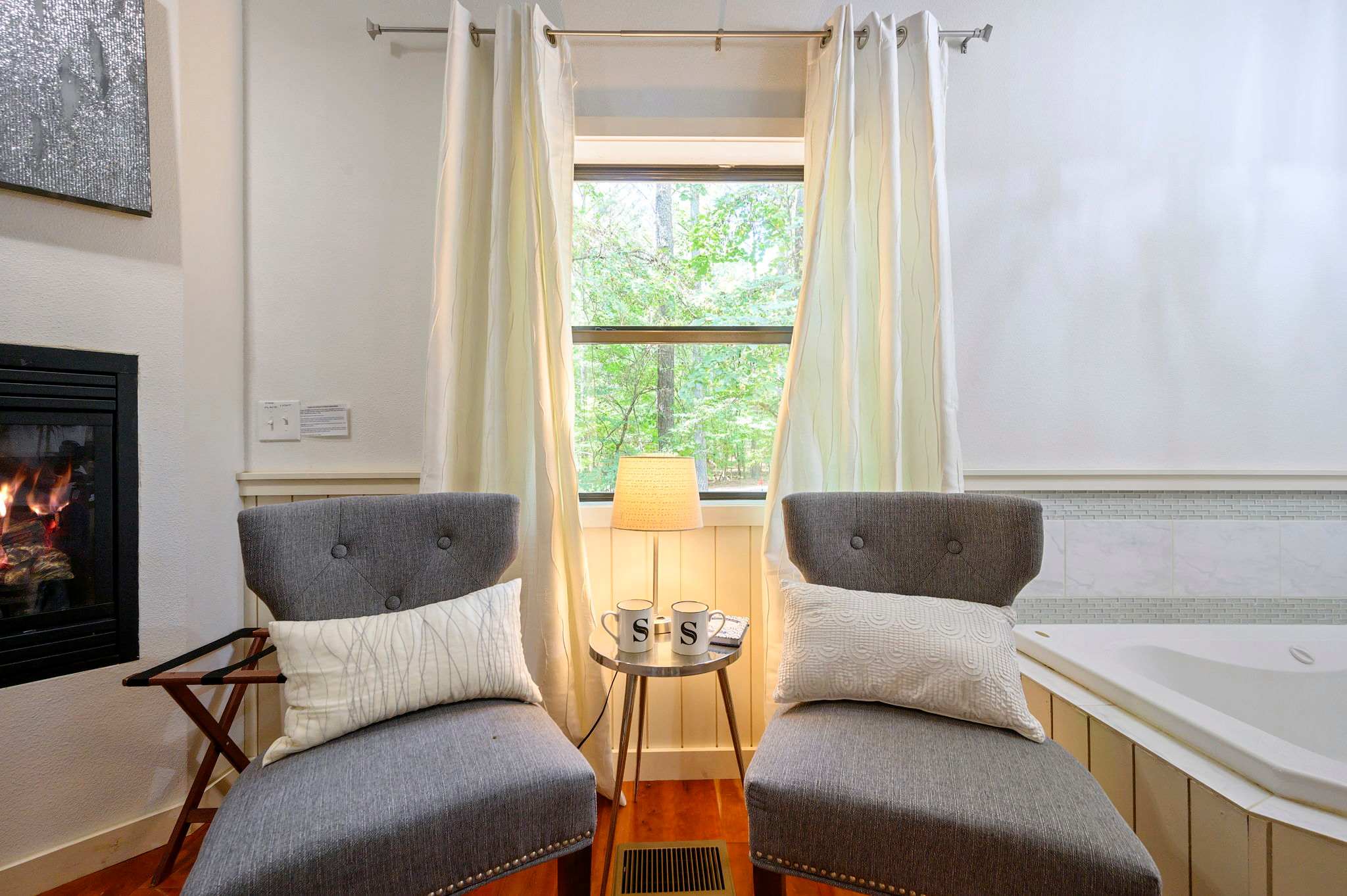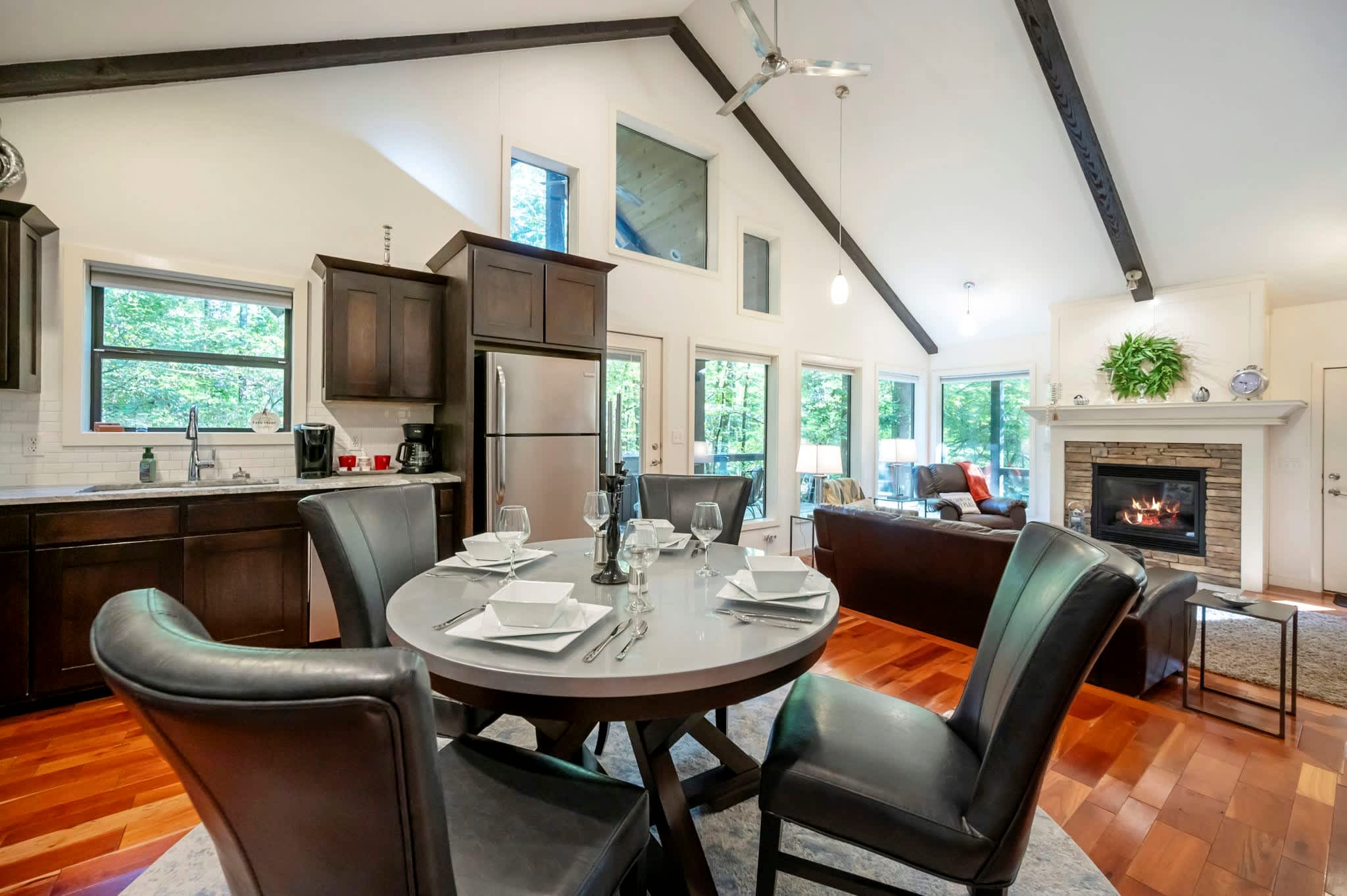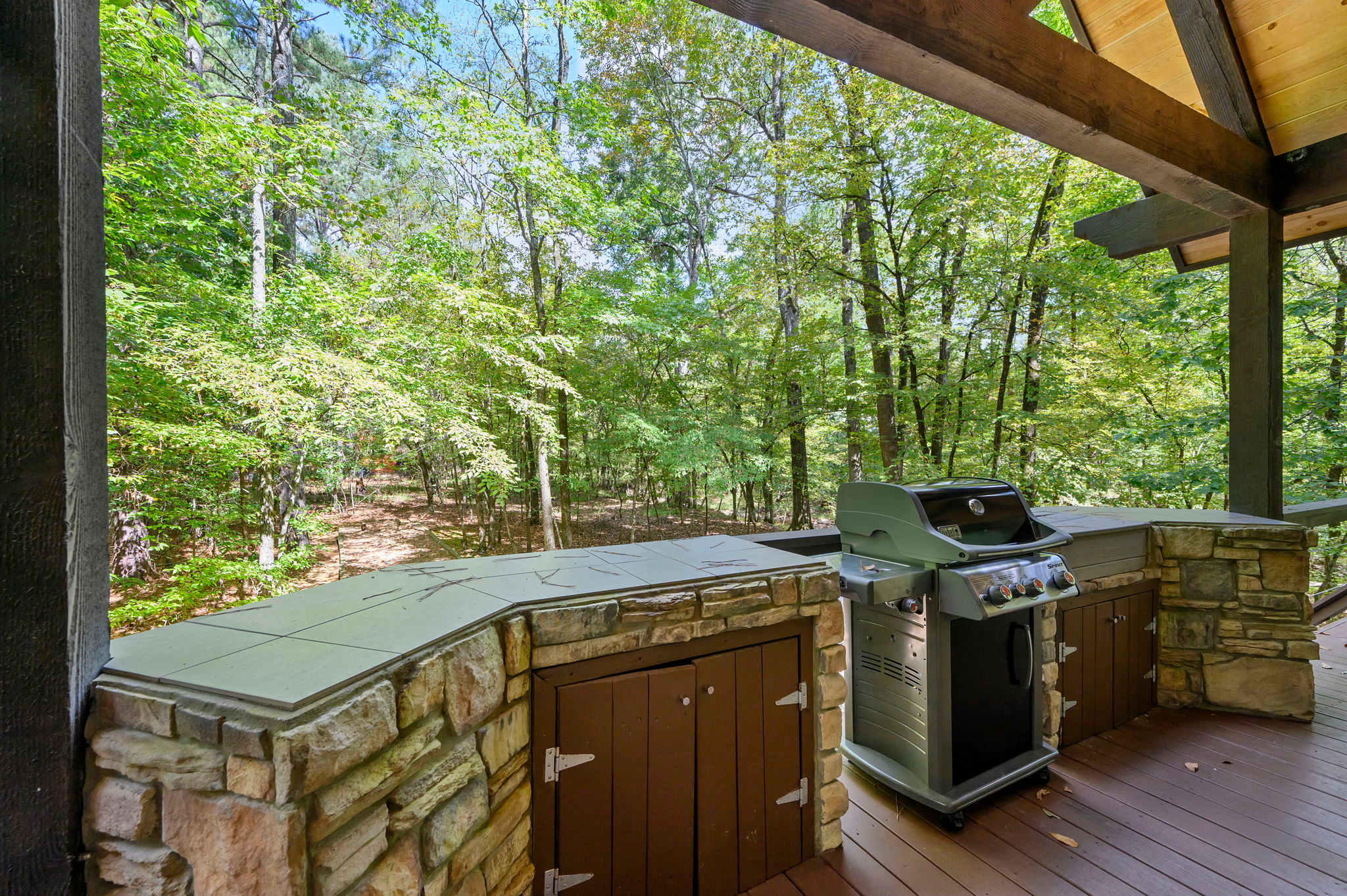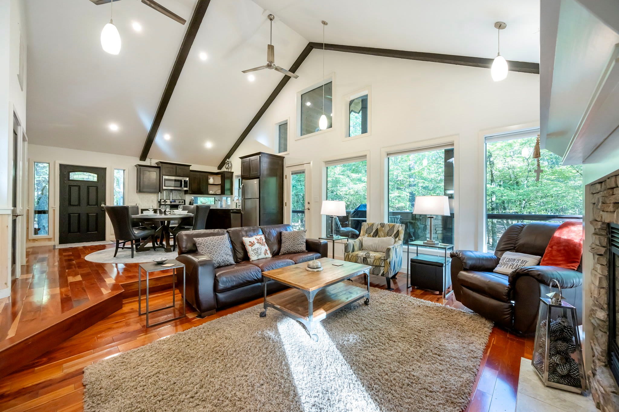 Step inside to open-concept modern mountain living, where large windows frame the surrounding forest and fill the room with soft natural light. The living room invites cozy evenings with a gas fireplace, smart TV, couch, and two armchairs ideal for fireside chats or movie nights. The kitchen blends traditional charm with sophistication, featuring dark cabinetry, stone countertops, stainless steel appliances, and both Keurig and drip coffee options. Share meals at the intimate dining table for four before heading out to unwind on the covered front deck or relax in the soothing hot tub on the back deck. With comfortable outdoor seating, a gas grill, and a crackling firepit by the creek, every moment here feels peaceful and perfectly in tune with nature—your ideal Broken Bow escape.