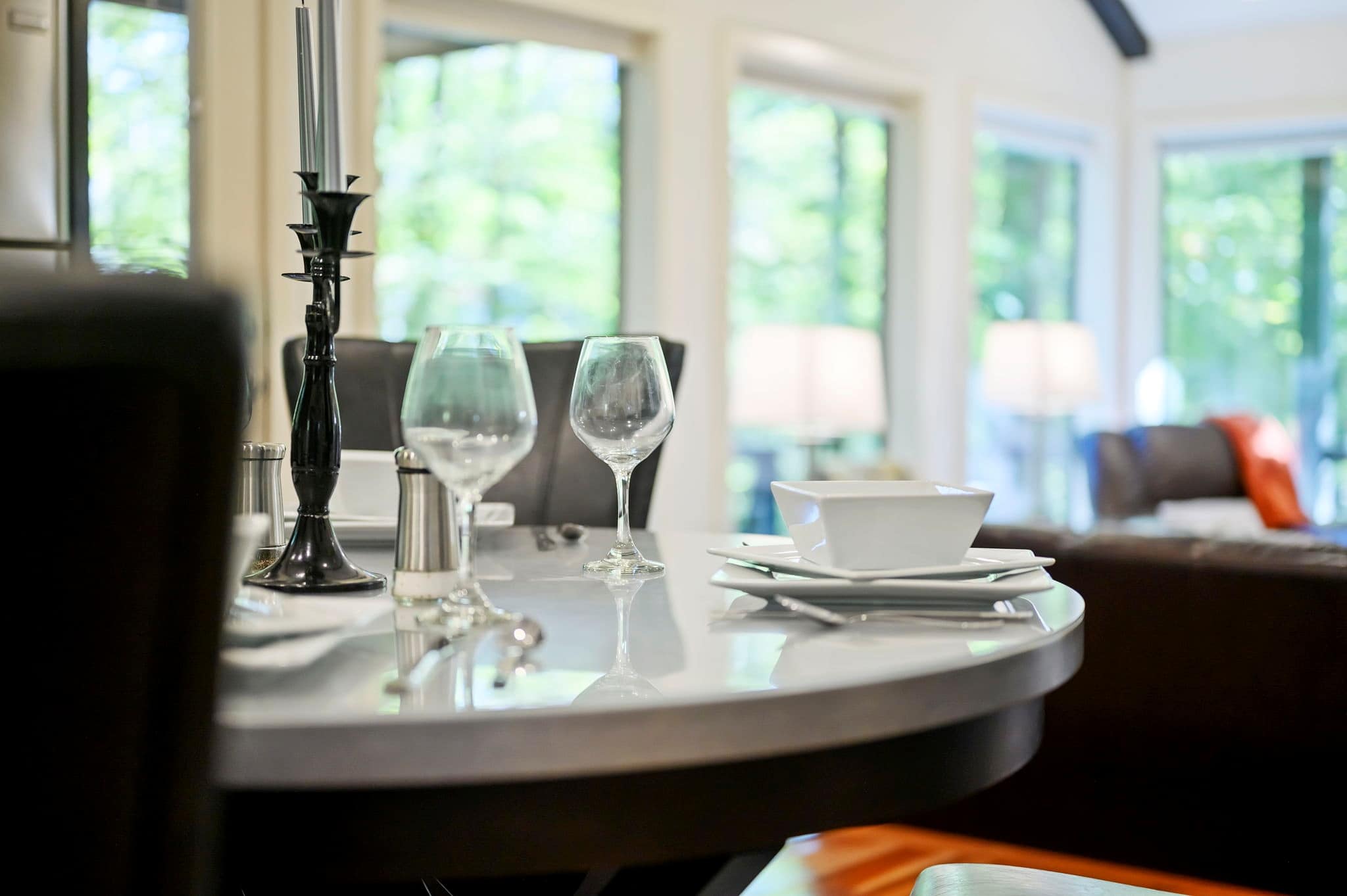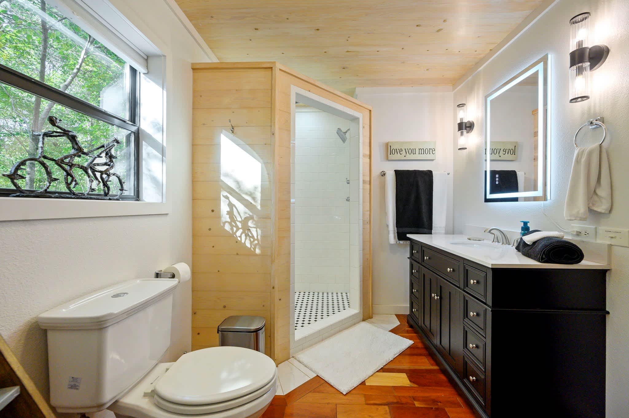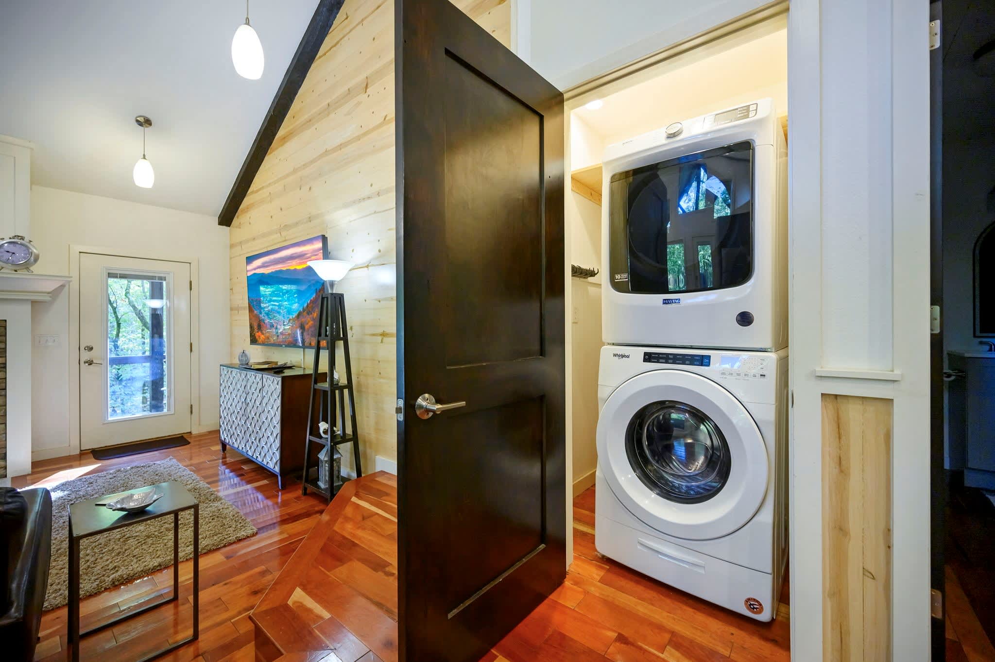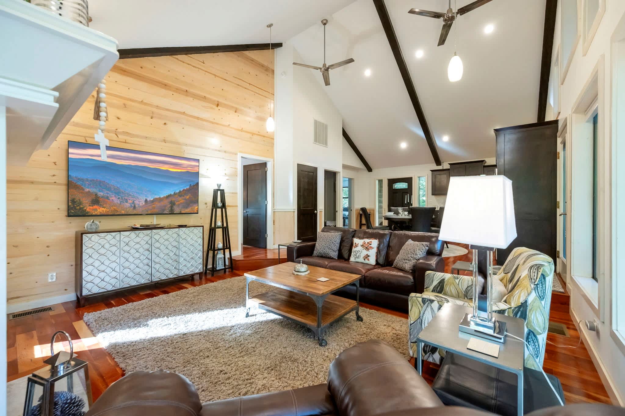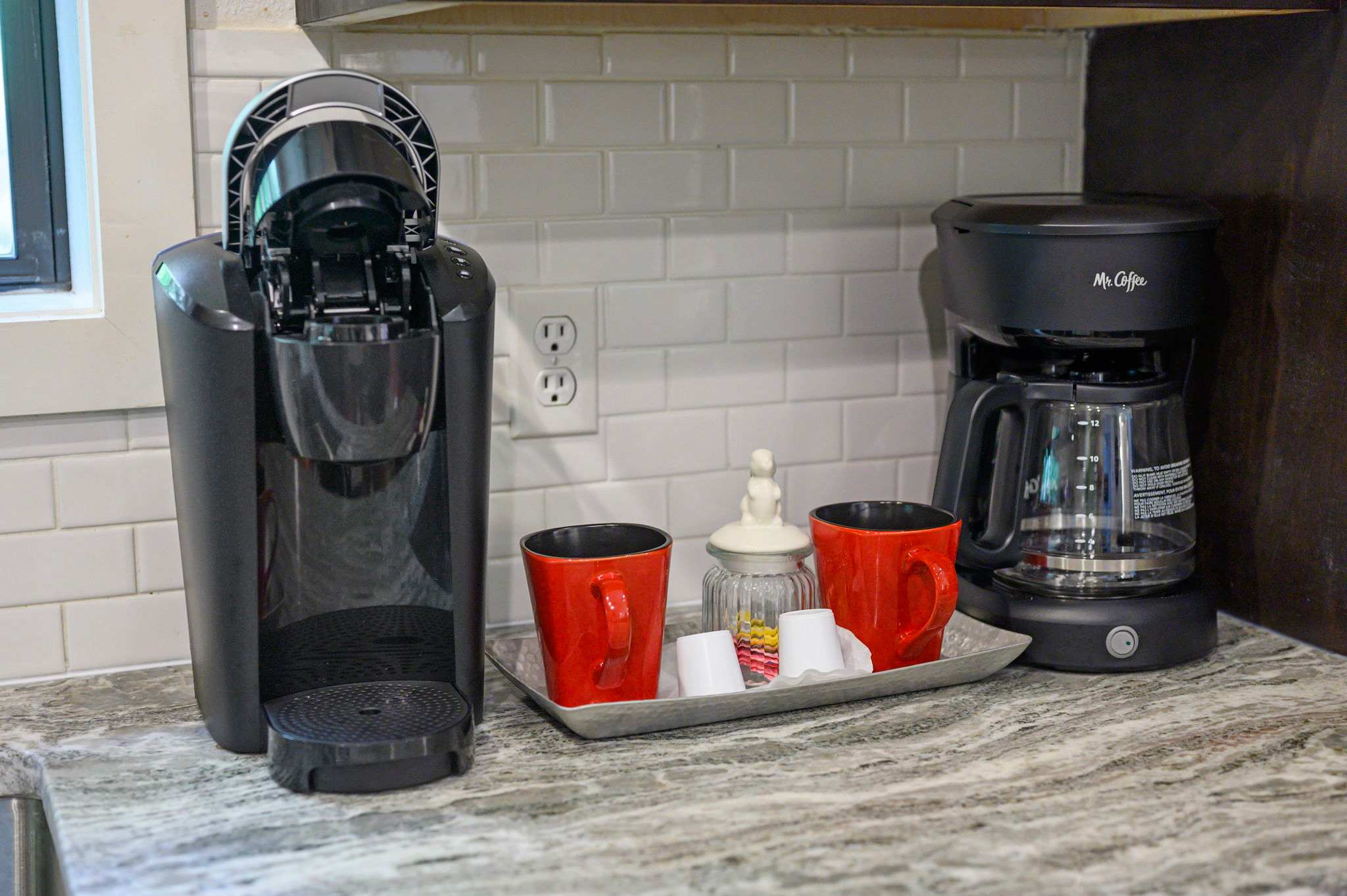 Step inside to open-concept modern mountain living, where large windows frame the surrounding forest and fill the room with soft natural light. The living room invites cozy evenings with a gas fireplace, smart TV, couch, and two armchairs ideal for fireside chats or movie nights. The kitchen blends traditional charm with sophistication, featuring dark cabinetry, stone countertops, stainless steel appliances, and both Keurig and drip coffee options. Share meals at the intimate dining table for four before heading out to unwind on the covered front deck or relax in the soothing hot tub on the back deck. With comfortable outdoor seating, a gas grill, and a crackling firepit by the creek, every moment here feels peaceful and perfectly in tune with nature—your ideal Broken Bow escape.