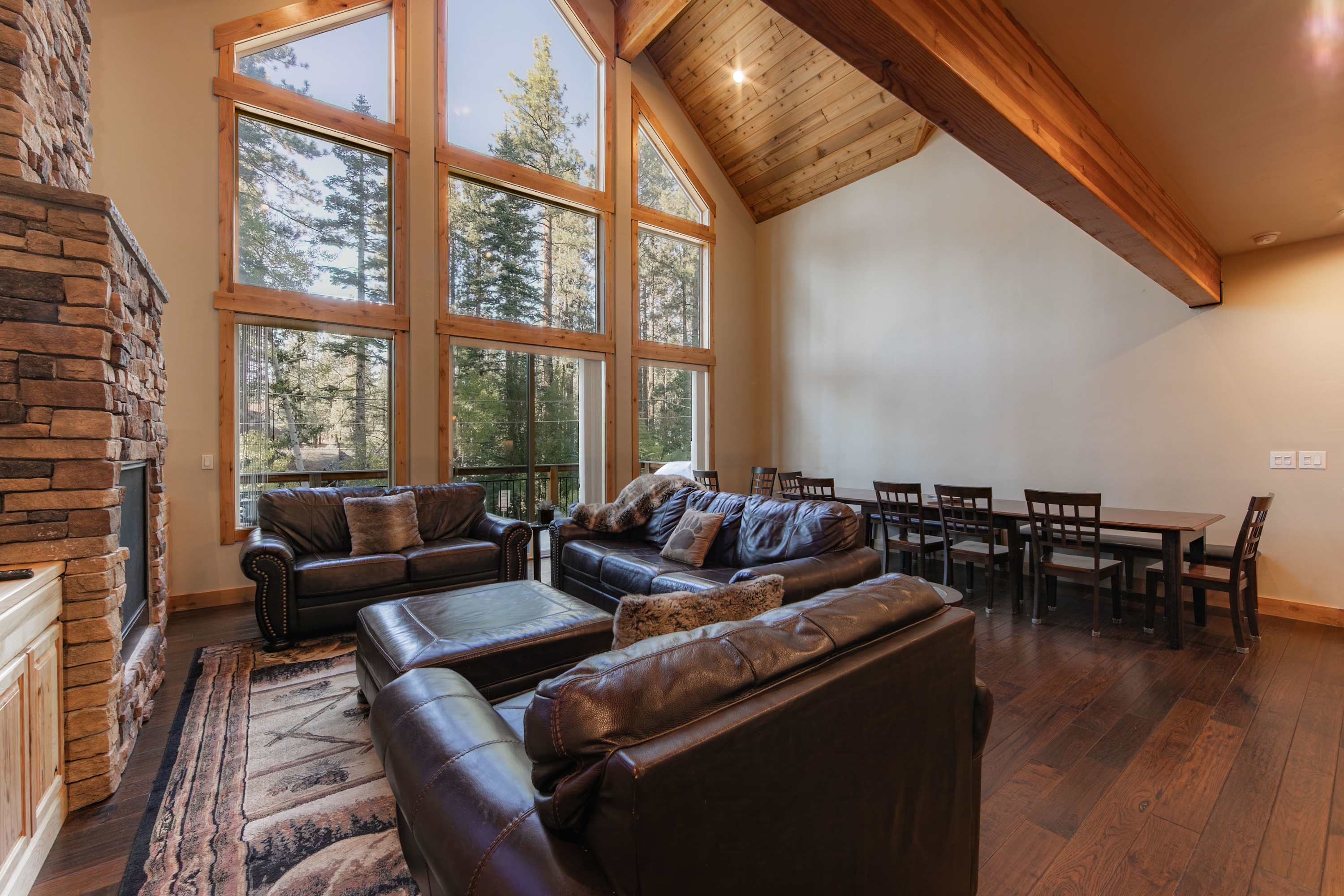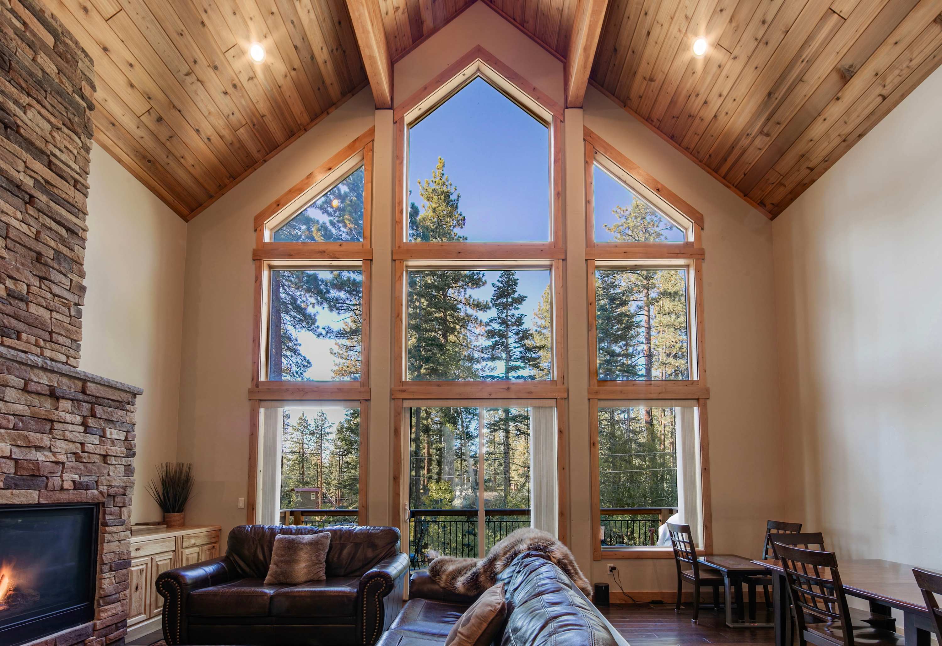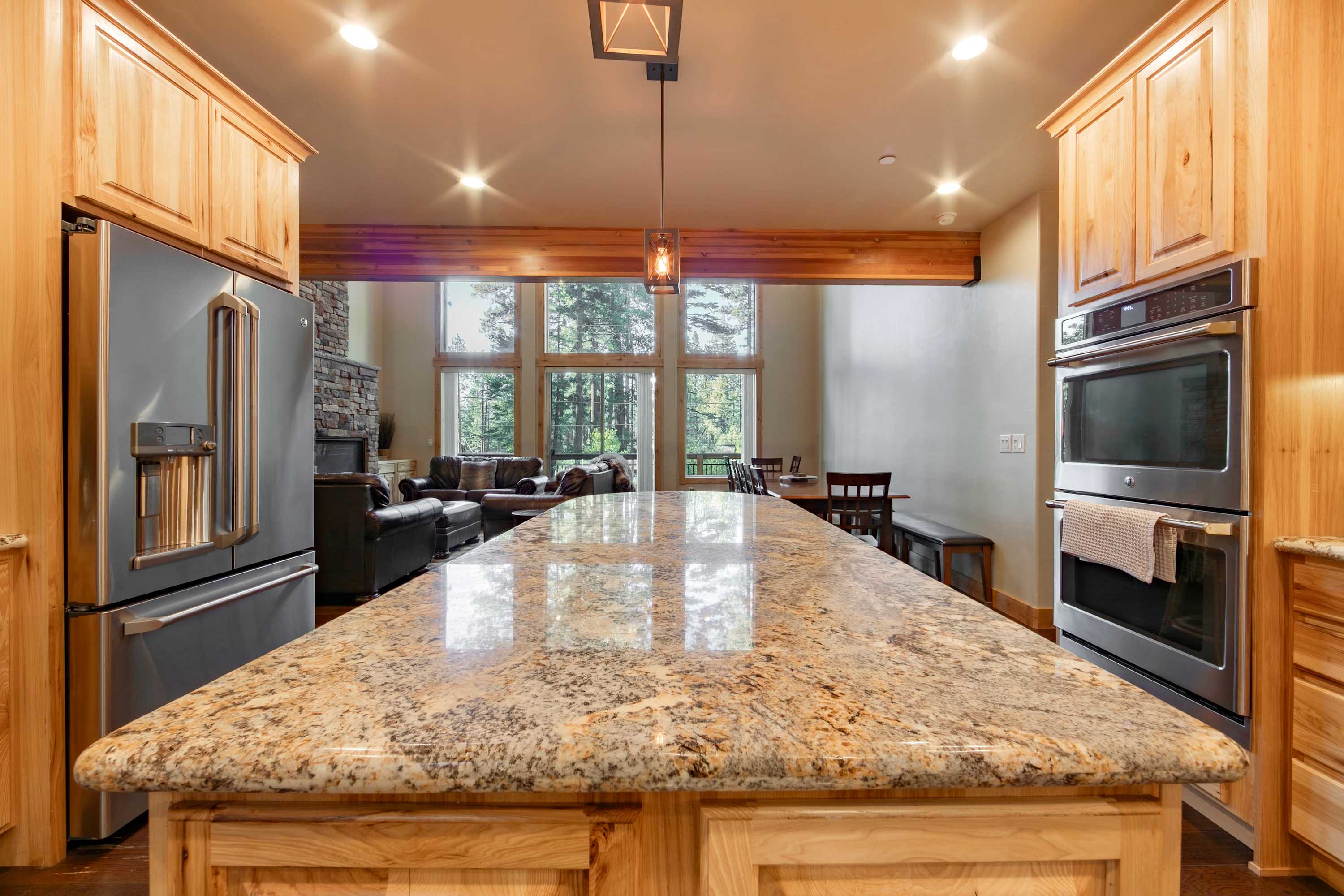 Step inside and be greeted by a first-floor game room that sets the tone for fun—a cozy wraparound couch and recliner invite relaxation around the smart TV, while a wet bar with mini fridge and barstools makes entertaining easy. Upstairs, soaring ceilings and a wall of windows flood the open living space with natural light. Gather around the indoor fireplace in the main living room, with plenty of comfortable seating to sink into while you stream your favorite shows by the fire. There’s ample room for everyone to help prepare meals in the sleek, fully equipped kitchen featuring stainless steel appliances, double oven, Keurig and Nespresso machines, and a large island with counter seating. Share your homecooked meals together at the expansive dining table for 10–12 before heading to the loft for friendly competition with a game of pool or ping pong.