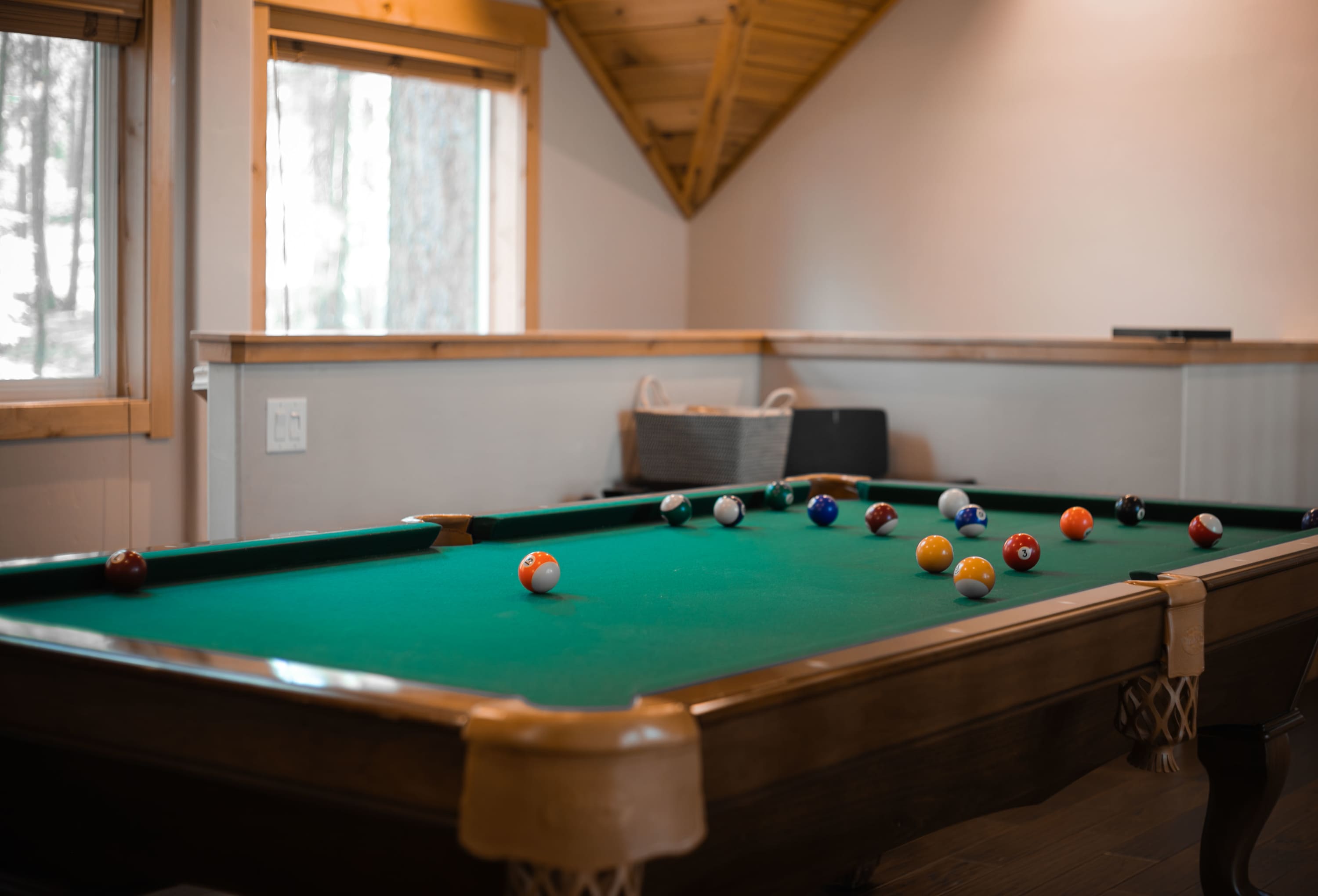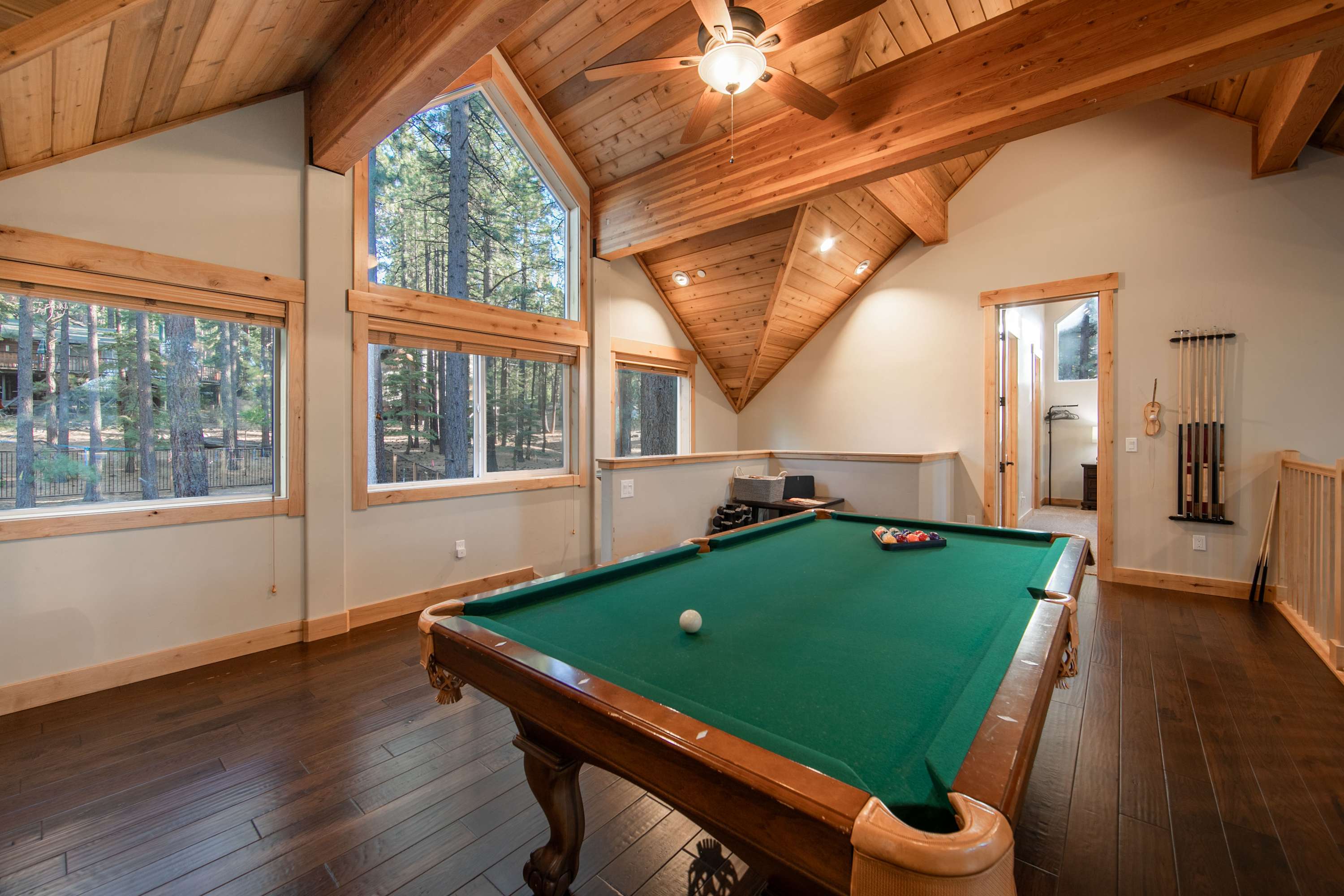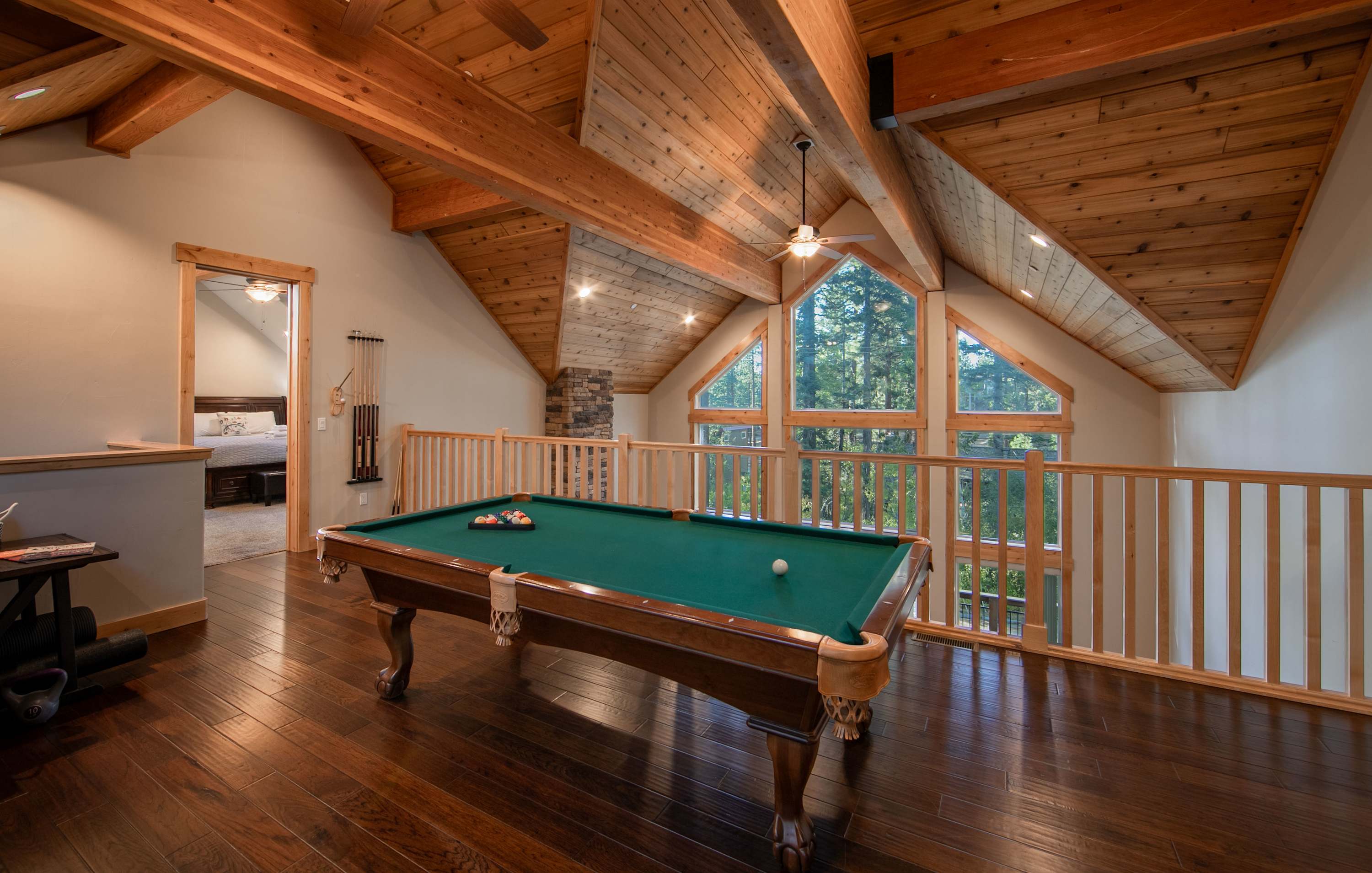 Step inside and be greeted by a first-floor game room that sets the tone for fun—a cozy wraparound couch and recliner invite relaxation around the smart TV, while a wet bar with mini fridge and barstools makes entertaining easy. Upstairs, soaring ceilings and a wall of windows flood the open living space with natural light. Gather around the indoor fireplace in the main living room, with plenty of comfortable seating to sink into while you stream your favorite shows by the fire. There’s ample room for everyone to help prepare meals in the sleek, fully equipped kitchen featuring stainless steel appliances, double oven, Keurig and Nespresso machines, and a large island with counter seating. Share your homecooked meals together at the expansive dining table for 10–12 before heading to the loft for friendly competition with a game of pool or ping pong.