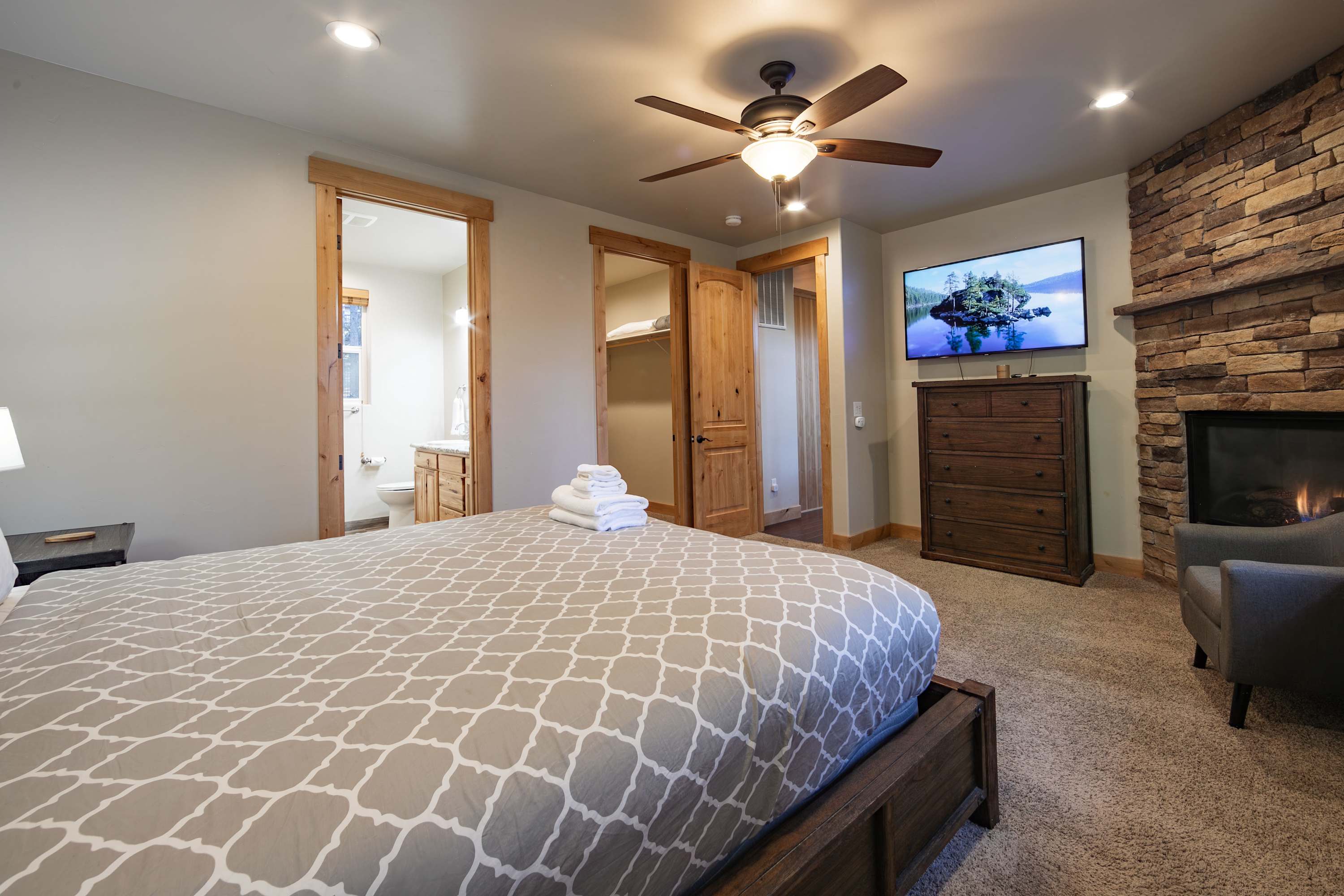 Bedroom #2 includes a king size bed, a smart TV, a fireplace, a chair in the nook area, and a Jack-and-Jill bathroom with a dual vanity, a soaking tub, and a walk-in shower.