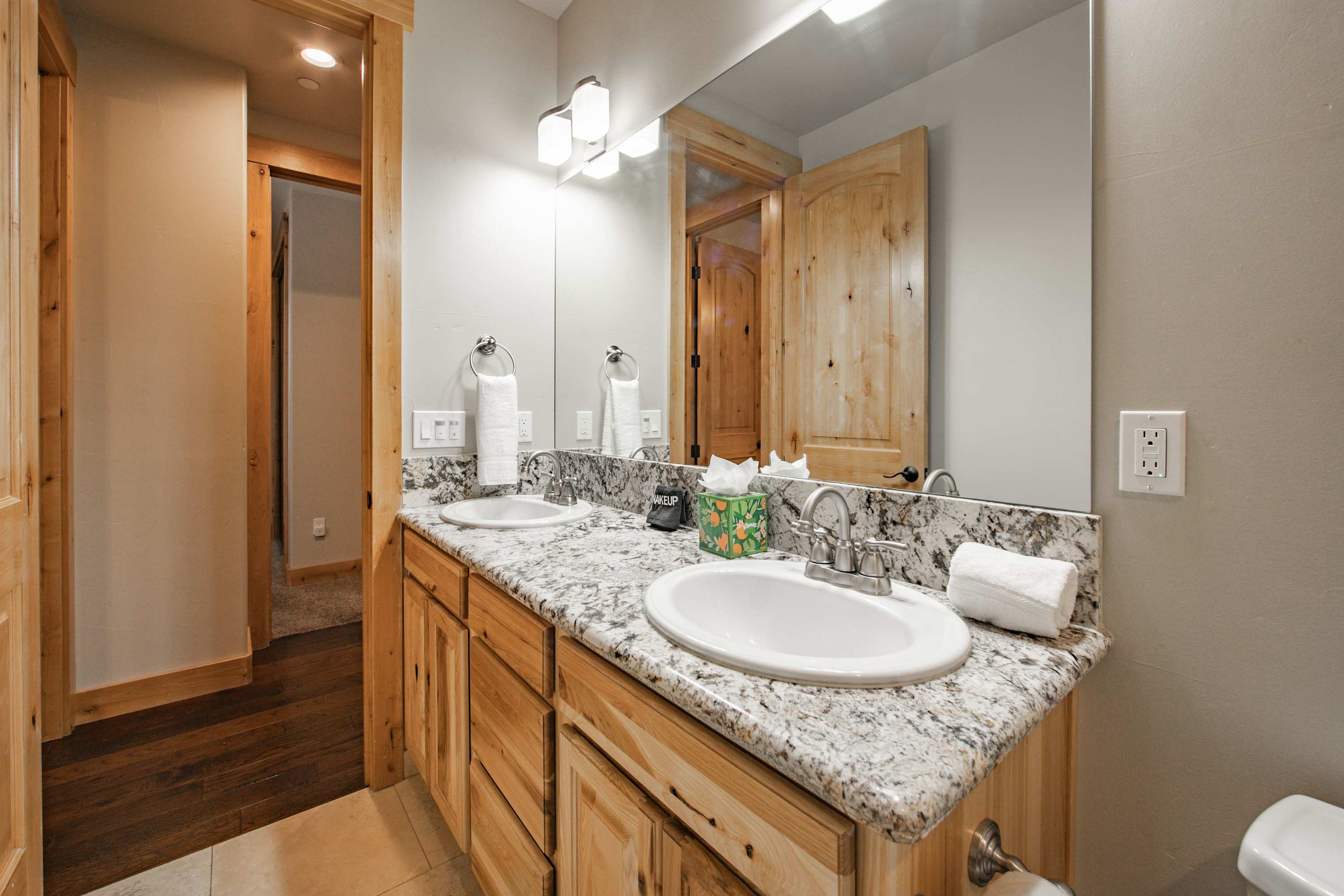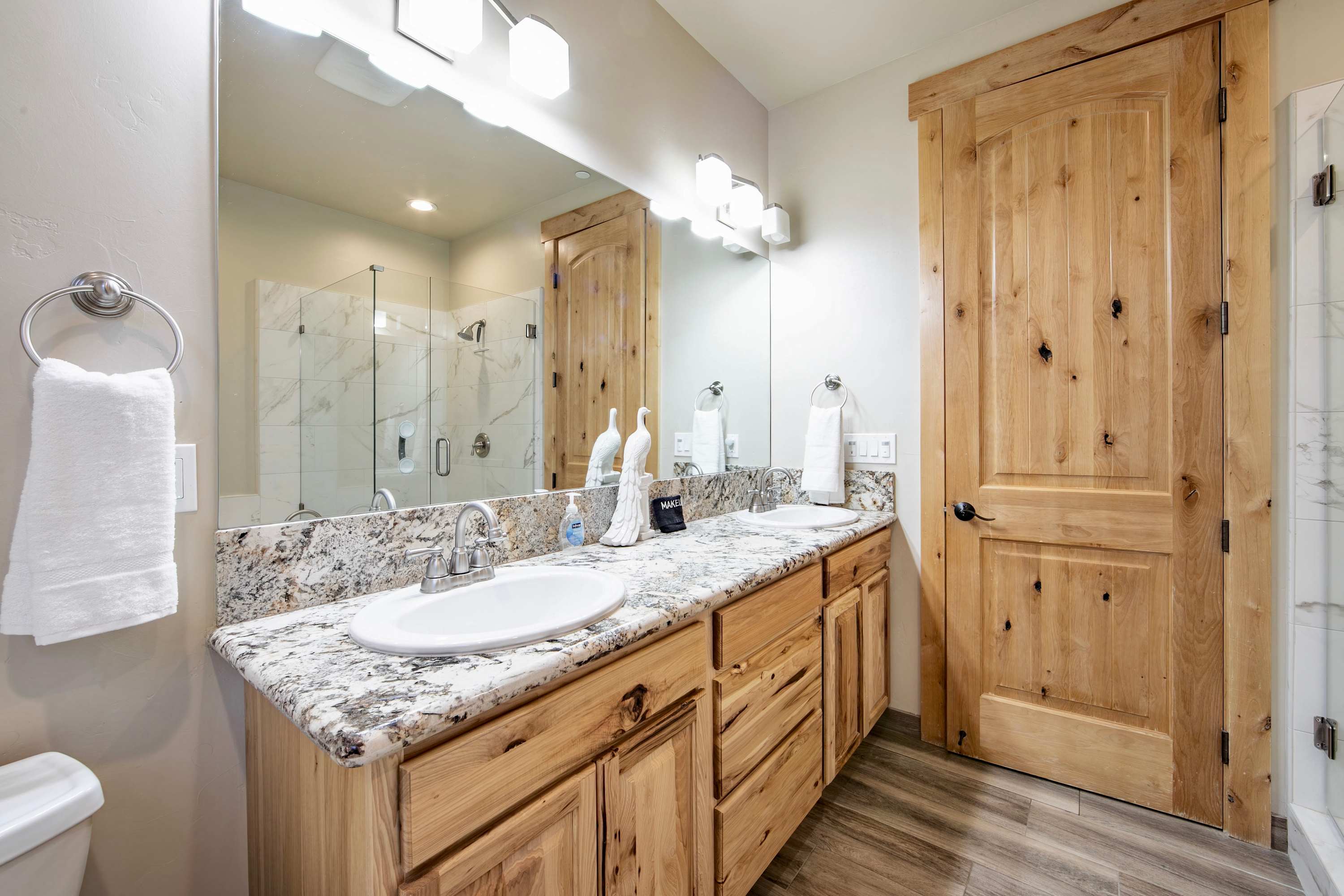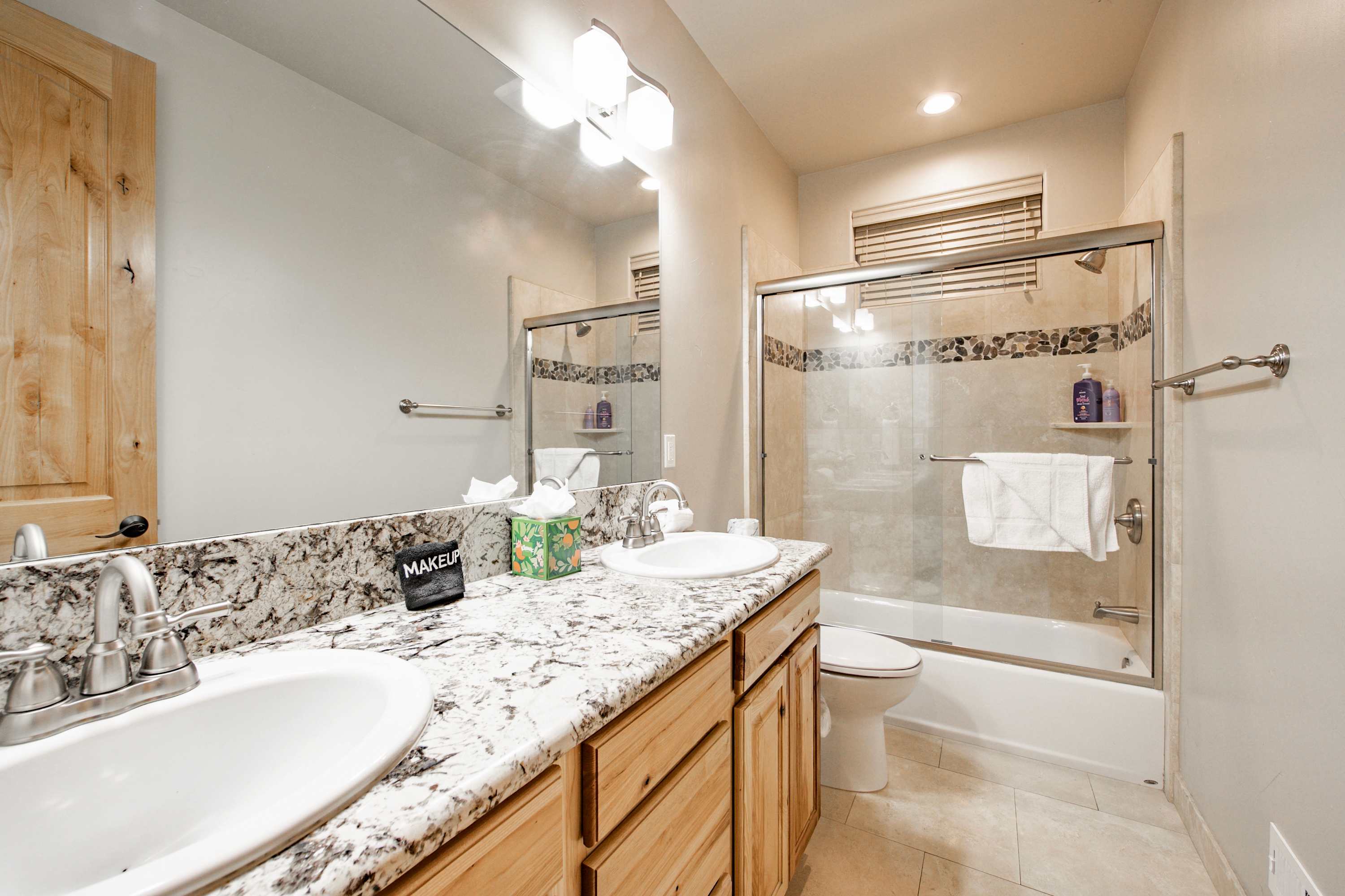 This home also includes 2 full guest bathrooms; one with a single vanity and a walk-in shower, and another with a dual vanity and a shower/tub combo.