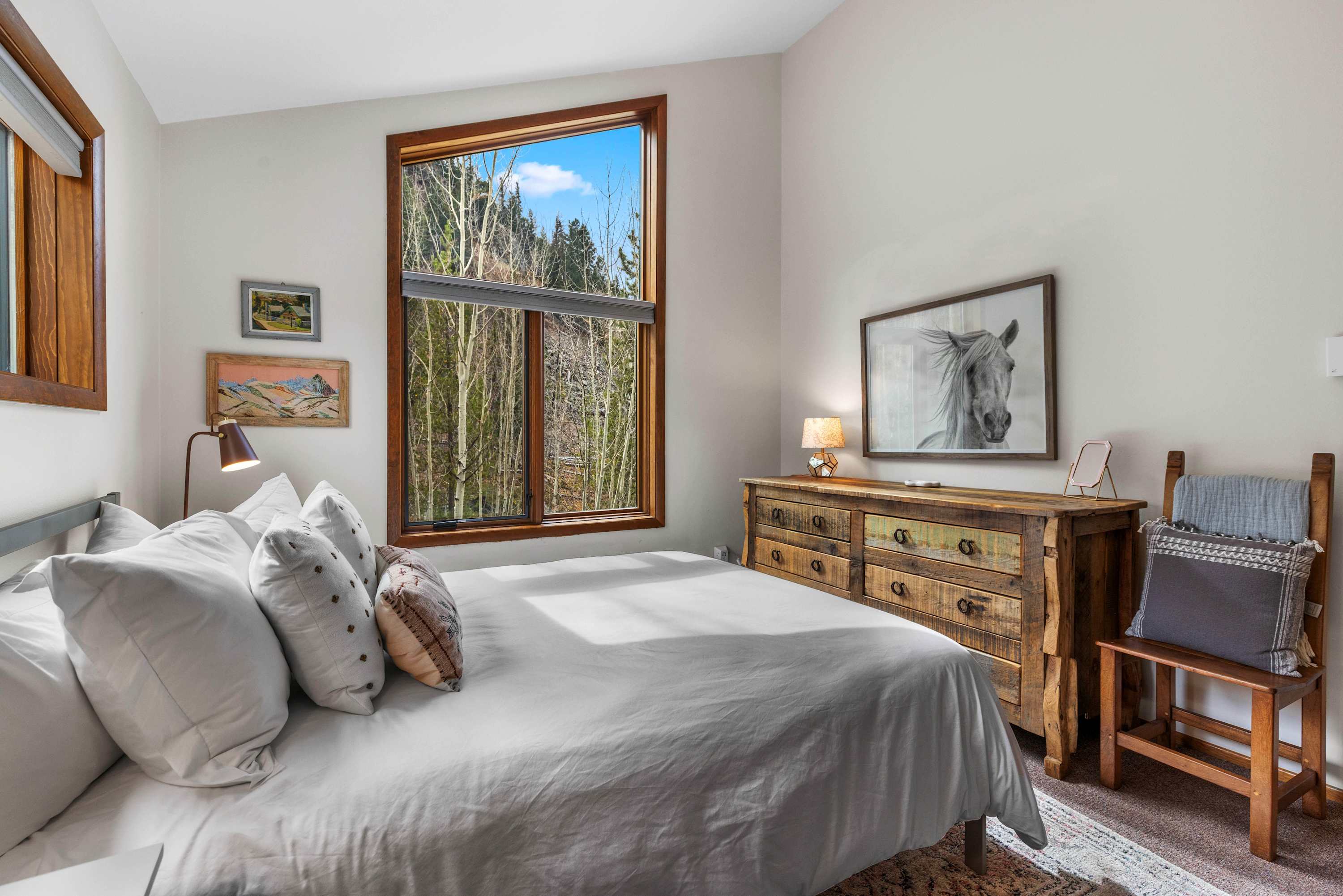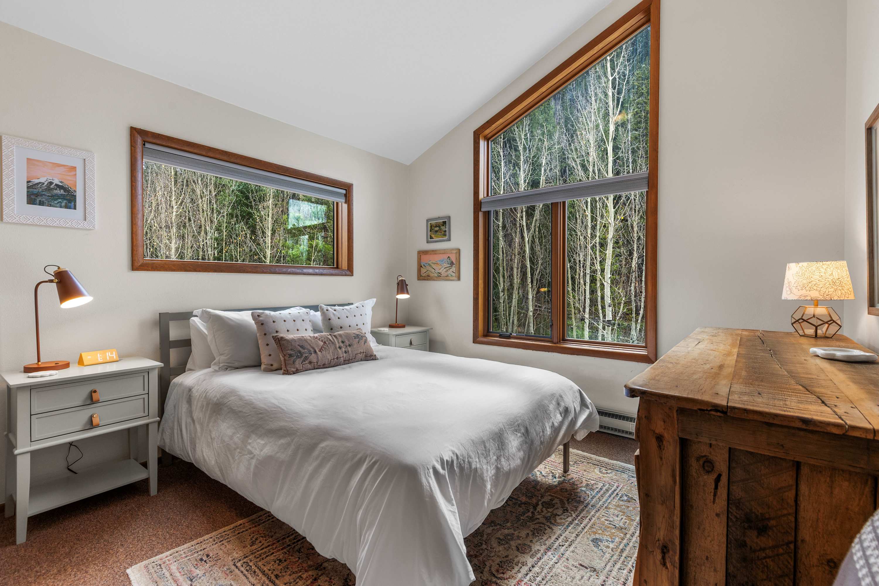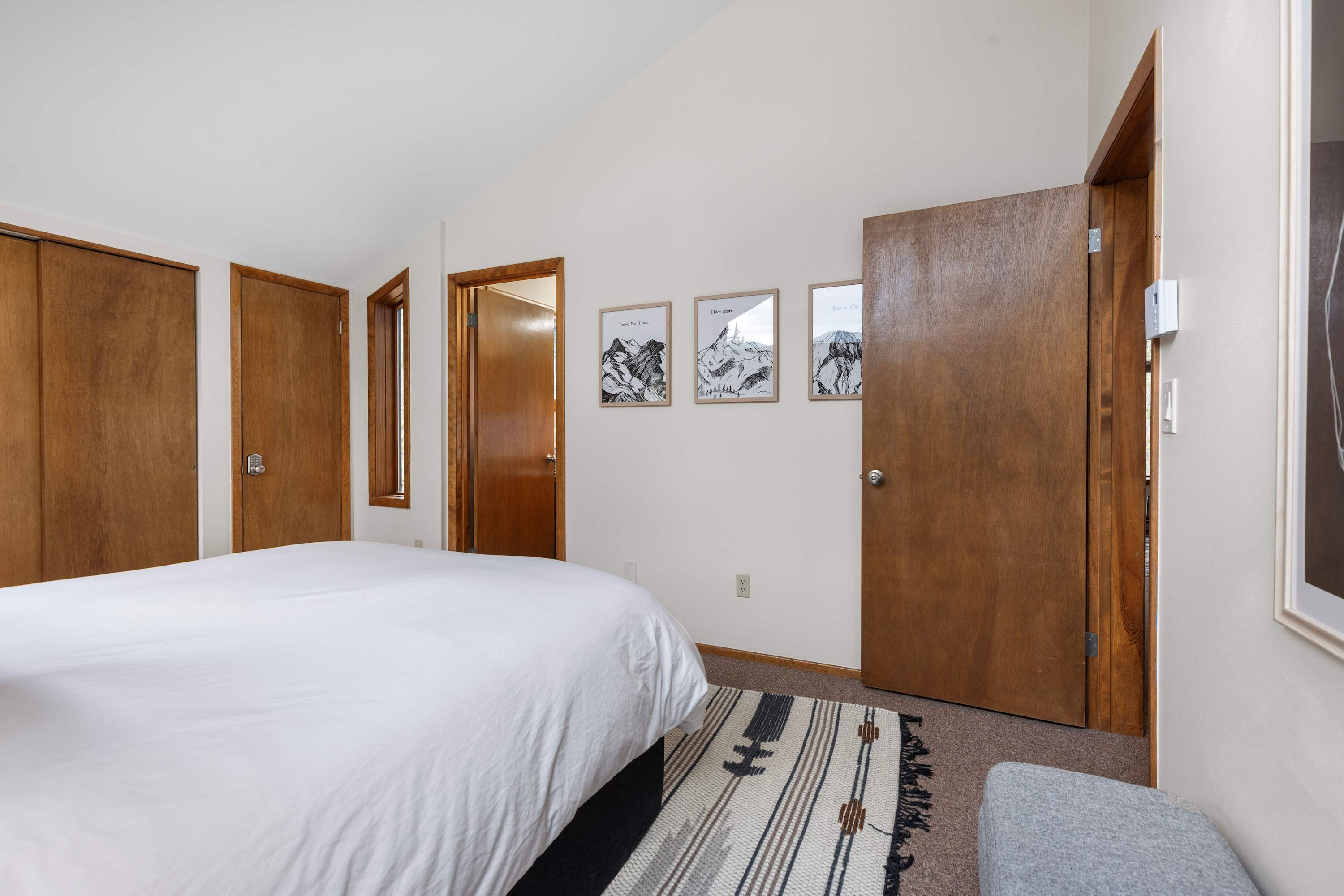 • Bedroom 2 (Upstairs): Queen bed, vaulted ceiling, dresser, two nightstands, large closet.