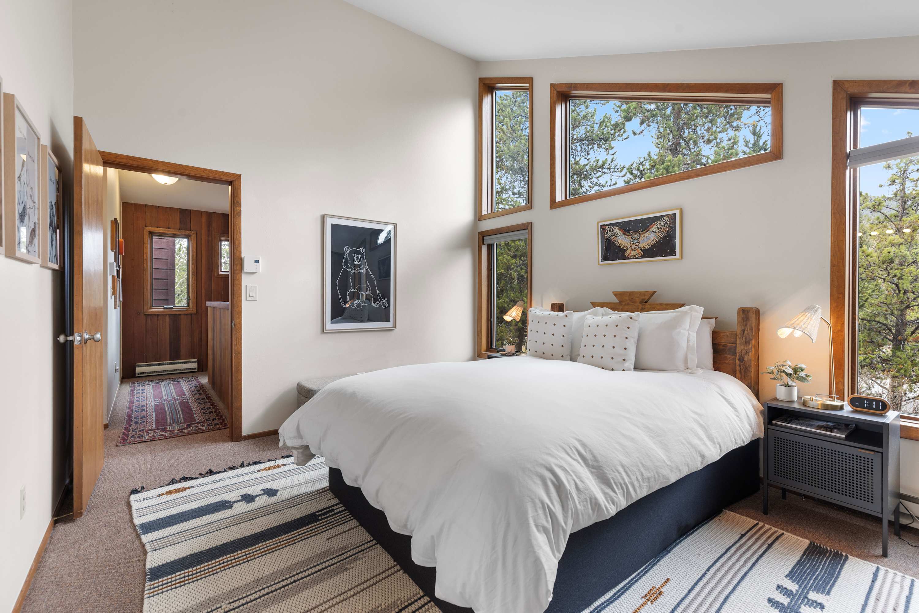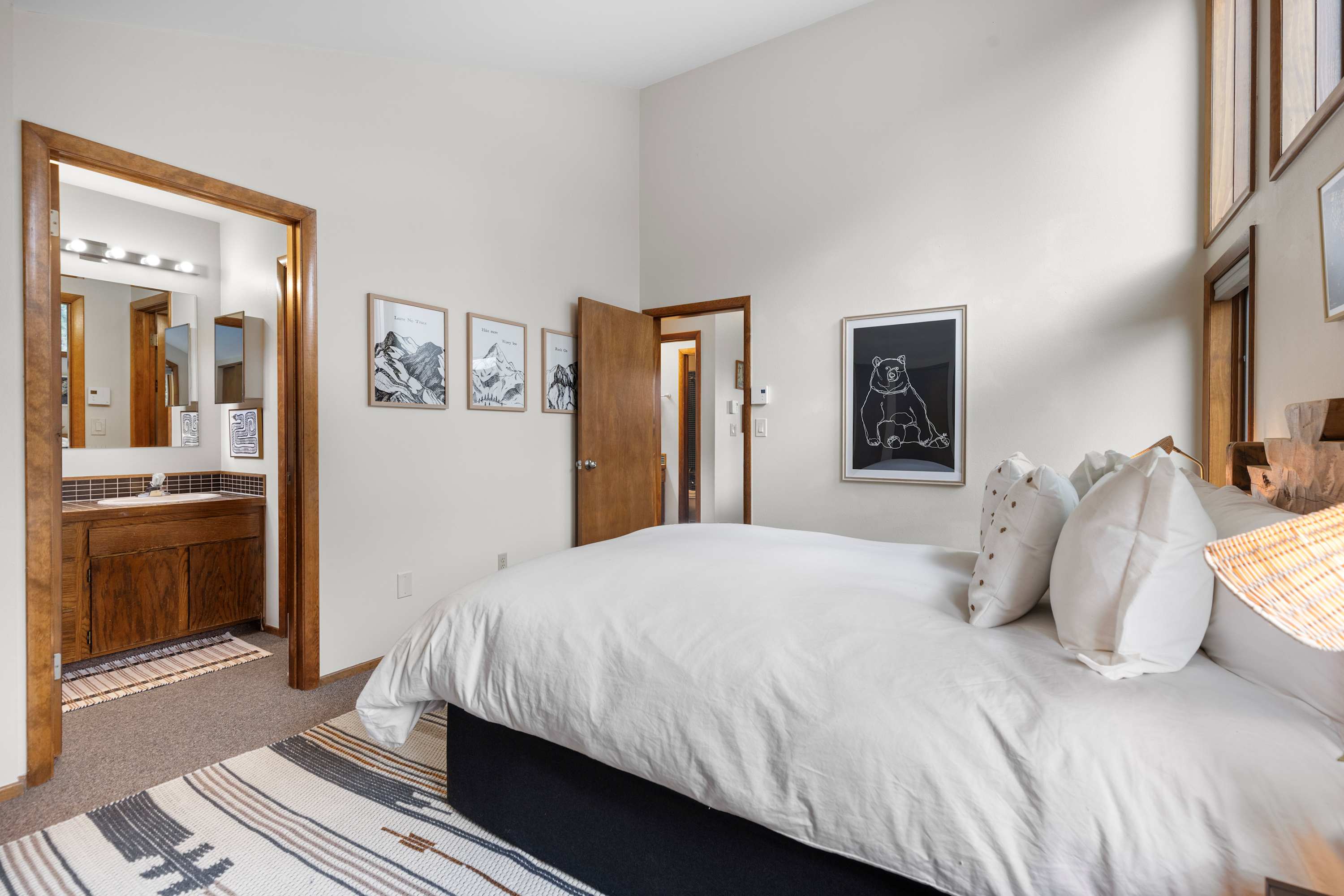 • Bedroom 1 (Primary – Upstairs): Queen bed, vaulted ceilings, two large closets; ensuite full bathroom with a tub.