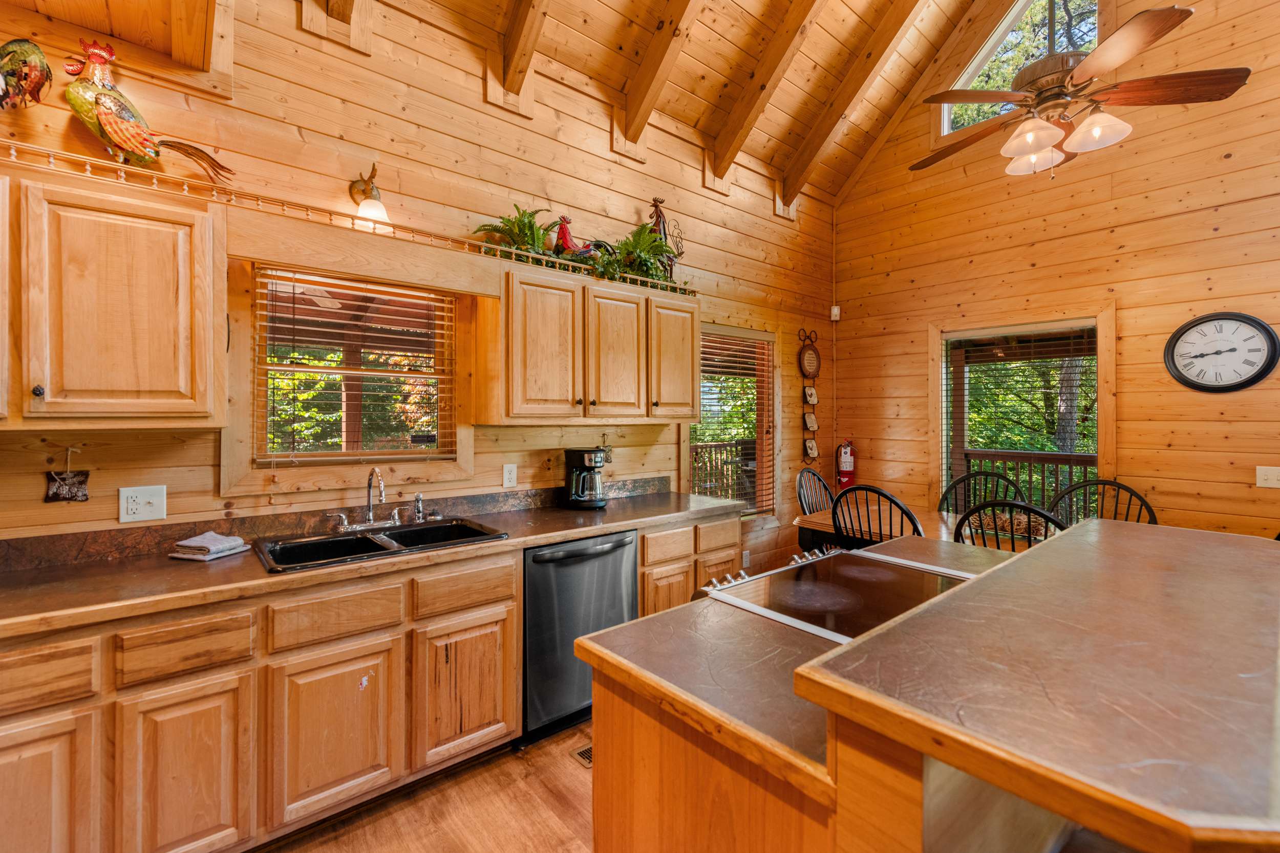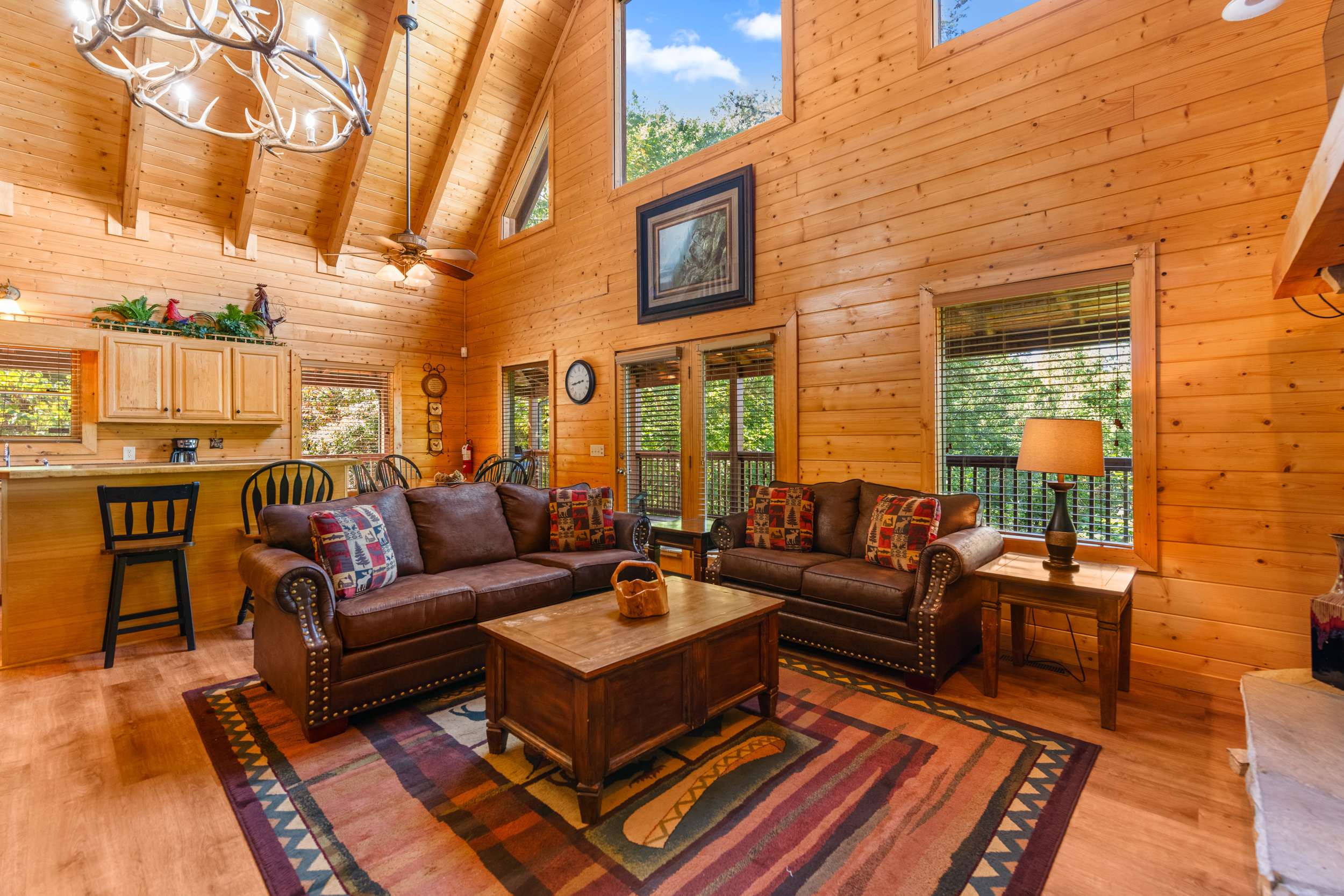 The living areas are made for relaxing—sip coffee on the deck in the morning, stream a movie at night, or head downstairs to the spacious game room for pool, darts, or a round on the mini-golf area. The kitchen is equipped with cookware, bakeware, and utensils so you can prepare meals at home, and there’s outdoor dining plus a gas grill for easy cookouts. After a day exploring the Park, unwind under the stars in the private hot tub or gather around the fire pit for stories and s’mores. A washer and dryer add convenience during longer stays.