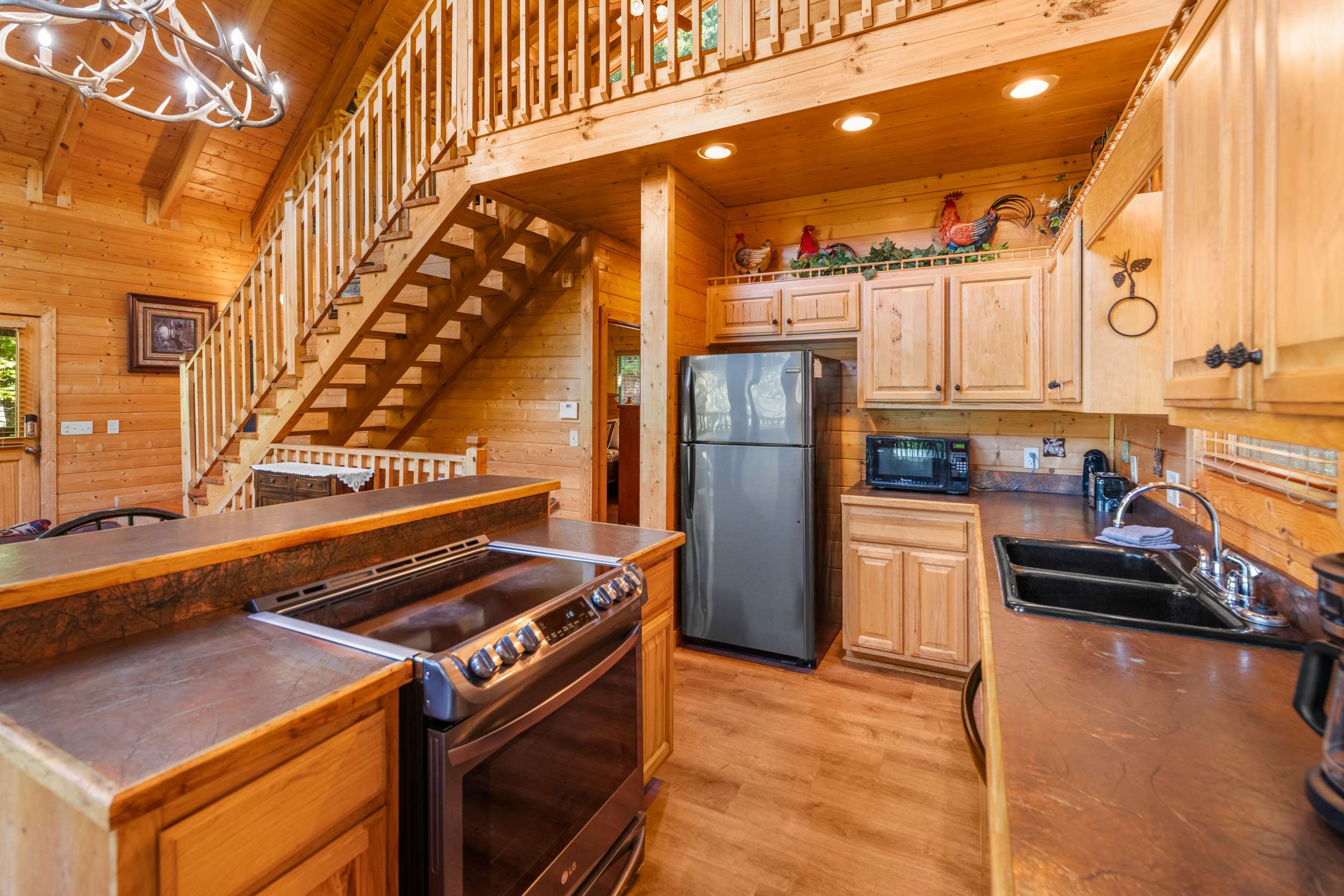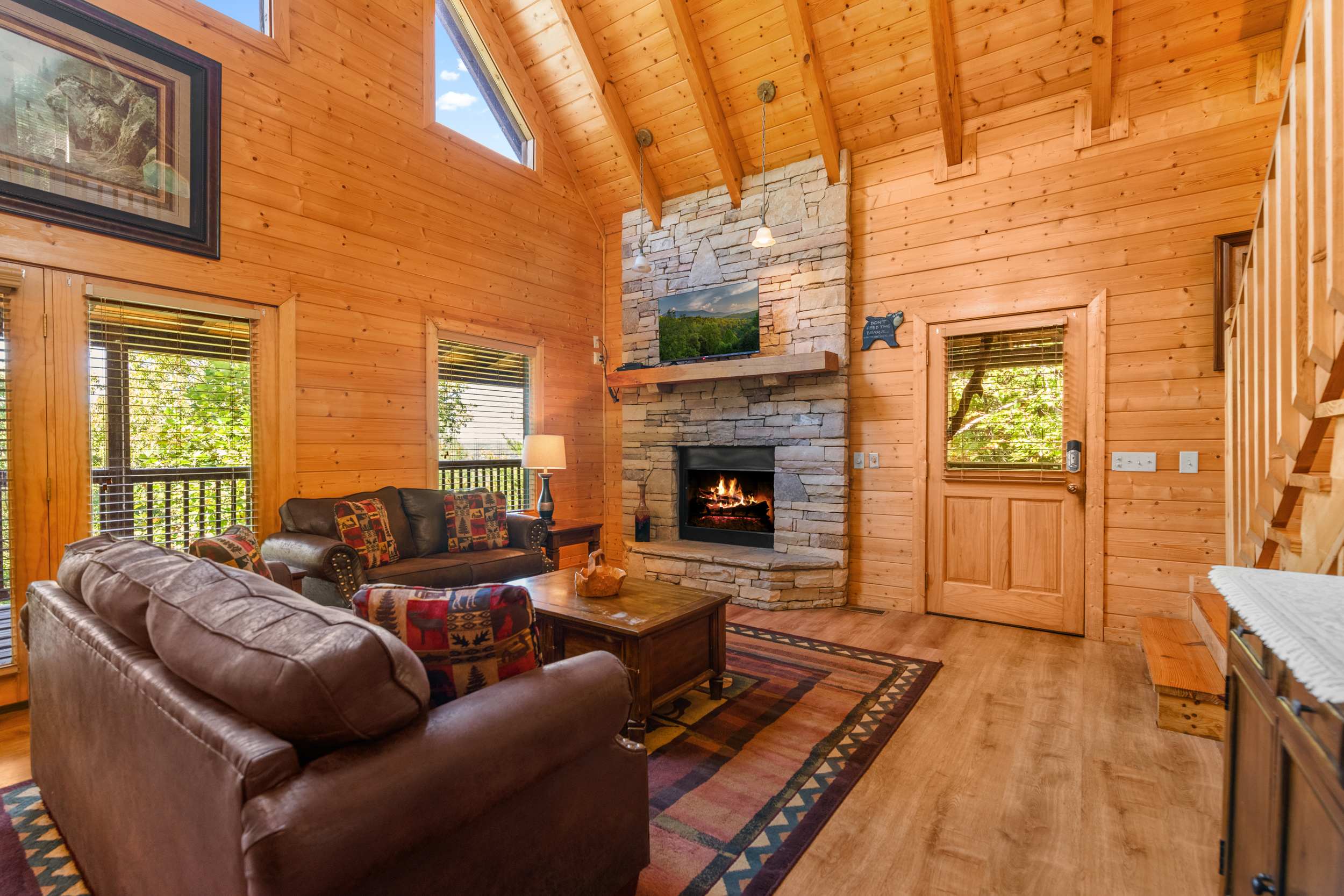 • Stairs: This is a multi-level cabin; stairs are required to access bedrooms and common spaces.