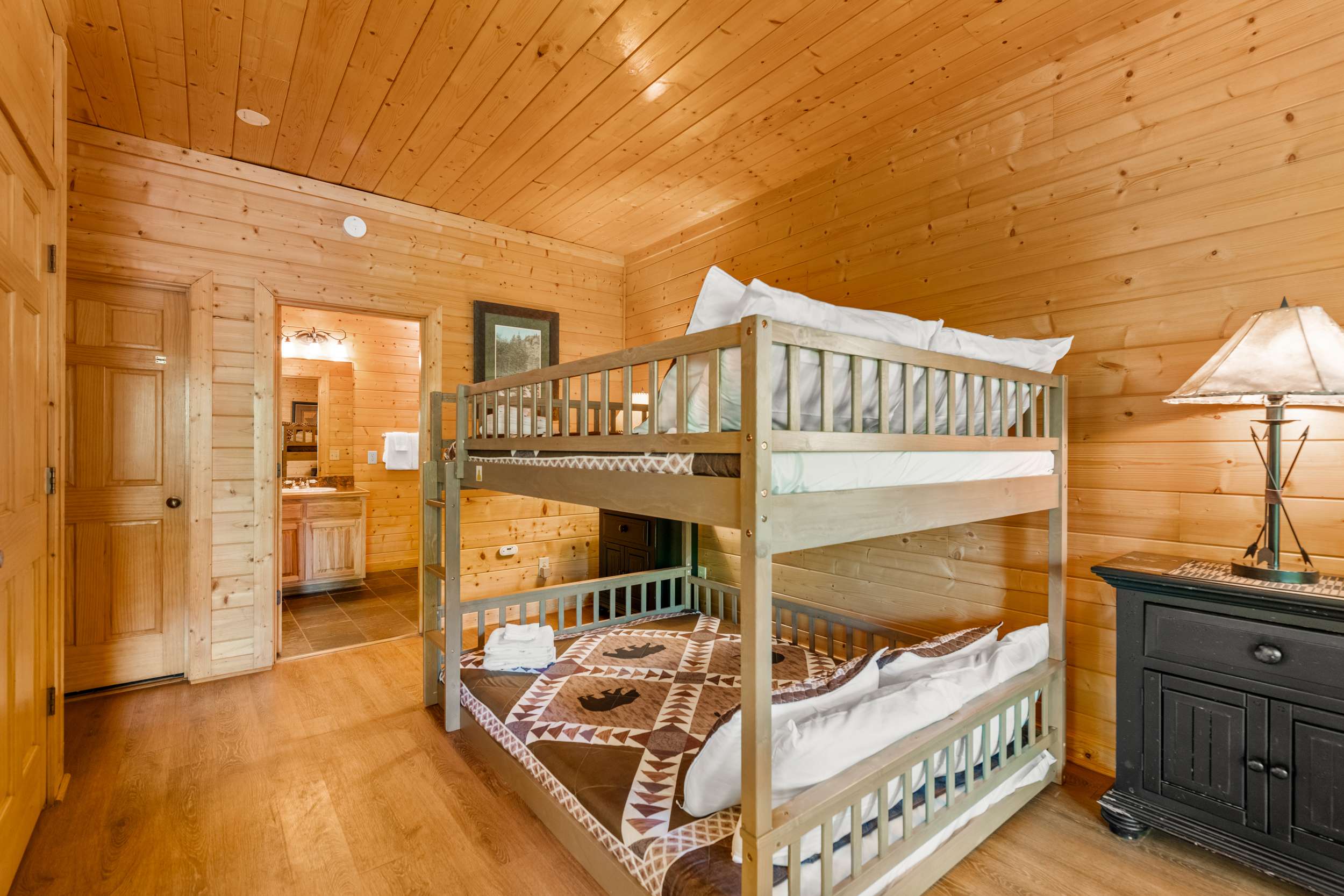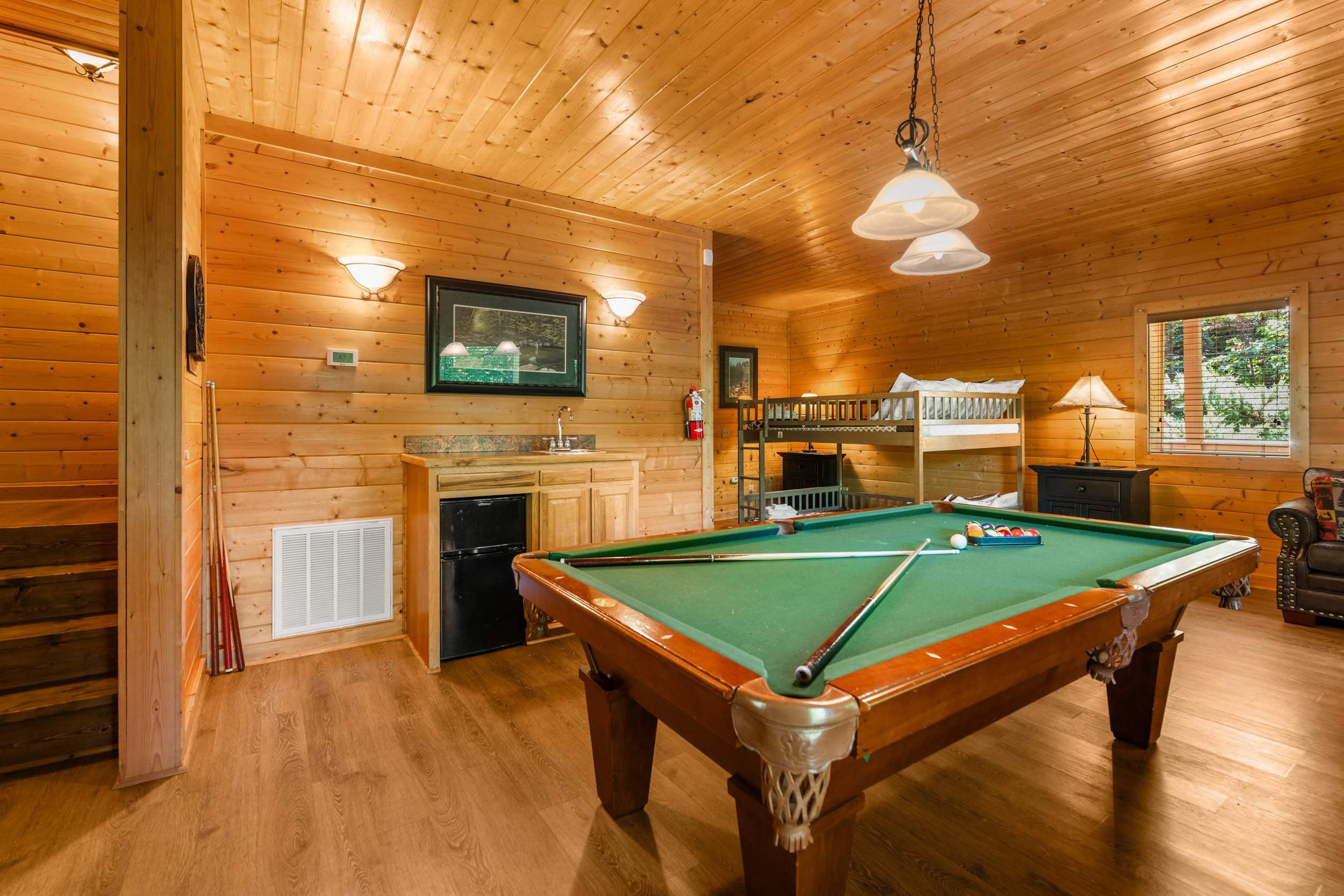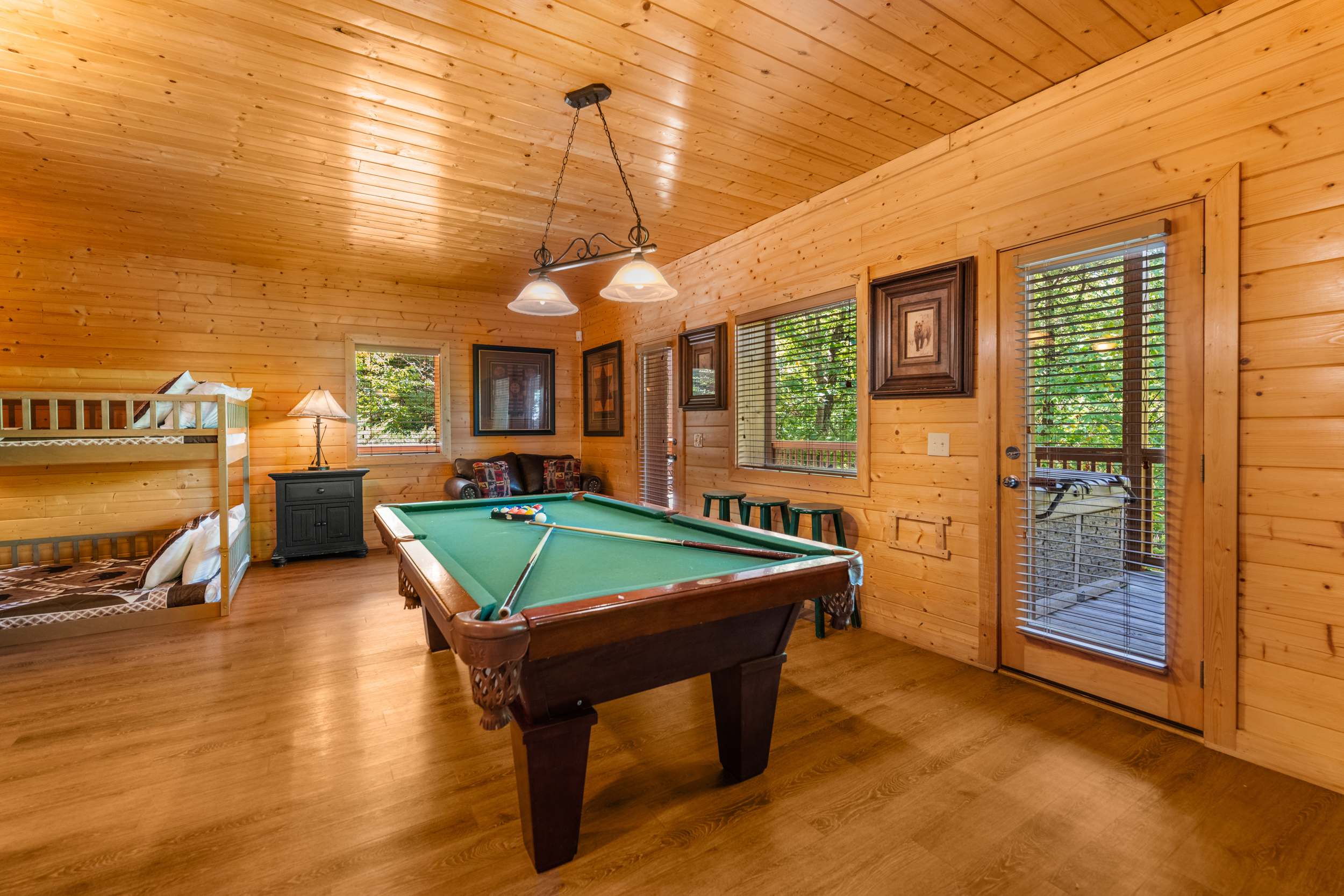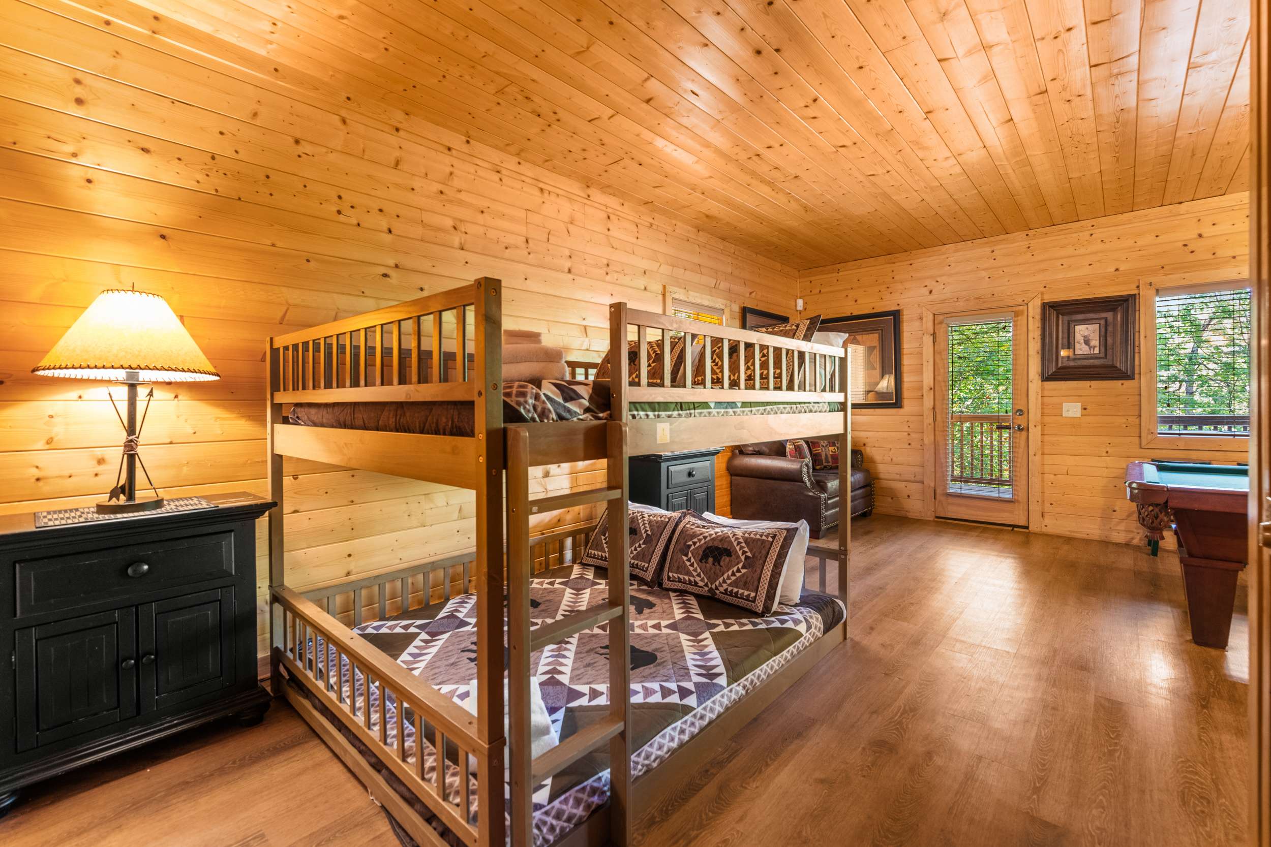 • Game Room/Bedroom (Lower Level): Queen-over-Queen bunk, smart TV, pool table, deck access, ensuite bathroom with standing shower