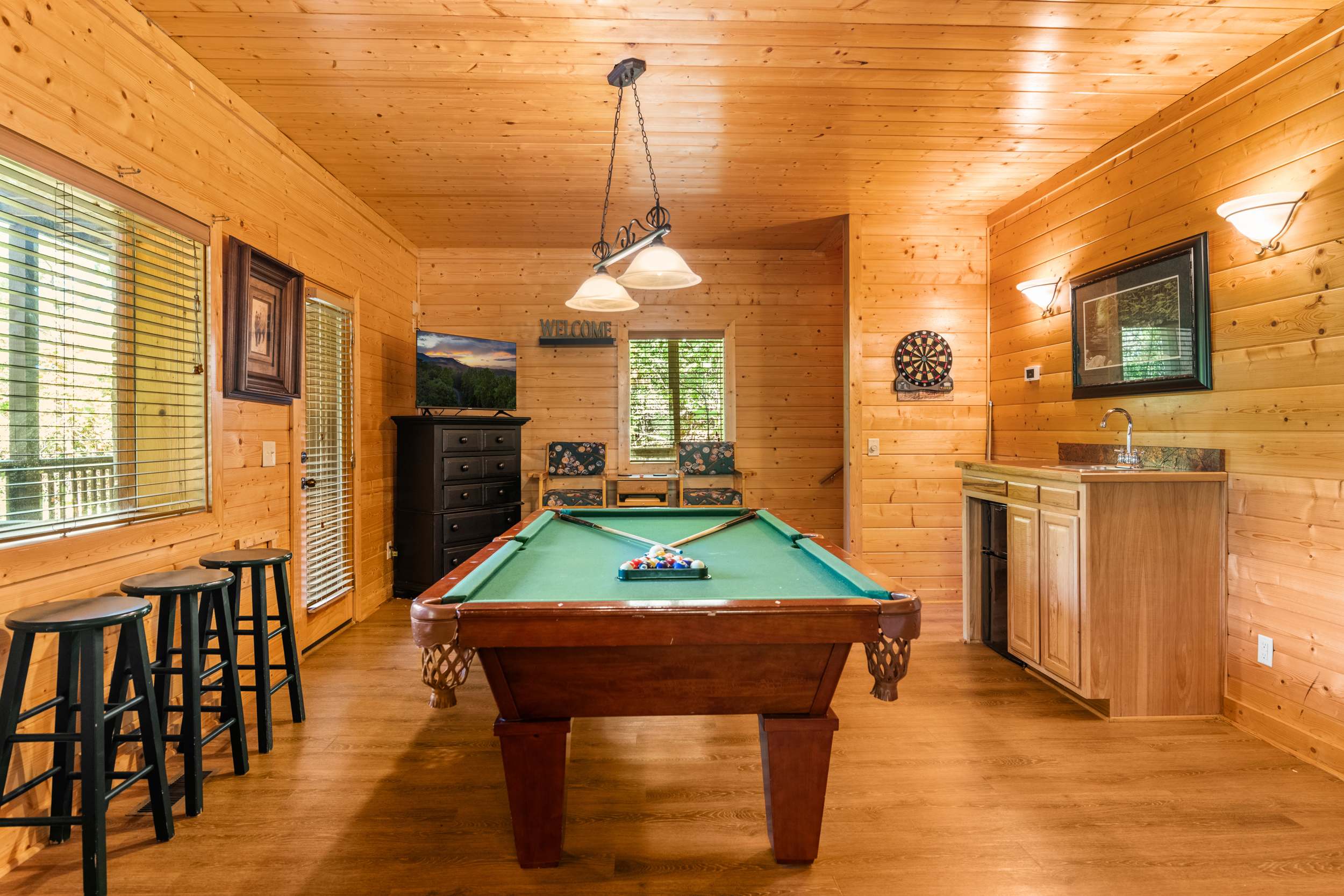 • Game room with pool table, darts, smart TV, and a mini-golf area (putt-putt clubs provided; see Important Things to Note)