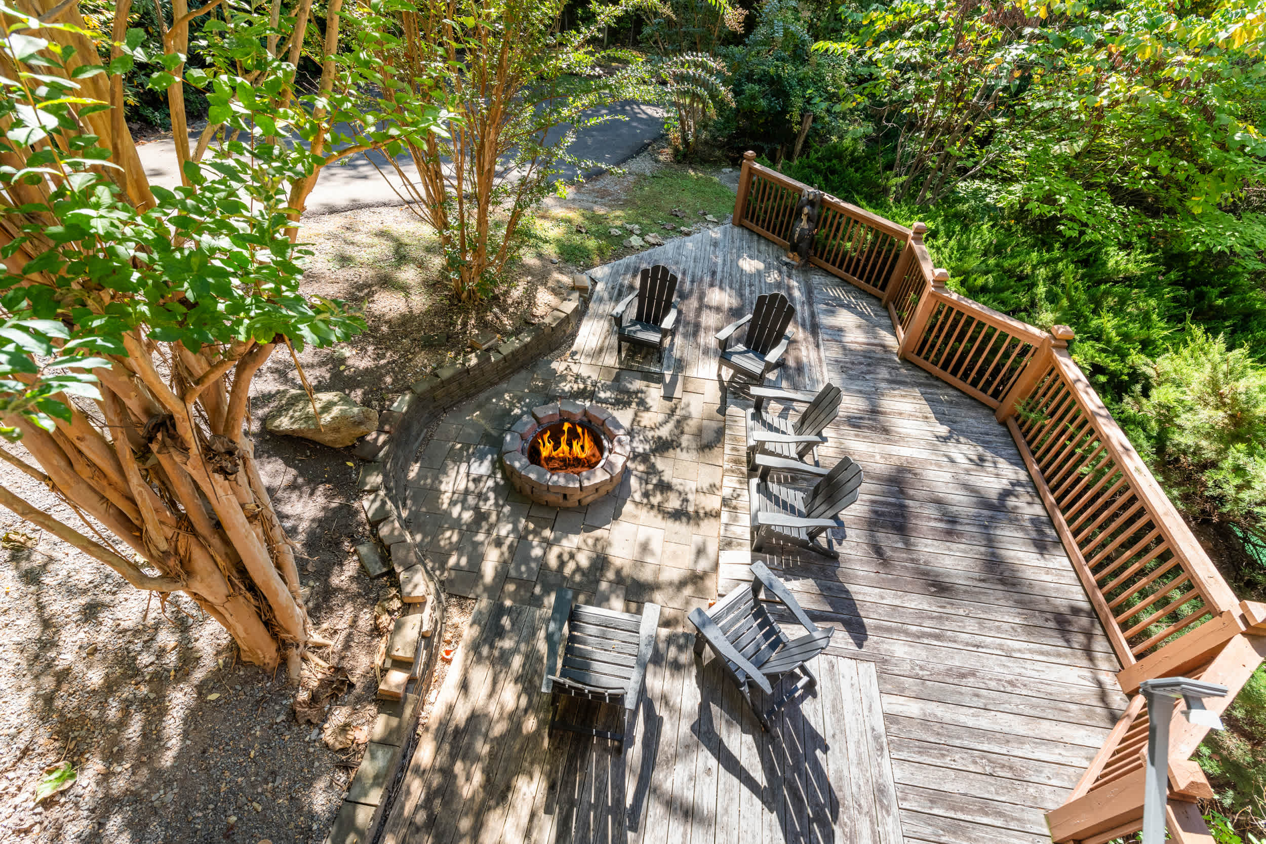 • Outdoor living: multi-level decks with ceiling fans, outdoor dining, BBQ grill, fire pit, and seating