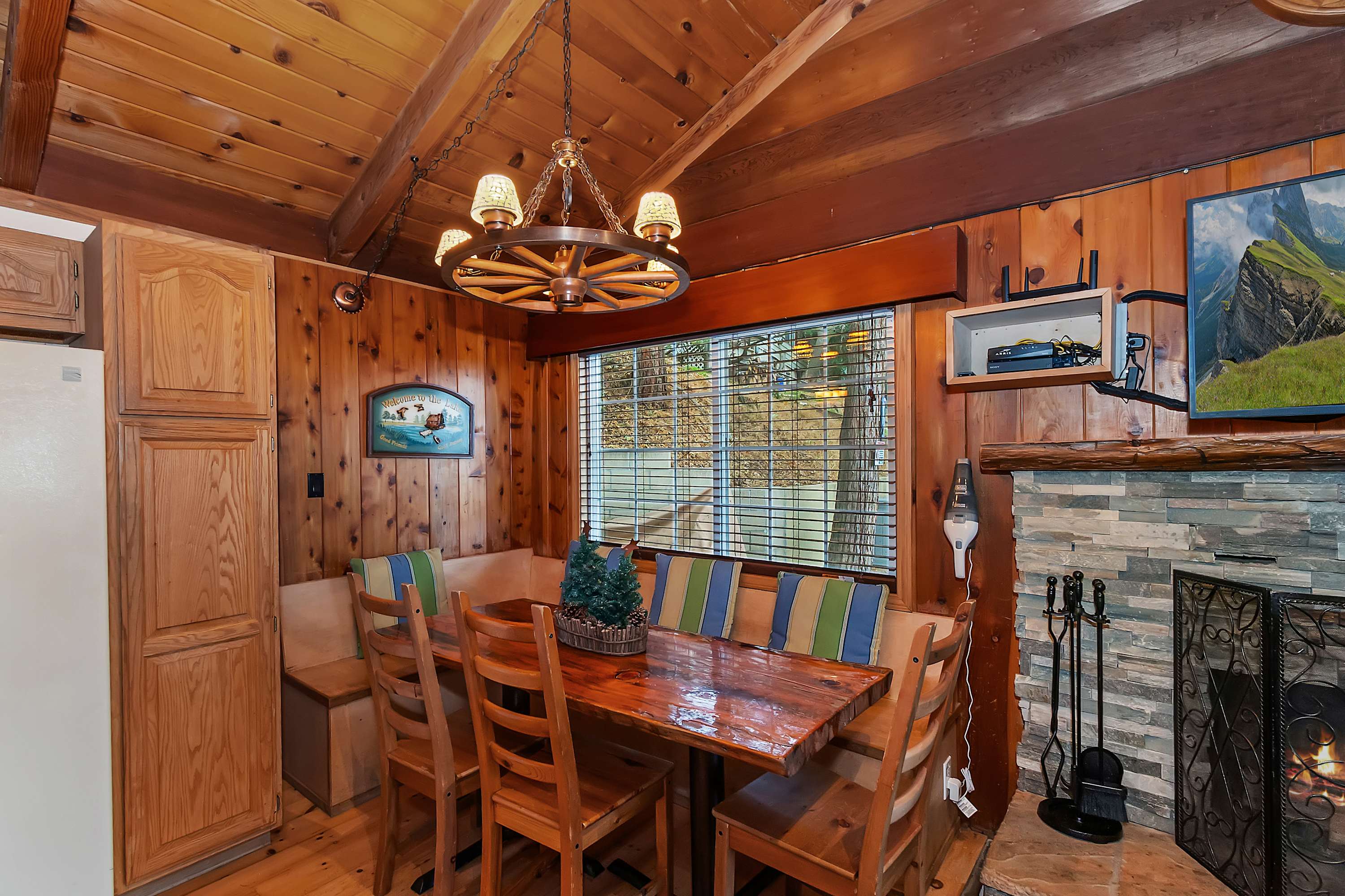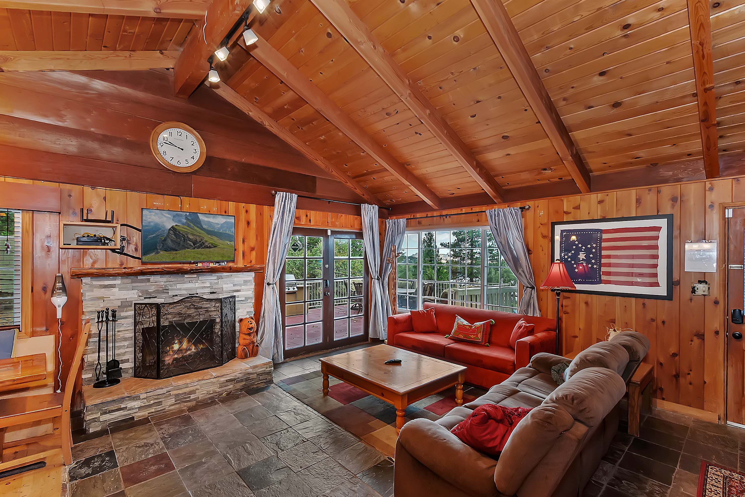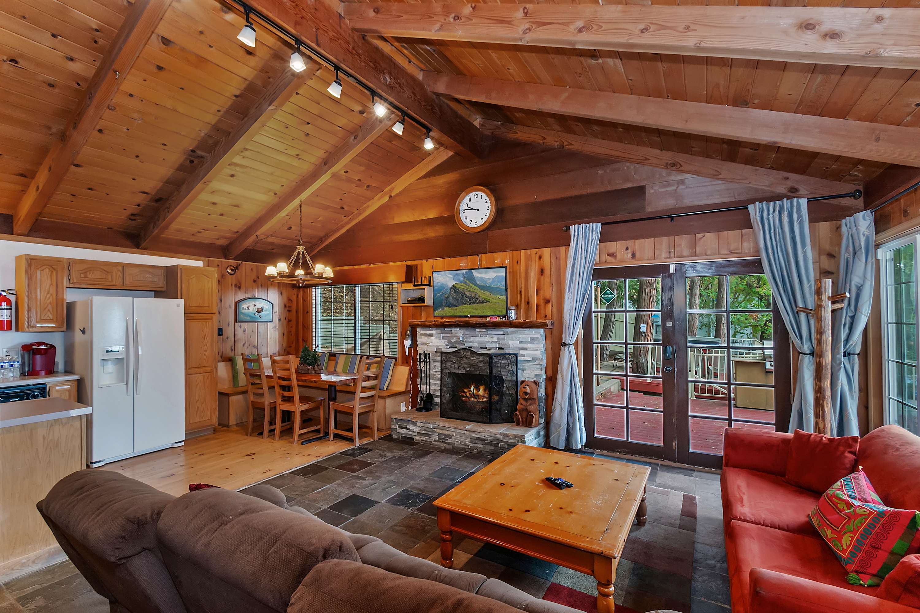 The moment you arrive, you’ll discover an inviting open floor plan filled with natural light from walls of windows that frame the stunning scenery. The spacious living room welcomes you with two plush sofas—one with recliners on each end—perfect for movie nights by the warm glow of the wood-burning fireplace. Gather at the dining table for six to enjoy meals made in the well-equipped kitchen, complete with a Keurig and convenient USB ports for easily charging all your devices.