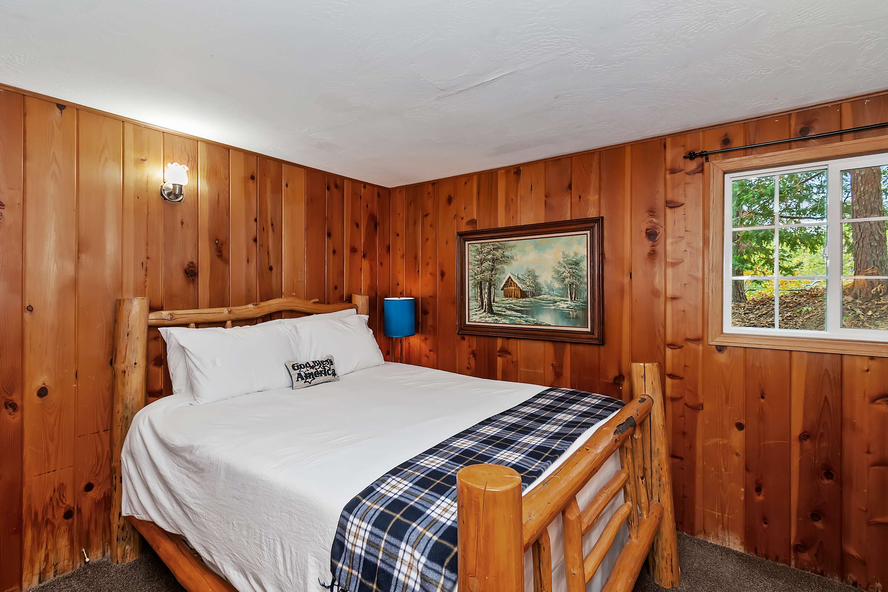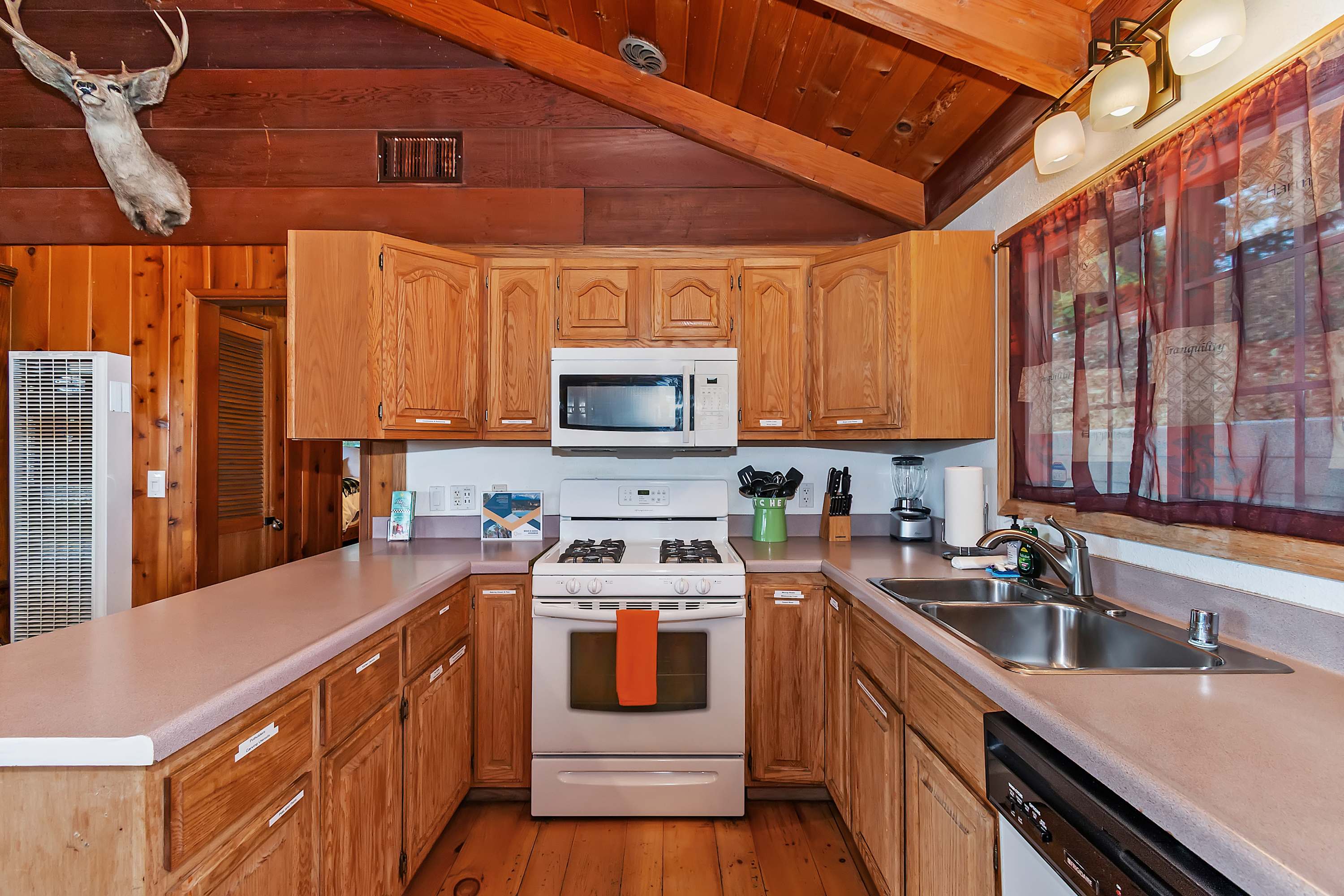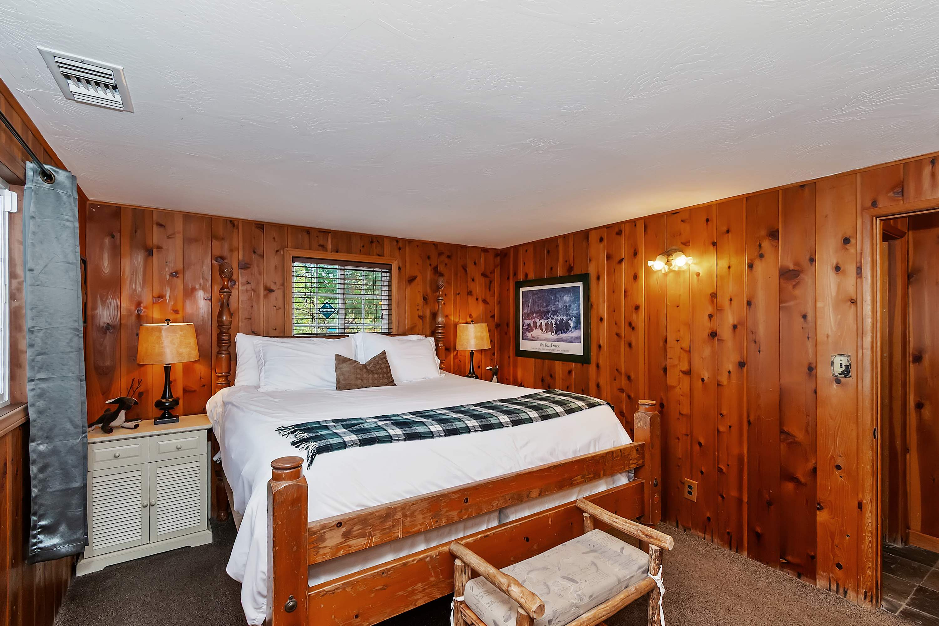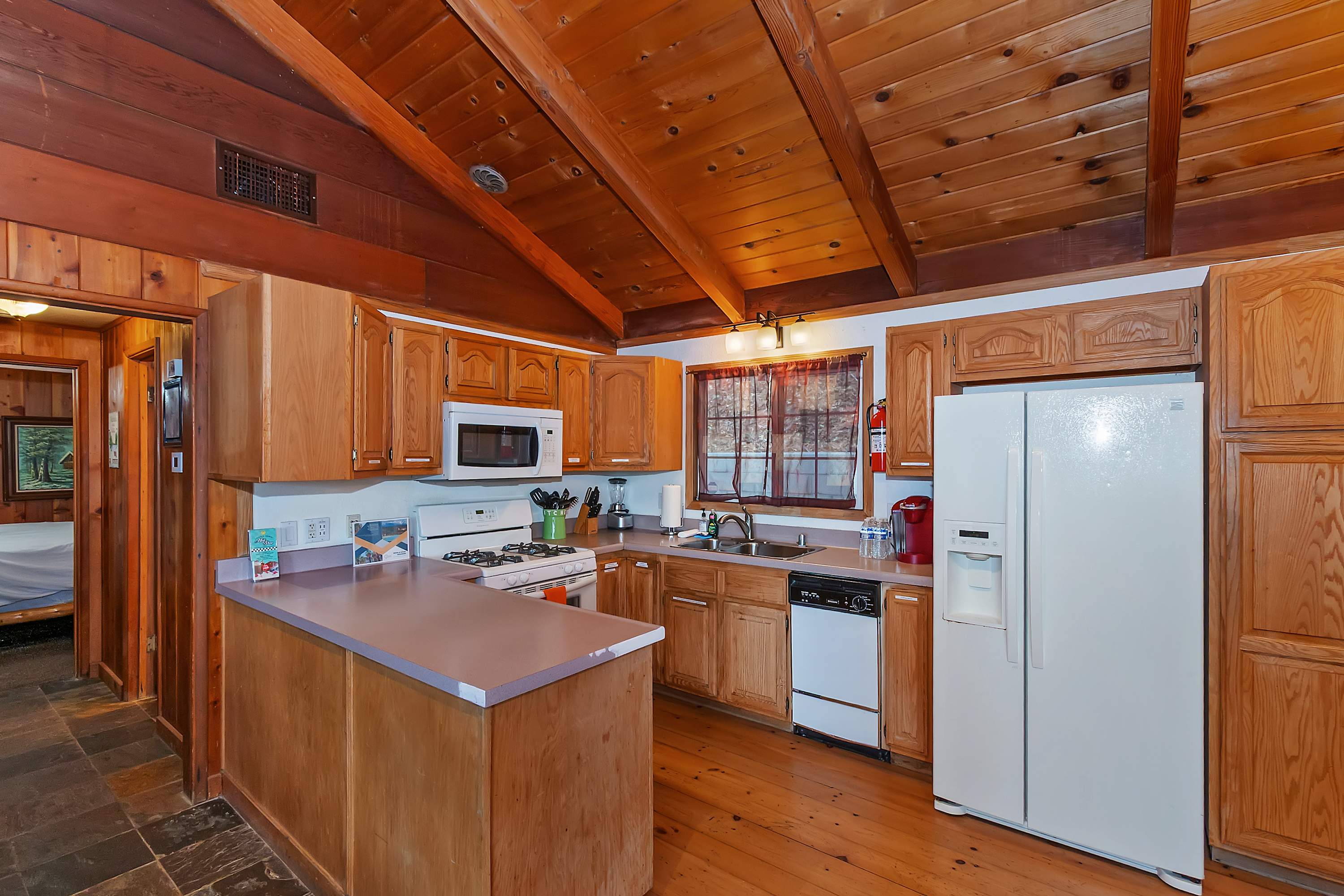 The moment you arrive, you’ll discover an inviting open floor plan filled with natural light from walls of windows that frame the stunning scenery. The spacious living room welcomes you with two plush sofas—one with recliners on each end—perfect for movie nights by the warm glow of the wood-burning fireplace. Gather at the dining table for six to enjoy meals made in the well-equipped kitchen, complete with a Keurig and convenient USB ports for easily charging all your devices.