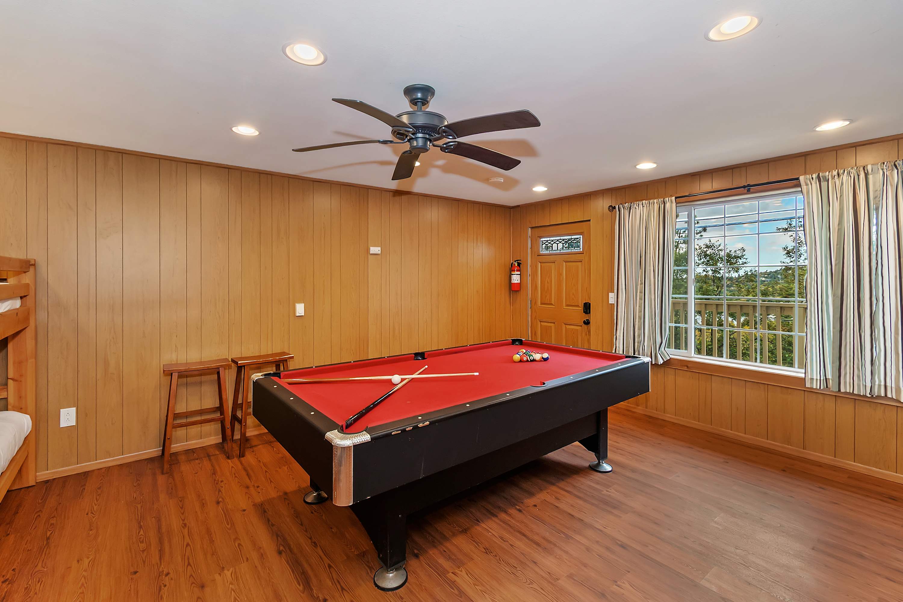 The game room is on a separate floor with no indoor connection to the main house. Guests using the game room must go outside and up a set of stairs to access the main house bathroom.
