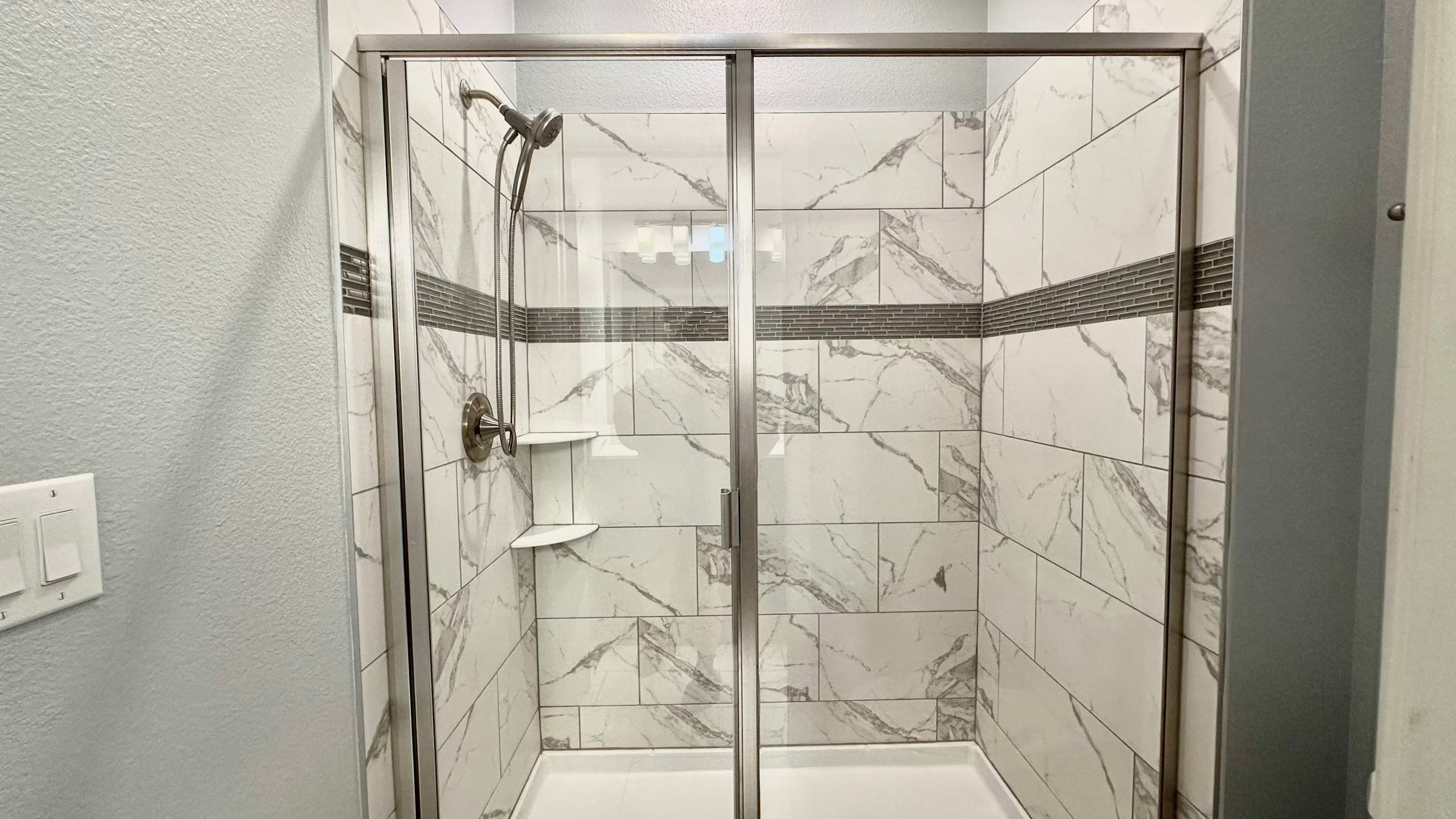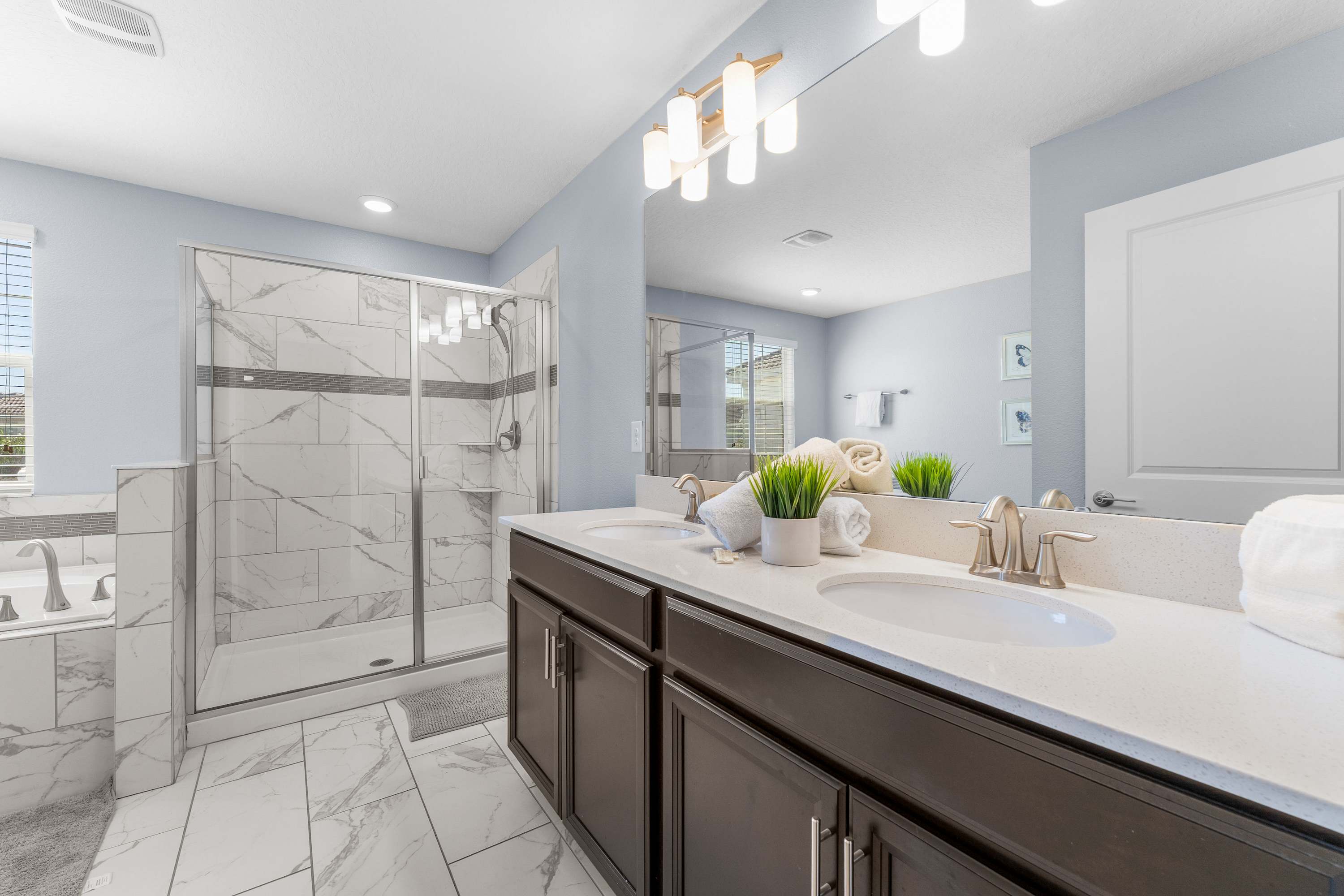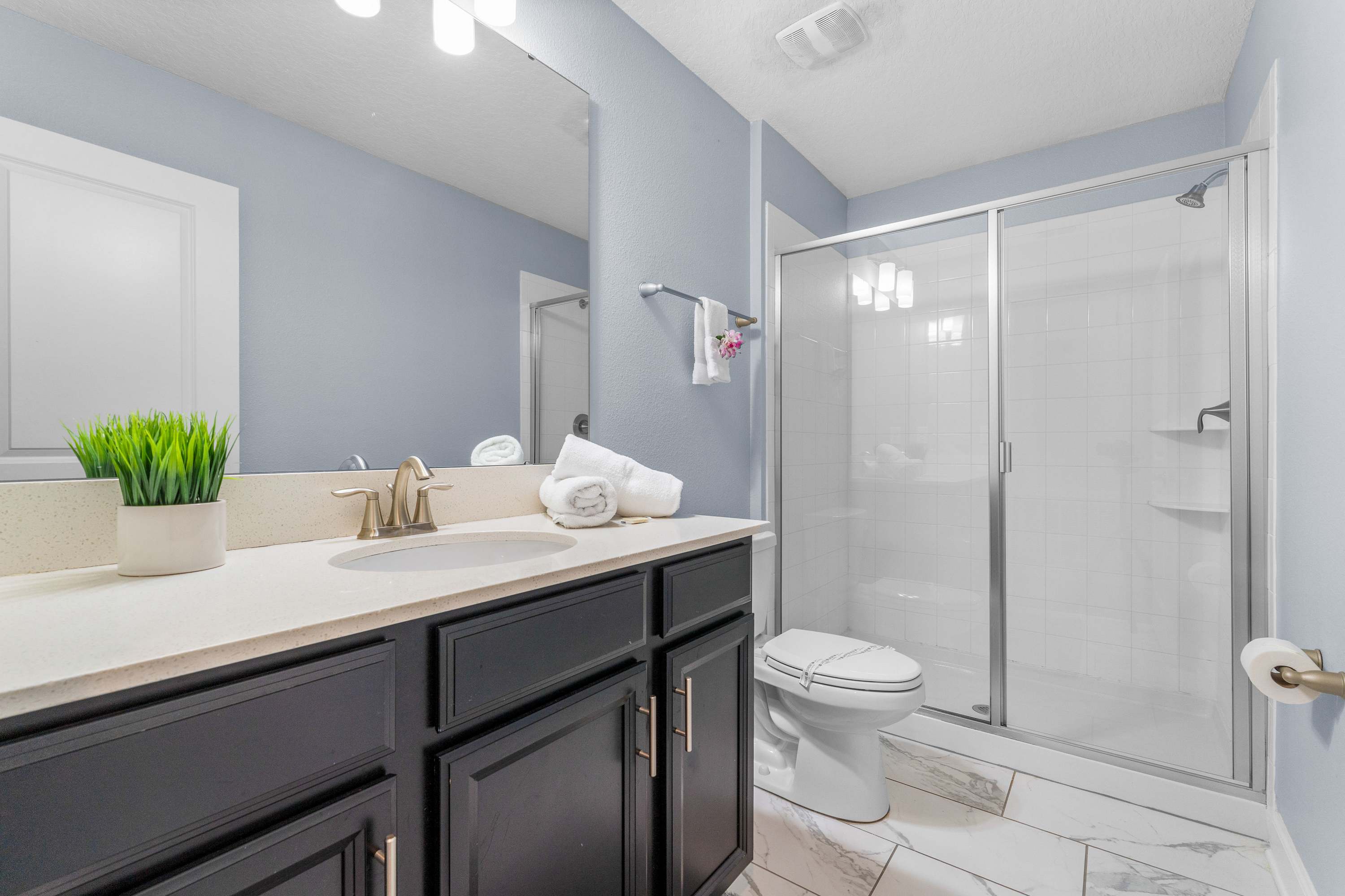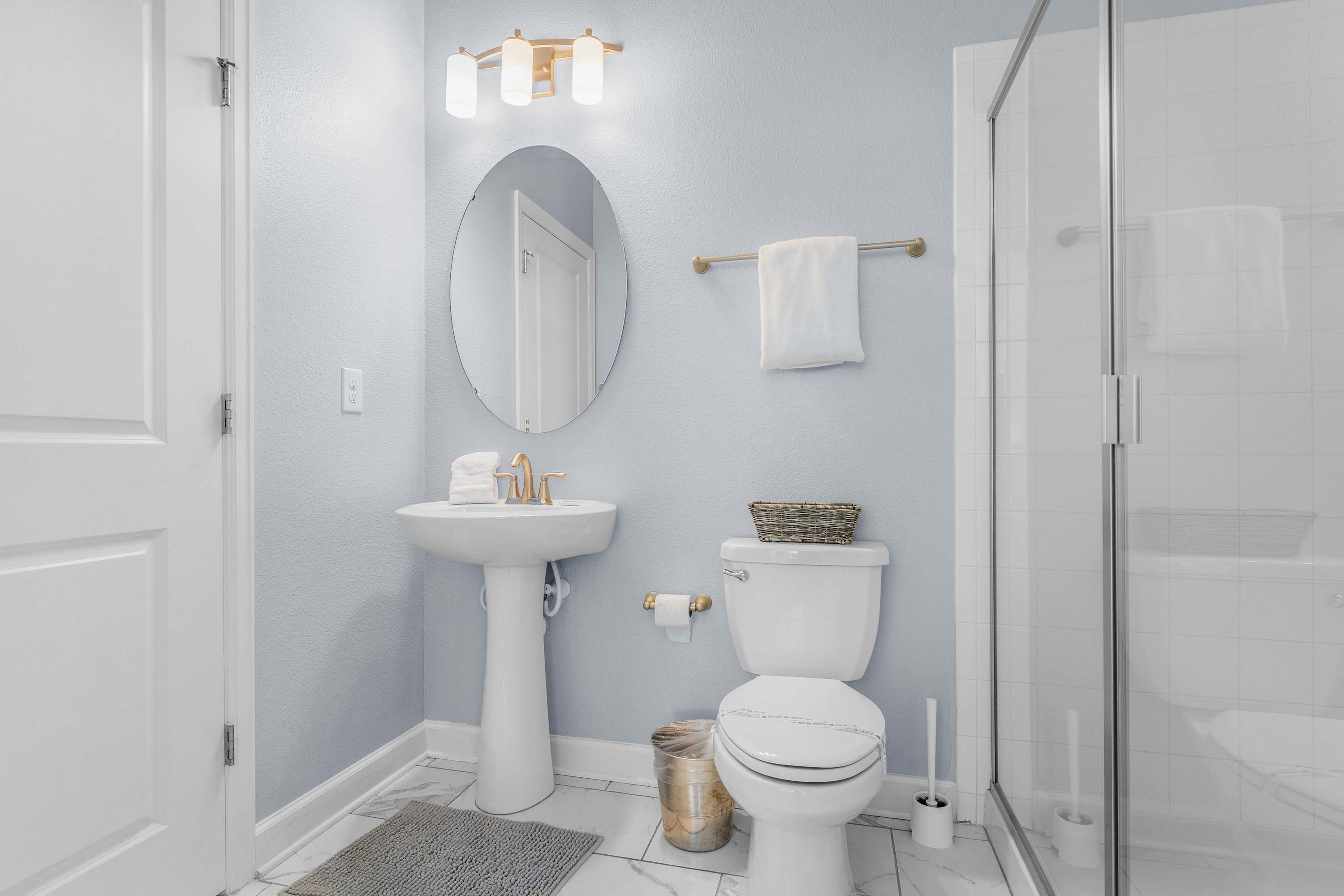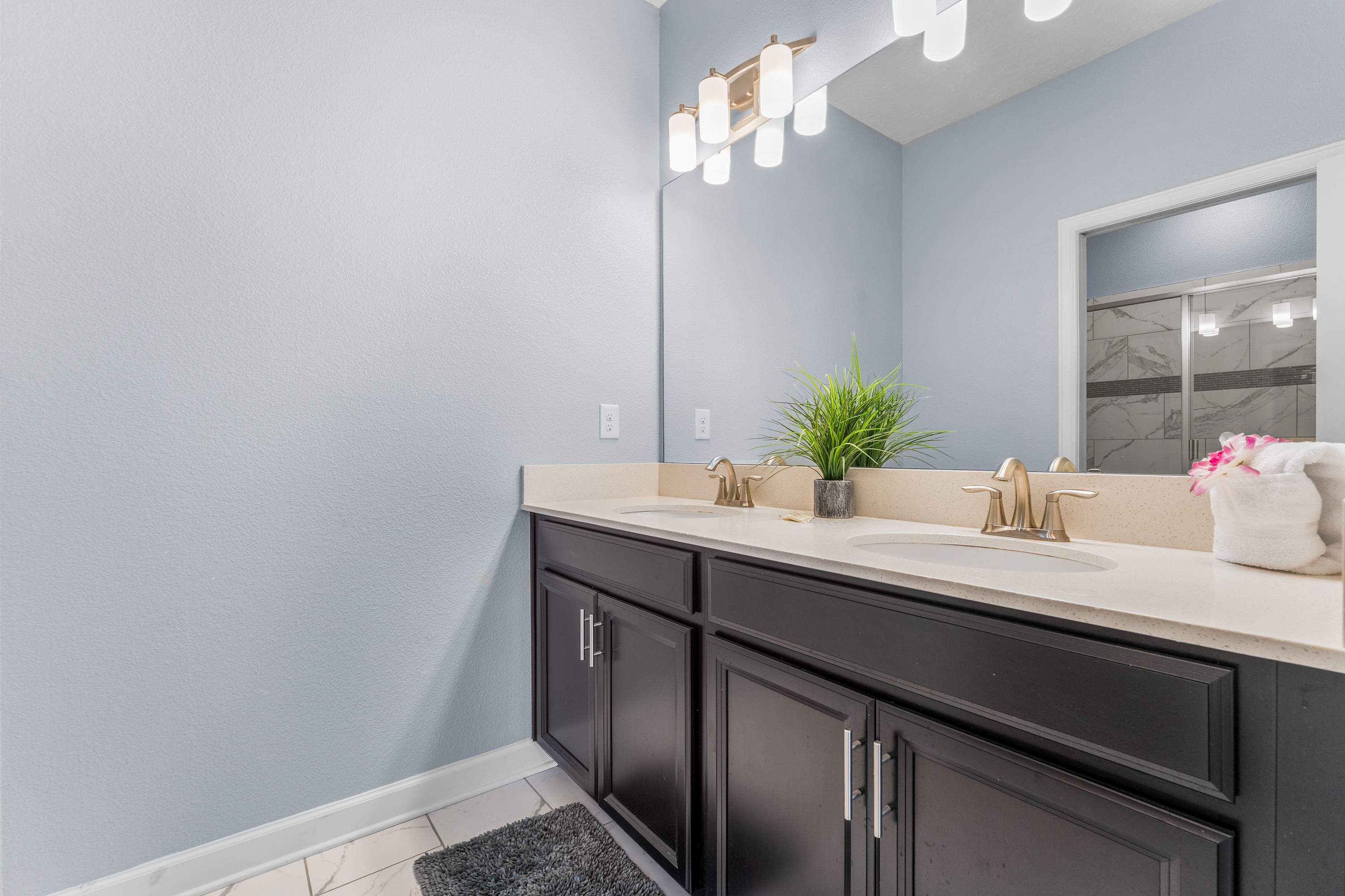 This home also includes 2 additional full guest bathrooms, one with a pedestal sink and a walk-in shower, another with an oversized single vanity and a walk-in shower.