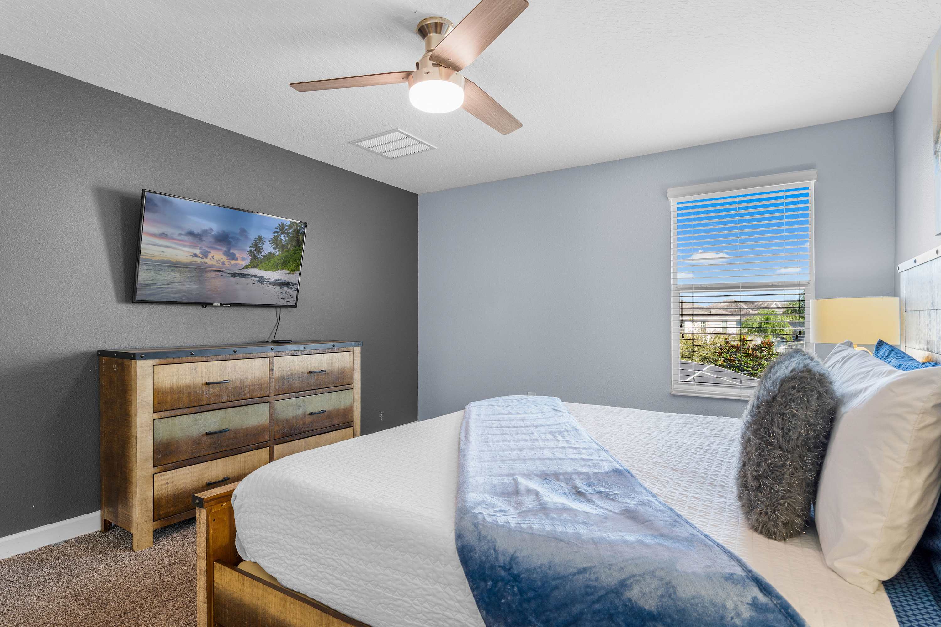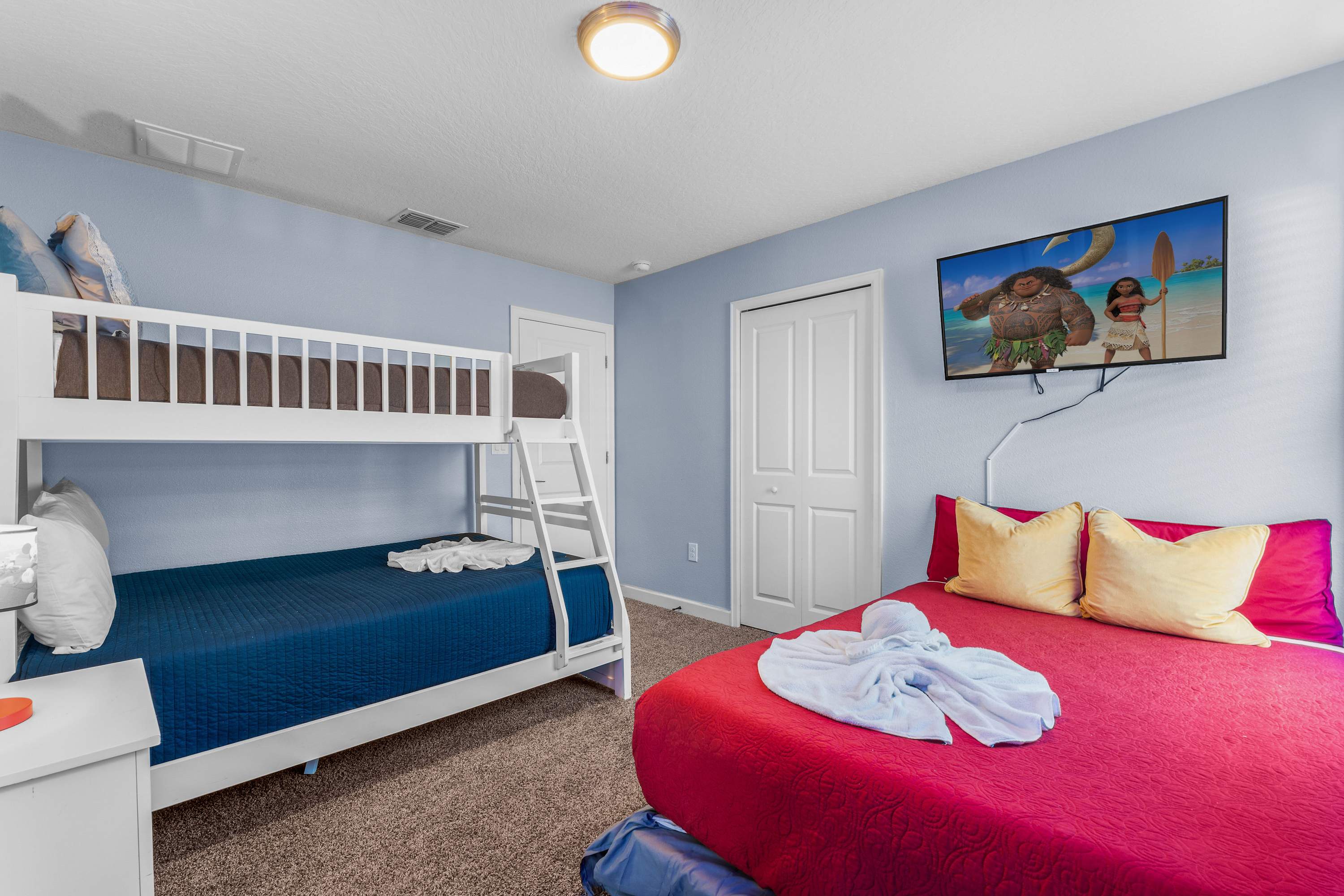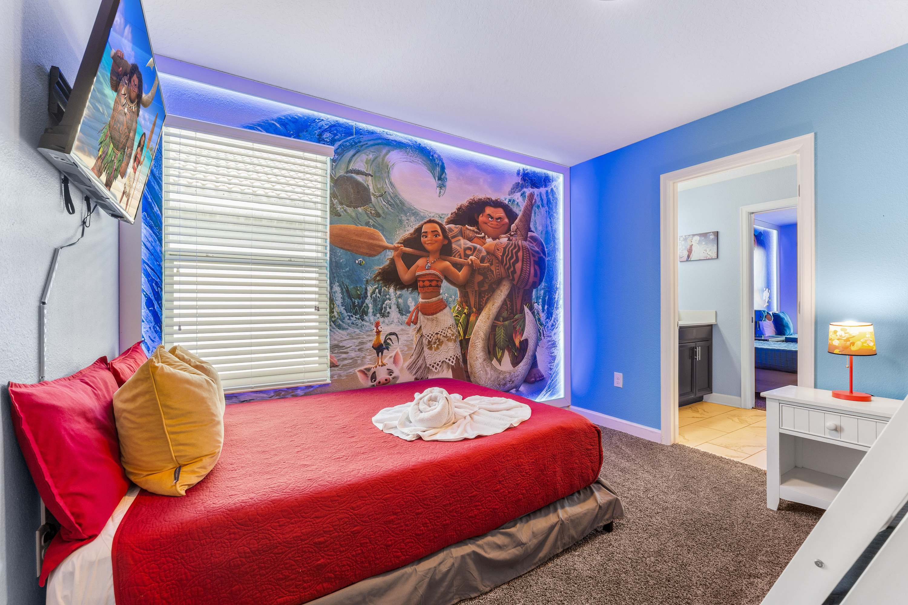 Bedroom #5 is Moana themed and includes a full size bed, twin-over-full bunk beds, a smart TV, and a Jack-and-Jill bathroom shared with bedroom #4.