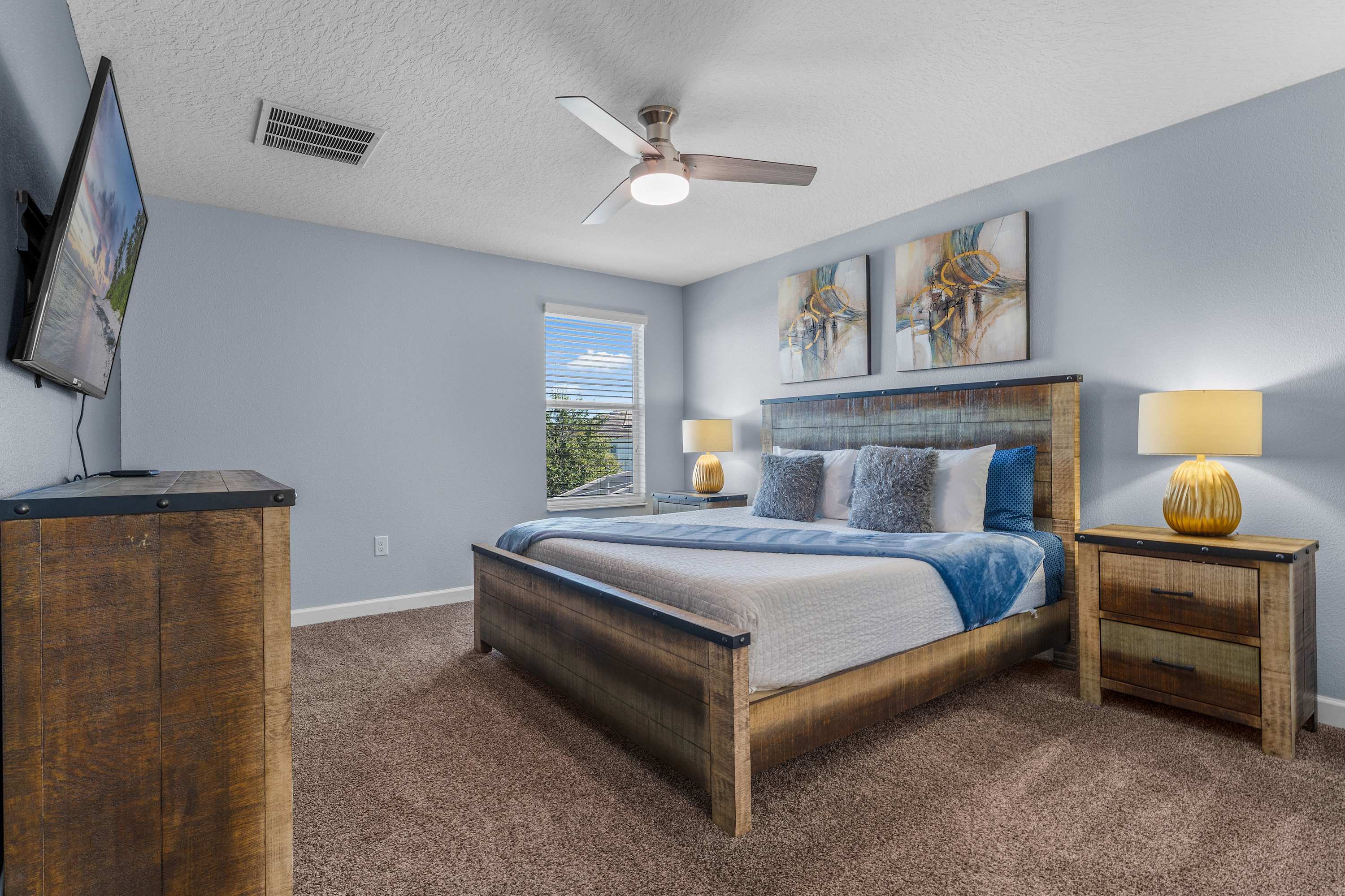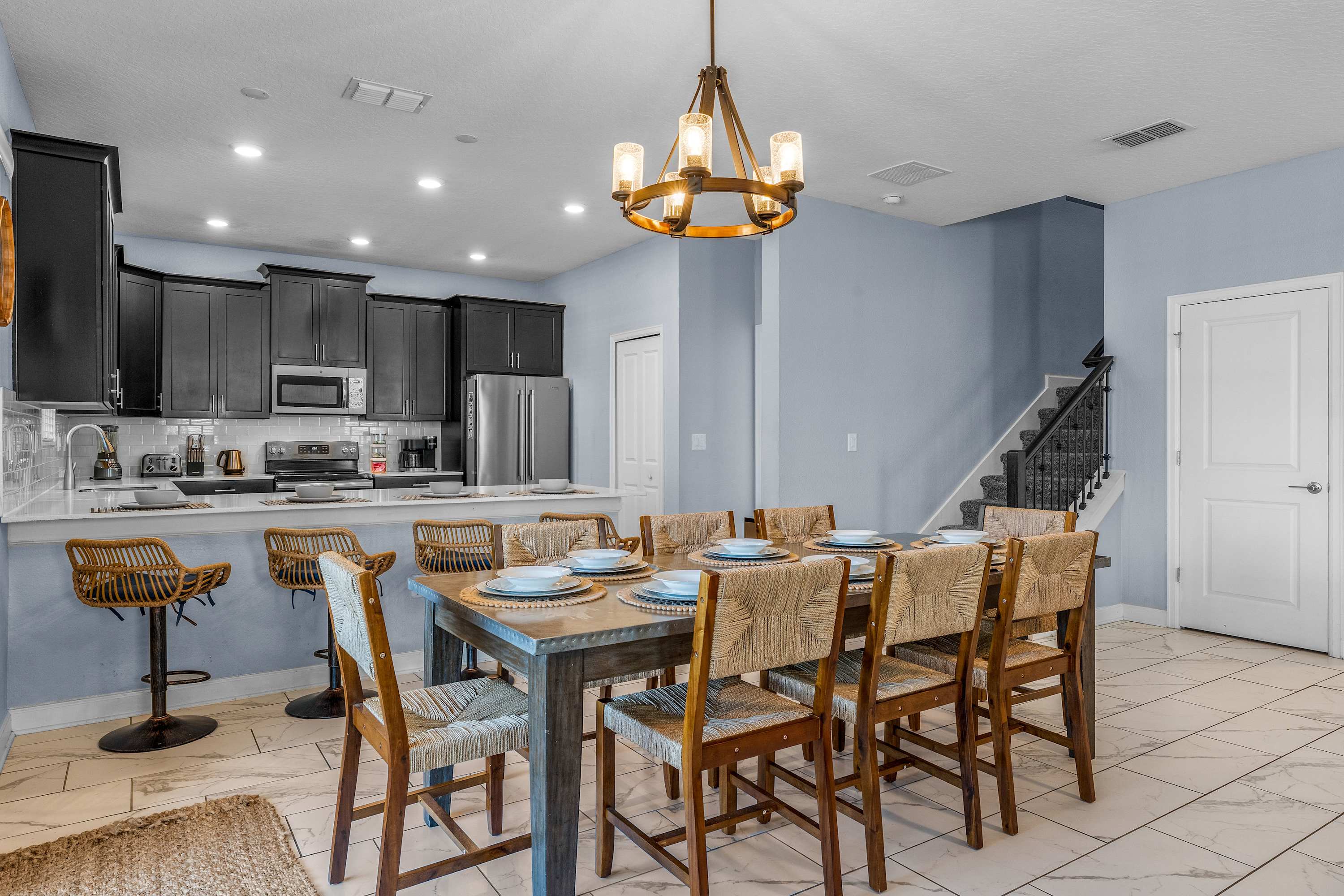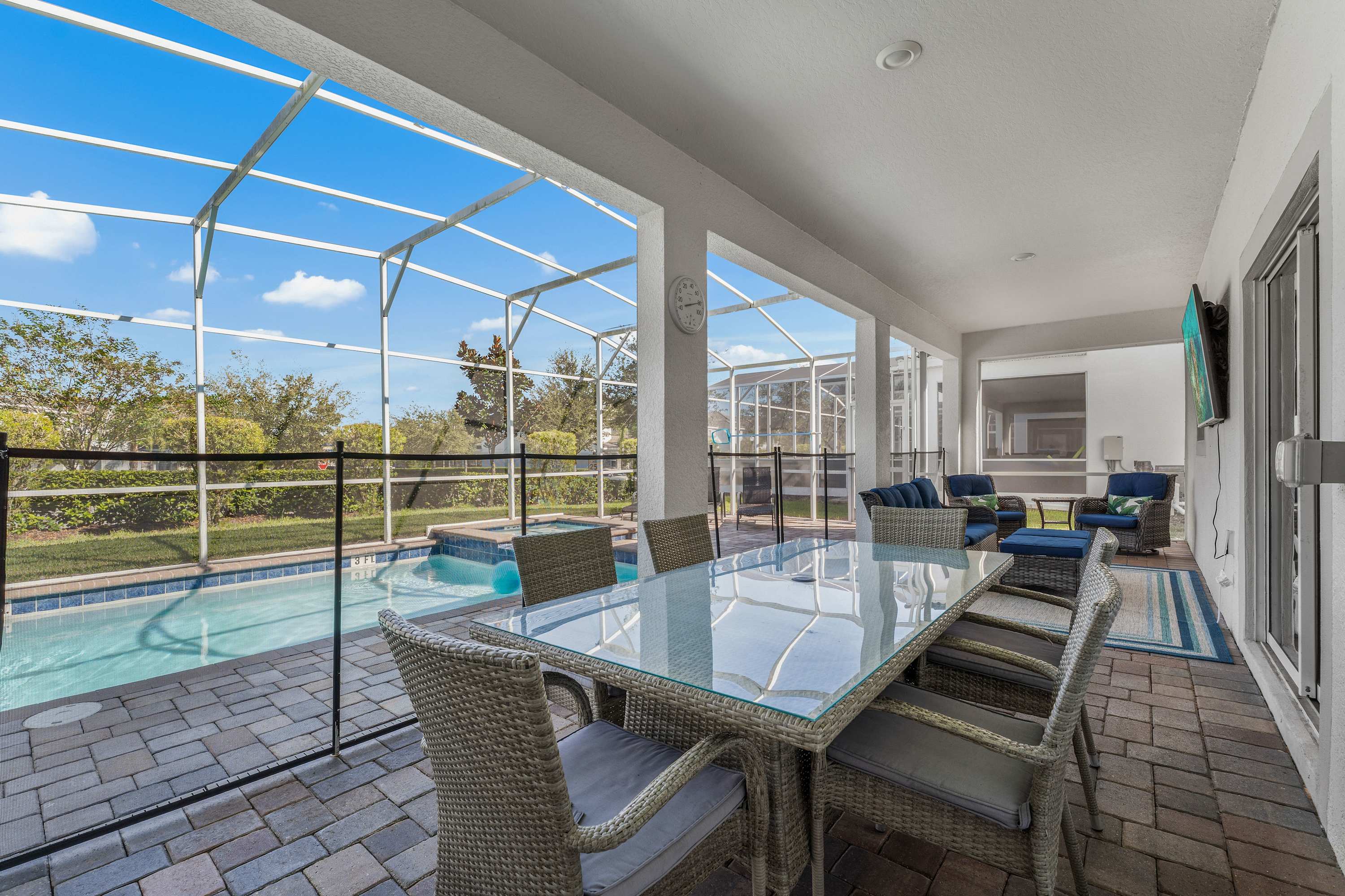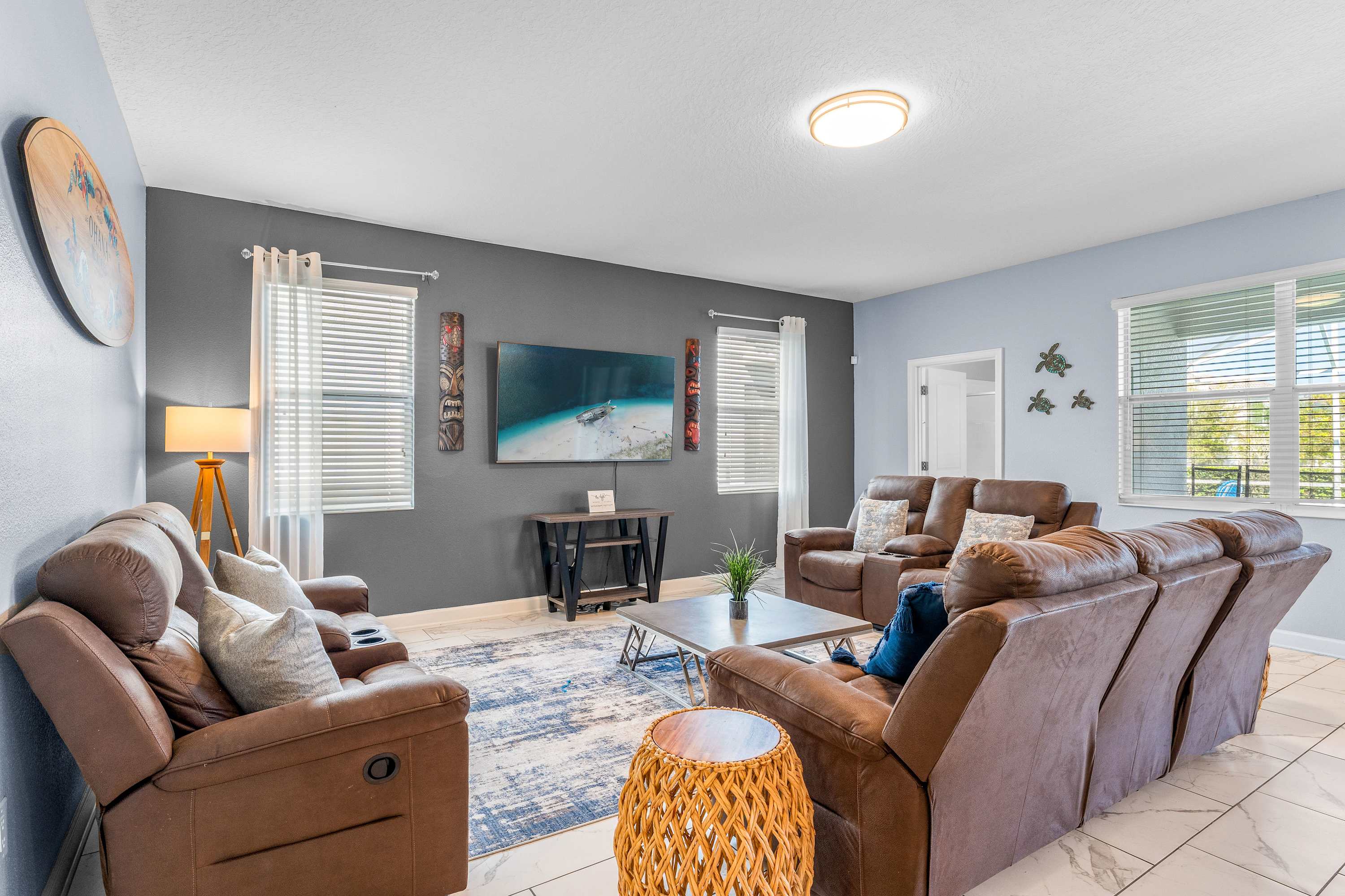 Upstairs, the loft offers an inviting second living area with a Smart TV and a cozy couch with a chaise — perfect for movie nights or quiet reading. When you’re ready for sunshine, slide open the double doors and step out to your private lanai. Lounge by the pool, soak in the spa, or enjoy drinks under the shaded overhang with seating for six. With a couch, two chairs, and three chaise loungers, this space was made for both relaxation and connection. Your dream vacation starts the moment you arrive.