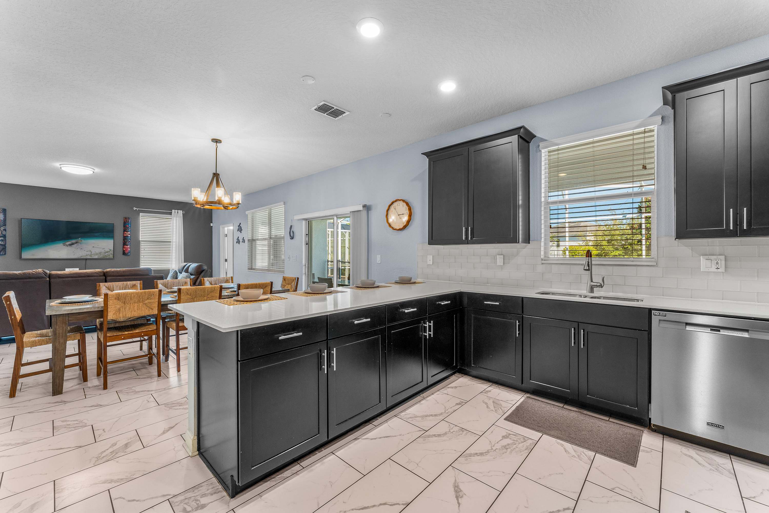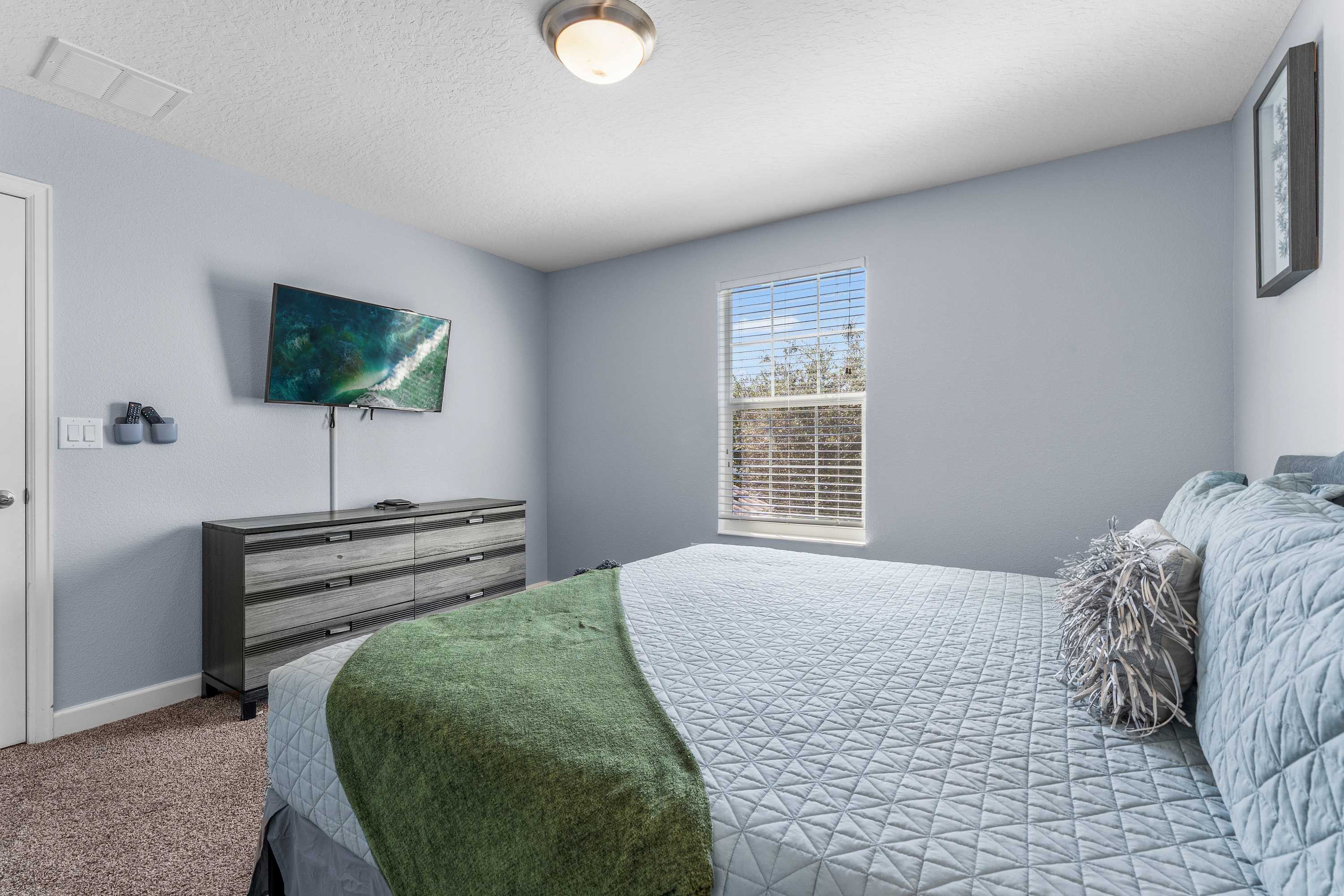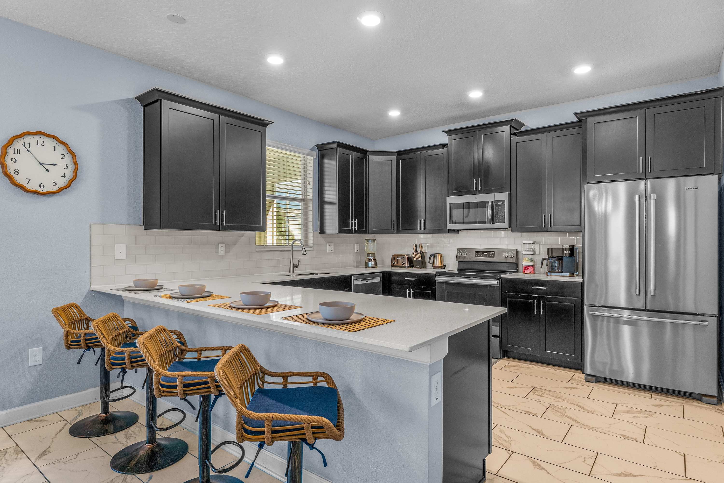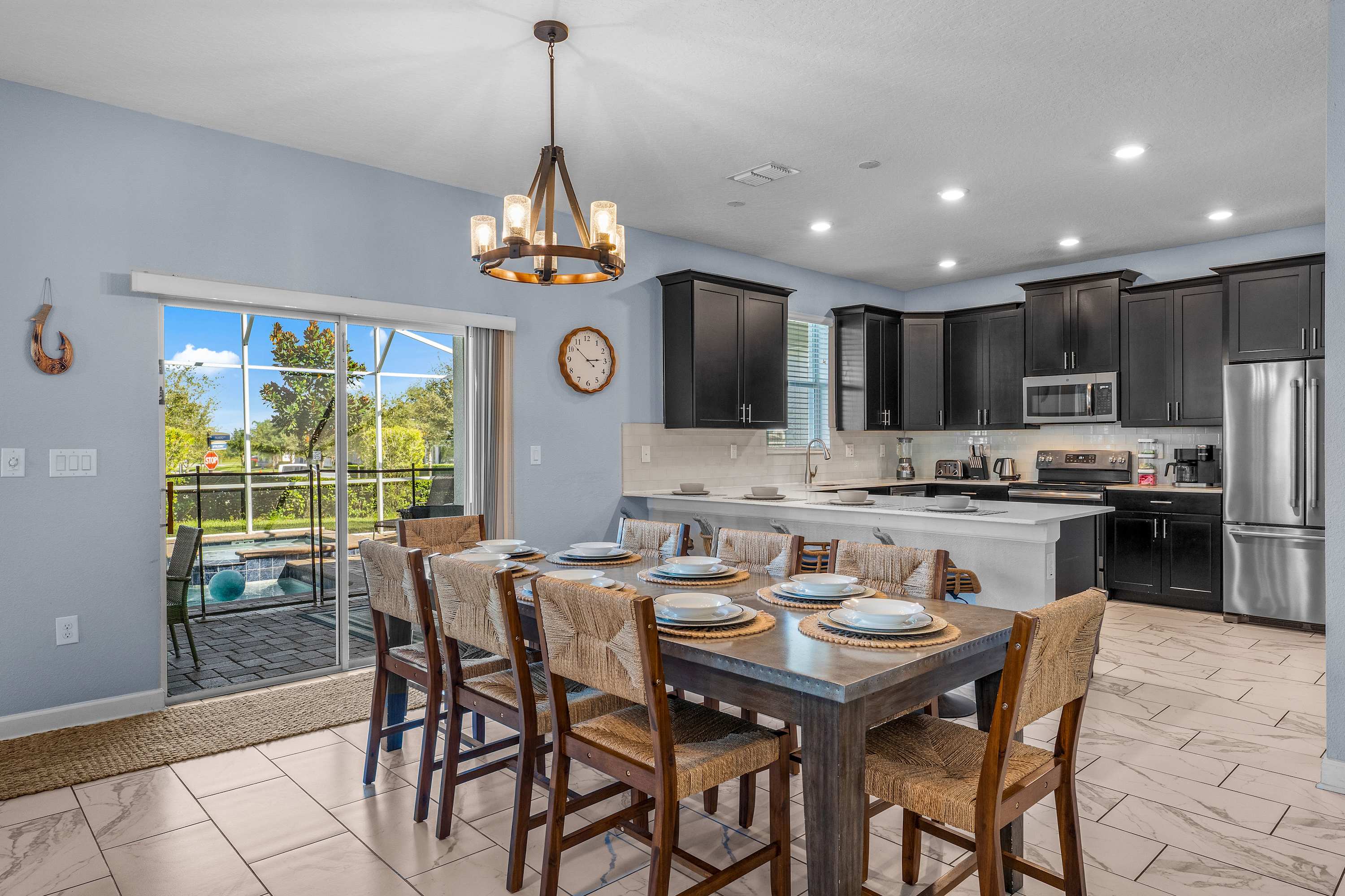 Upstairs, the loft offers an inviting second living area with a Smart TV and a cozy couch with a chaise — perfect for movie nights or quiet reading. When you’re ready for sunshine, slide open the double doors and step out to your private lanai. Lounge by the pool, soak in the spa, or enjoy drinks under the shaded overhang with seating for six. With a couch, two chairs, and three chaise loungers, this space was made for both relaxation and connection. Your dream vacation starts the moment you arrive.