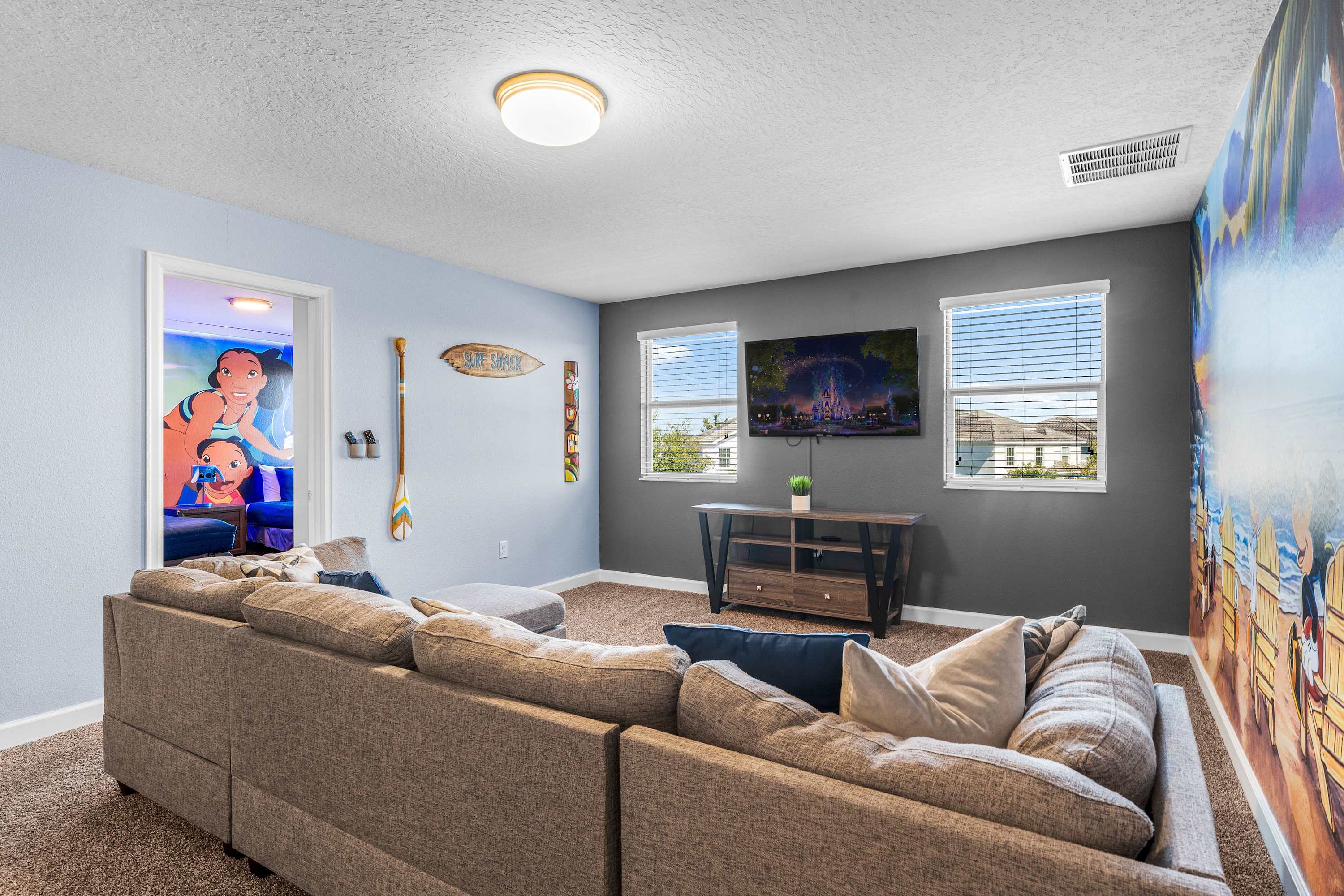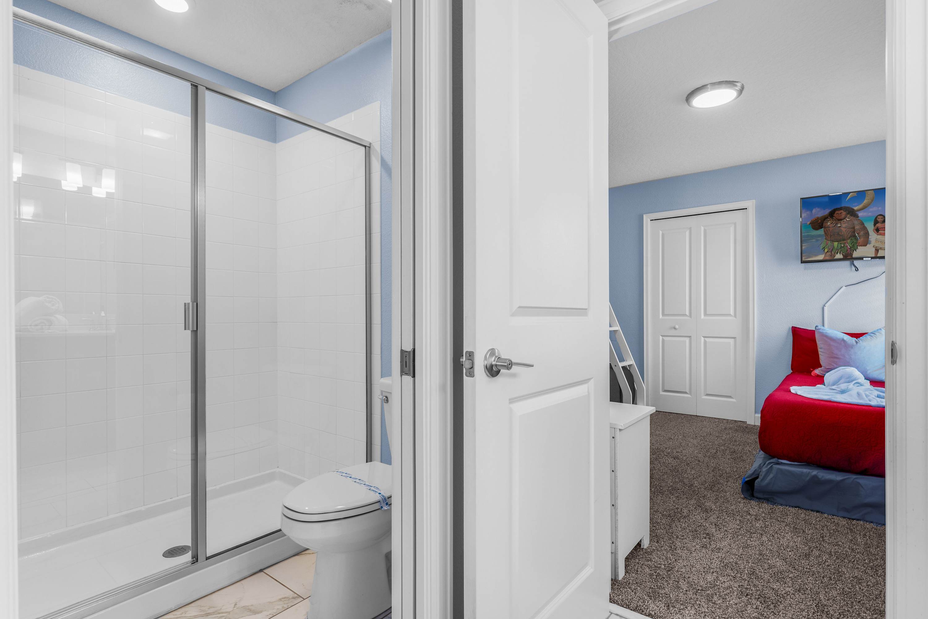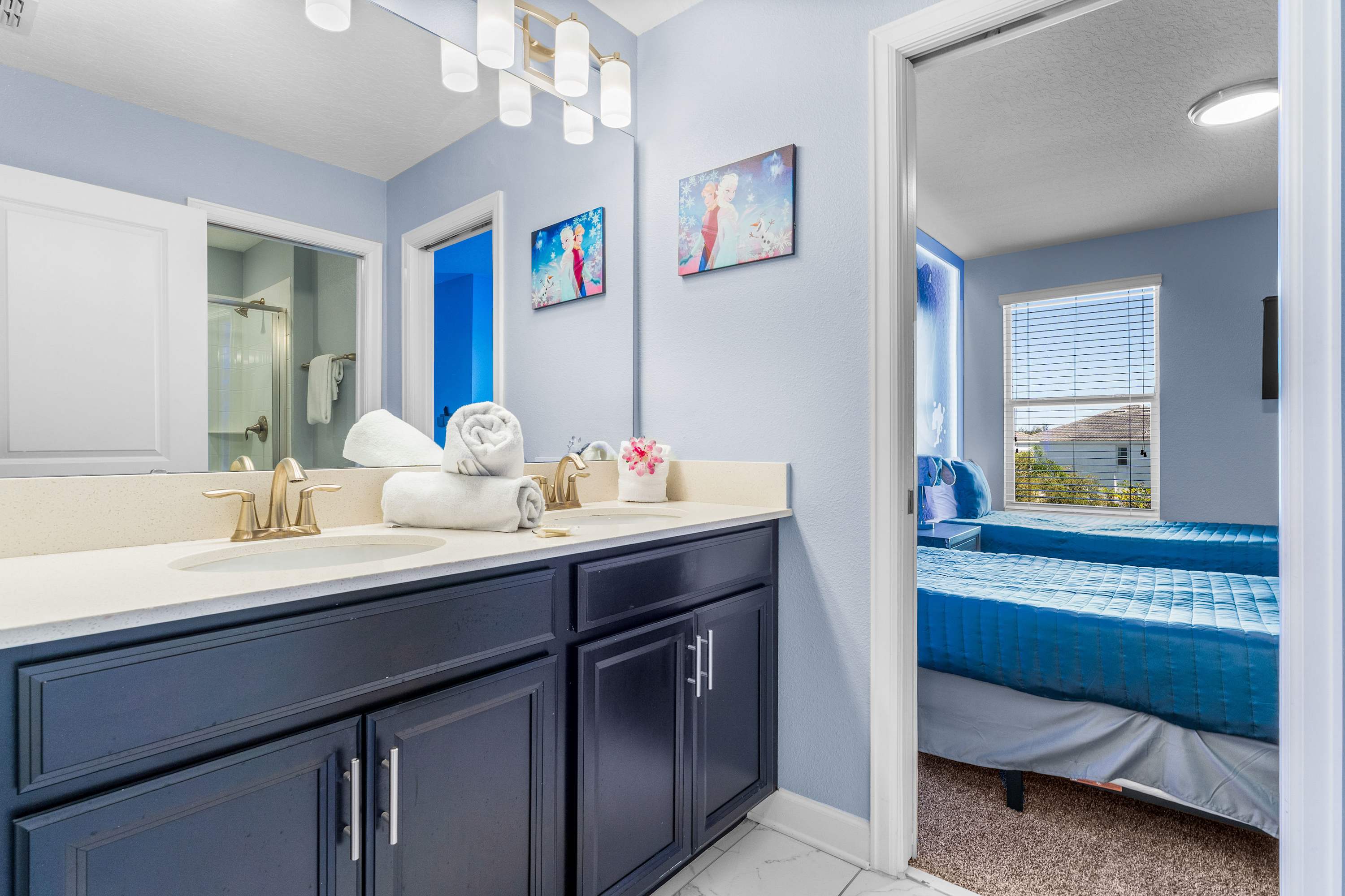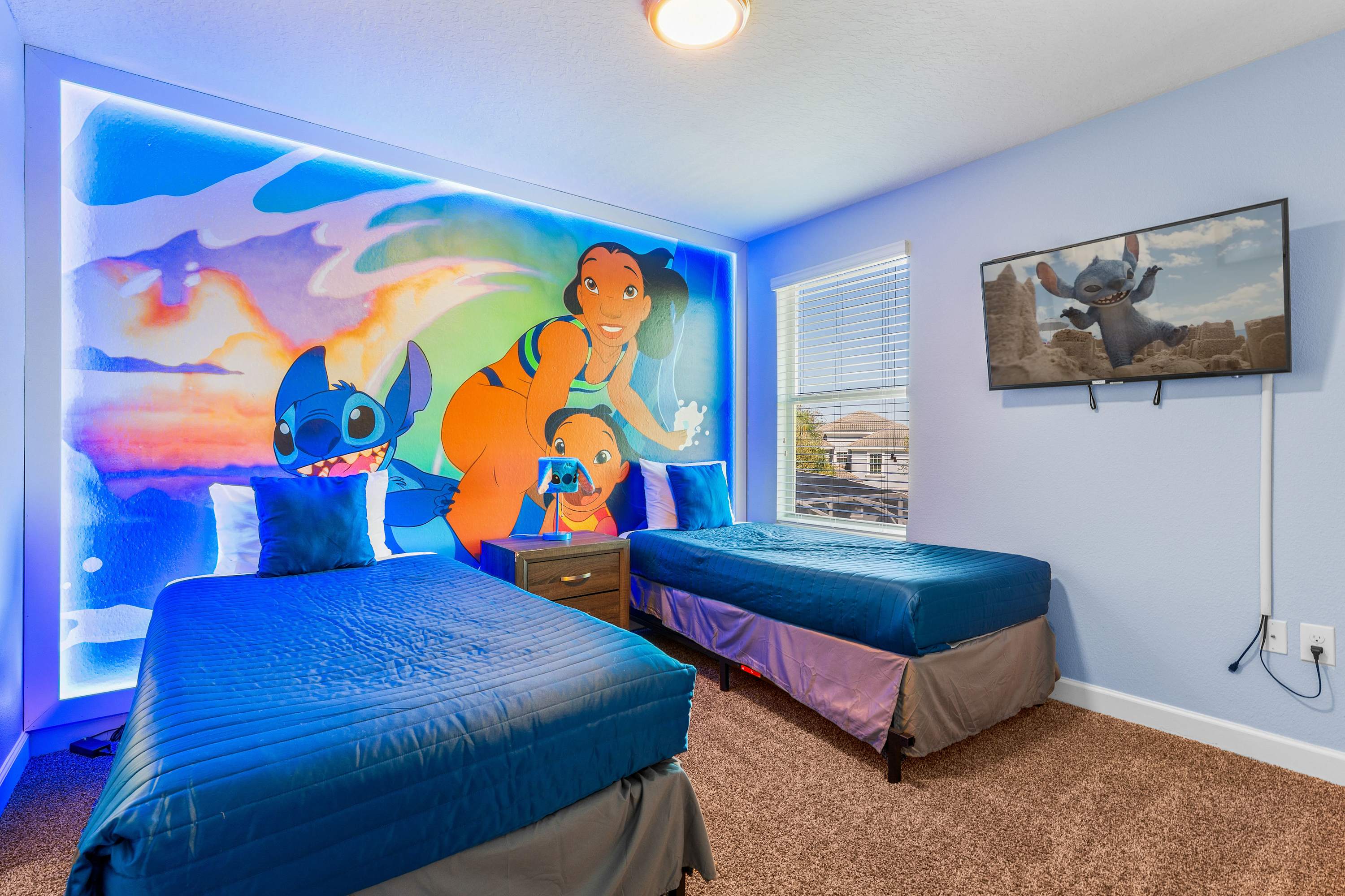 Bedroom #4 is Lilo & Stitch themed and includes 2 twin size beds, a smart tv, and a Jack-and-Jill bathroom with a single vanity and a walk-in shower.