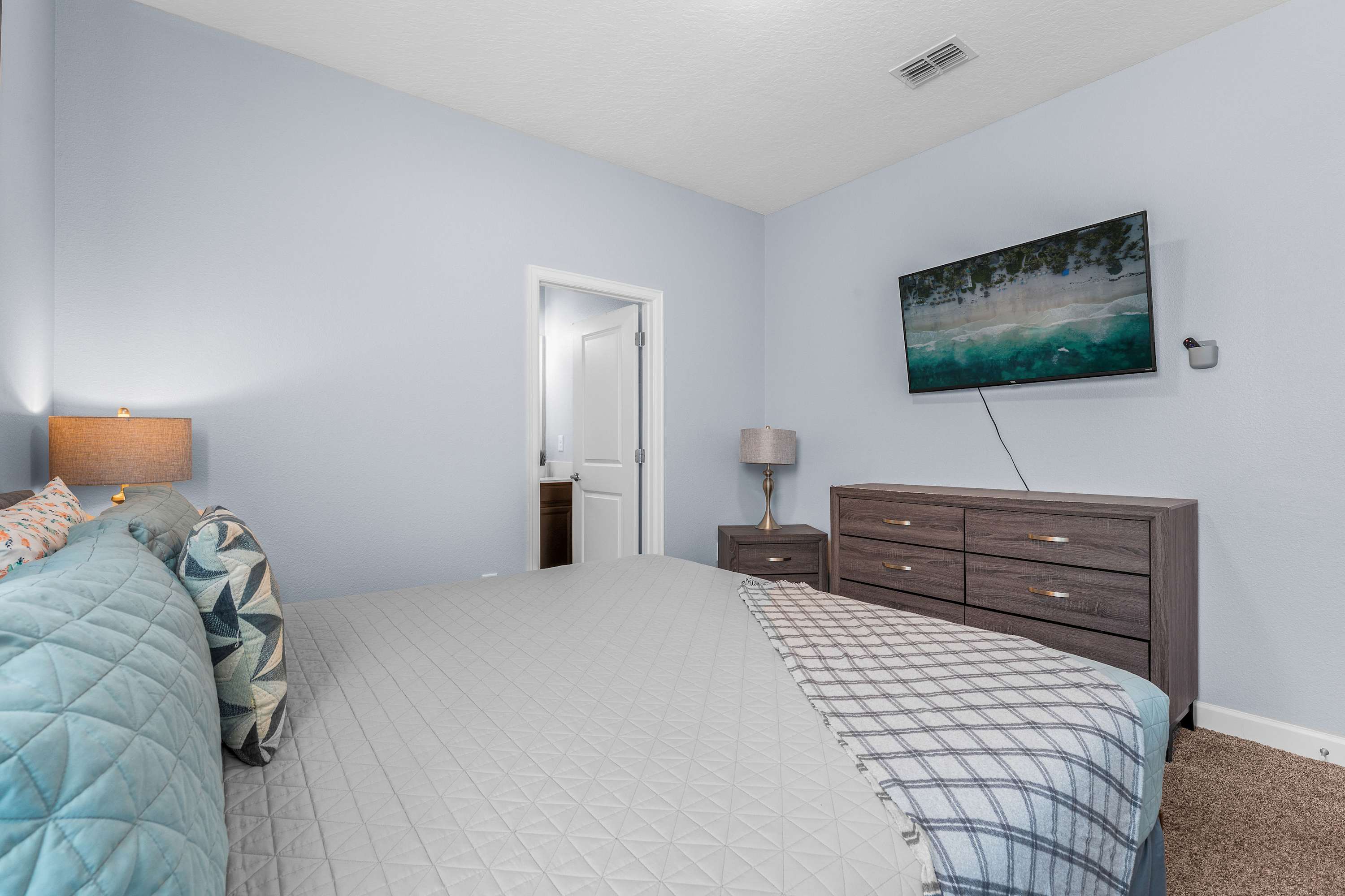 Bedroom #3 includes a king size bed, a smart TV, and an ensuite bathroom with a dual vanity, a soaking tub, and a walk-in shower.