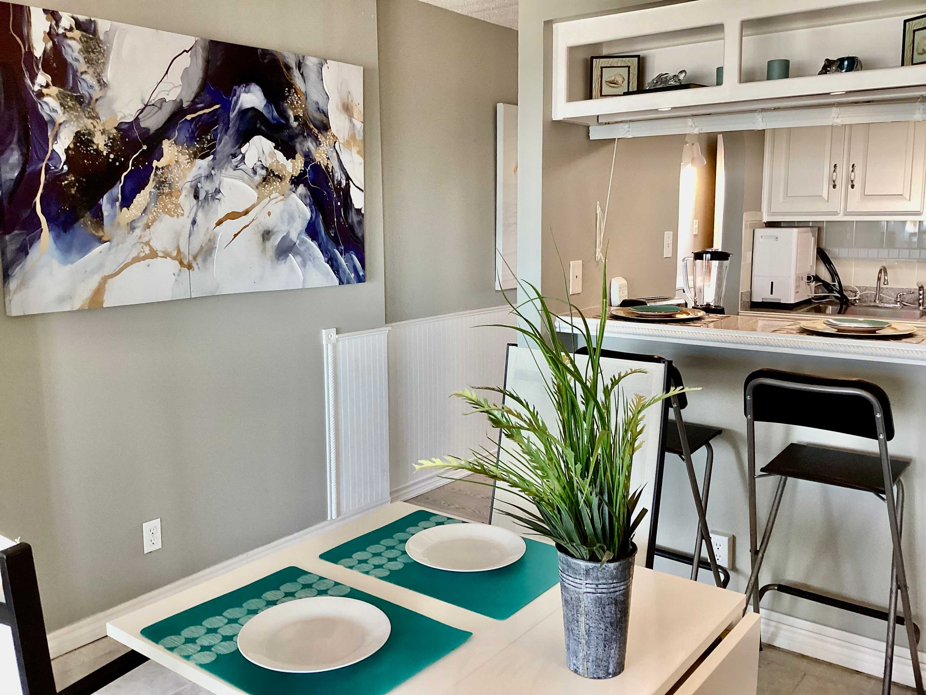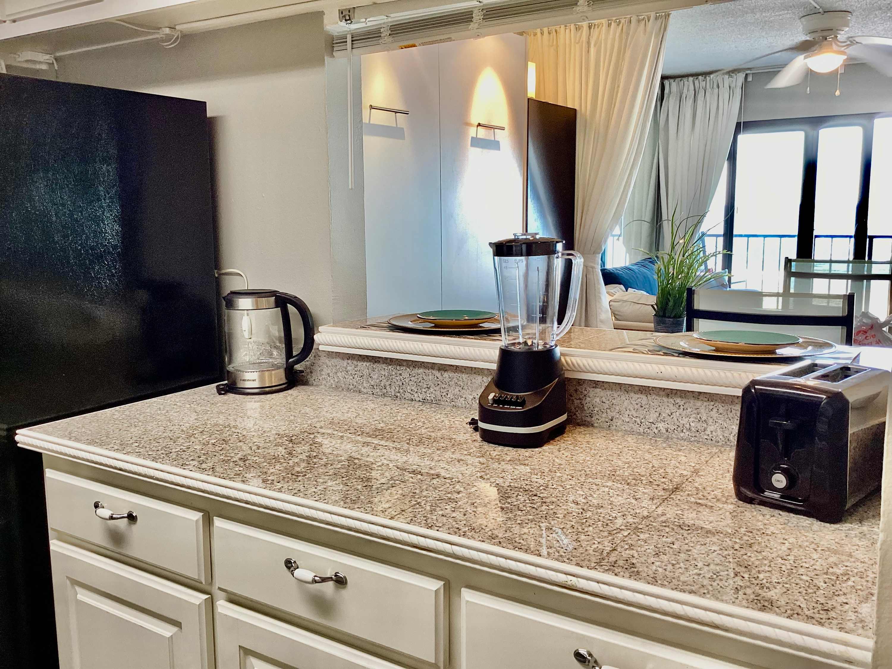 Step inside this bright studio and feel right at home. The open layout features a cozy sofa and cable TV—ideal for movie nights after a day in the sun. Share meals at the dining table for four or pull up a stool at the kitchen counter while dinner sizzles. The kitchen comes fully equipped with all the essentials and ample counter space for meal preparation. When the evening breeze calls, step out onto your private balcony and take in the endless Gulf views—the perfect spot to sip morning coffee or watch the sun melt into the horizon.