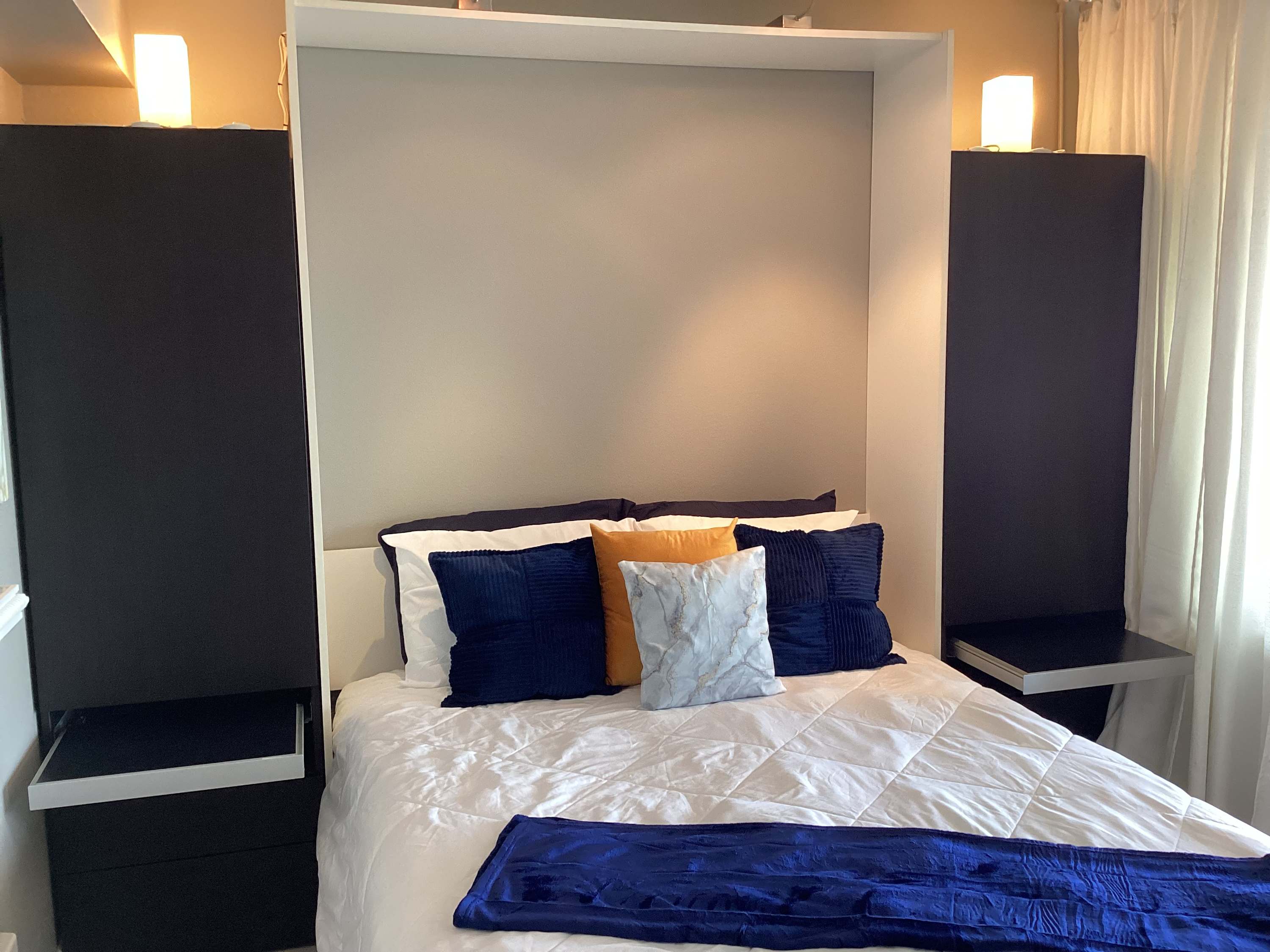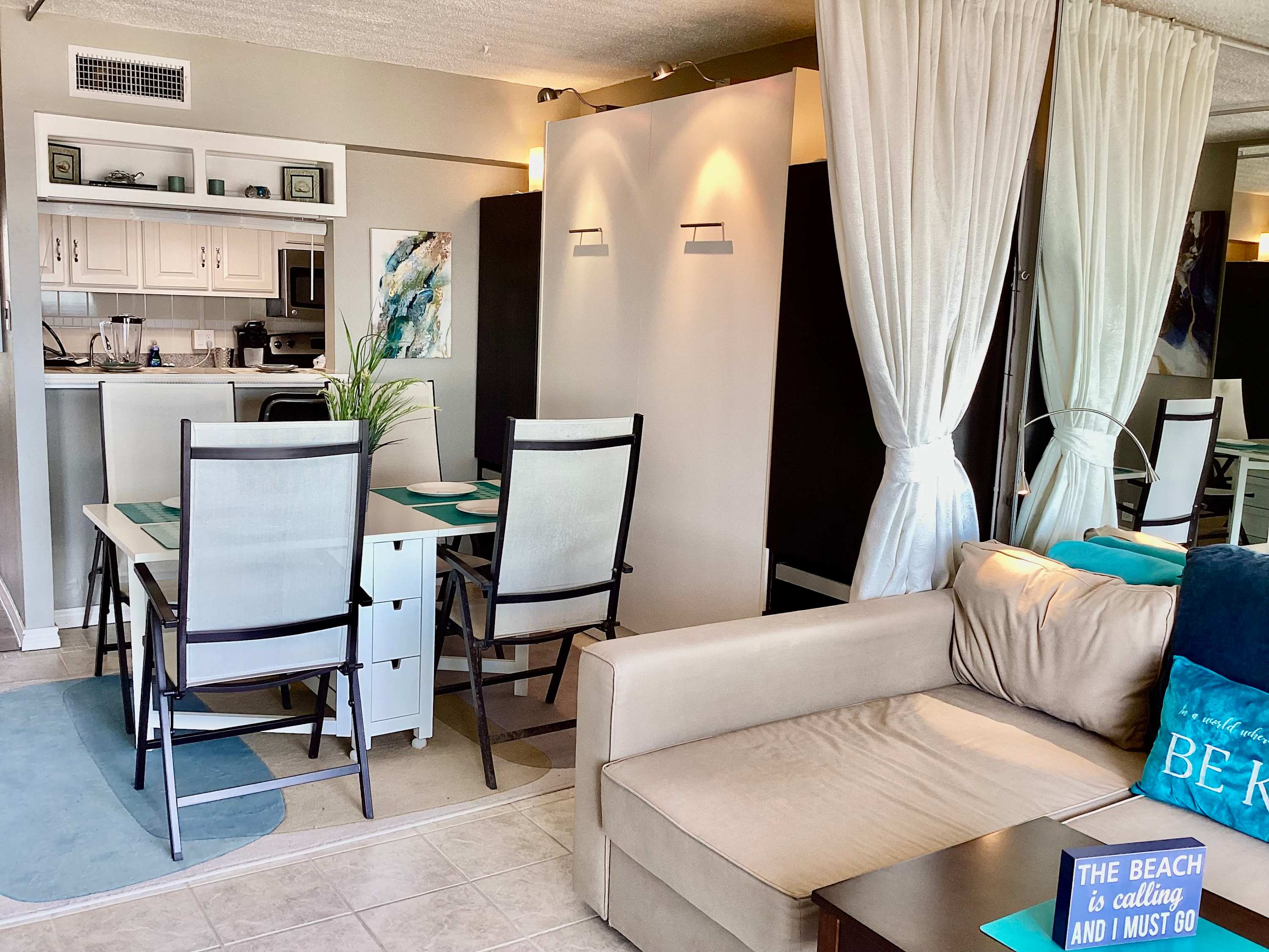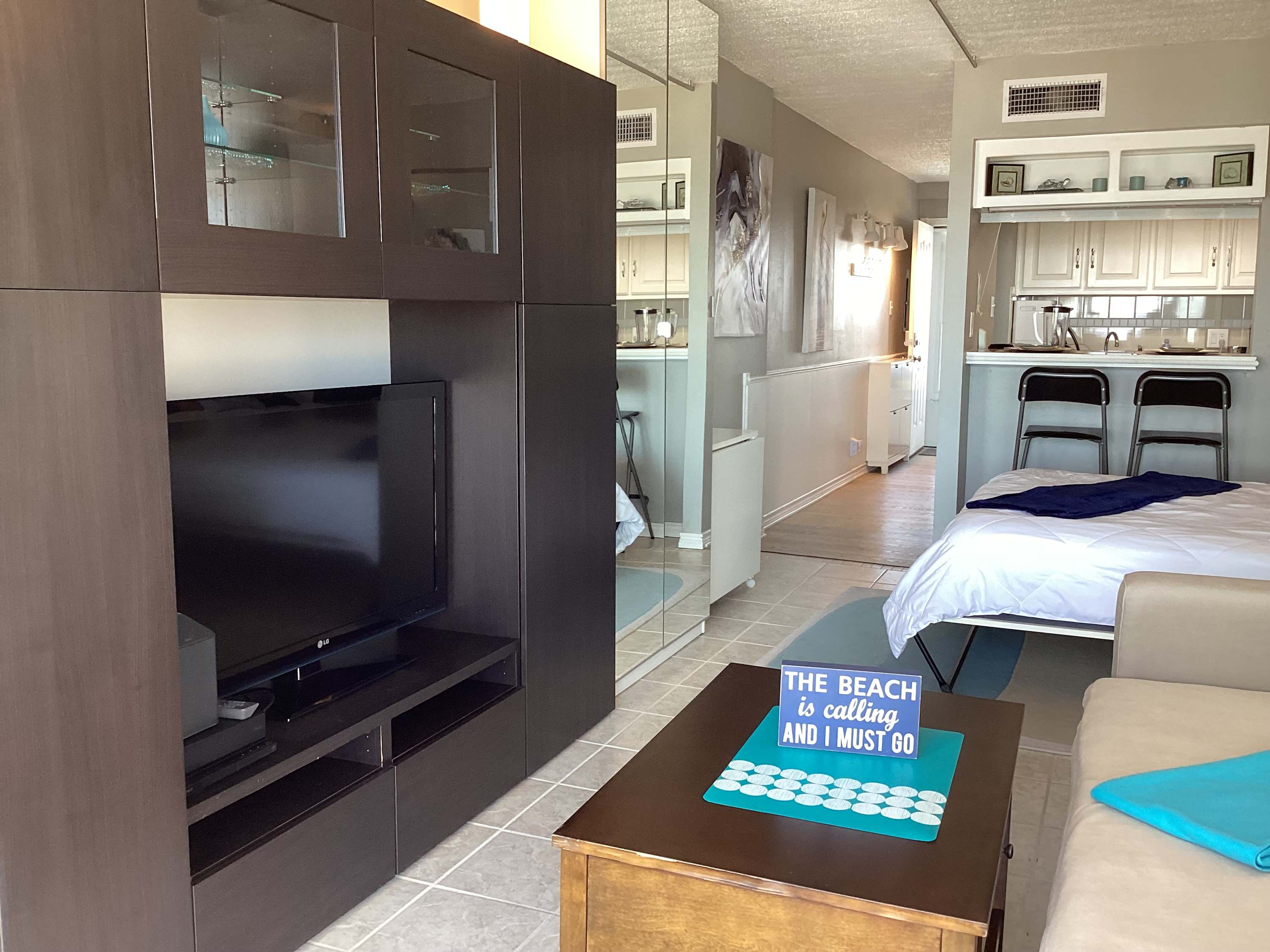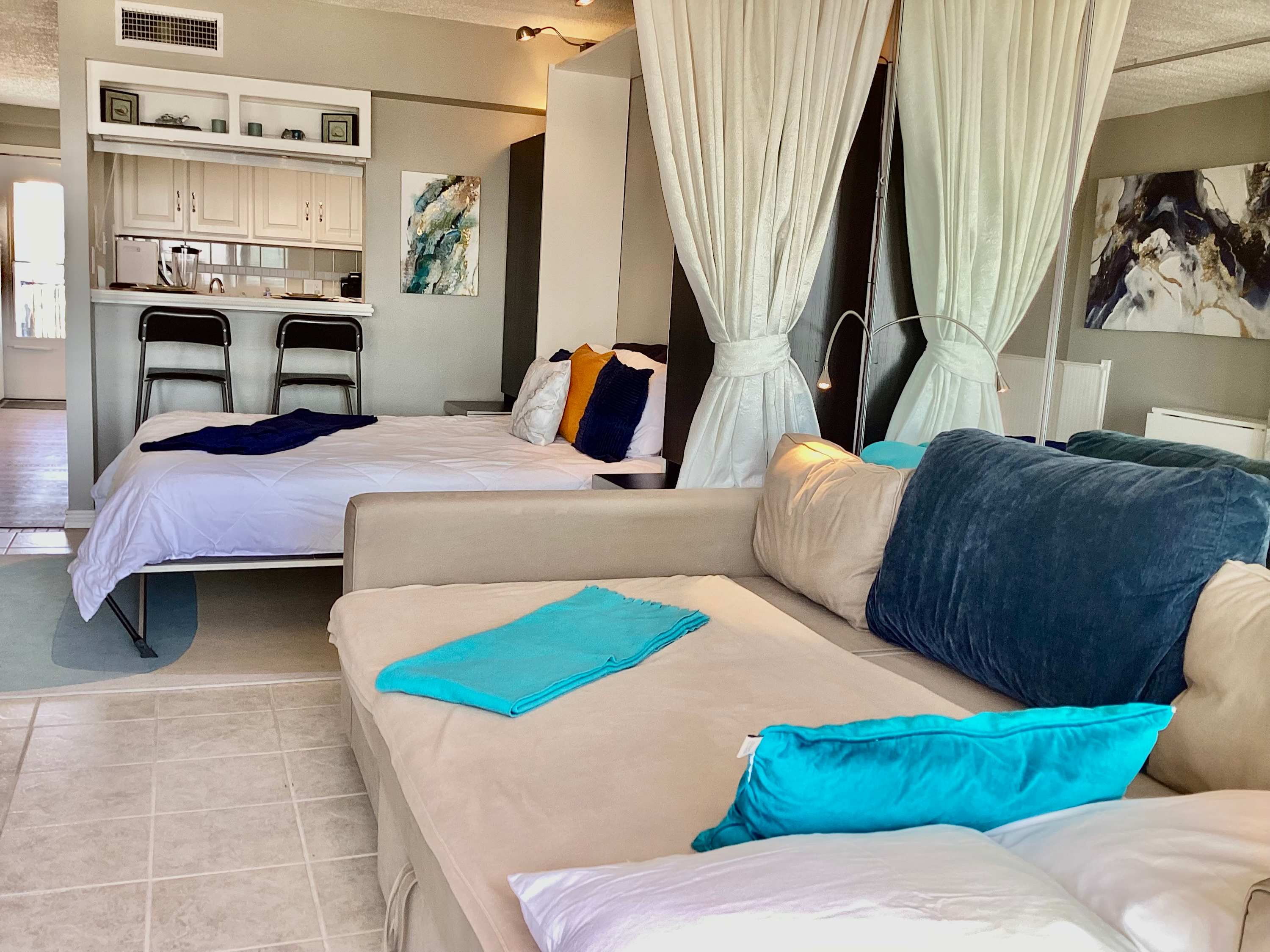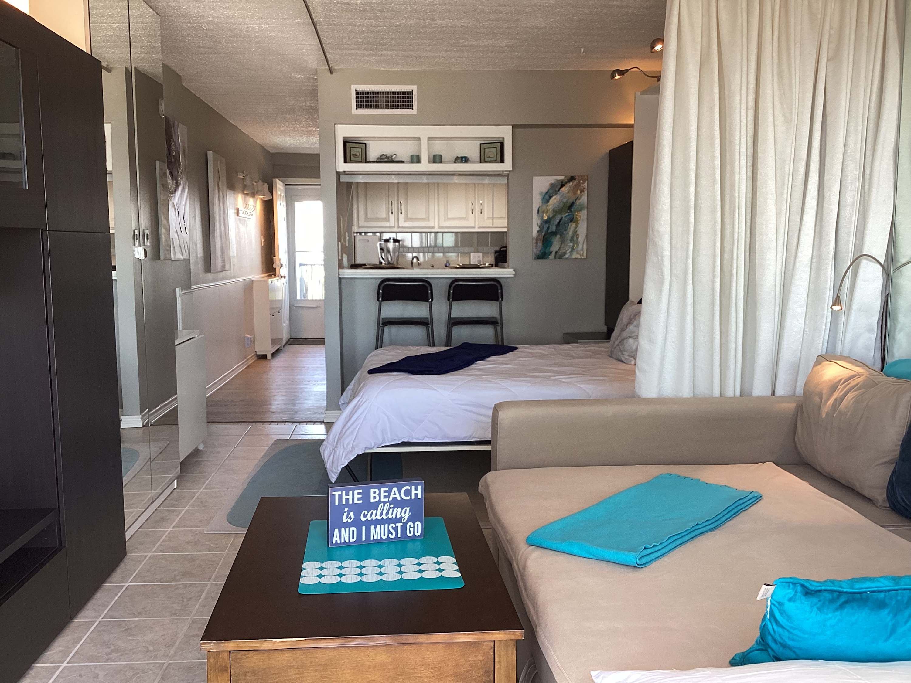 This studio unit comfortably sleeps 4 guests between a queen size murphy bed and a full size sleeper sofa.