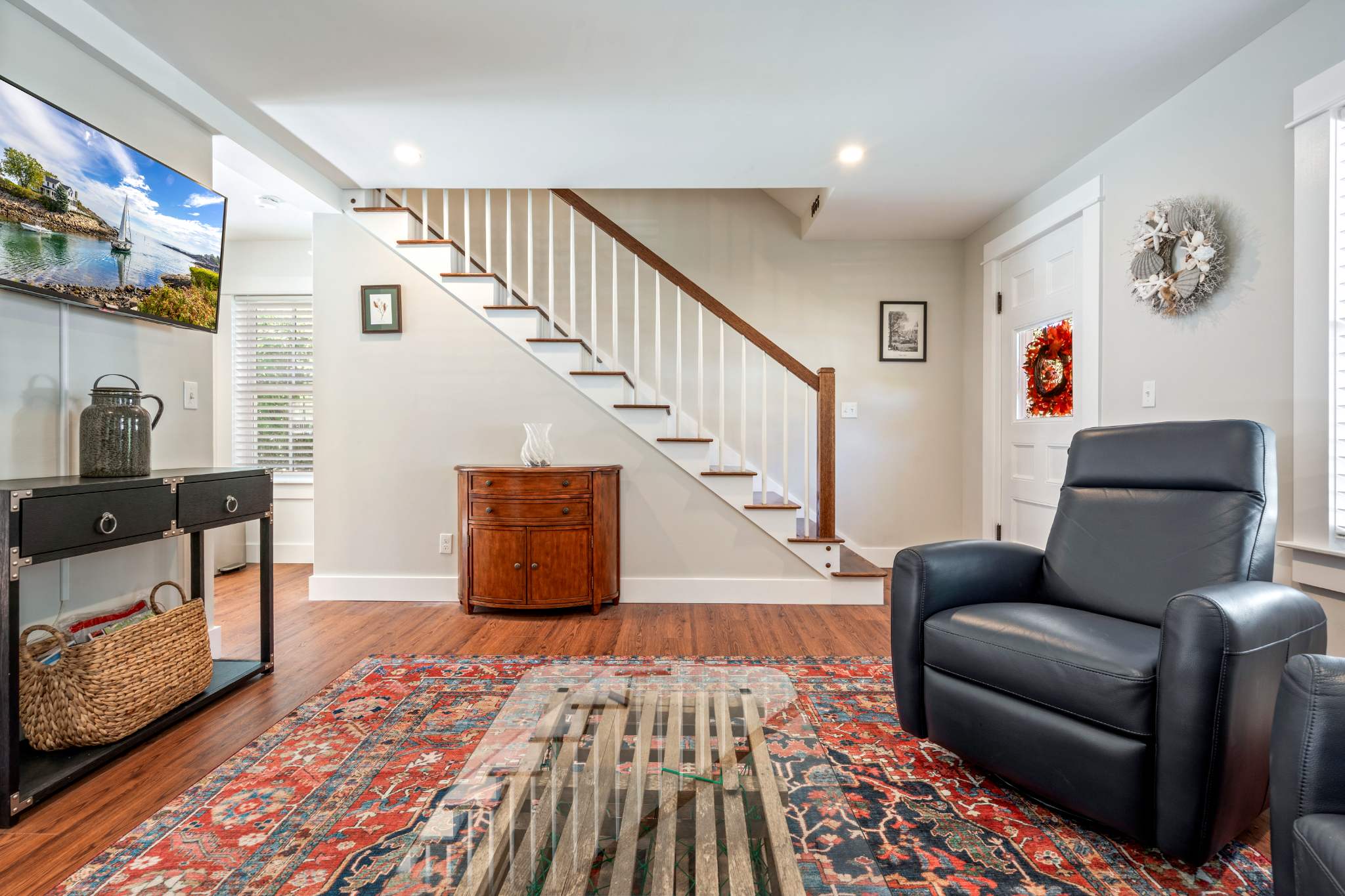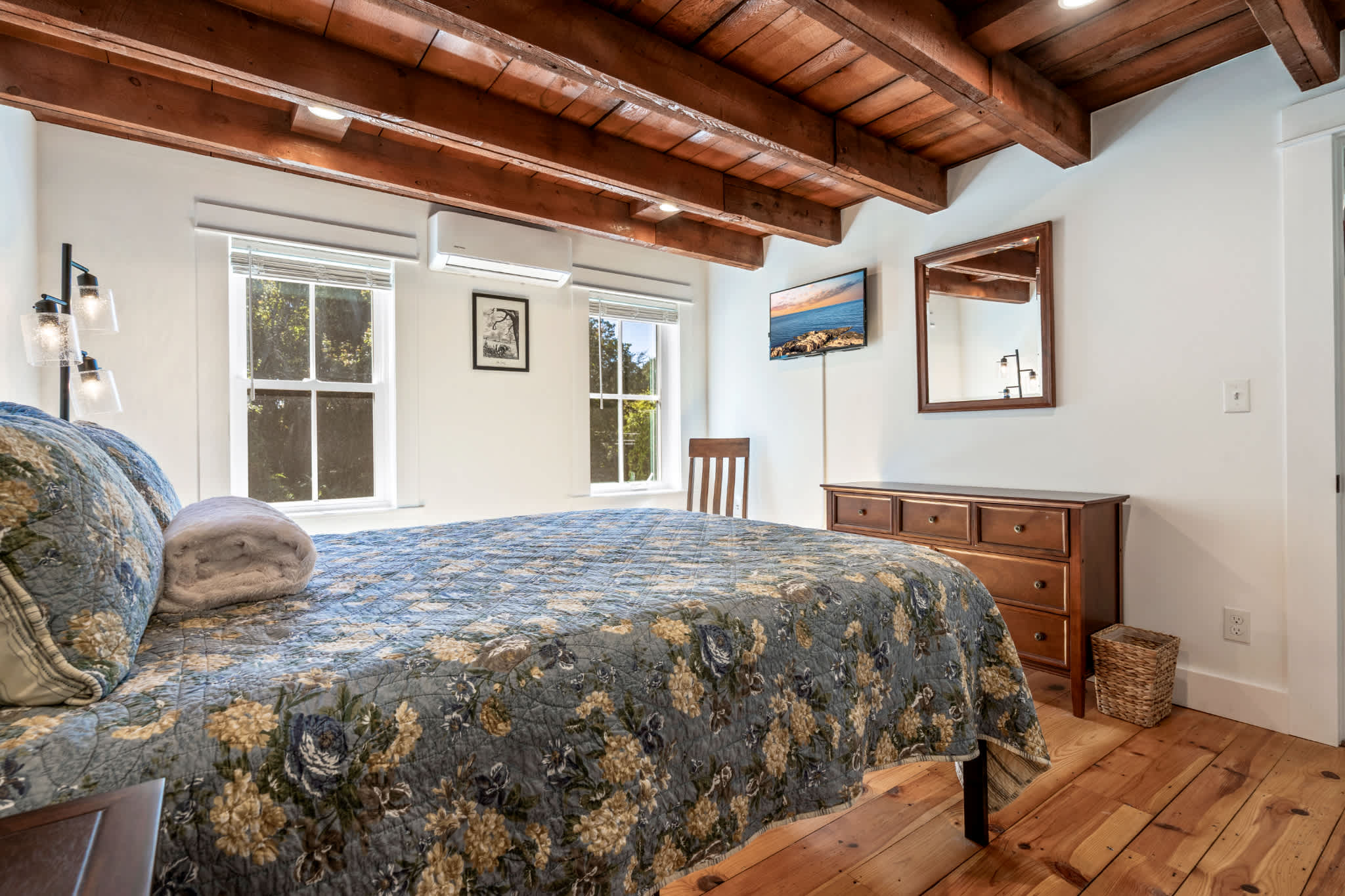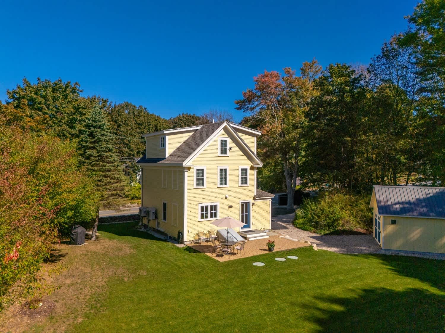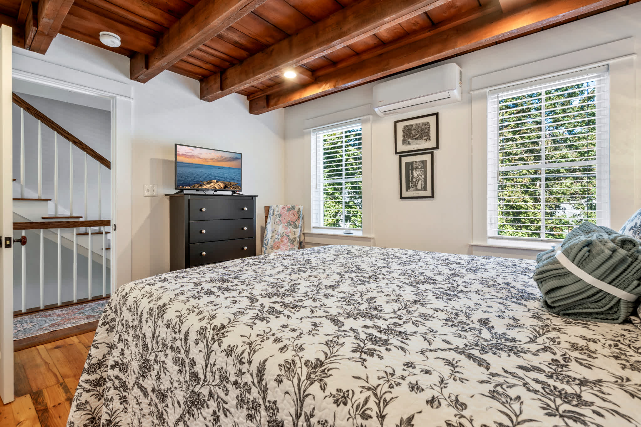 When you arrive, you’ll feel right at ease in the cozy living room, where a smart TV, comfortable couch, and two armchairs invite you to relax after a day of seaside adventures. A small desk in the corner offers a quiet spot to catch up on work or write postcards home. The eat-in kitchen features sleek stainless steel appliances and granite countertops, perfectly blending modern convenience with classic style. Enjoy meals together at the dining table for six before heading outdoors to make the most of Maine’s fresh air—fire up the grill, dine at the table for six under the umbrella, or unwind in the spacious backyard surrounded by nature.